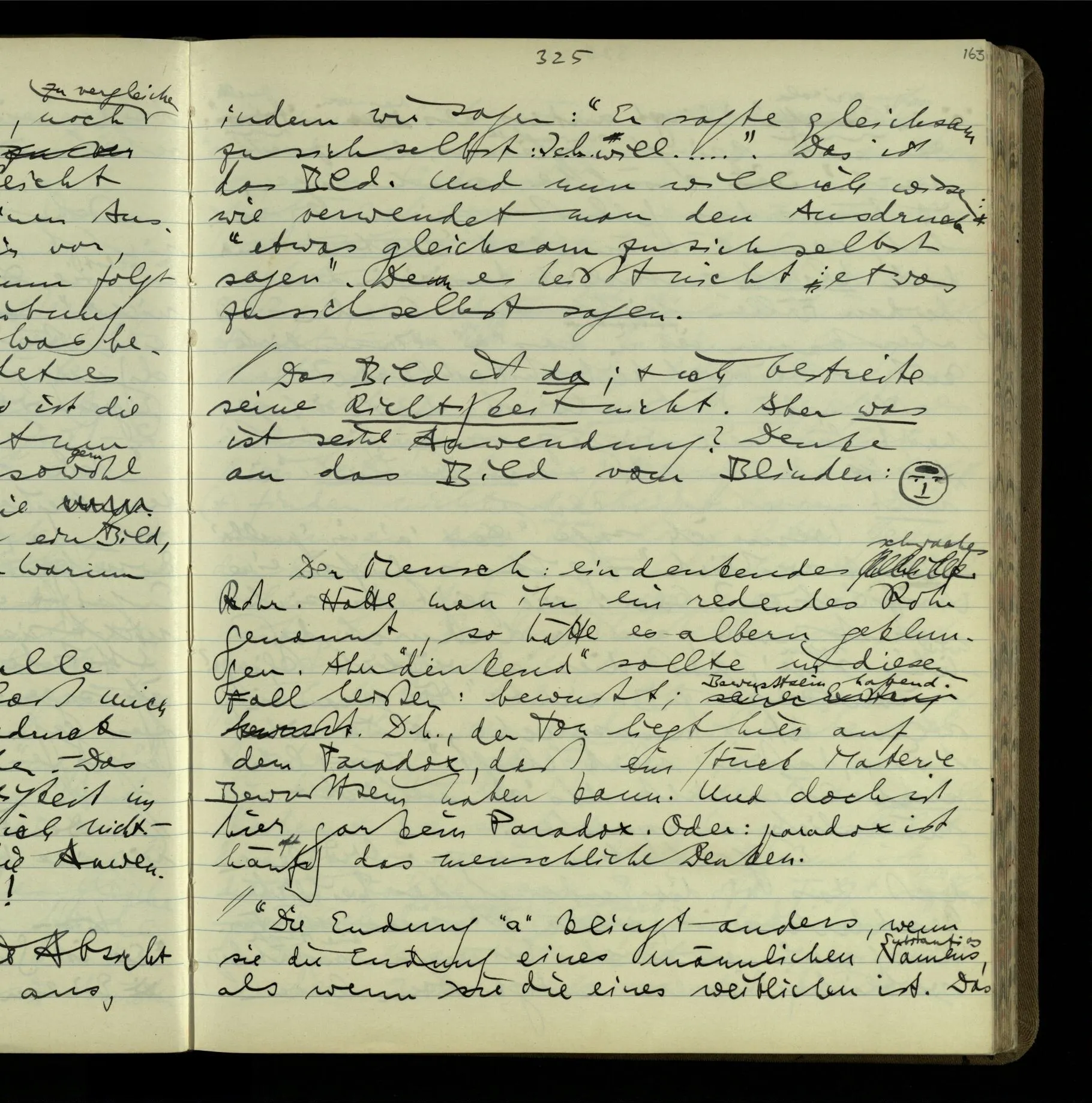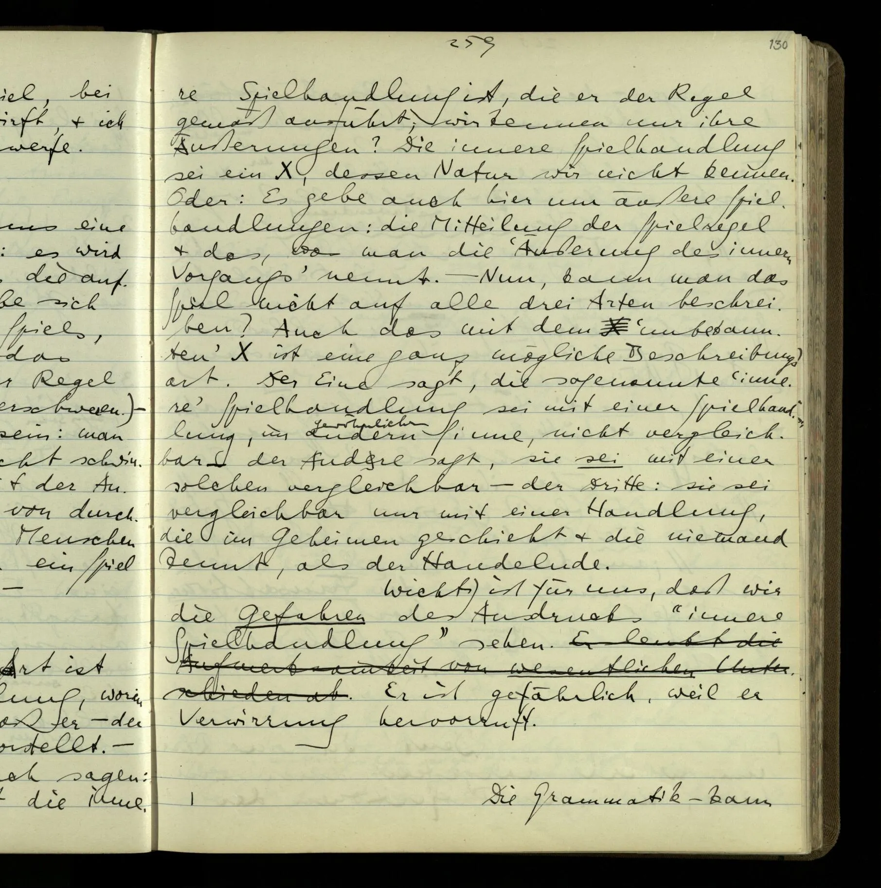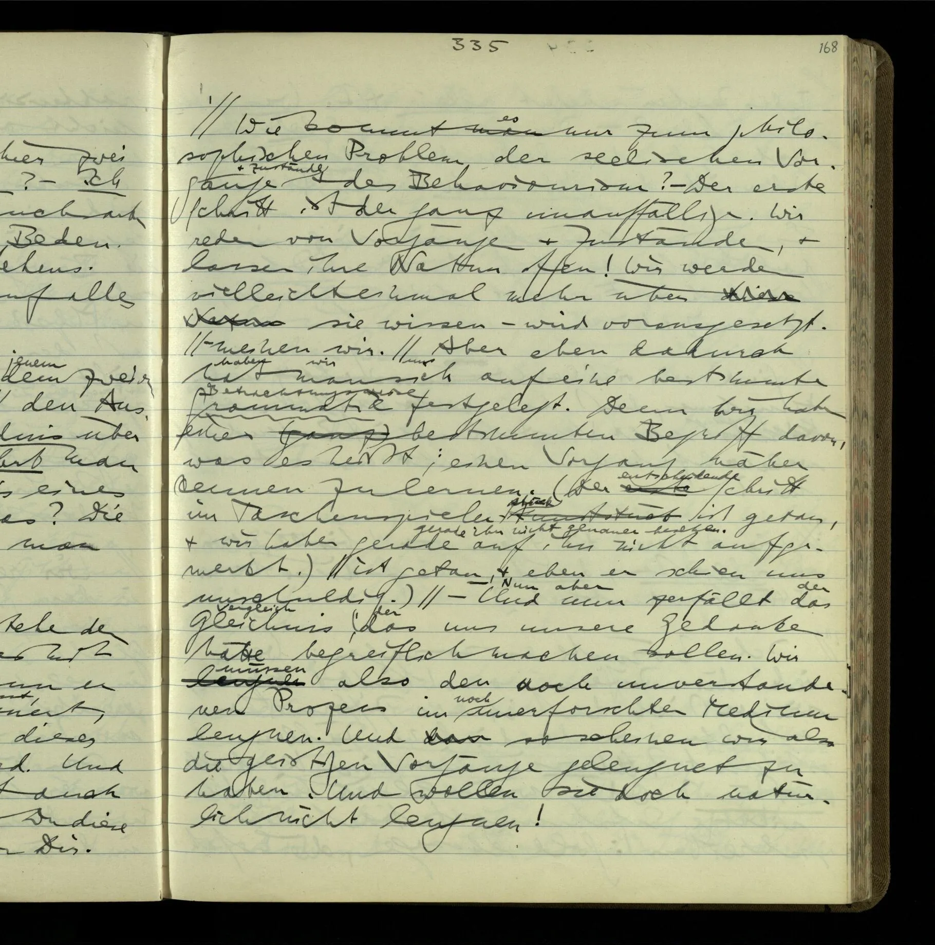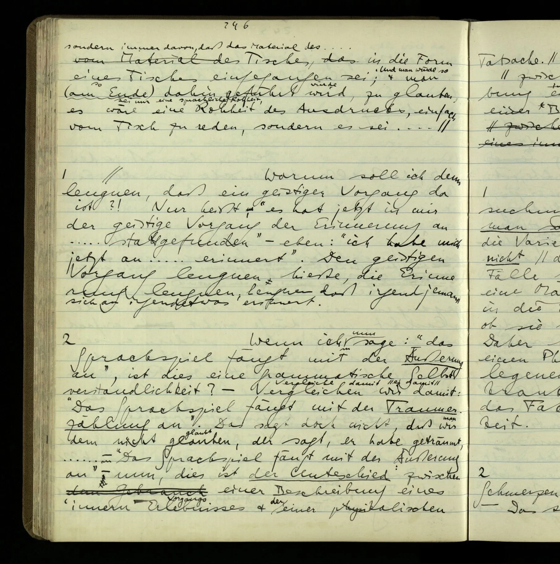 Wie kommt es nur zum philosophischen Problem der seelischen Vorgänge & Zustände & des Behaviourism? – Der erste Schritt ist der ganz unauffällige. Wir reden von Vorgängen & Zuständen, & lassen ihre Natur offen! Wir werden vielleicht einmal mehr über sie wissen – wird vorausgesetzt. Aber eben dadurch hat man sich auf eine bestimmte Grammatik festgelegt. Denn wir haben einen bestimmten Begriff davon, was es heißt, einen Vorgang näher kennen zu lernen. (Der entscheidende Schritt im Taschenspielerstück ist getan, & wir haben gerade auf ihn nicht aufgemerkt.) – Und nun zerfällt das Gleichnis, das uns unsere Gedanken hätte begreiflich machen sollen. Wir müssen also den noch unverstandenen Prozeß im noch unerforschten Medium leugnen. Und so scheinen wir also die geistigen Vorgänge geleugnet zu haben. Und wollen sie doch natürlich nicht leugnen!