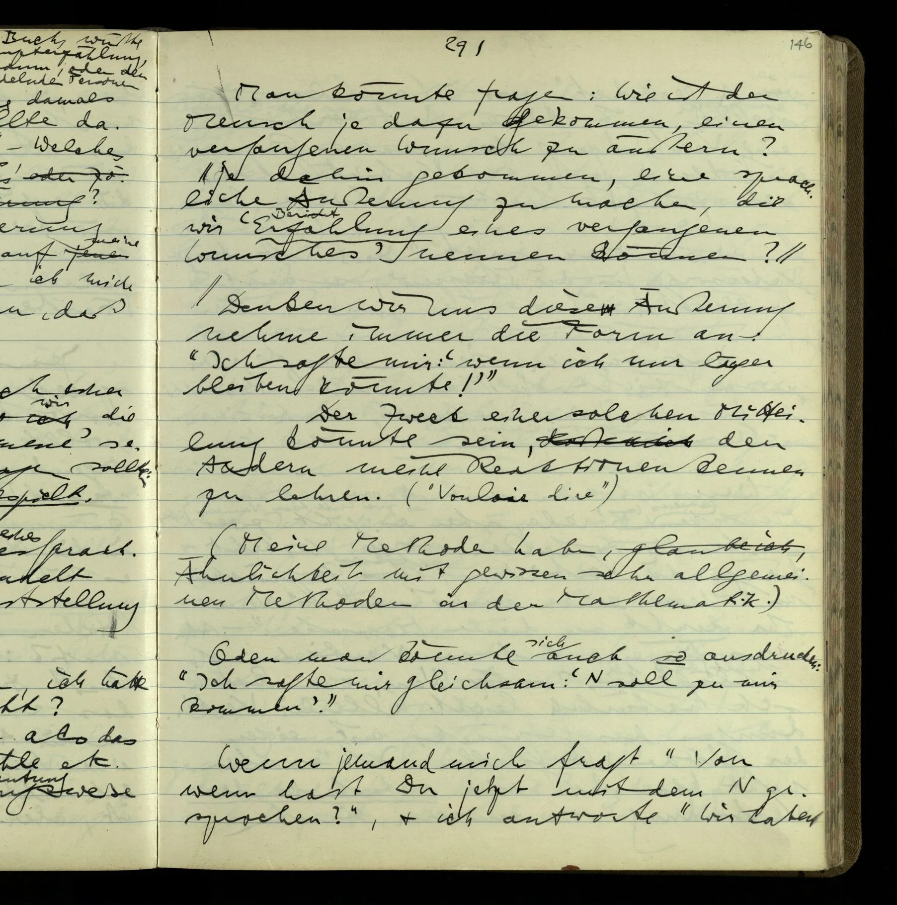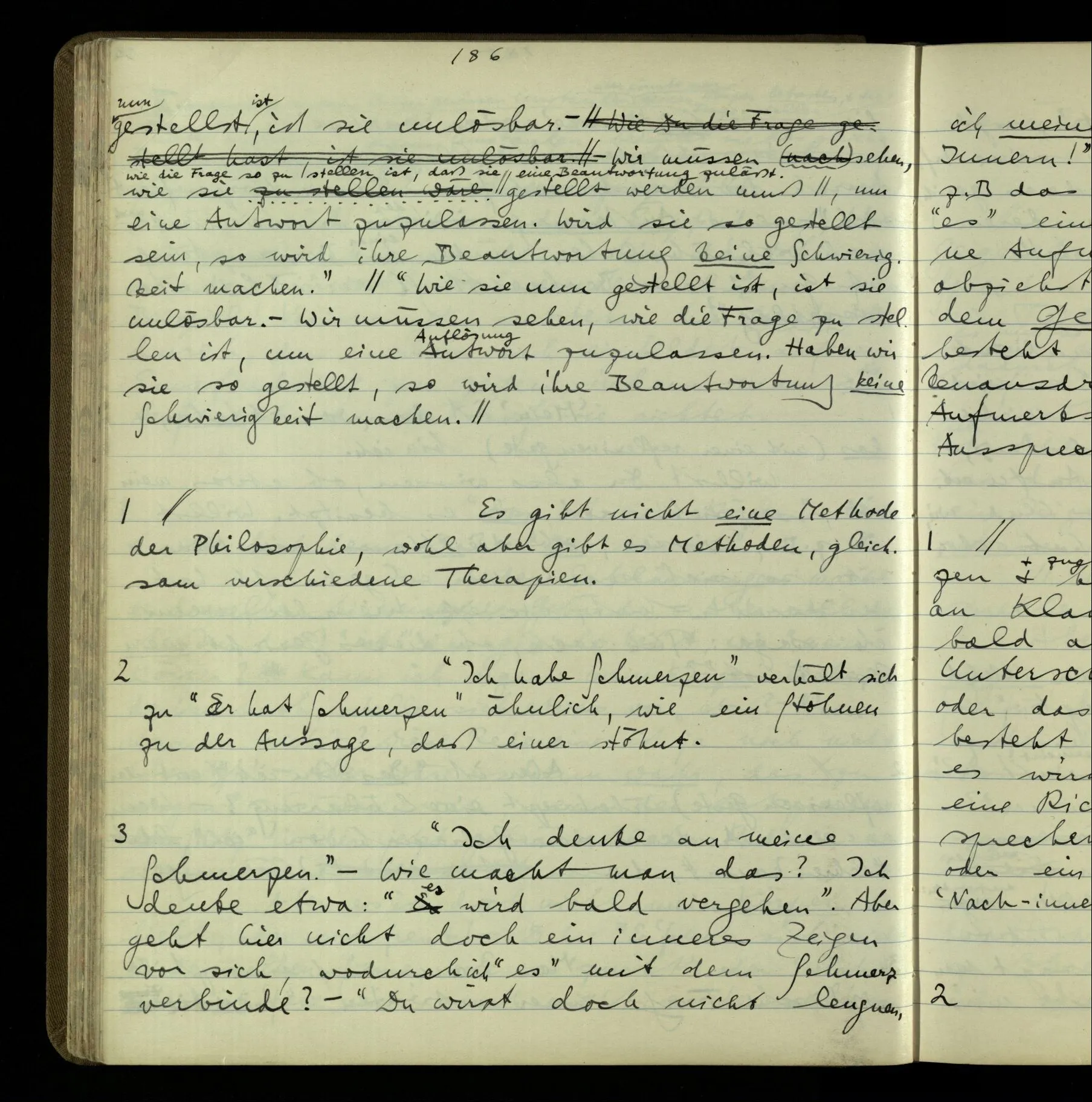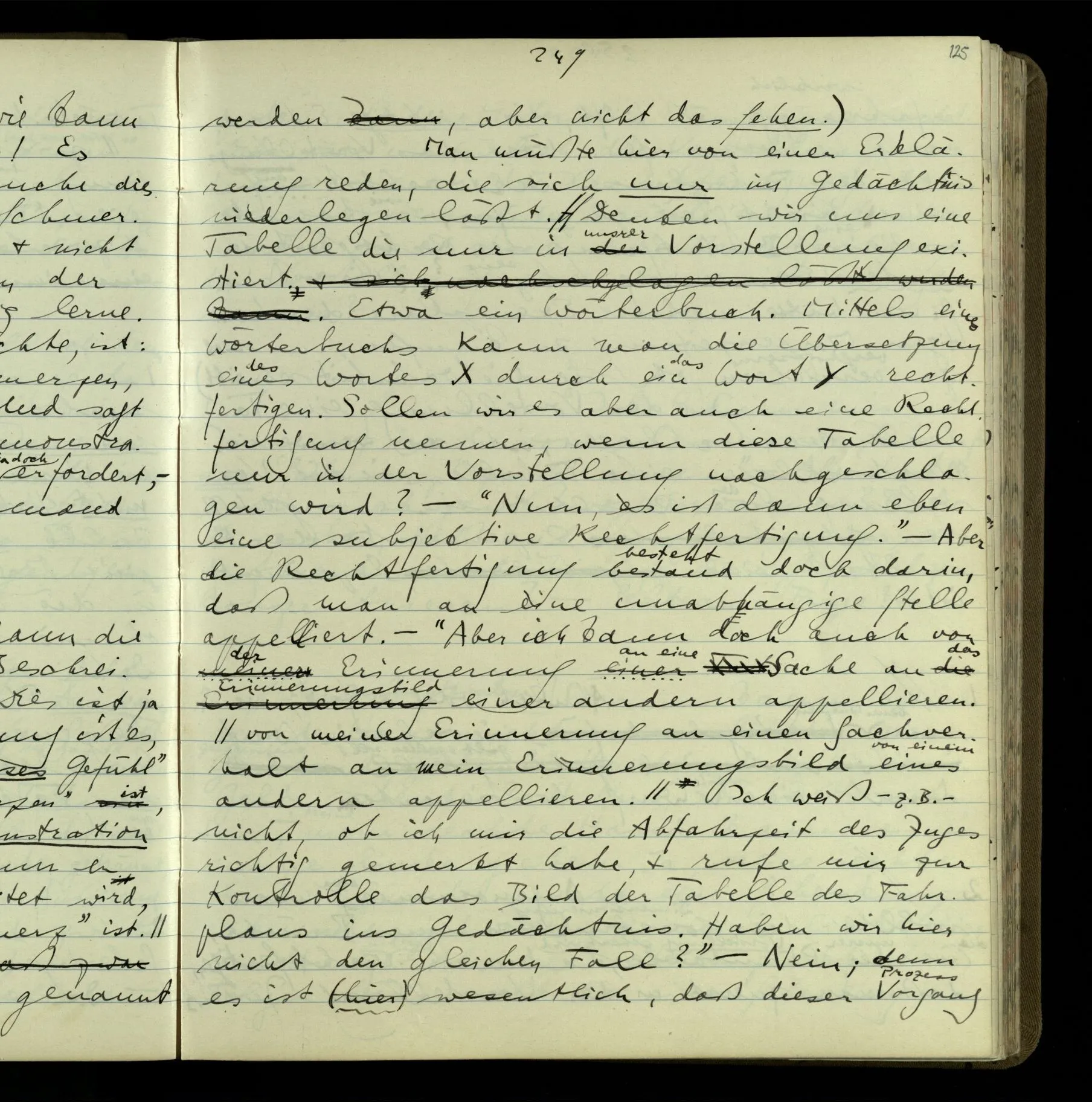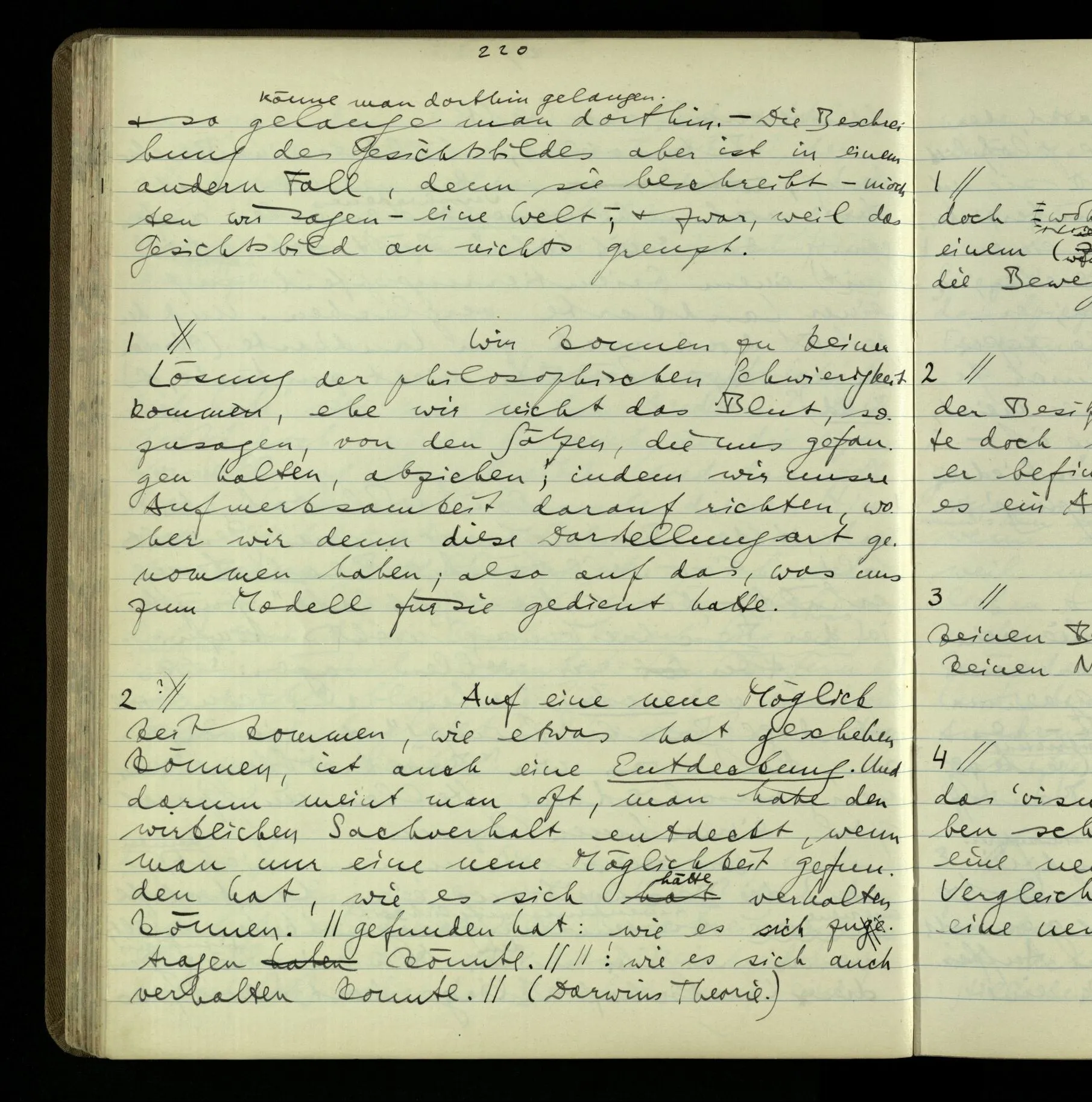 Wie kommt es nur zum philosophischen Problem der seelischen Vorgänge & Zustände & des Behaviourism? – Der erste Schritt ist der ganz unauffällige. Wir reden von Vorgängen & Zuständen, & lassen ihre Natur offen! Wir werden vielleicht einmal mehr über sie wissen – wird vorausgesetzt. Aber eben dadurch hat man sich auf eine bestimmte Grammatik festgelegt. Denn wir haben einen bestimmten Begriff davon, was es heißt, einen Vorgang näher kennen zu lernen. (Der entscheidende Schritt im Taschenspielerstück ist getan, & wir haben gerade auf ihn nicht aufgemerkt.) – Und nun zerfällt das Gleichnis, das uns unsere Gedanken hätte begreiflich machen sollen. Wir müssen also den noch unverstandenen Prozeß im noch unerforschten Medium leugnen. Und so scheinen wir also die geistigen Vorgänge geleugnet zu haben. Und wollen sie doch natürlich nicht leugnen!