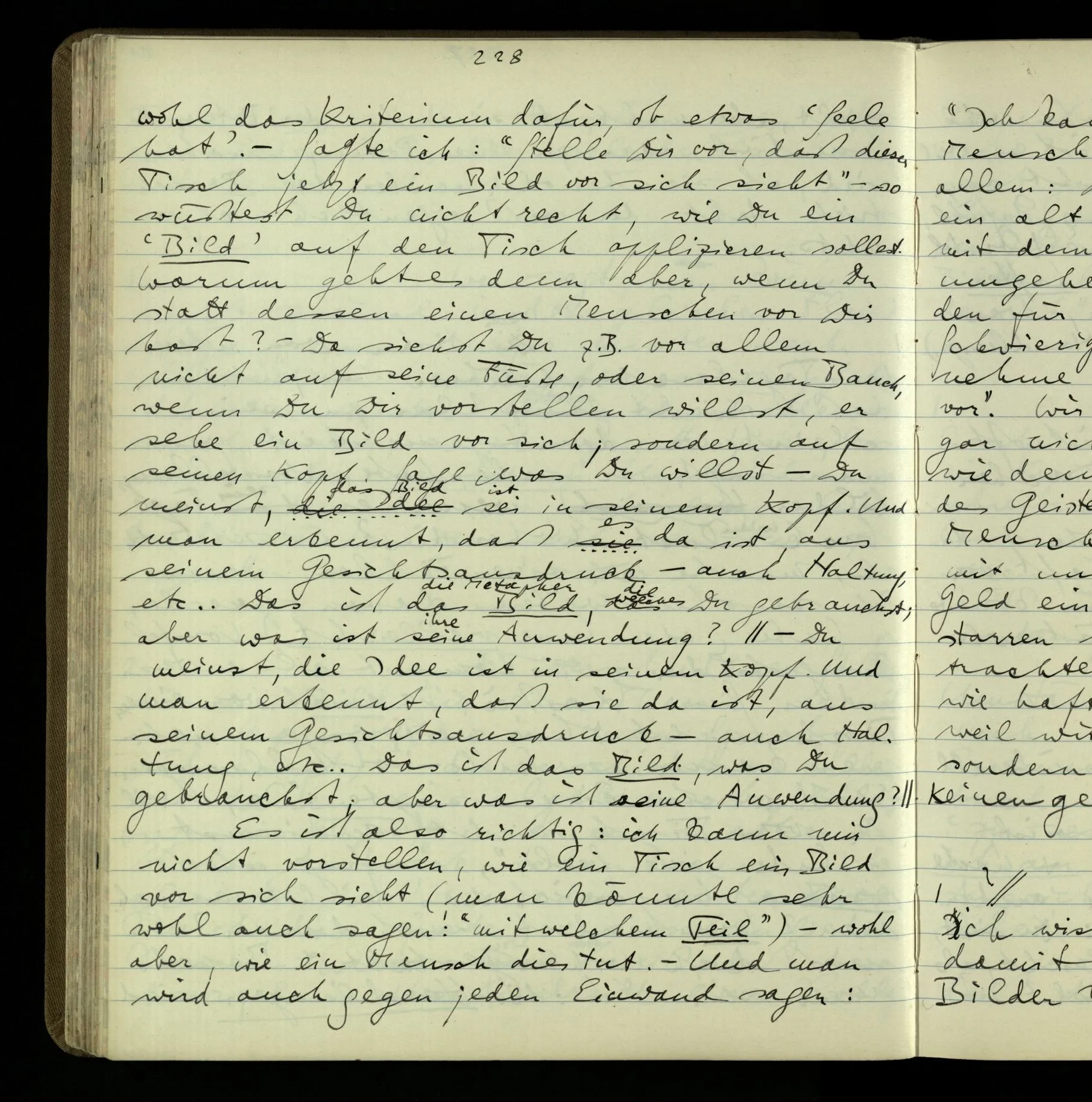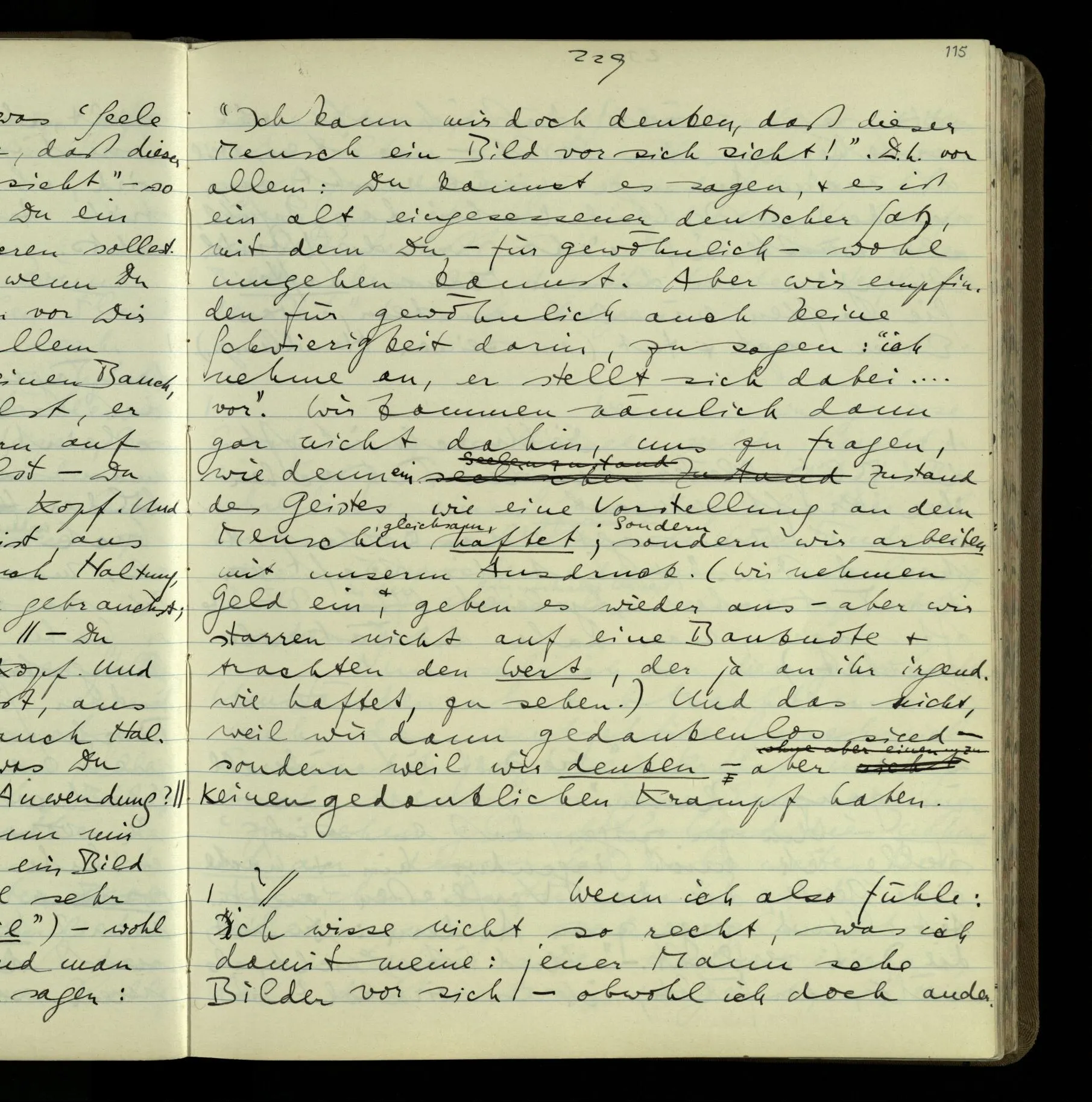 “Während ich zu ihm sprach, wußte ich nicht, was hinter seiner Stirn vorging.” Dabei denkt man nicht an Gehirnvorgänge, sondern an Denkvorgänge. Es ist ein ernstzunehmendes Bild. Wir möchten wirklich hinter diese Stirne sehen. Und doch meinen wir nur das, was wir auch sonst damit meinen: “wir möchten wissen, was er denkt”. Ich will sagen: wir haben da das lebhafte Bild; & denjenigen Gebrauch der mit ihm das Psychische ausdrückt.