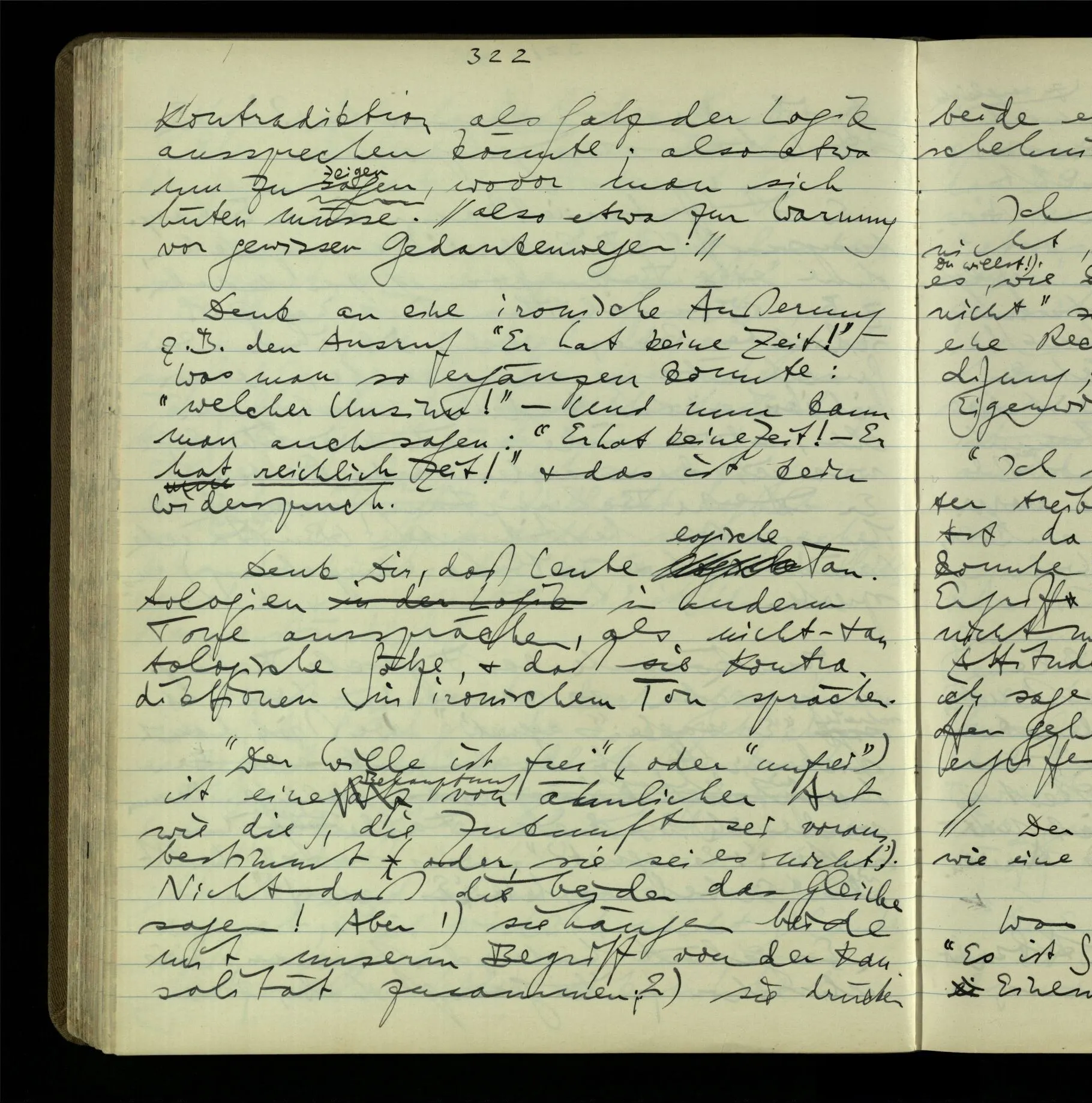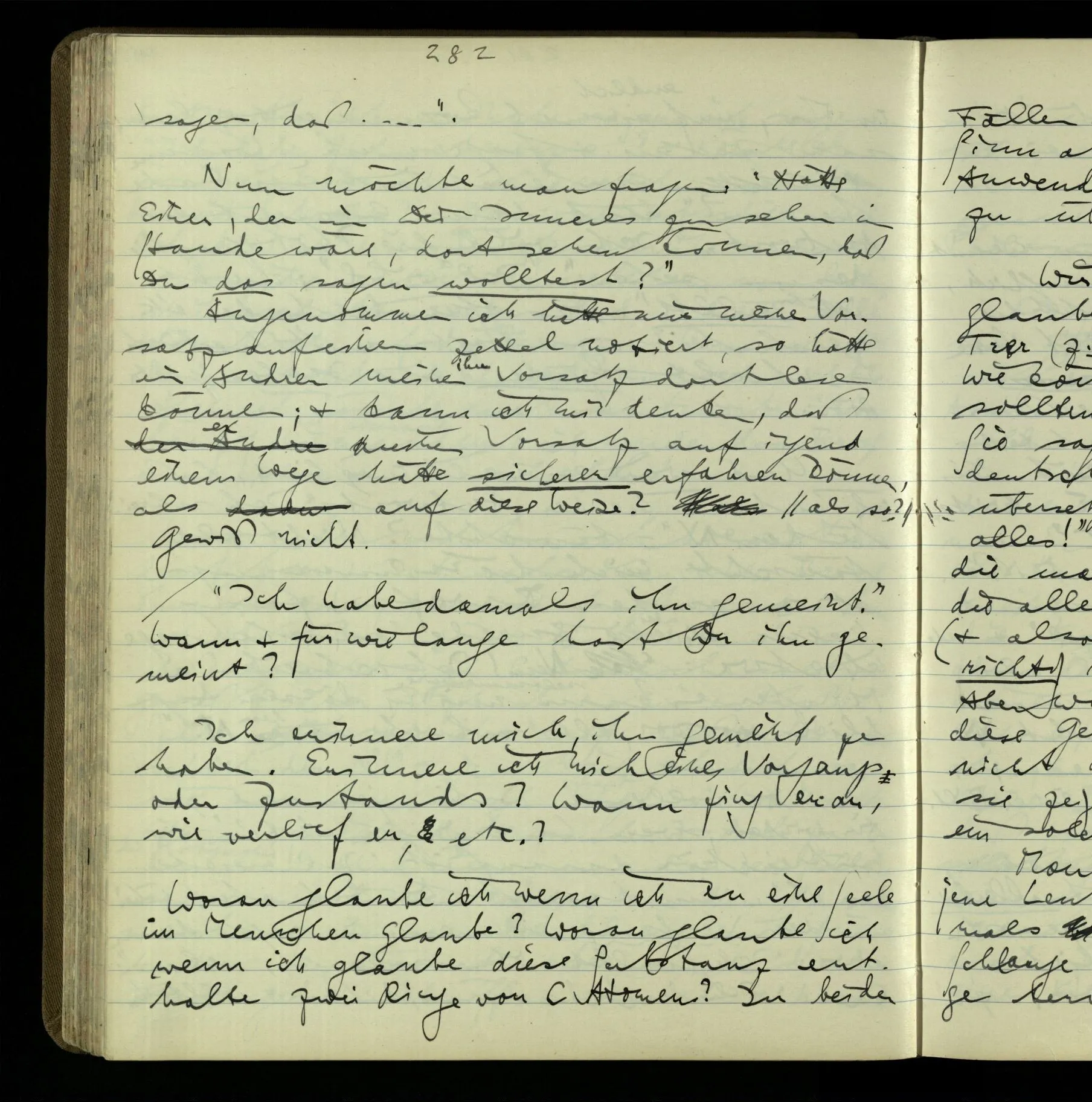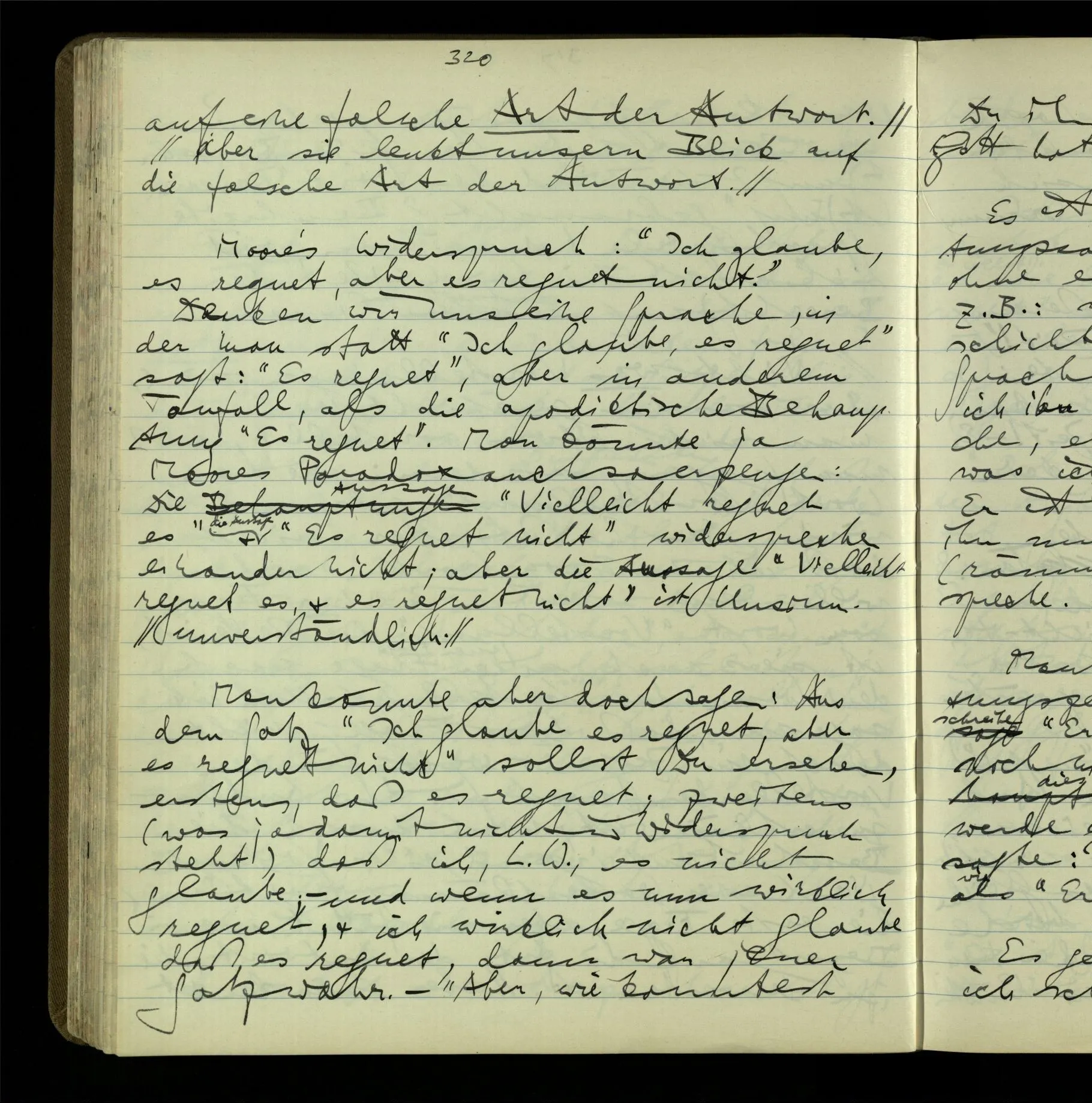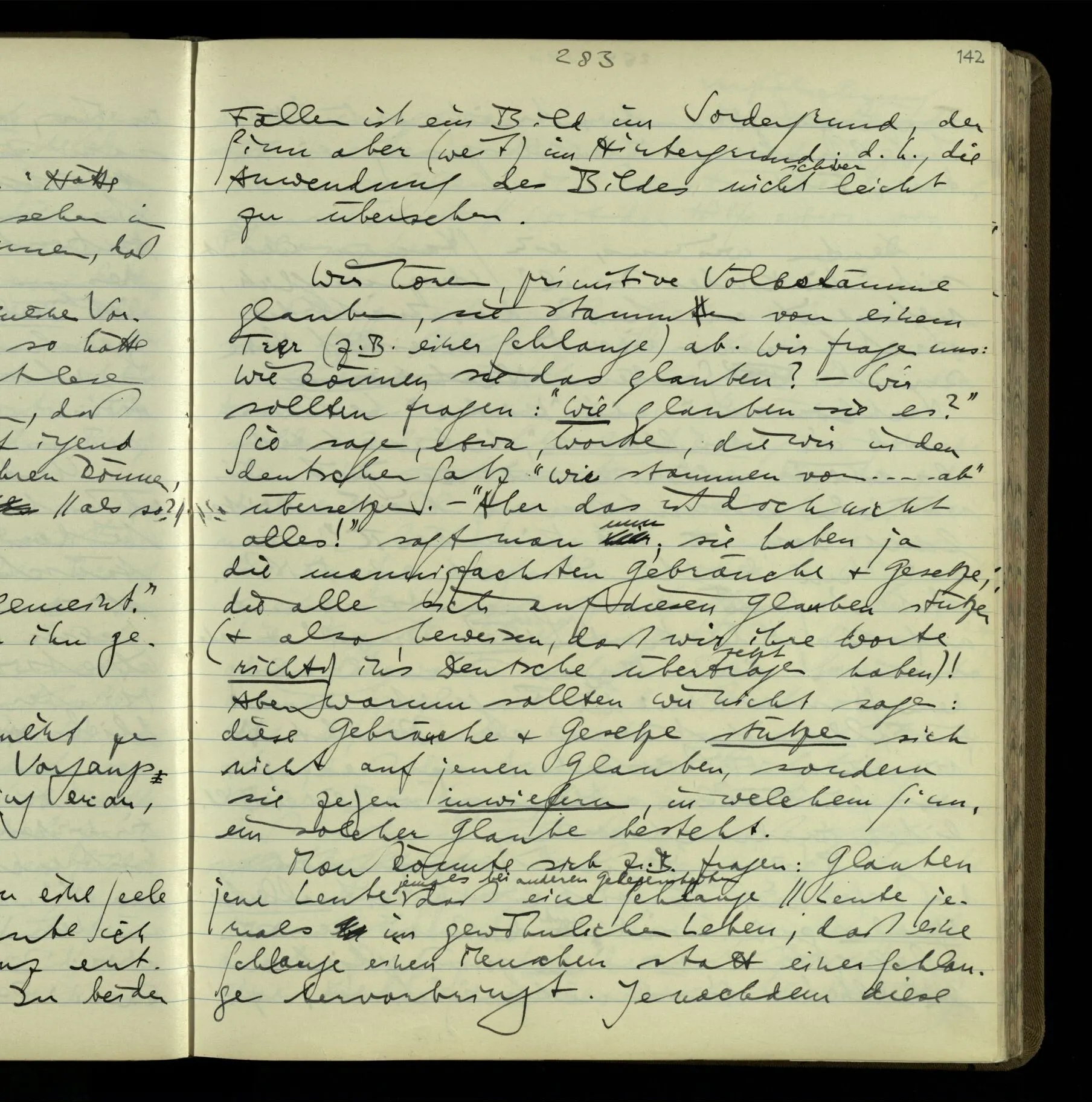 Wenn Einer sagt, er glaubt an Gott, so ist das eine ganz undeutliche Mitteilung. “Aber ‘glauben’ heißt doch einfach: ‘für wahr halten’!” – Ja, es heißt für wahr halten, & mit dieser Definition ist auch nichts erklärt, was uns interessiert. Ich glaube, daß das Wetter schön bleiben wird, daß die Erde sich um die Sonne bewegt, daß ich mich damals schlecht benommen habe.