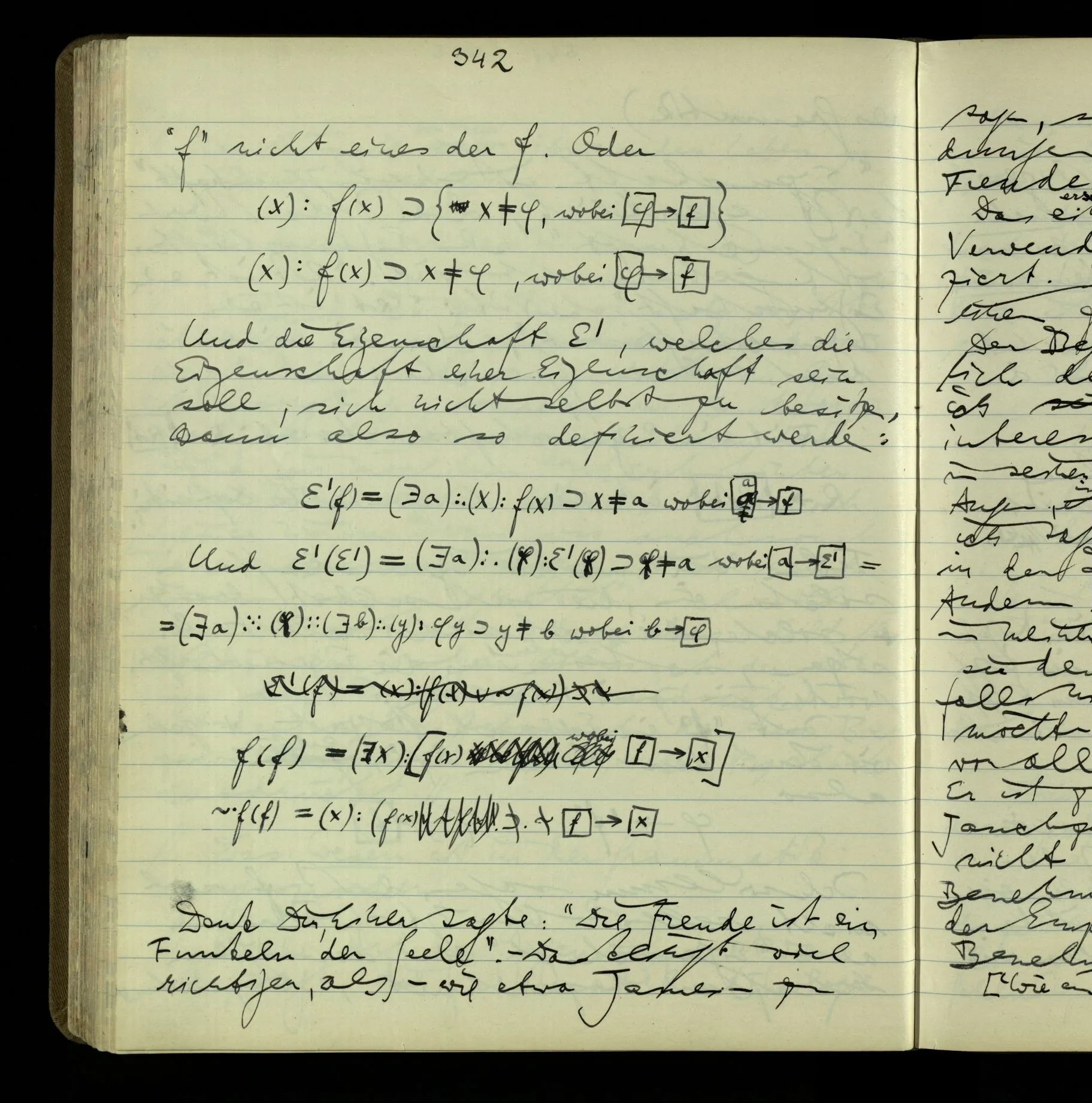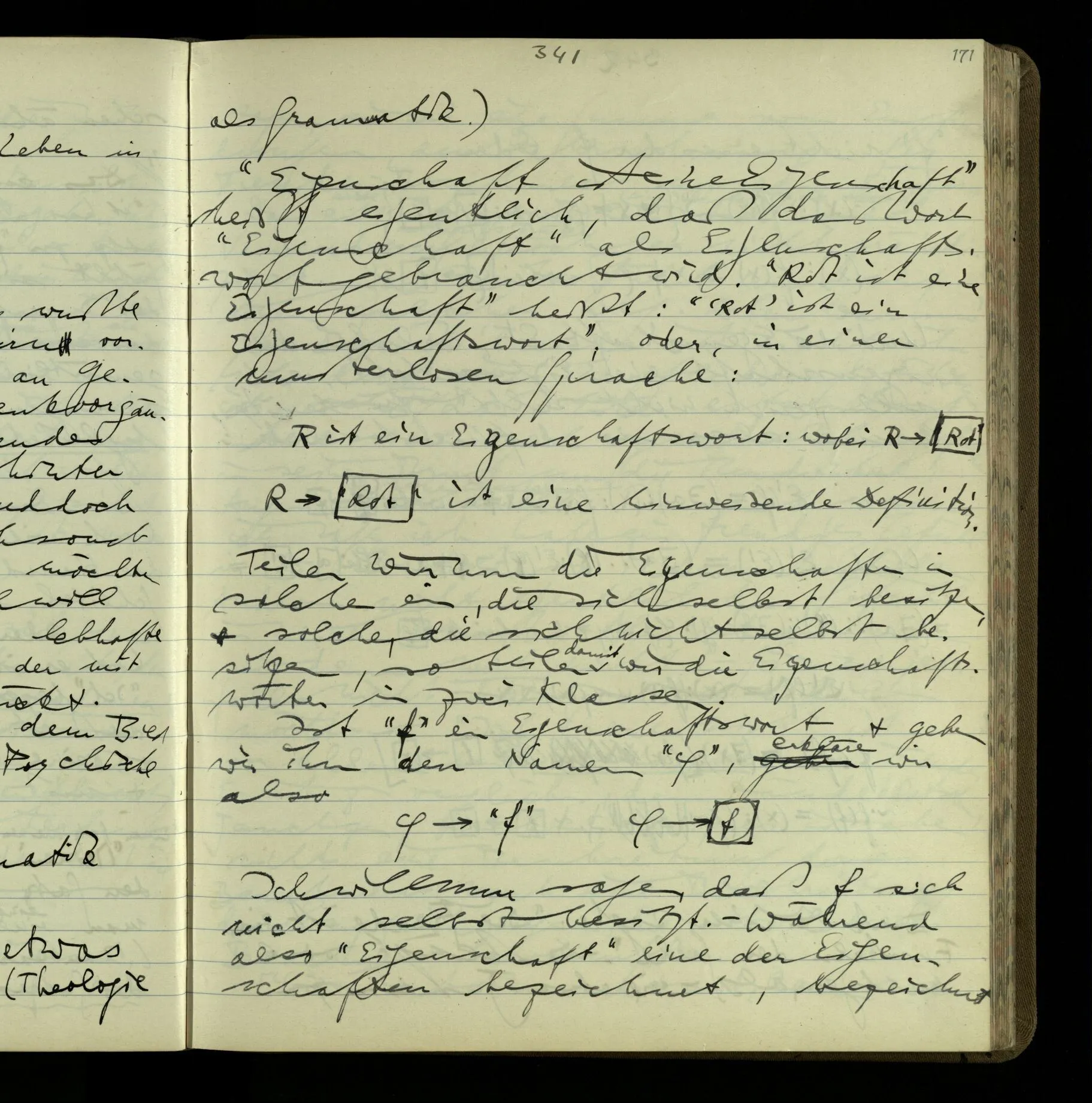 Ich will nun sagen, daß f sich nicht selbst besitzt. – Während also “Eigenschaft” eine der Eigenschaften bezeichnet, bezeichnet “f” nicht eines der f. Oder