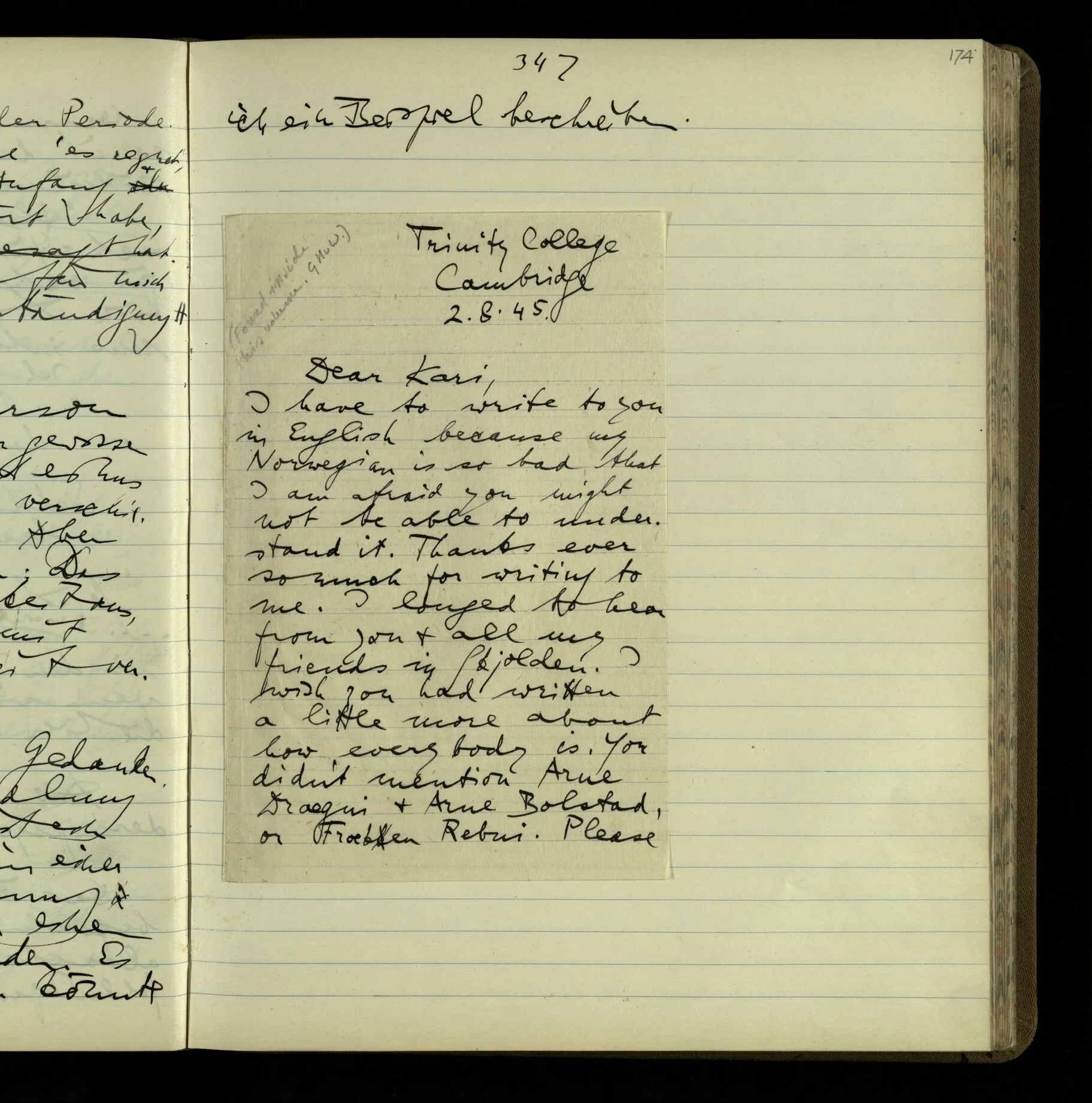 I have to write to you in English because my Norwegian is so bad that I am afraid you might not be able to understand it. Thanks ever so much for writing to me. I longed to hear from you & all my friends in Skjolden. I wish you had written a little more about how everybody is. You didn’t mention Arne Draegni & Arne Bolstad, or Froeken Rebni. Please …