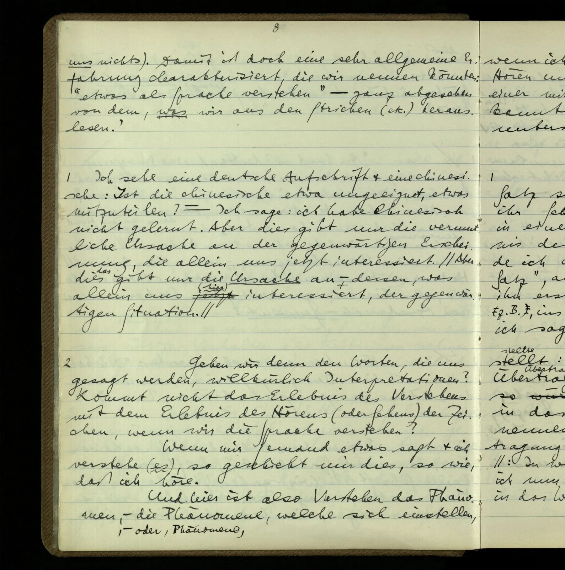 1 Ich sehe eine deutsche Aufschrift & eine chinesische: Ist die chinesische etwa ungeeignet, etwas mitzuteilen? ‒ ‒ Ich sage: ich habe Chinesisch nicht gelernt. Aber dies gibt nur die vermutliche Ursache an der gegenwärtigen Erscheinung, die allein uns jetzt interessiert.