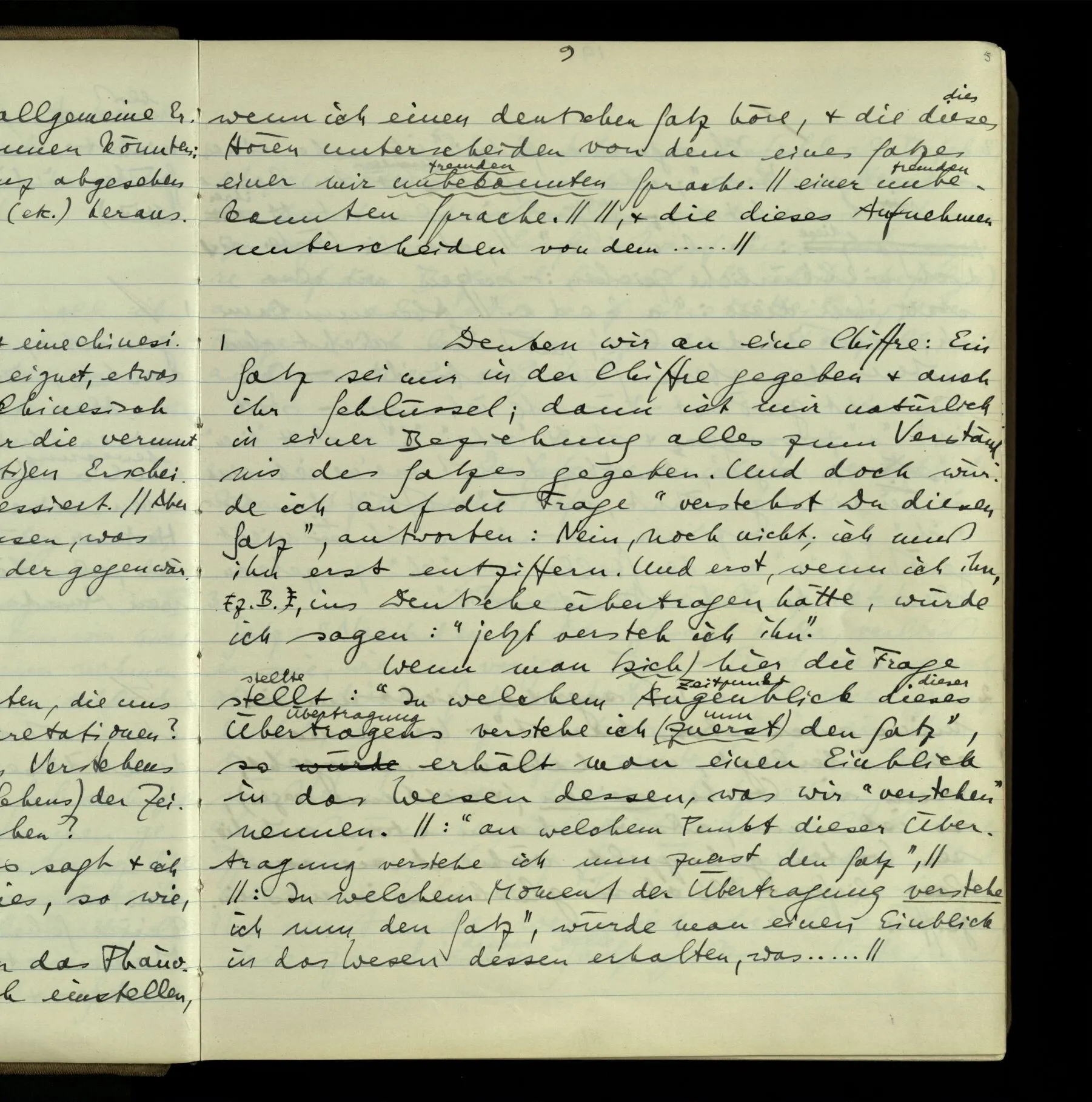 1 Denken wir an eine Chiffre: Ein Satz sei mir in der Chiffre gegeben & auch ihr Schlüssel; dann ist mir natürlich in einer Beziehung alles zum Verständnis des Satzes gegeben. Und doch würde ich auf die Frage “verstehst Du diesen Satz”, antworten: Nein, noch nicht; ich muß ihn erst entziffern. Und erst, wenn ich ihn, z.B., ins Deutsche übertragen hätte, würde ich sagen: “jetzt versteh ich ihn”. Wenn man (sich) hier die Frage stellt: “In welchem Augenblick dieses Übertragens verstehe ich (zuerst) den Satz”, so erhält man einen Einblick in das Wesen dessen, was wir “verstehen” nennen.