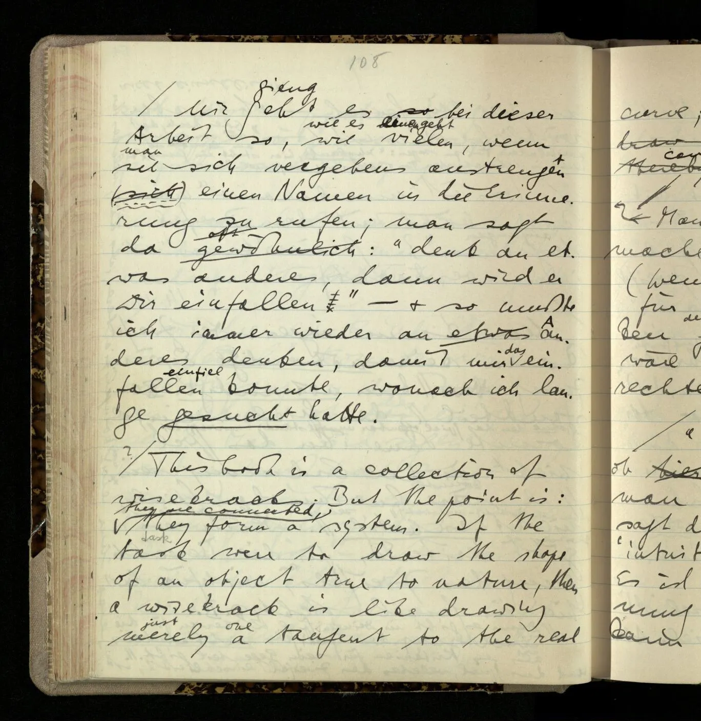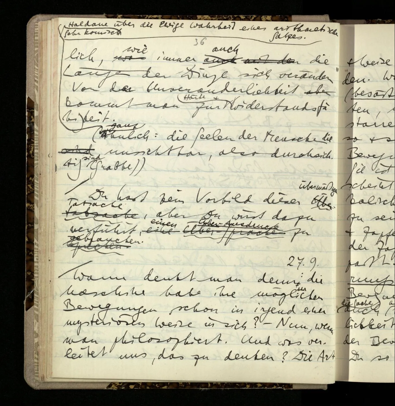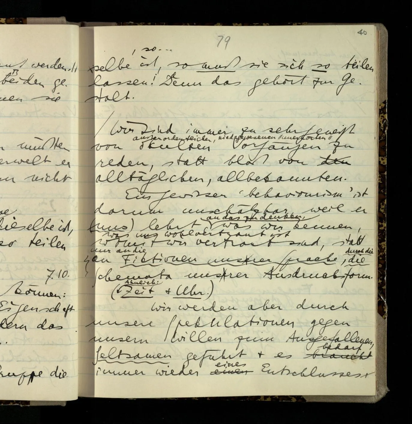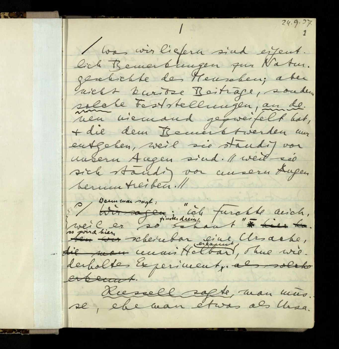 24.09.1937 Was wir liefern sind eigentlich Bemerkungen zur Naturgeschichte des Menschen; aber nicht kuriose Beiträge, sondern solche Feststellungen, an denen niemand gezweifelt hat, & die dem Bemerktwerden nur entgehen, weil sie ständig vor unsern Augen sind.