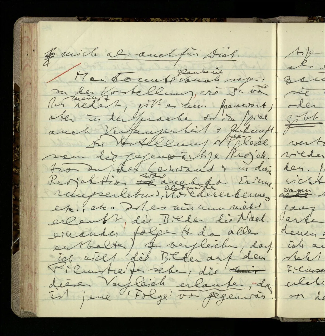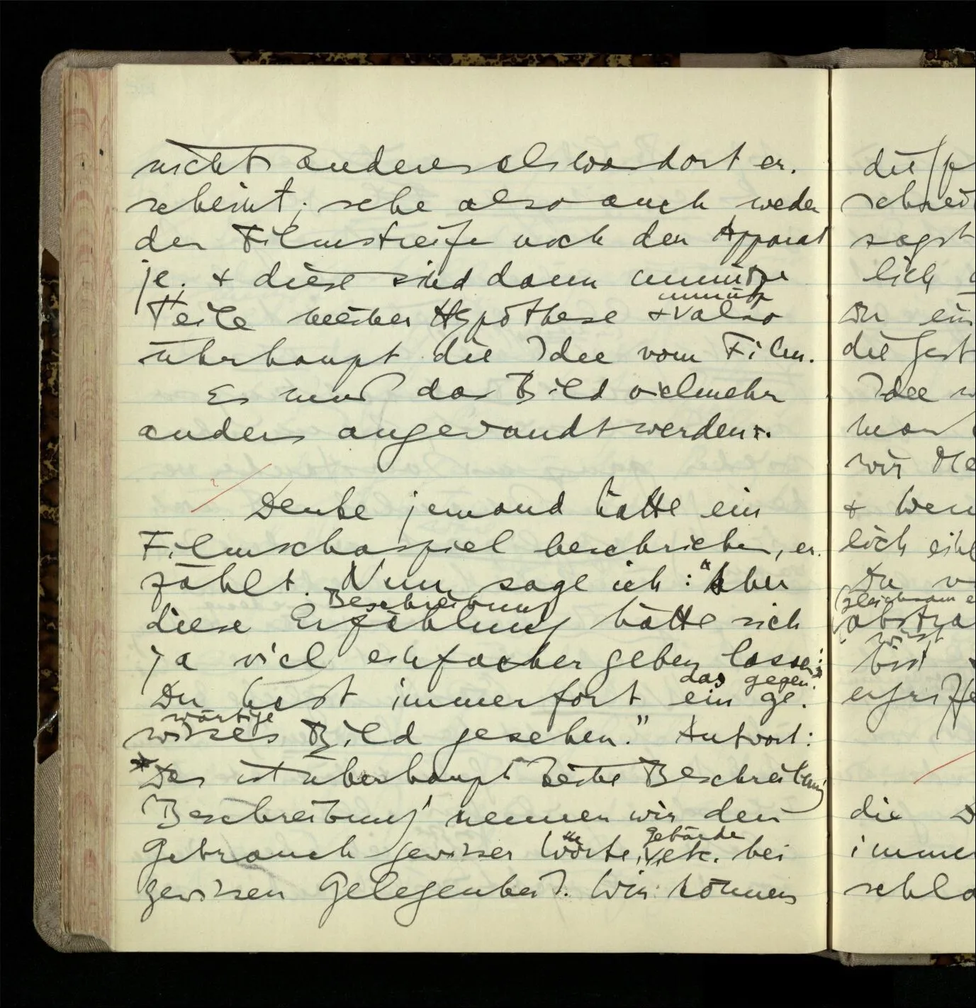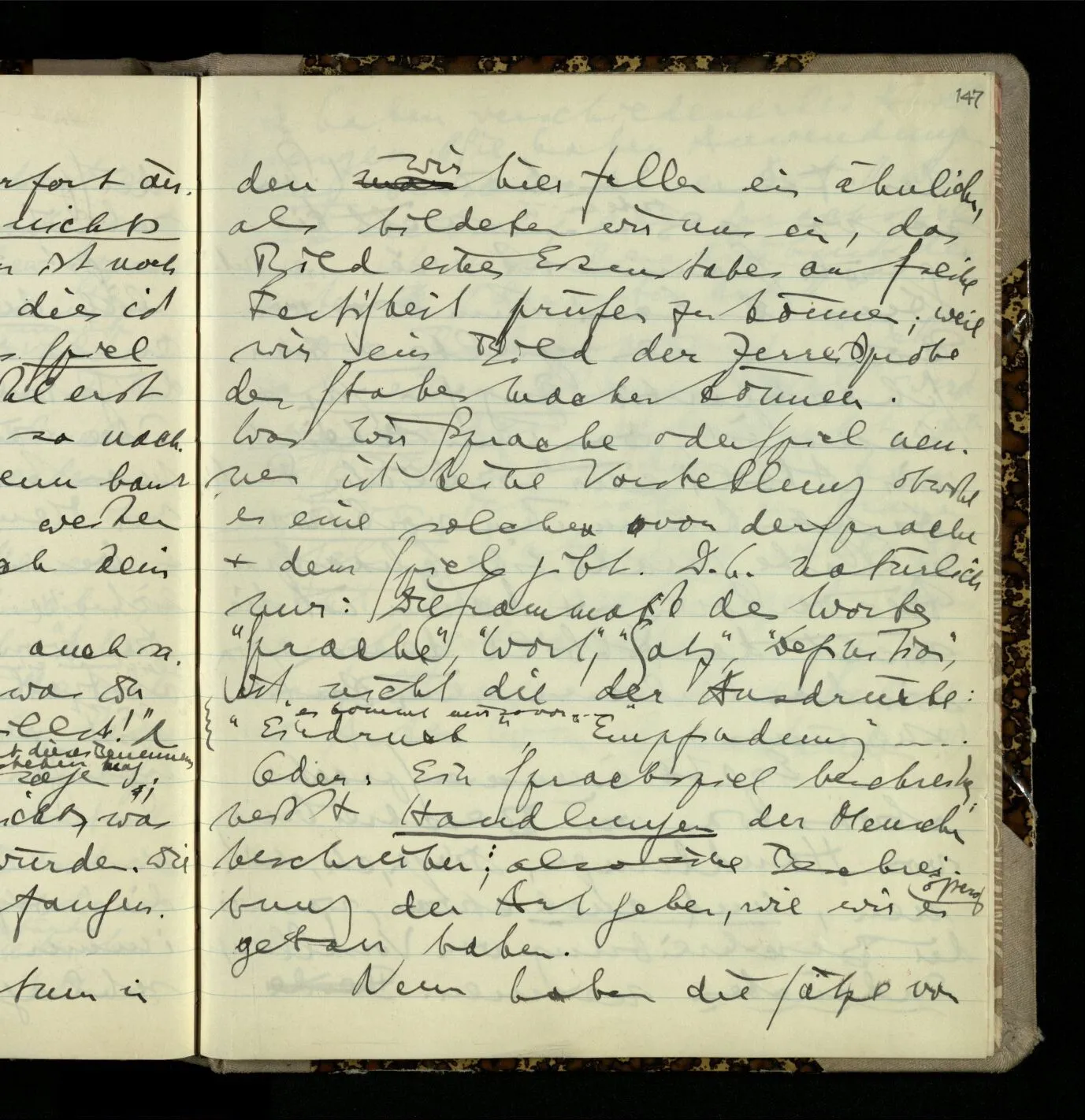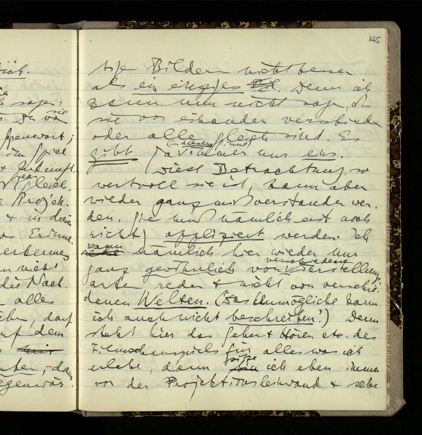 Man könnte glaube ich auch sagen: zu der Vorstellung, wie Du von ihr redest, gibt es nur Gegenwart; aber in der Sprache & im Spiel auch Vergangenheit & Zukunft. Die Vorstellung ist da gleichsam die gegenwärtige Projektion auf der Leinwand & in dieser Projektion wäre auch das Erinnerungserlebnis, Erlebnis des Wiedererkennens etc., etc.. Ist es mir nun nicht erlaubt, die Bilder die nacheinander folgen (& das alles enthalten) zu vergleichen, darf ich nicht die Bilder auf dem Filmstreifen sehen, die diesen Vergleich erlauben, – dann ist jene ‘Folge’ von gegenwärtigen Bildern nicht besser als ein einziges. Denn ich kann nun nicht sagen, ob sie von einander verschieden oder alle gleich sind. Es gibt ja (in diesem Sinne) immer nur eins. Diese Betrachtung, so wertvoll sie ist, kann aber wieder ganz mißverstanden werden. Sie muß nämlich erst noch richtig appliziert werden. Ich kann nämlich hier wieder nur ganz gewöhnlich von verschiedenen Darstellungsarten reden & nicht von verschiedenen Welten. (‘Das Unmögliche kann ich auch nicht beschreiben.’) Denn steht hier das Sehen & Hören etc. des Filmschauspiels für alles was ich erlebe, dann sitze ich eben immer vor der Projektionsleinwand & sehe nichts anderes als was dort erscheint; sehe also auch weder den Filmstreifen noch den Apparat je; & diese sind dann unnütze Teile meiner Hypothese & unnütz also überhaupt die Idee vom Film. Es muß das Bild vielmehr anders angewandt werden.