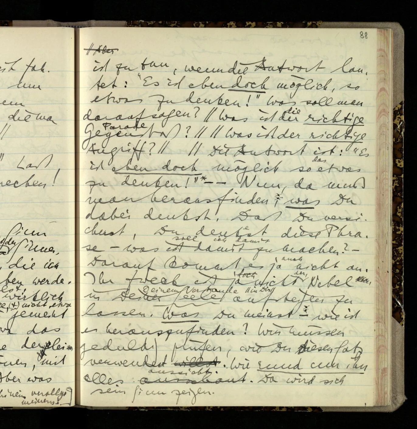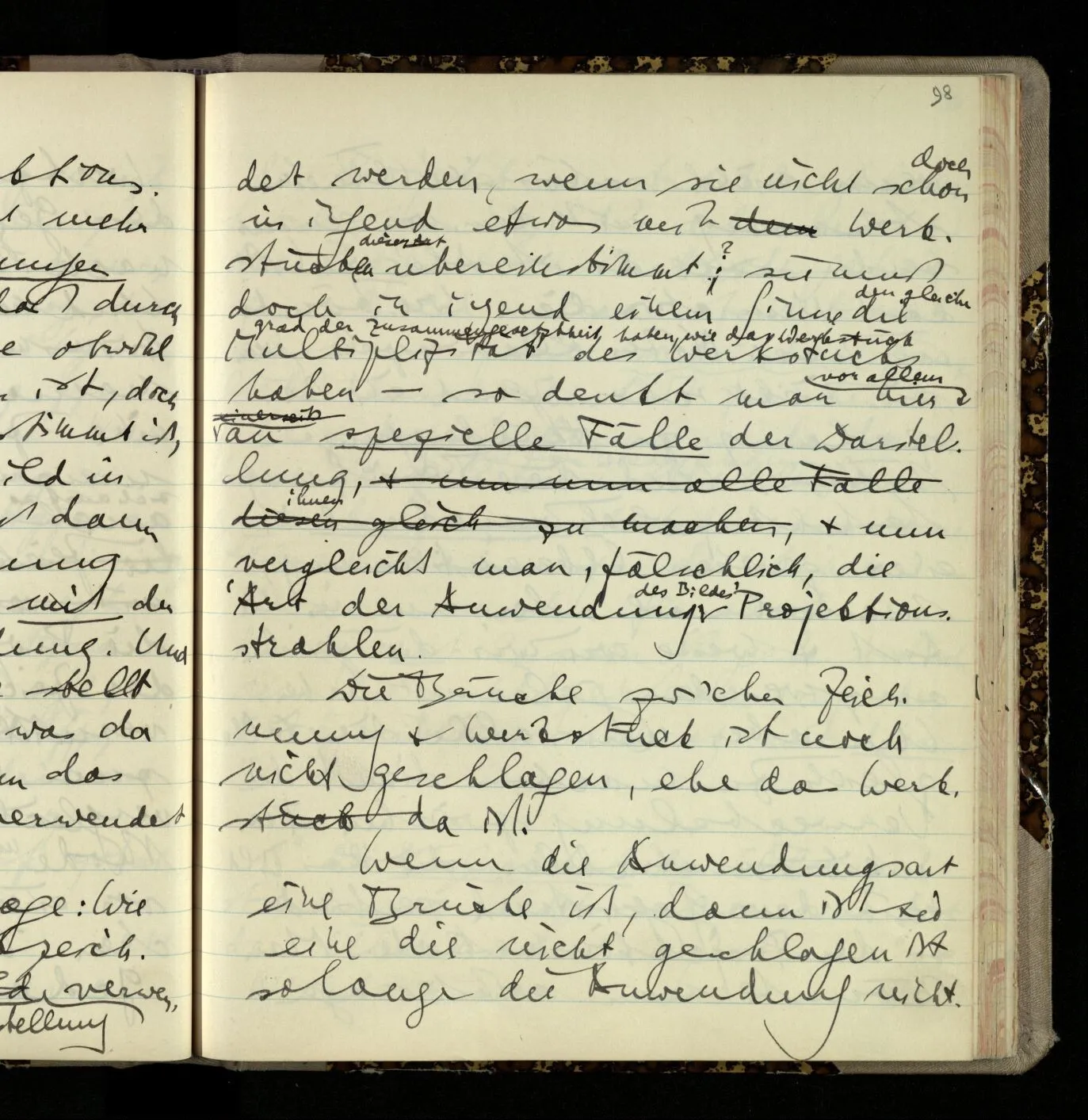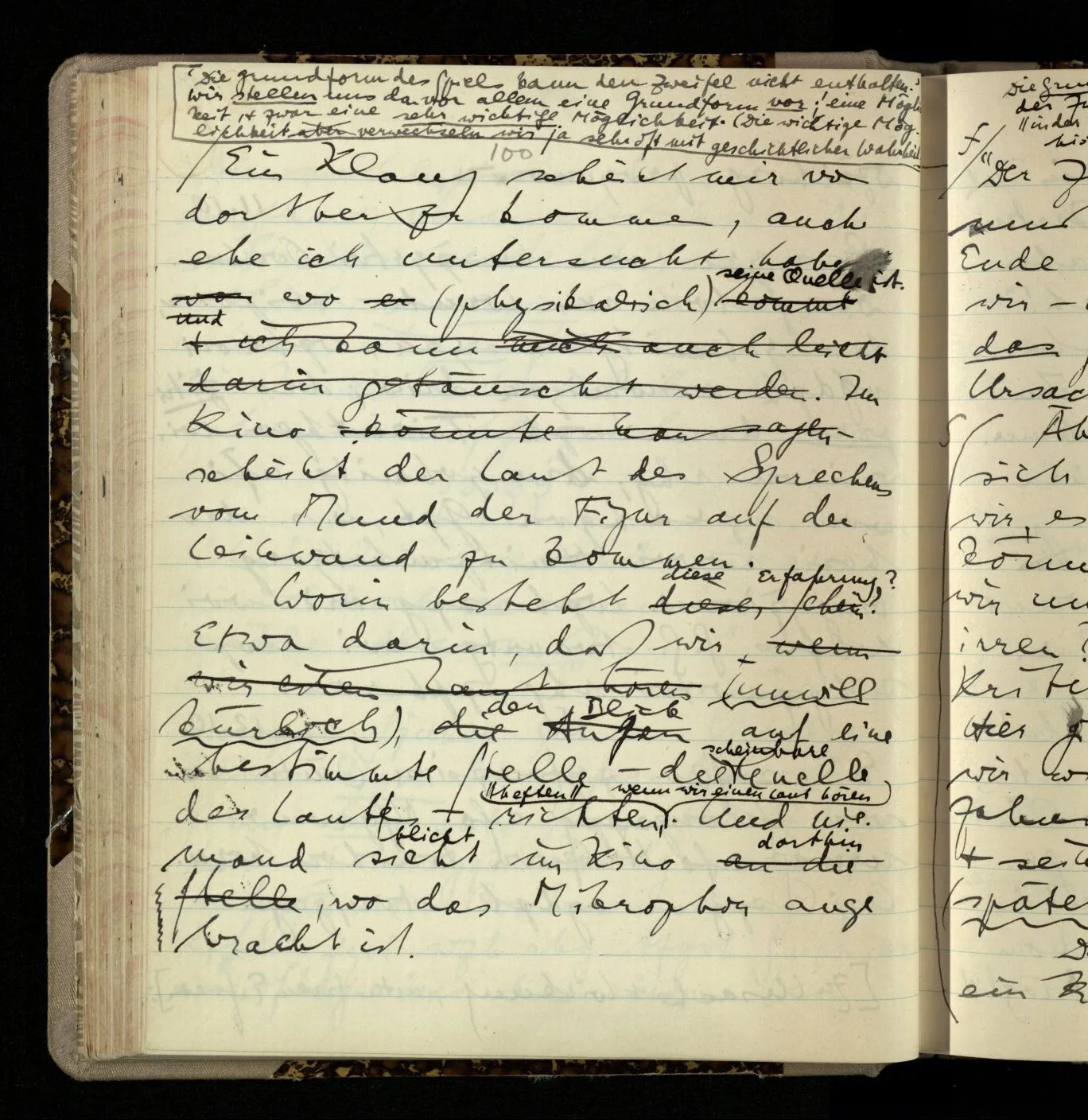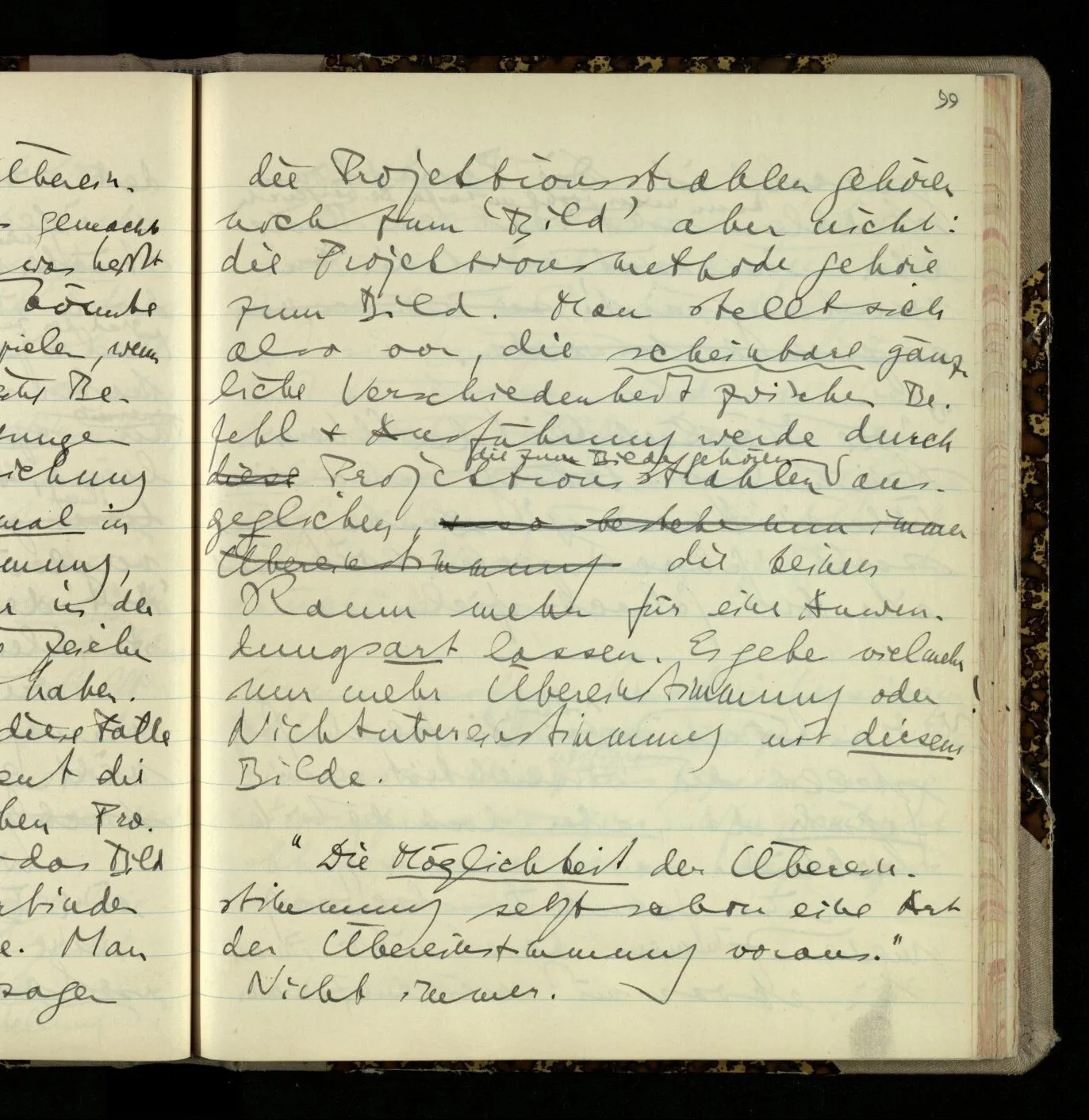 Man könnte glaube ich auch sagen: zu der Vorstellung, wie Du von ihr redest, gibt es nur Gegenwart; aber in der Sprache & im Spiel auch Vergangenheit & Zukunft. Die Vorstellung ist da gleichsam die gegenwärtige Projektion auf der Leinwand & in dieser Projektion wäre auch das Erinnerungserlebnis, Erlebnis des Wiedererkennens etc., etc.. Ist es mir nun nicht erlaubt, die Bilder die nacheinander folgen (& das alles enthalten) zu vergleichen, darf ich nicht die Bilder auf dem Filmstreifen sehen, die diesen Vergleich erlauben, – dann ist jene ‘Folge’ von gegenwärtigen Bildern nicht besser als ein einziges. Denn ich kann nun nicht sagen, ob sie von einander verschieden oder alle gleich sind. Es gibt ja (in diesem Sinne) immer nur eins. Diese Betrachtung, so wertvoll sie ist, kann aber wieder ganz mißverstanden werden. Sie muß nämlich erst noch richtig appliziert werden. Ich kann nämlich hier wieder nur ganz gewöhnlich von verschiedenen Darstellungsarten reden & nicht von verschiedenen Welten. (‘Das Unmögliche kann ich auch nicht beschreiben.’) Denn steht hier das Sehen & Hören etc. des Filmschauspiels für alles was ich erlebe, dann sitze ich eben immer vor der Projektionsleinwand & sehe nichts anderes als was dort erscheint; sehe also auch weder den Filmstreifen noch den Apparat je; & diese sind dann unnütze Teile meiner Hypothese & unnütz also überhaupt die Idee vom Film. Es muß das Bild vielmehr anders angewandt werden.