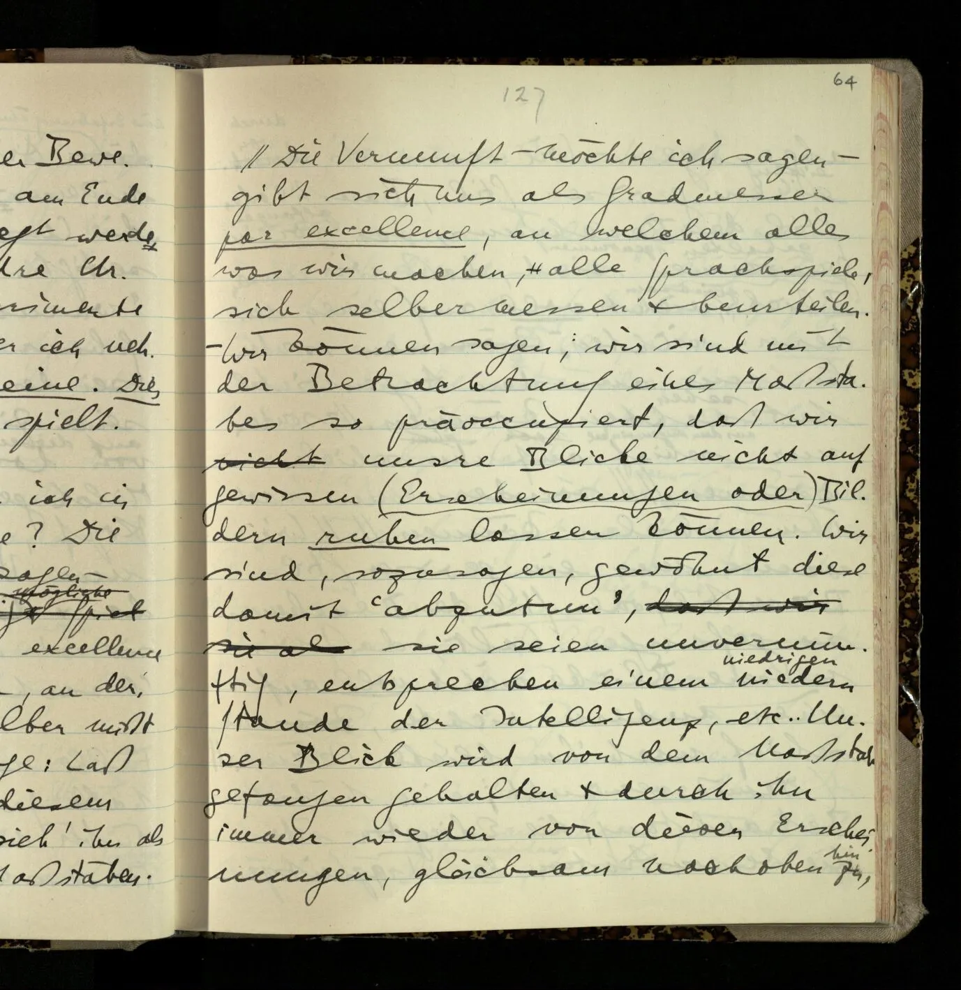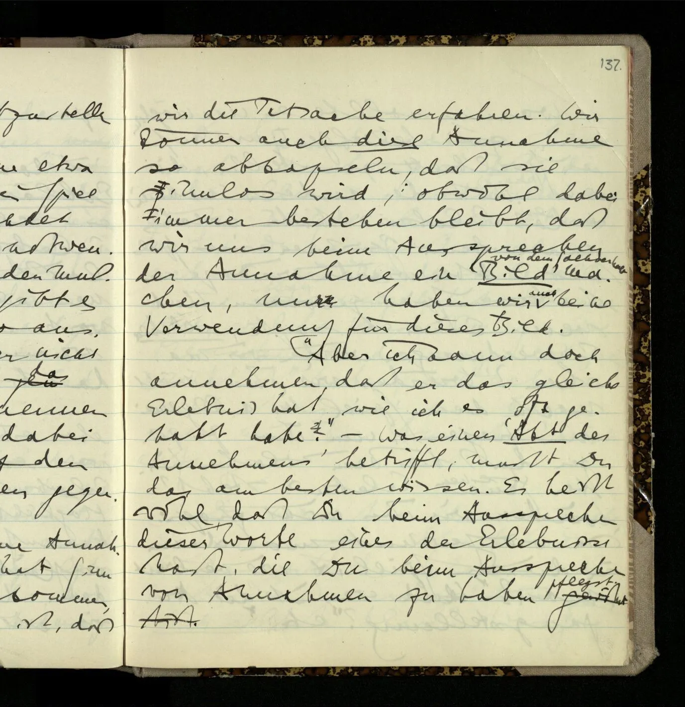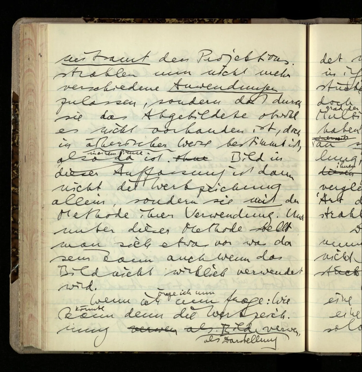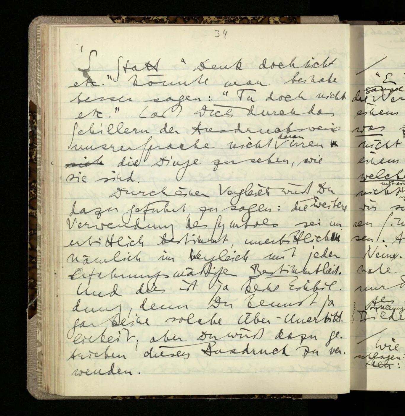 Man könnte glaube ich auch sagen: zu der Vorstellung, wie Du von ihr redest, gibt es nur Gegenwart; aber in der Sprache & im Spiel auch Vergangenheit & Zukunft. Die Vorstellung ist da gleichsam die gegenwärtige Projektion auf der Leinwand & in dieser Projektion wäre auch das Erinnerungserlebnis, Erlebnis des Wiedererkennens etc., etc.. Ist es mir nun nicht erlaubt, die Bilder die nacheinander folgen (& das alles enthalten) zu vergleichen, darf ich nicht die Bilder auf dem Filmstreifen sehen, die diesen Vergleich erlauben, – dann ist jene ‘Folge’ von gegenwärtigen Bildern nicht besser als ein einziges. Denn ich kann nun nicht sagen, ob sie von einander verschieden oder alle gleich sind. Es gibt ja (in diesem Sinne) immer nur eins. Diese Betrachtung, so wertvoll sie ist, kann aber wieder ganz mißverstanden werden. Sie muß nämlich erst noch richtig appliziert werden. Ich kann nämlich hier wieder nur ganz gewöhnlich von verschiedenen Darstellungsarten reden & nicht von verschiedenen Welten. (‘Das Unmögliche kann ich auch nicht beschreiben.’) Denn steht hier das Sehen & Hören etc. des Filmschauspiels für alles was ich erlebe, dann sitze ich eben immer vor der Projektionsleinwand & sehe nichts anderes als was dort erscheint; sehe also auch weder den Filmstreifen noch den Apparat je; & diese sind dann unnütze Teile meiner Hypothese & unnütz also überhaupt die Idee vom Film. Es muß das Bild vielmehr anders angewandt werden.