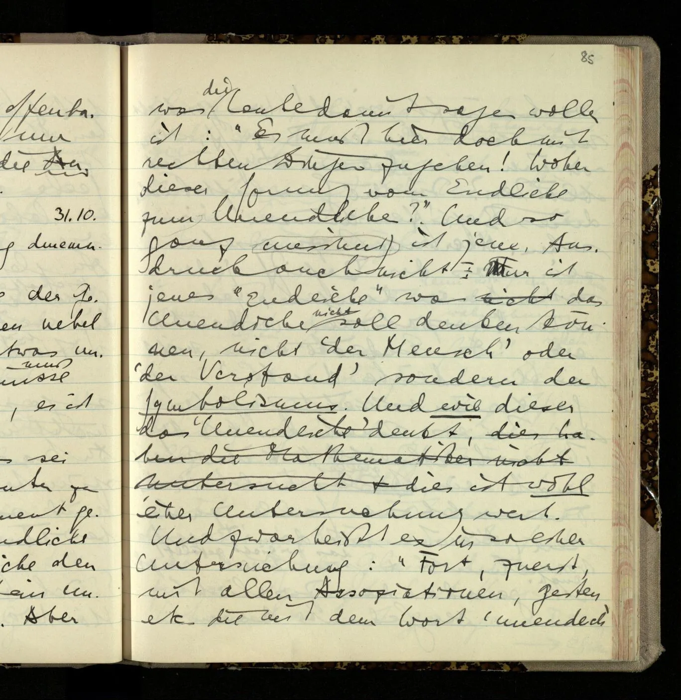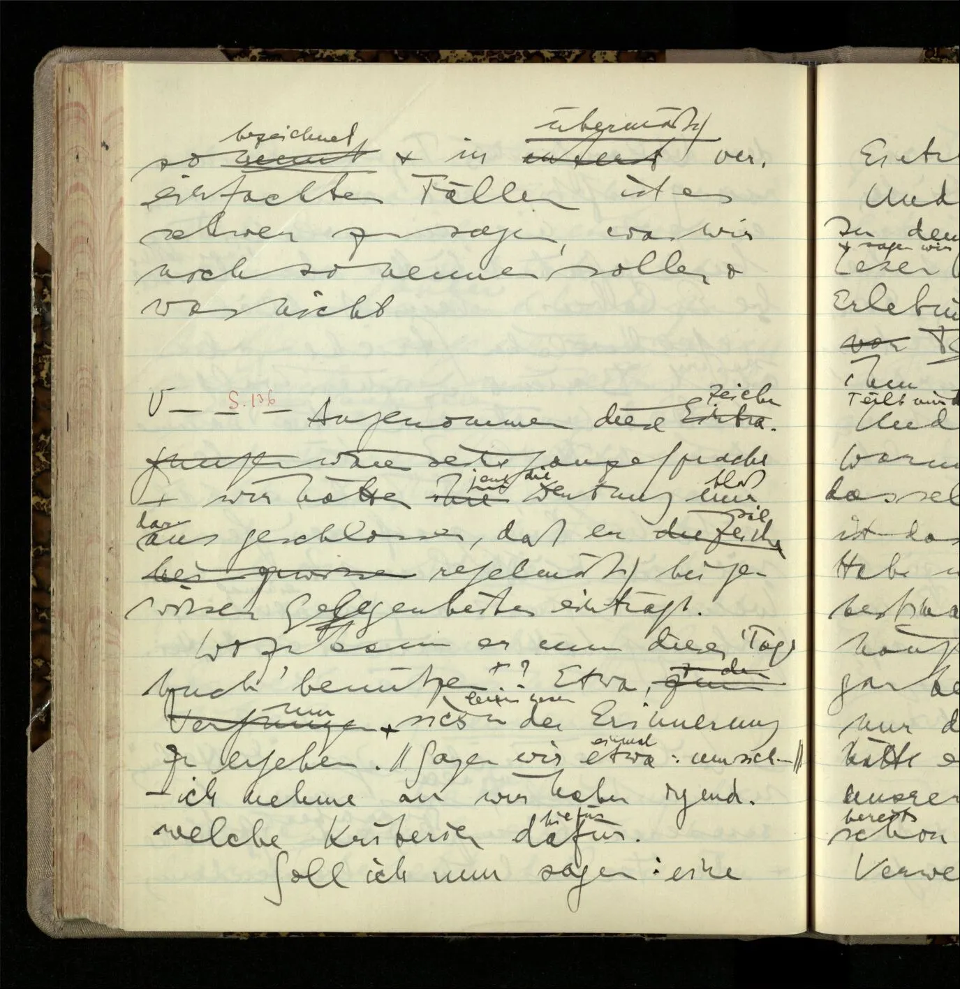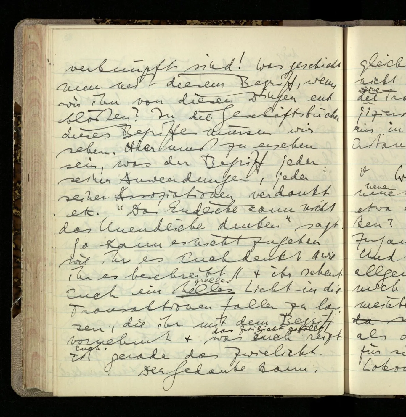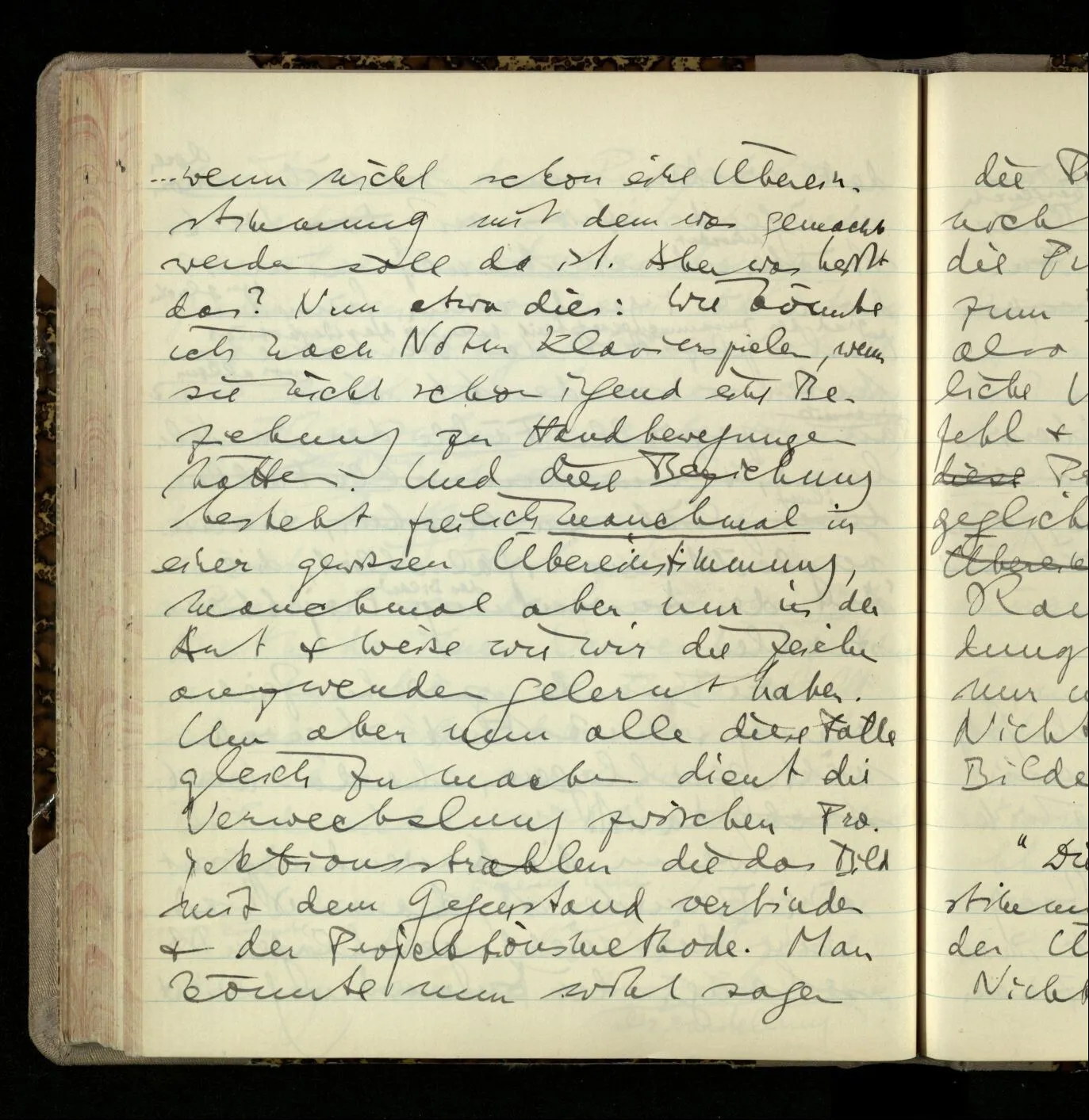 Man könnte glaube ich auch sagen: zu der Vorstellung, wie Du von ihr redest, gibt es nur Gegenwart; aber in der Sprache & im Spiel auch Vergangenheit & Zukunft. Die Vorstellung ist da gleichsam die gegenwärtige Projektion auf der Leinwand & in dieser Projektion wäre auch das Erinnerungserlebnis, Erlebnis des Wiedererkennens etc., etc.. Ist es mir nun nicht erlaubt, die Bilder die nacheinander folgen (& das alles enthalten) zu vergleichen, darf ich nicht die Bilder auf dem Filmstreifen sehen, die diesen Vergleich erlauben, – dann ist jene ‘Folge’ von gegenwärtigen Bildern nicht besser als ein einziges. Denn ich kann nun nicht sagen, ob sie von einander verschieden oder alle gleich sind. Es gibt ja (in diesem Sinne) immer nur eins. Diese Betrachtung, so wertvoll sie ist, kann aber wieder ganz mißverstanden werden. Sie muß nämlich erst noch richtig appliziert werden. Ich kann nämlich hier wieder nur ganz gewöhnlich von verschiedenen Darstellungsarten reden & nicht von verschiedenen Welten. (‘Das Unmögliche kann ich auch nicht beschreiben.’) Denn steht hier das Sehen & Hören etc. des Filmschauspiels für alles was ich erlebe, dann sitze ich eben immer vor der Projektionsleinwand & sehe nichts anderes als was dort erscheint; sehe also auch weder den Filmstreifen noch den Apparat je; & diese sind dann unnütze Teile meiner Hypothese & unnütz also überhaupt die Idee vom Film. Es muß das Bild vielmehr anders angewandt werden.