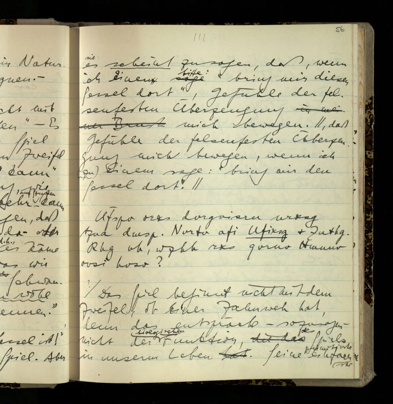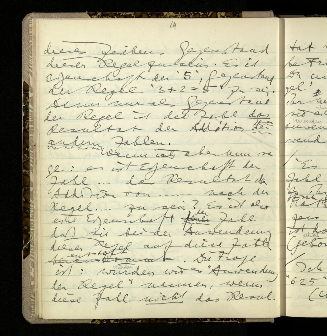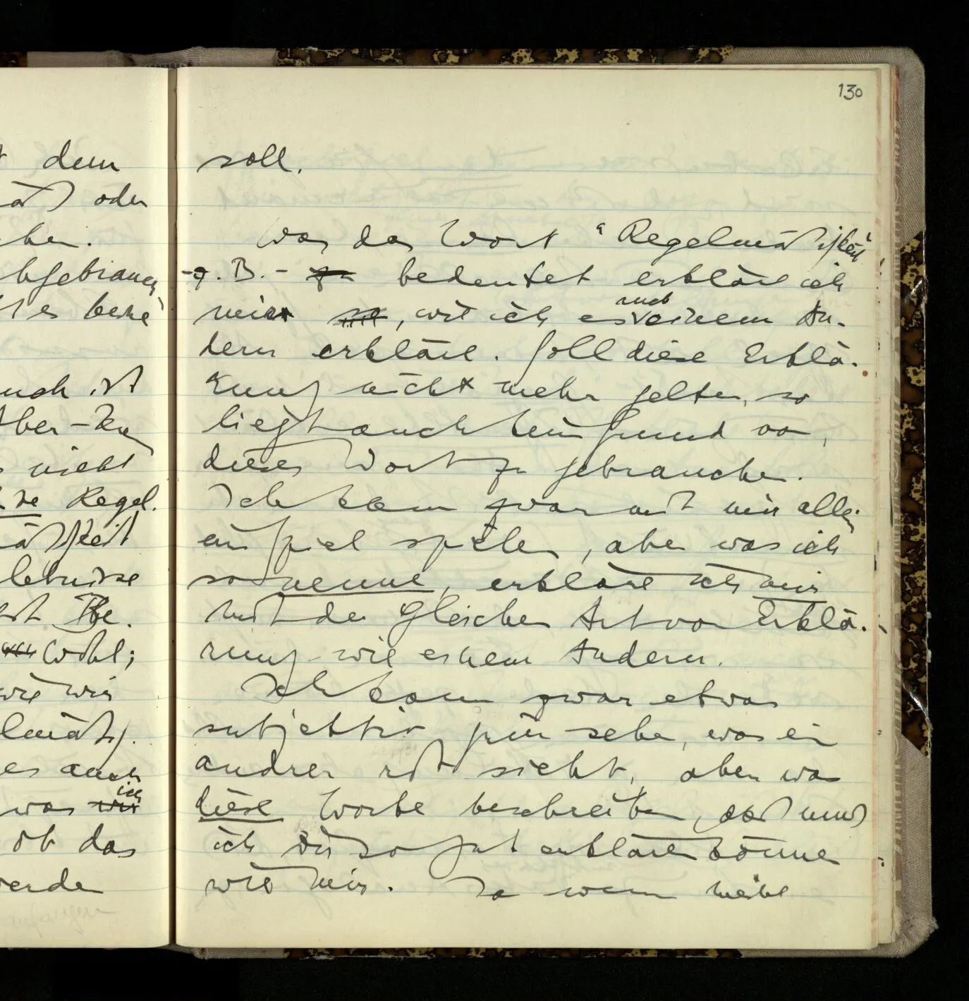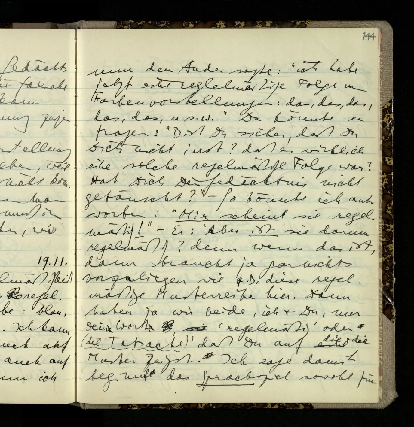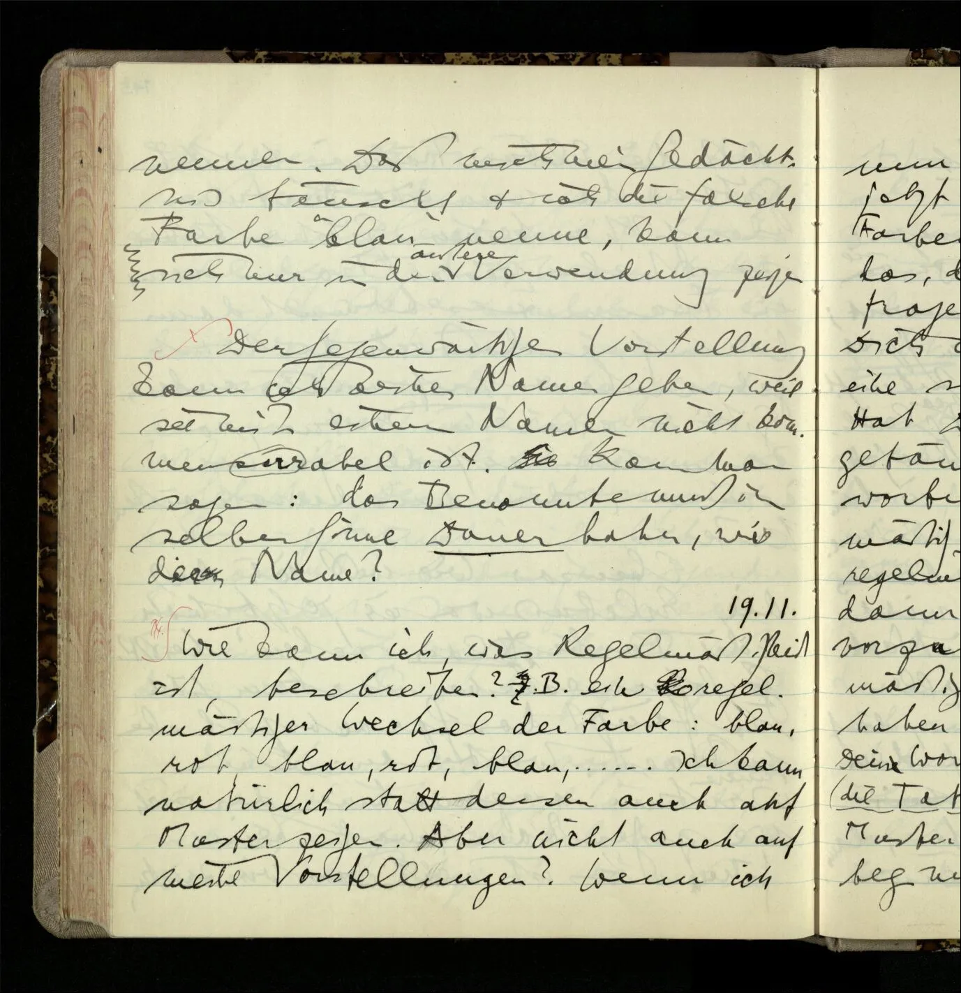19.11.1937 Wie kann ich, was Regelmäßigkeit ist, beschreiben? z.B. ein regelmäßiger Wechsel der Farbe: blau, rot, blau, rot, blau, …. Ich kann natürlich statt dessen auch auf Muster zeigen. Aber nicht auch auf meine Vorstellungen? Wenn ich nun dem Andern sagte: “ich habe jetzt eine regelmäßige Folge von Farbenvorstellungen: das, das, das, das, das, u.s.w.” Da könnte er fragen: “Bist Du sicher, daß Du Dich nicht irrst? daß es wirklich eine solche regelmäßige Folge war? Hat Dich Dein Gedächtnis nicht getäuscht?” – So könnte ich antworten: “Mir scheint sie regelmäßig!” – Er: “Aber ist sie darum regelmäßig? denn wenn das ist, dann braucht ja gar nichts vorzuliegen wie z.B. diese regelmäßige Musterreihe hier. Dann haben ja wir beide, ich & Du, nur Dein Wort, ‘regelmäßig’ oder (die Tatsache) daß Du auf die & die Muster zeigst. Ich sage damit beginnt das Sprachspiel sowohl für mich als auch für Dich.
