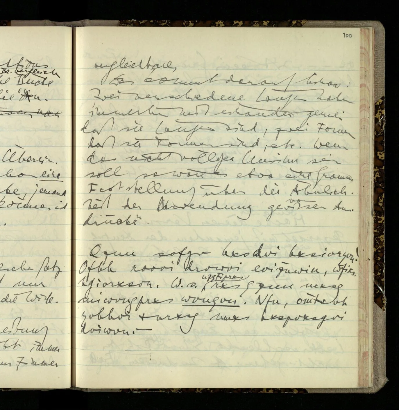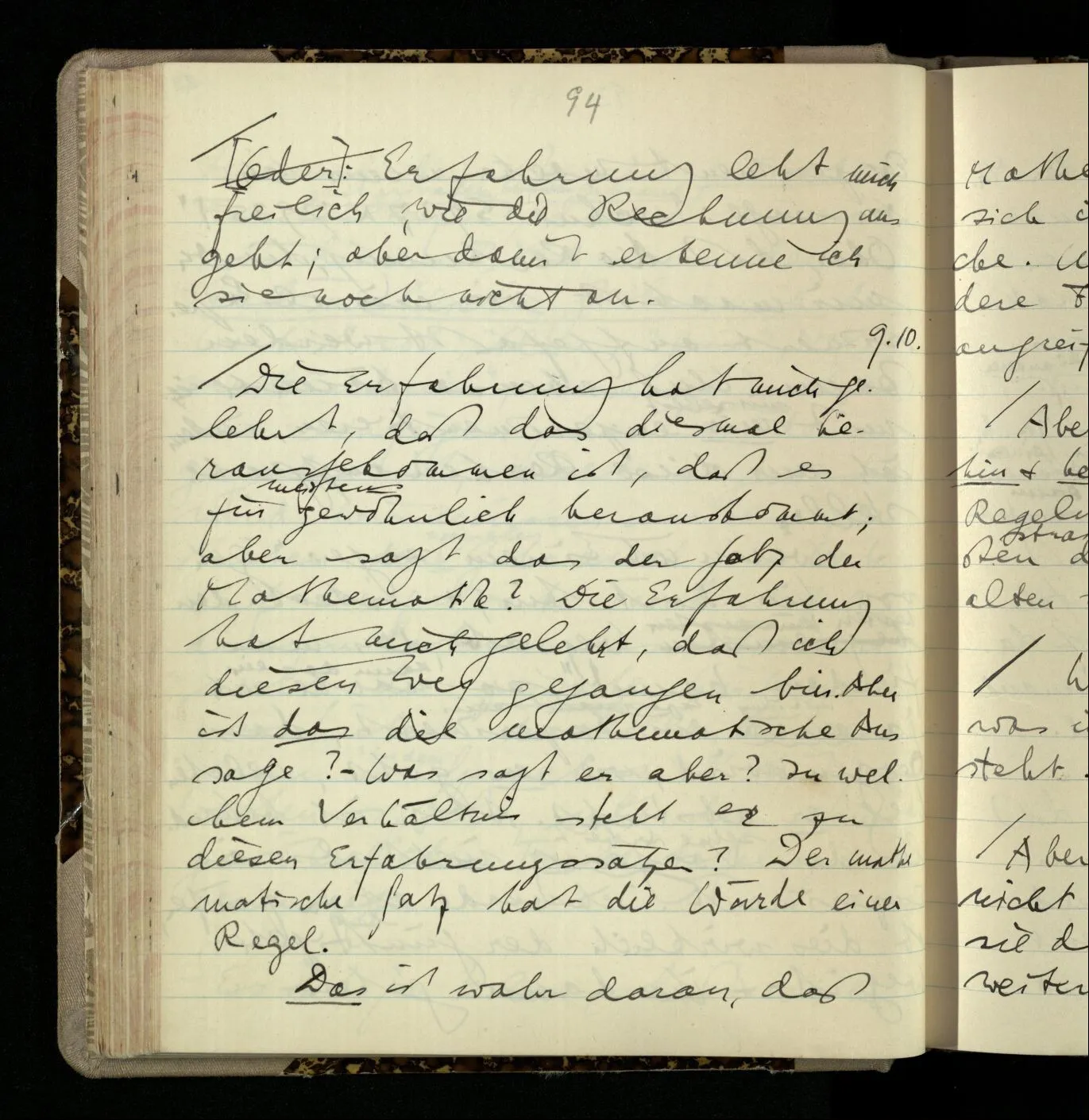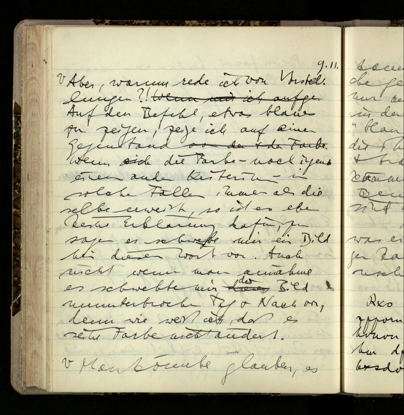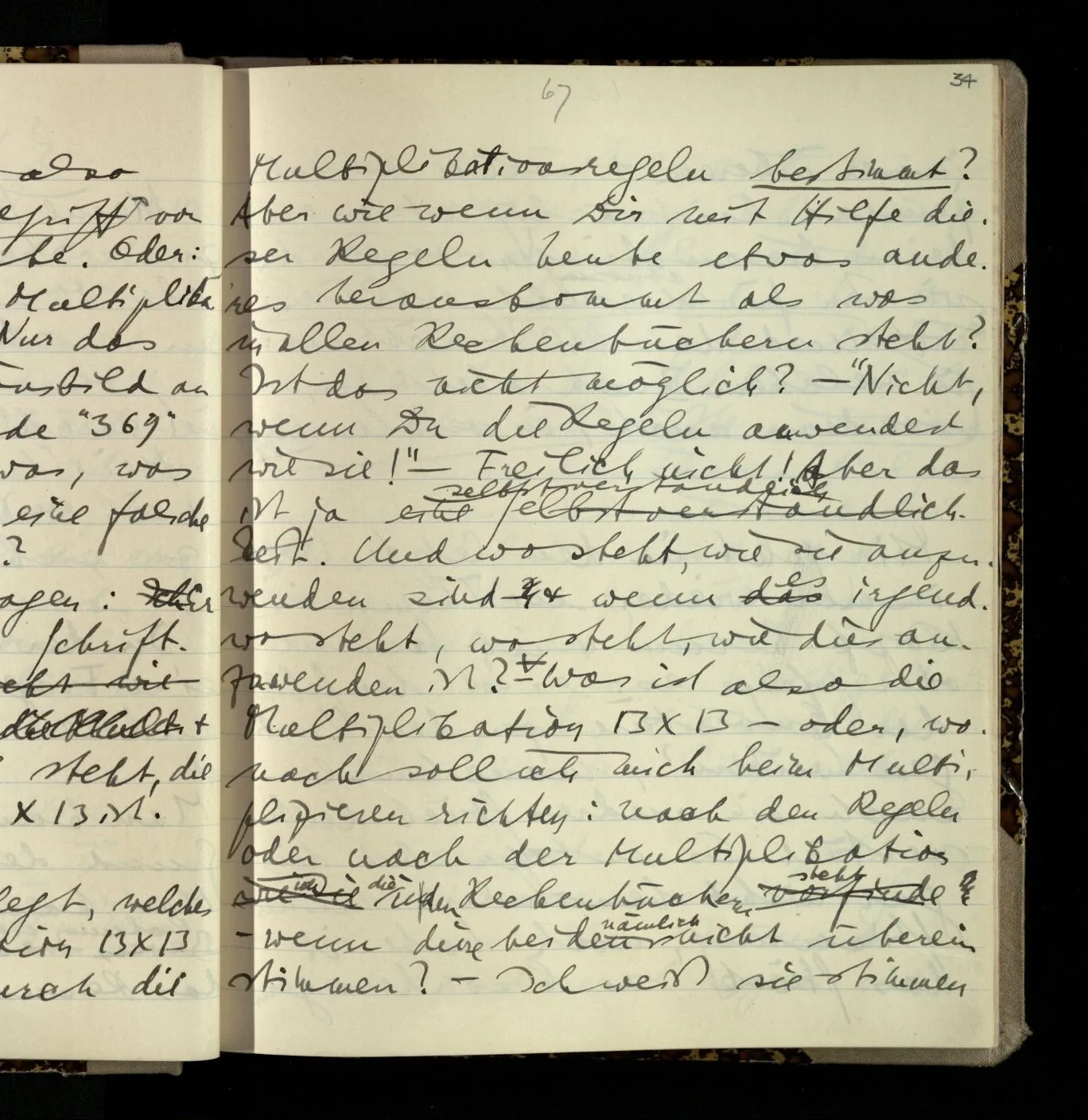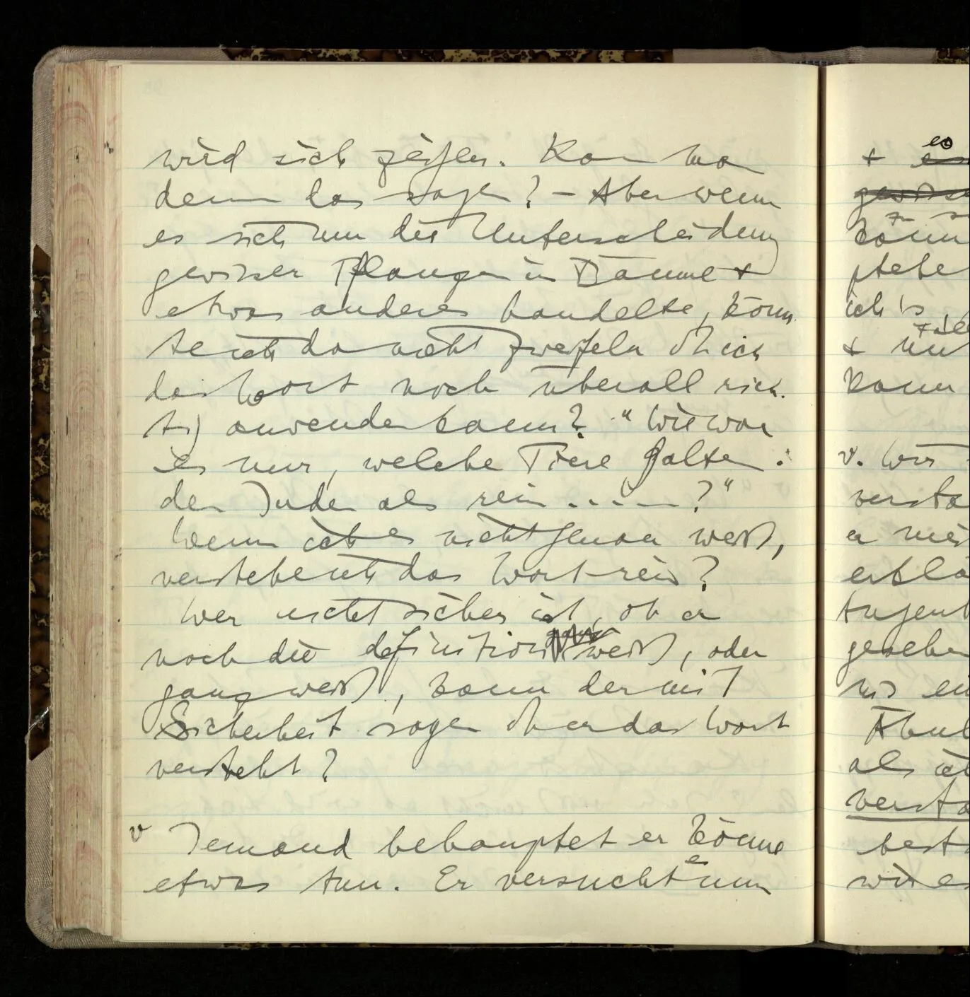 19.11.1937 Wie kann ich, was Regelmäßigkeit ist, beschreiben? z.B. ein regelmäßiger Wechsel der Farbe: blau, rot, blau, rot, blau, …. Ich kann natürlich statt dessen auch auf Muster zeigen. Aber nicht auch auf meine Vorstellungen? Wenn ich nun dem Andern sagte: “ich habe jetzt eine regelmäßige Folge von Farbenvorstellungen: das, das, das, das, das, u.s.w.” Da könnte er fragen: “Bist Du sicher, daß Du Dich nicht irrst? daß es wirklich eine solche regelmäßige Folge war? Hat Dich Dein Gedächtnis nicht getäuscht?” – So könnte ich antworten: “Mir scheint sie regelmäßig!” – Er: “Aber ist sie darum regelmäßig? denn wenn das ist, dann braucht ja gar nichts vorzuliegen wie z.B. diese regelmäßige Musterreihe hier. Dann haben ja wir beide, ich & Du, nur Dein Wort, ‘regelmäßig’ oder (die Tatsache) daß Du auf die & die Muster zeigst. Ich sage damit beginnt das Sprachspiel sowohl für mich als auch für Dich.