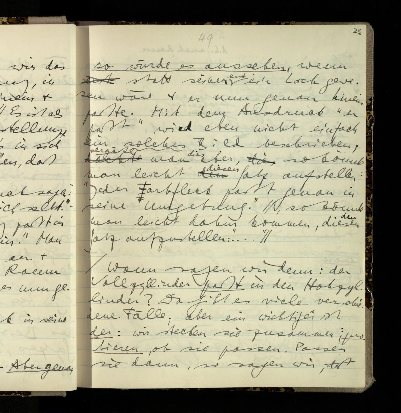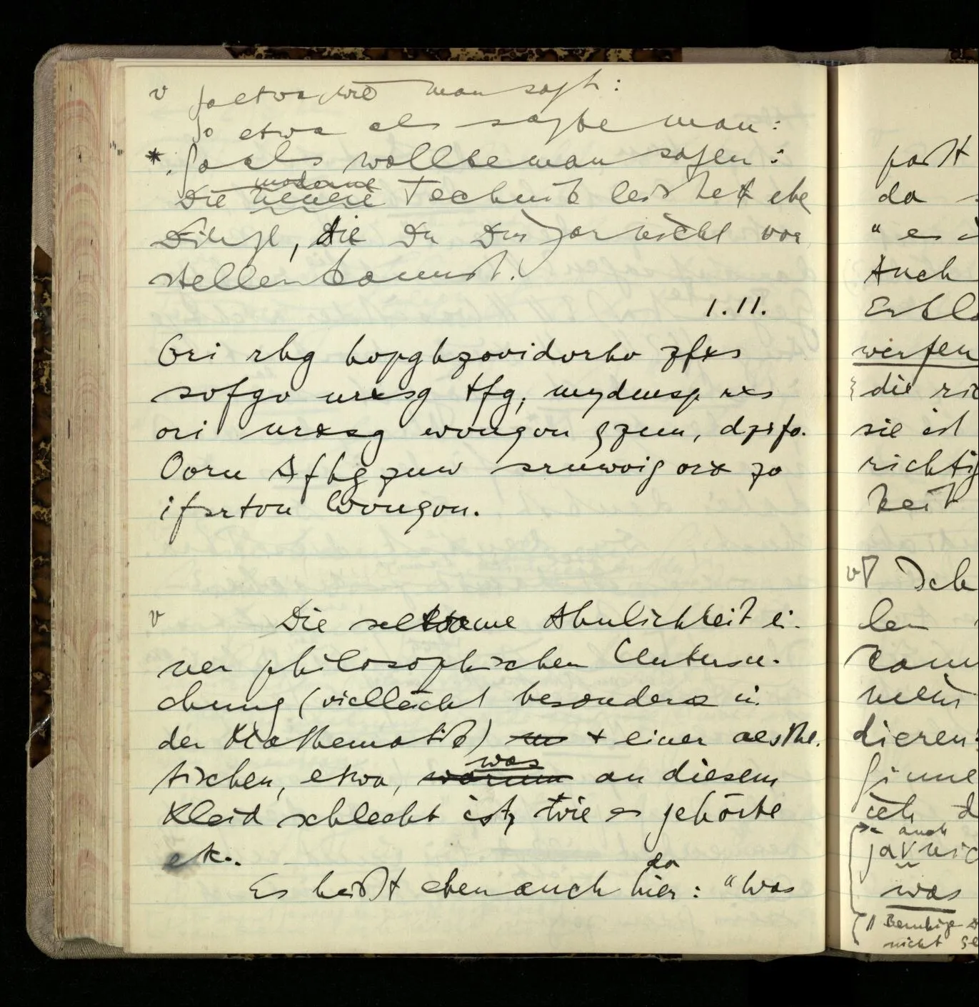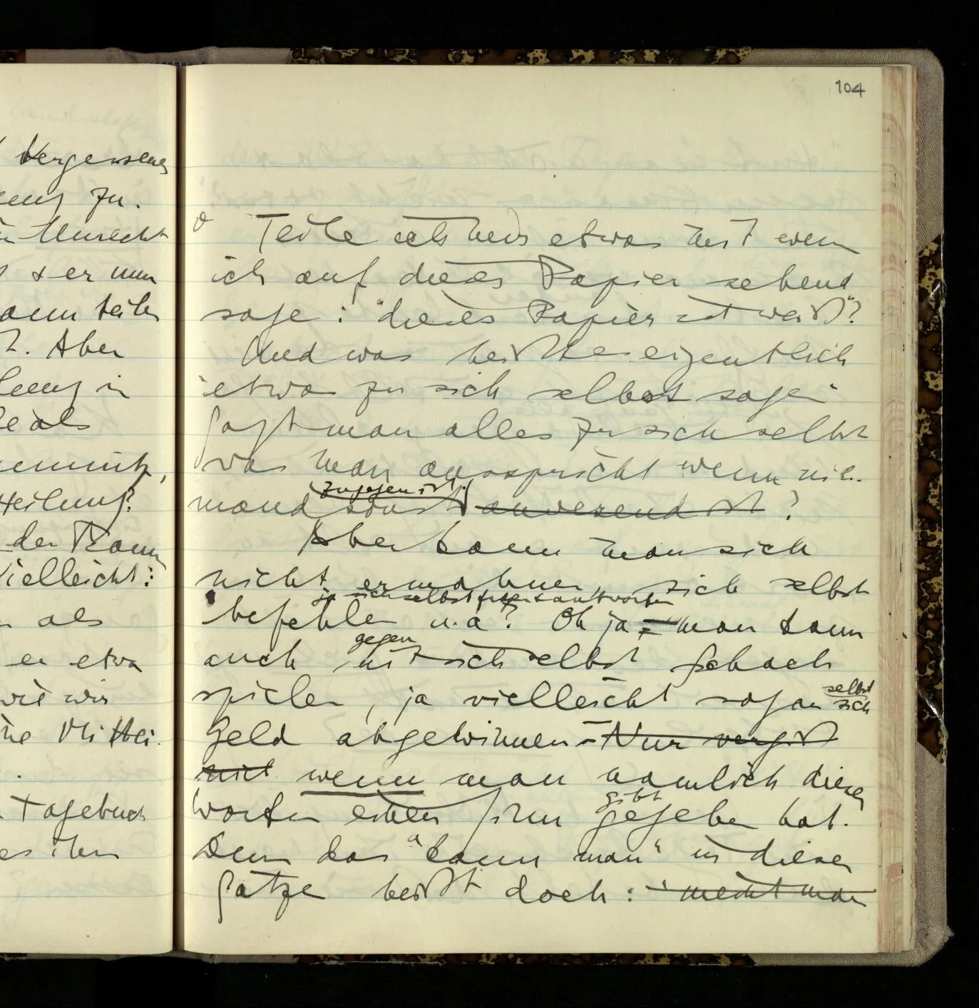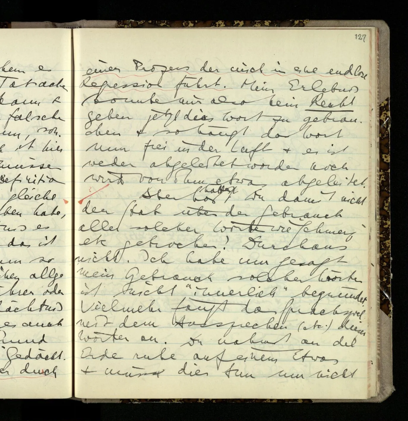 19.11.1937 Wie kann ich, was Regelmäßigkeit ist, beschreiben? z.B. ein regelmäßiger Wechsel der Farbe: blau, rot, blau, rot, blau, …. Ich kann natürlich statt dessen auch auf Muster zeigen. Aber nicht auch auf meine Vorstellungen? Wenn ich nun dem Andern sagte: “ich habe jetzt eine regelmäßige Folge von Farbenvorstellungen: das, das, das, das, das, u.s.w.” Da könnte er fragen: “Bist Du sicher, daß Du Dich nicht irrst? daß es wirklich eine solche regelmäßige Folge war? Hat Dich Dein Gedächtnis nicht getäuscht?” – So könnte ich antworten: “Mir scheint sie regelmäßig!” – Er: “Aber ist sie darum regelmäßig? denn wenn das ist, dann braucht ja gar nichts vorzuliegen wie z.B. diese regelmäßige Musterreihe hier. Dann haben ja wir beide, ich & Du, nur Dein Wort, ‘regelmäßig’ oder (die Tatsache) daß Du auf die & die Muster zeigst. Ich sage damit beginnt das Sprachspiel sowohl für mich als auch für Dich.