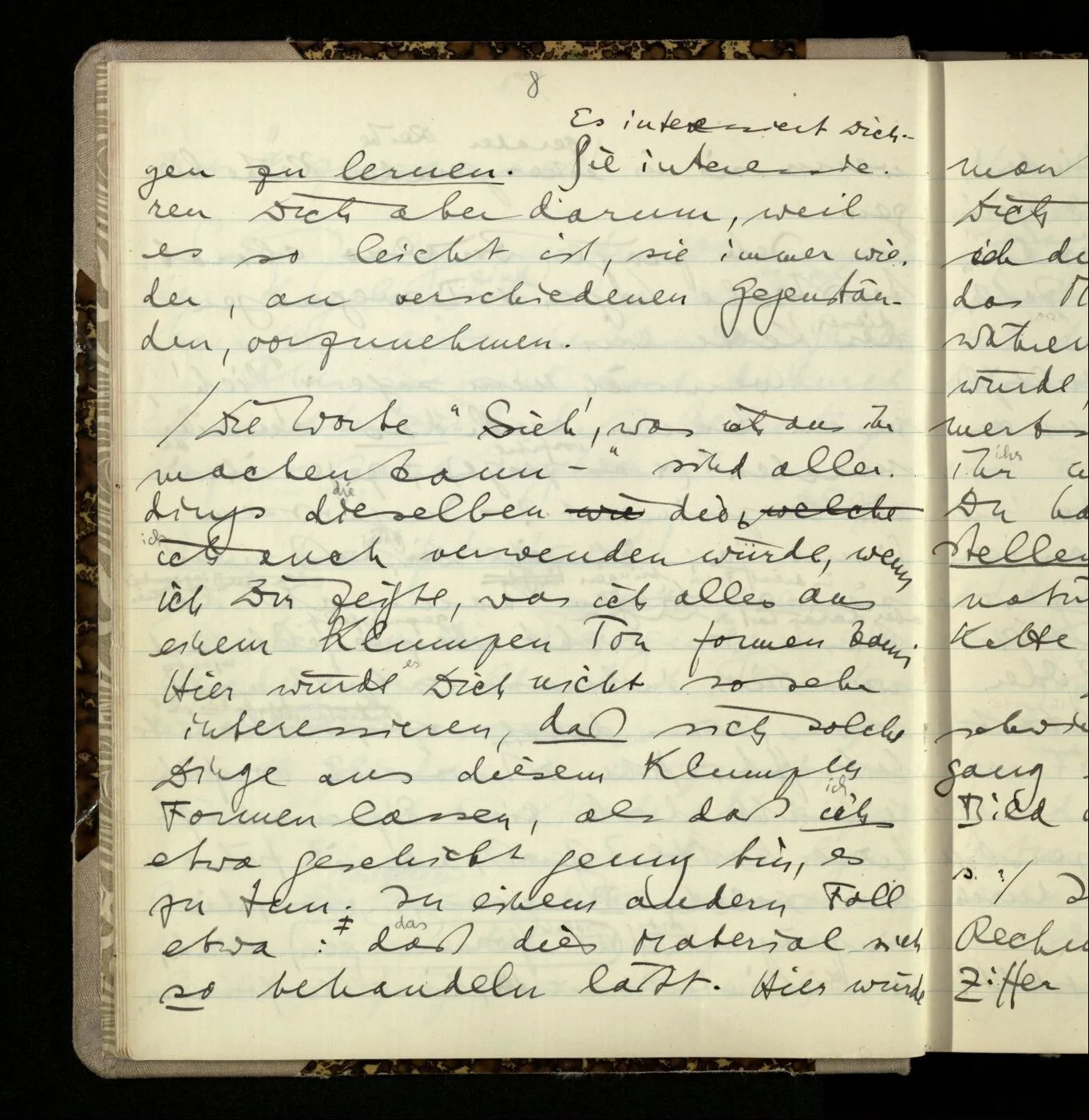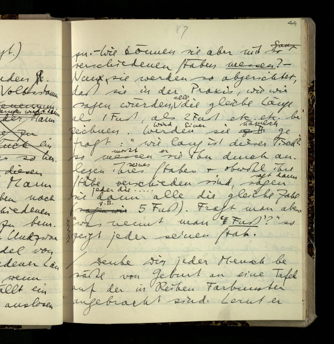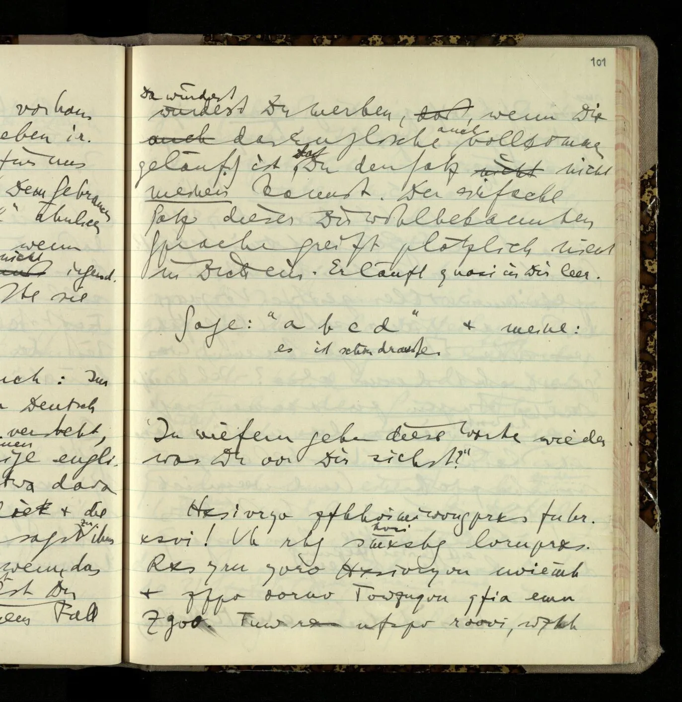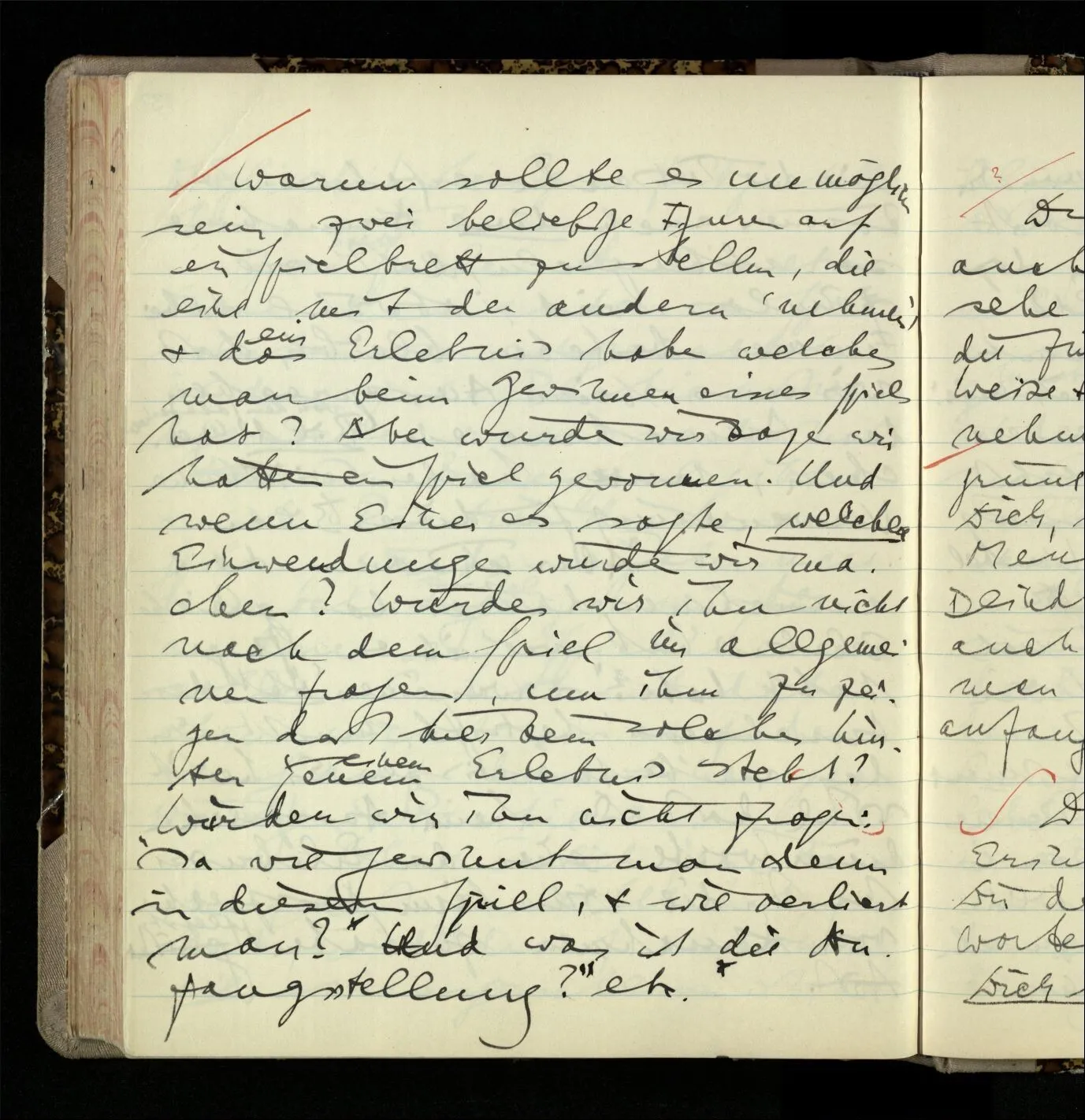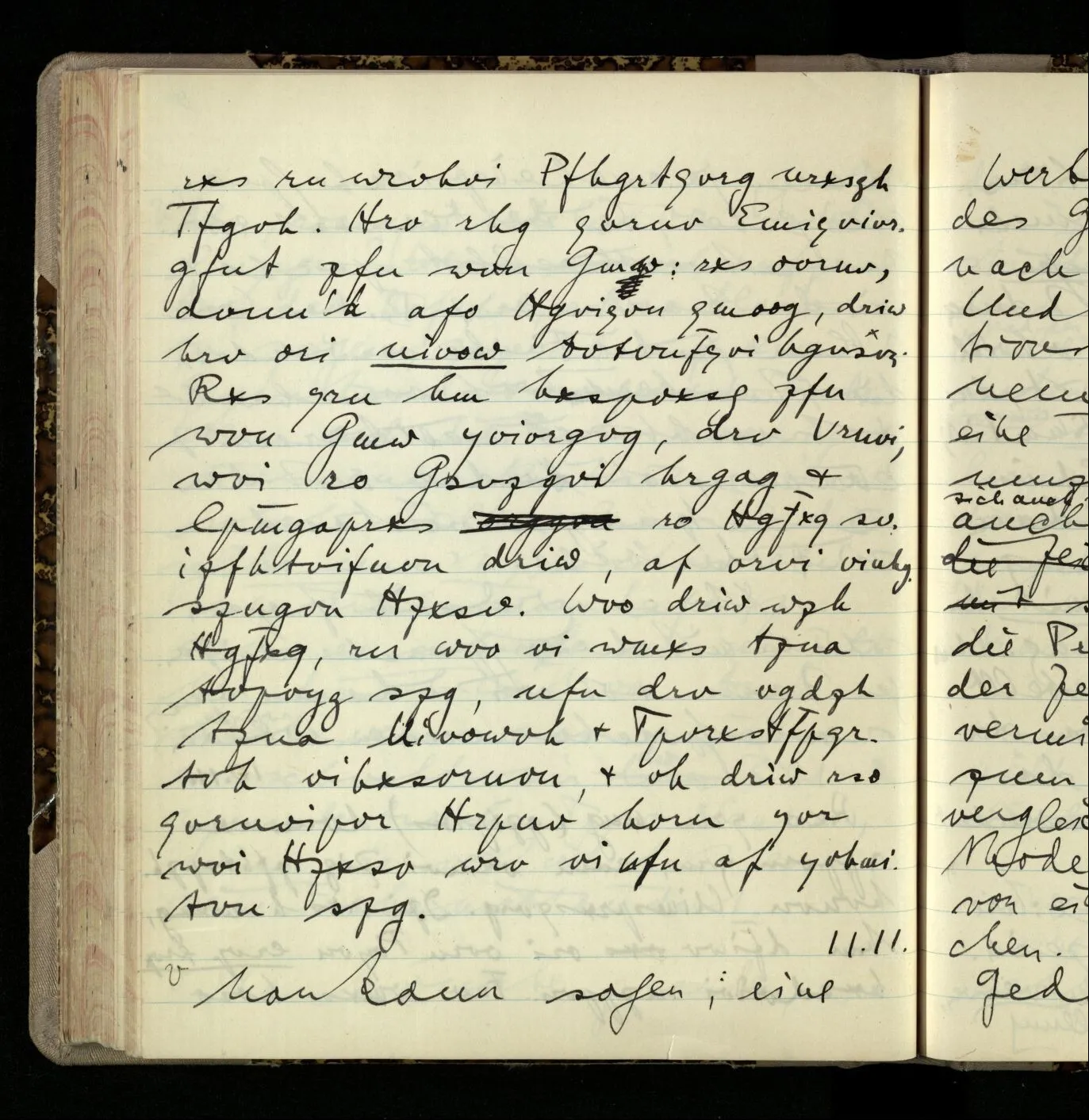 19.11.1937 Wie kann ich, was Regelmäßigkeit ist, beschreiben? z.B. ein regelmäßiger Wechsel der Farbe: blau, rot, blau, rot, blau, …. Ich kann natürlich statt dessen auch auf Muster zeigen. Aber nicht auch auf meine Vorstellungen? Wenn ich nun dem Andern sagte: “ich habe jetzt eine regelmäßige Folge von Farbenvorstellungen: das, das, das, das, das, u.s.w.” Da könnte er fragen: “Bist Du sicher, daß Du Dich nicht irrst? daß es wirklich eine solche regelmäßige Folge war? Hat Dich Dein Gedächtnis nicht getäuscht?” – So könnte ich antworten: “Mir scheint sie regelmäßig!” – Er: “Aber ist sie darum regelmäßig? denn wenn das ist, dann braucht ja gar nichts vorzuliegen wie z.B. diese regelmäßige Musterreihe hier. Dann haben ja wir beide, ich & Du, nur Dein Wort, ‘regelmäßig’ oder (die Tatsache) daß Du auf die & die Muster zeigst. Ich sage damit beginnt das Sprachspiel sowohl für mich als auch für Dich.