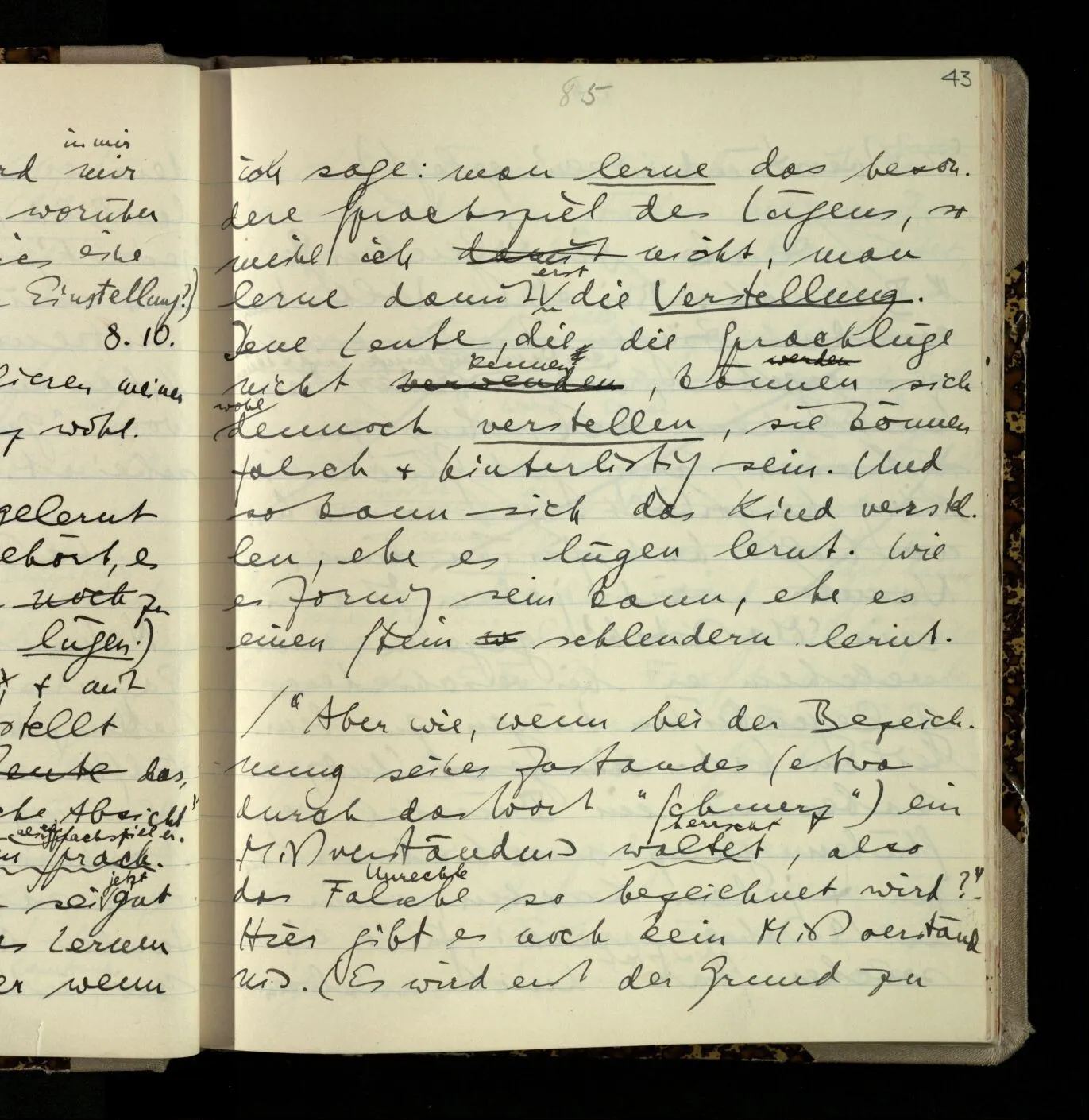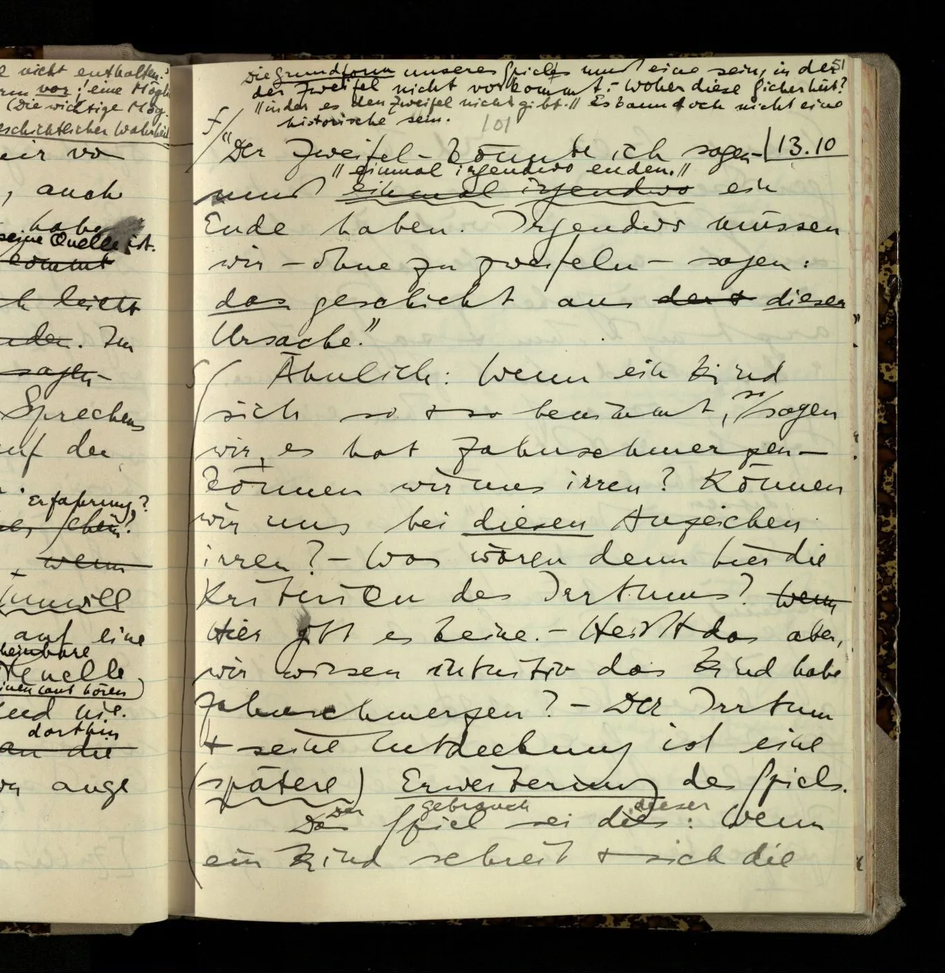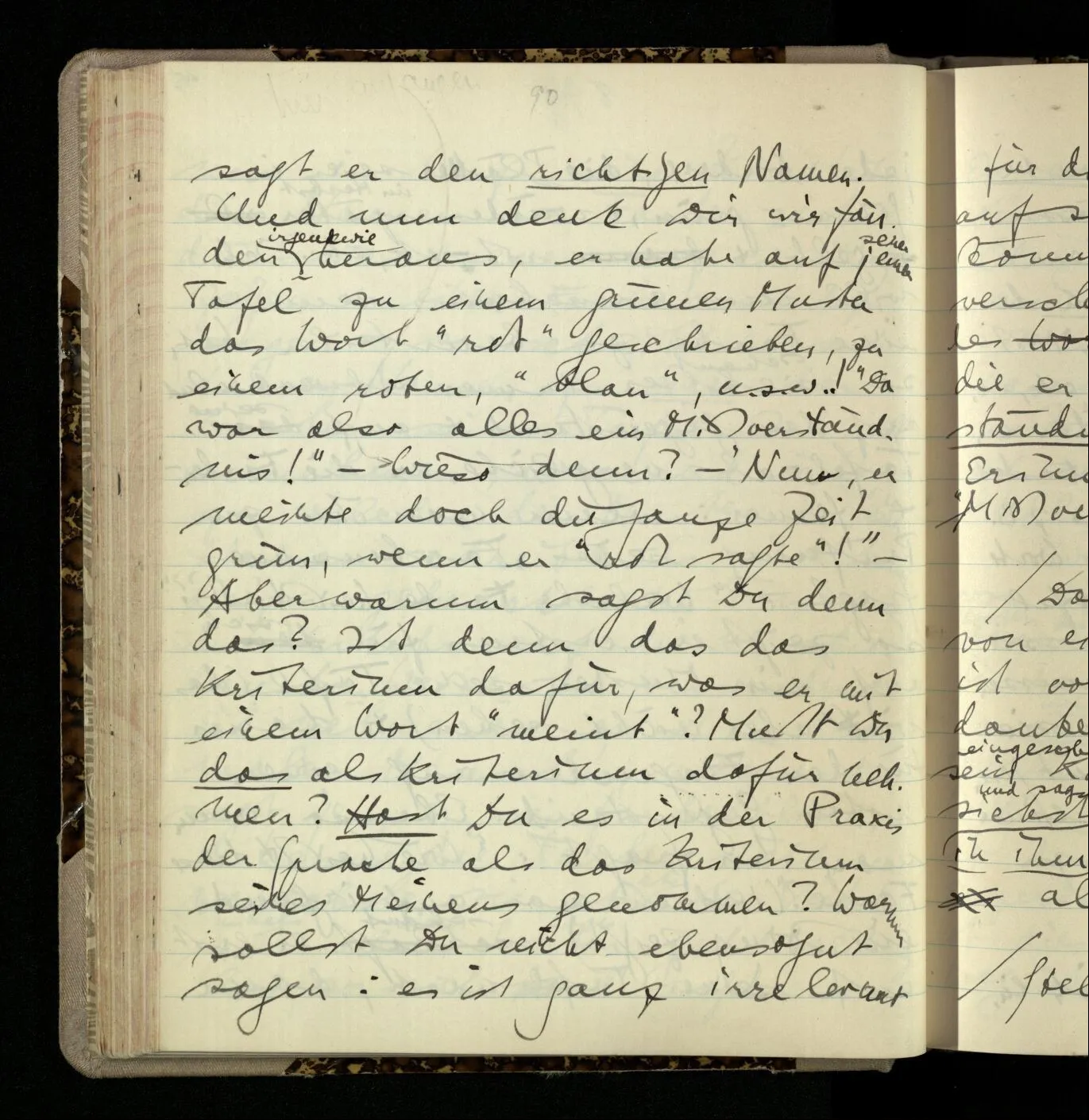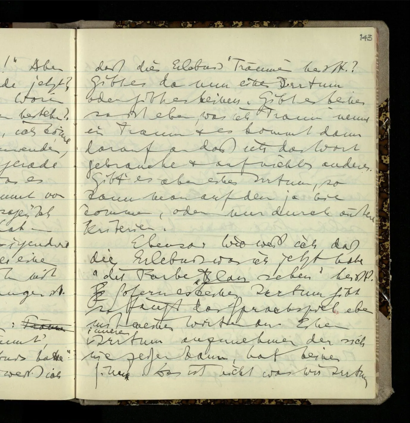 Man kann nicht sagen: “Ich sage: ‘ich habe geträumt’, weil ich ein gewisses Erlebnis hatte”. Denn die Frage ist, wie weiß ich daß dies Erlebnis “Träumen” heißt? Gibt es da nun einen Irrtum oder gibt es keinen. Gibt es keinen so ist eben, was ich “Traum” nenne ein Traum & es kommt dann darauf an daß ich das Wort gebrauche & auf nichts anderes. Gibt es aber einen Irrtum, so kann man auf den ja nie kommen, oder nur durch äußere Kriterien. Ebenso: Wie weiß ich daß das Erlebnis was ich jetzt habe “die Farbe Blau sehen” heißt? Sofern es keinen Irrtum gibt so fängt das Sprachspiel eben mit meinen Worten an. Einen inneren Irrtum anzunehmen der sich nie zeigen kann, hat keinen Sinn. Das ist nicht was wir Irrtum nennen. Daß mich mein Gedächtnis täuscht & ich die falsche Farbe “blau” nenne, kann sich nur in der äußeren Verwendung zeigen.