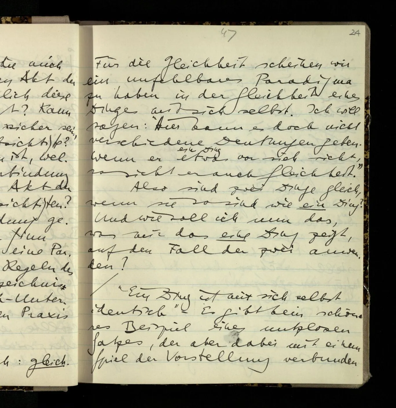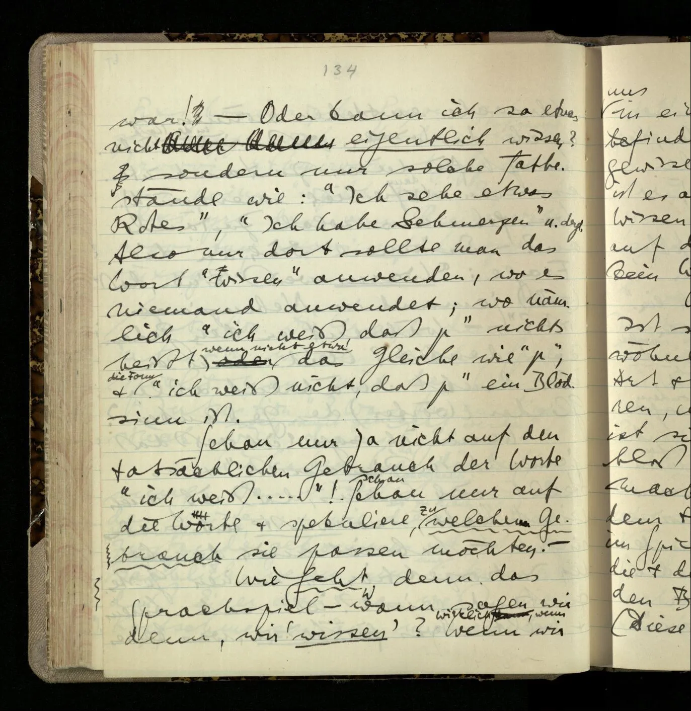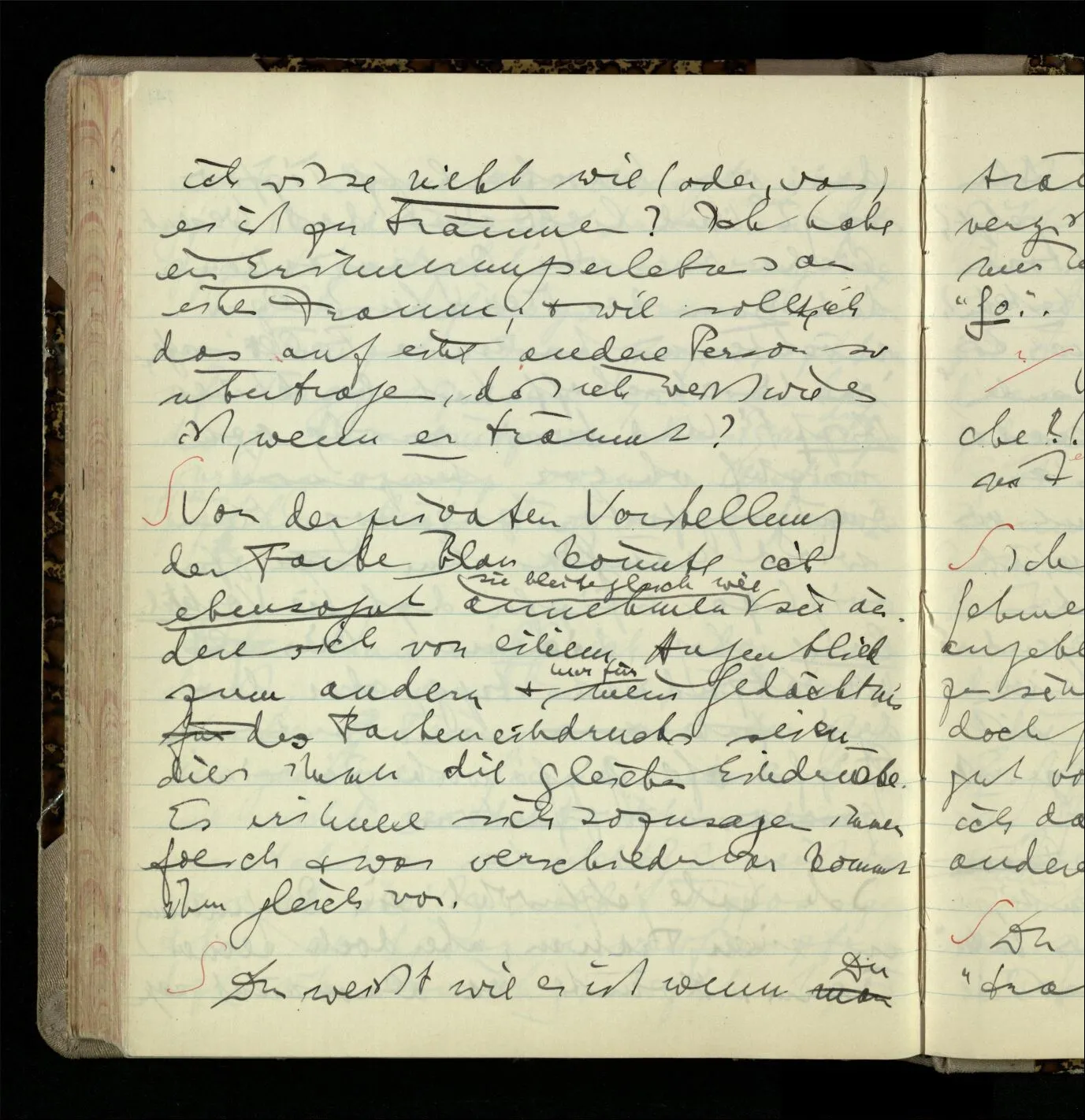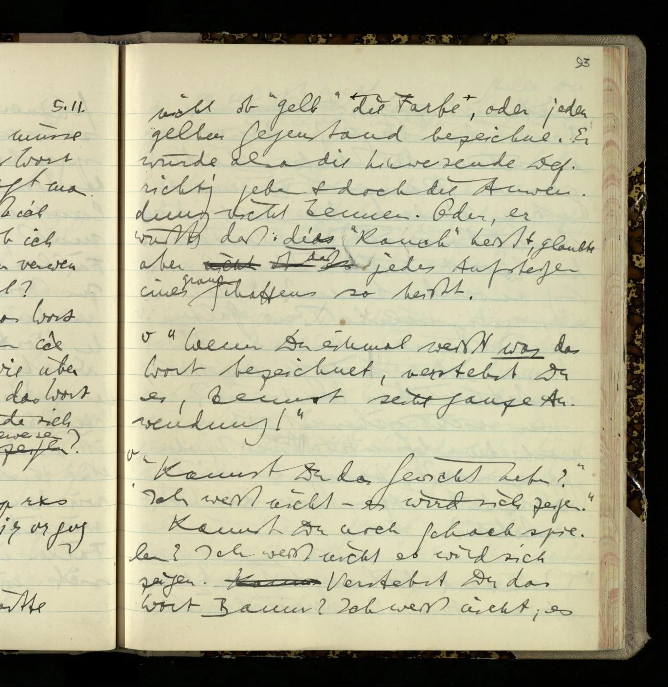 Man kann nicht sagen: “Ich sage: ‘ich habe geträumt’, weil ich ein gewisses Erlebnis hatte”. Denn die Frage ist, wie weiß ich daß dies Erlebnis “Träumen” heißt? Gibt es da nun einen Irrtum oder gibt es keinen. Gibt es keinen so ist eben, was ich “Traum” nenne ein Traum & es kommt dann darauf an daß ich das Wort gebrauche & auf nichts anderes. Gibt es aber einen Irrtum, so kann man auf den ja nie kommen, oder nur durch äußere Kriterien. Ebenso: Wie weiß ich daß das Erlebnis was ich jetzt habe “die Farbe Blau sehen” heißt? Sofern es keinen Irrtum gibt so fängt das Sprachspiel eben mit meinen Worten an. Einen inneren Irrtum anzunehmen der sich nie zeigen kann, hat keinen Sinn. Das ist nicht was wir Irrtum nennen. Daß mich mein Gedächtnis täuscht & ich die falsche Farbe “blau” nenne, kann sich nur in der äußeren Verwendung zeigen.