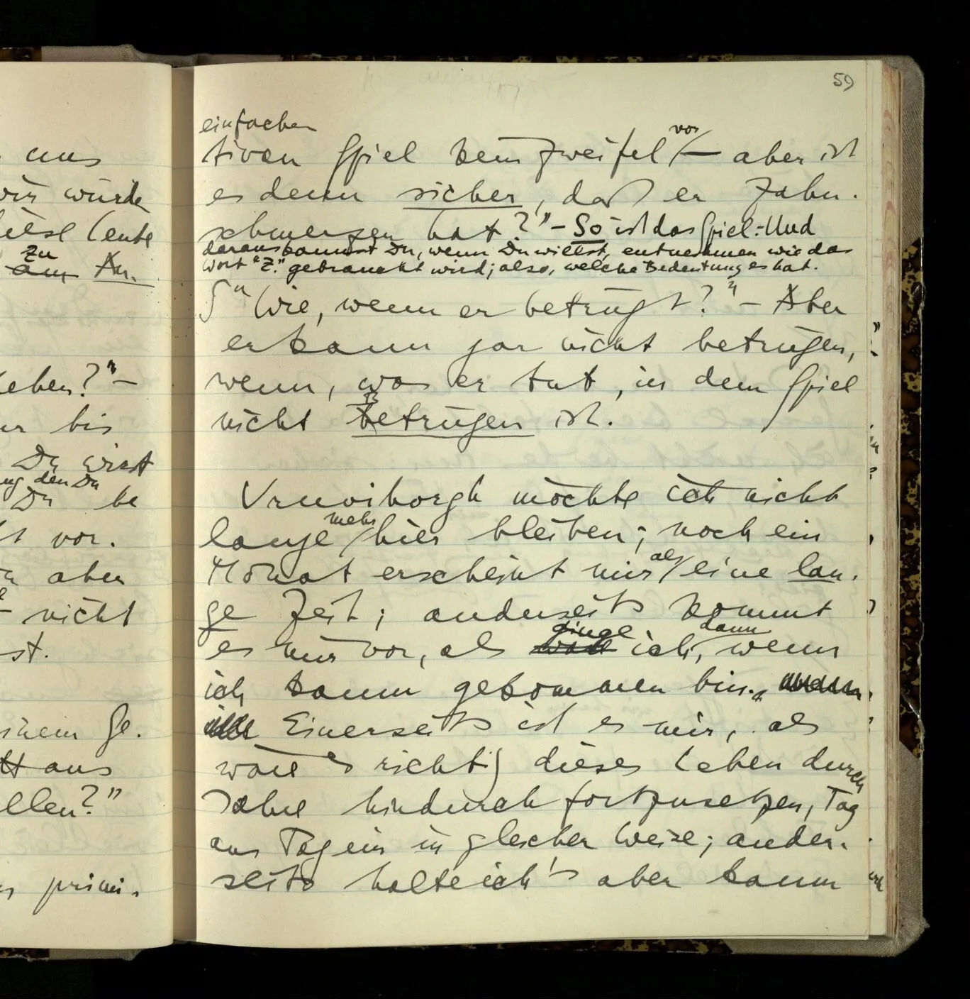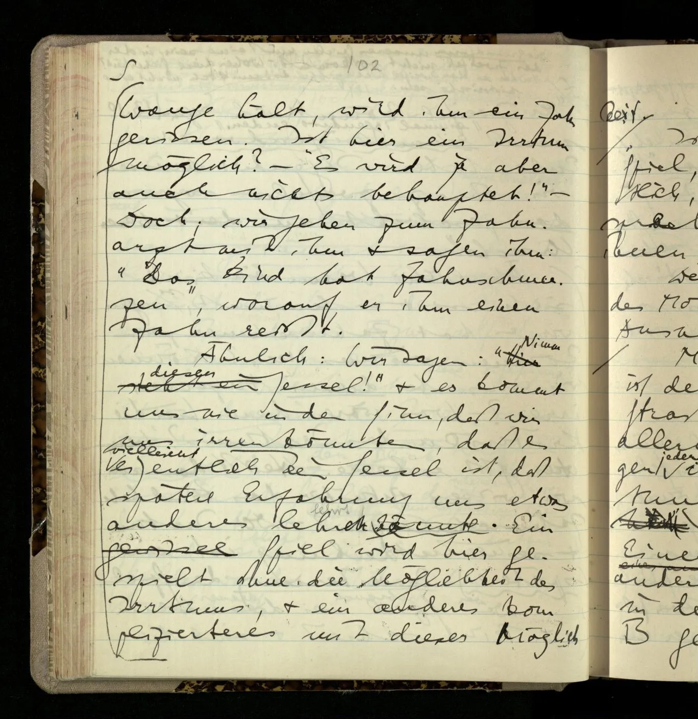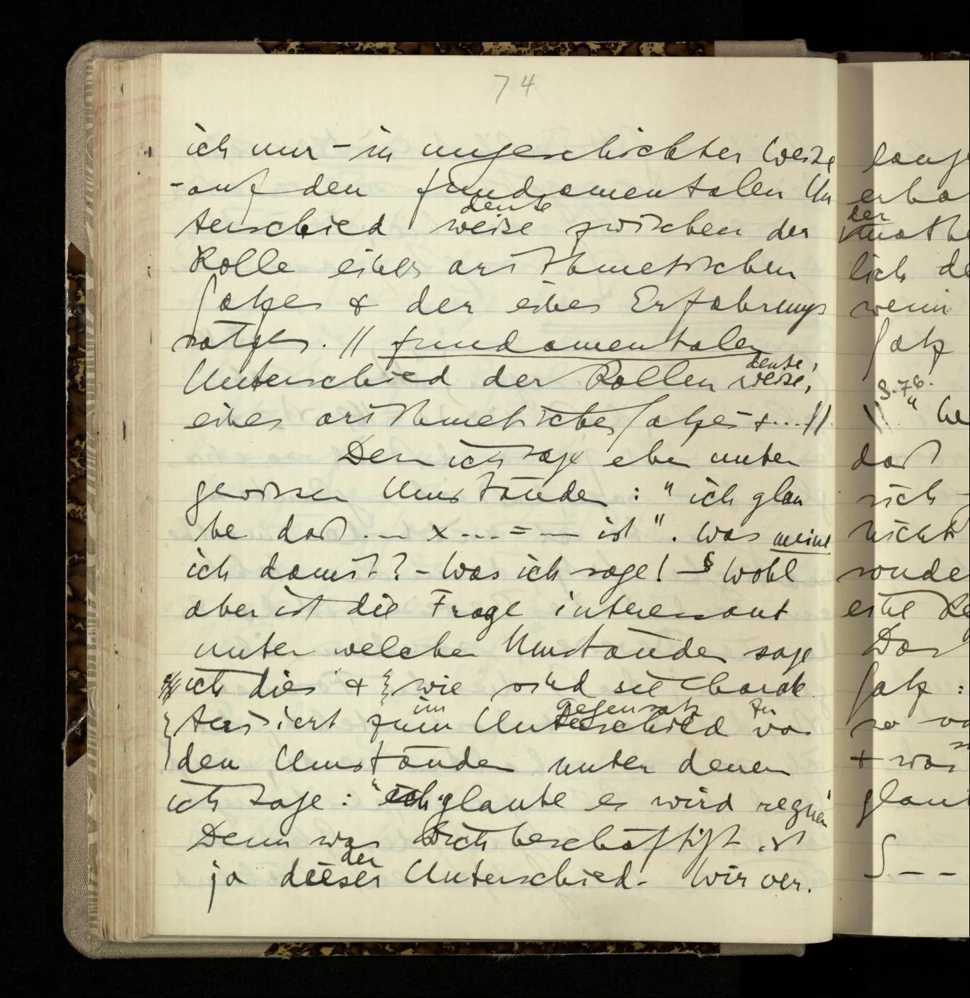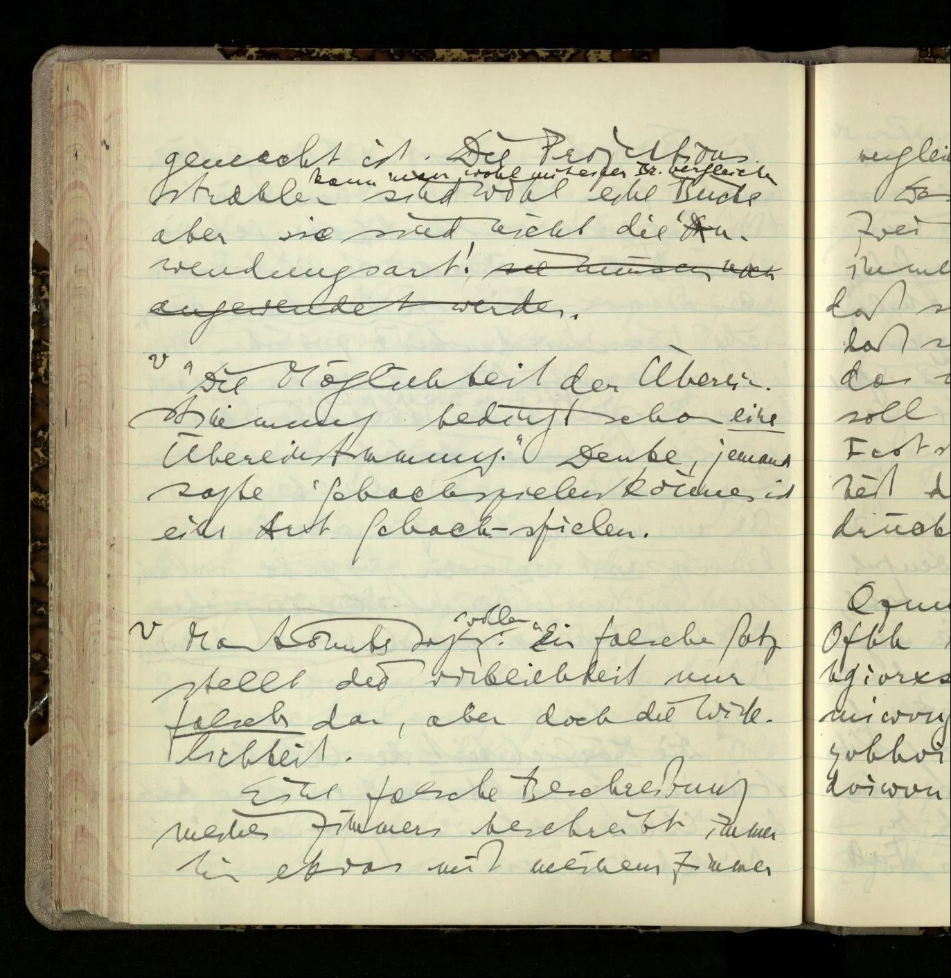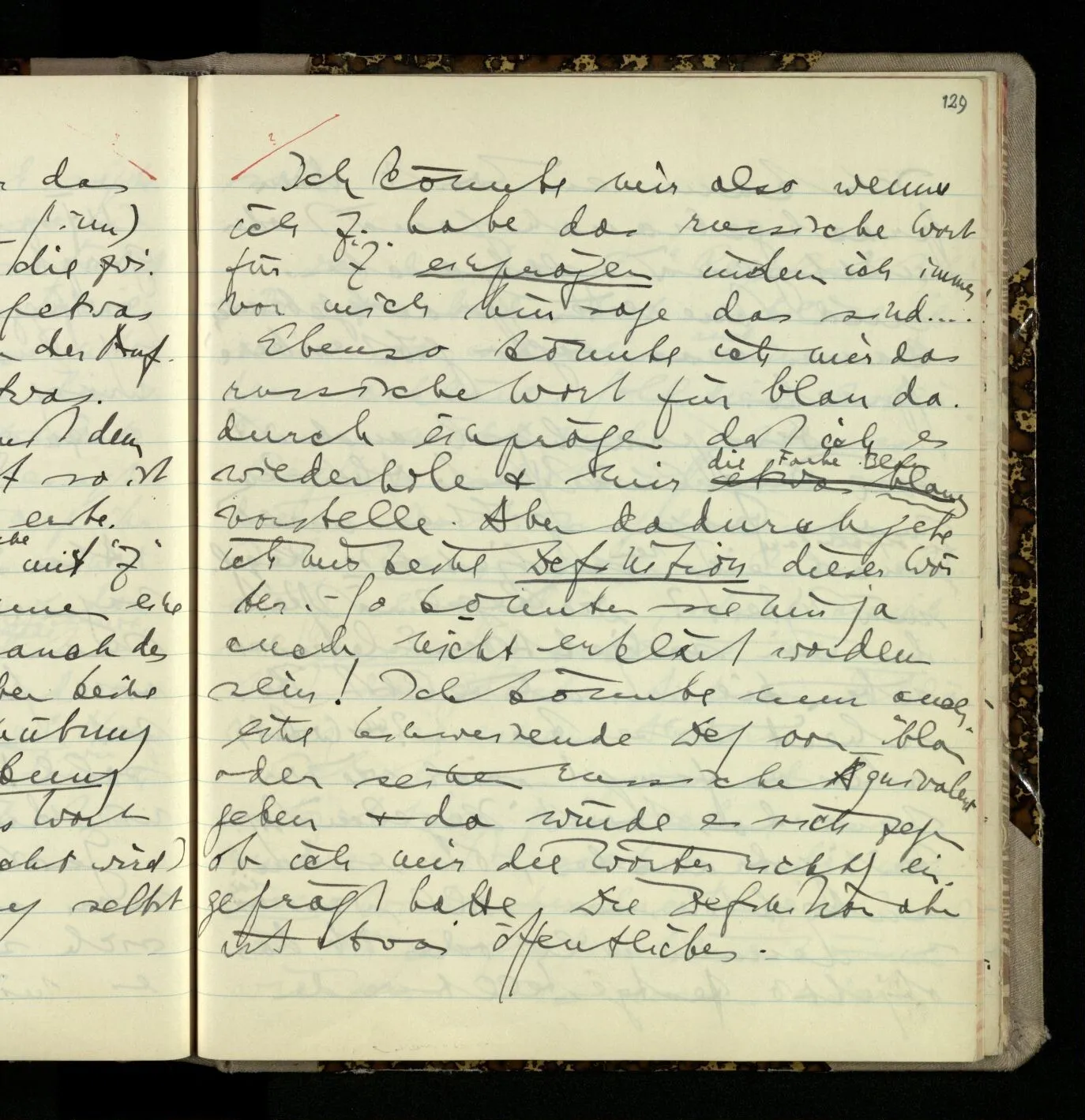 Man kann nicht sagen: “Ich sage: ‘ich habe geträumt’, weil ich ein gewisses Erlebnis hatte”. Denn die Frage ist, wie weiß ich daß dies Erlebnis “Träumen” heißt? Gibt es da nun einen Irrtum oder gibt es keinen. Gibt es keinen so ist eben, was ich “Traum” nenne ein Traum & es kommt dann darauf an daß ich das Wort gebrauche & auf nichts anderes. Gibt es aber einen Irrtum, so kann man auf den ja nie kommen, oder nur durch äußere Kriterien. Ebenso: Wie weiß ich daß das Erlebnis was ich jetzt habe “die Farbe Blau sehen” heißt? Sofern es keinen Irrtum gibt so fängt das Sprachspiel eben mit meinen Worten an. Einen inneren Irrtum anzunehmen der sich nie zeigen kann, hat keinen Sinn. Das ist nicht was wir Irrtum nennen. Daß mich mein Gedächtnis täuscht & ich die falsche Farbe “blau” nenne, kann sich nur in der äußeren Verwendung zeigen.