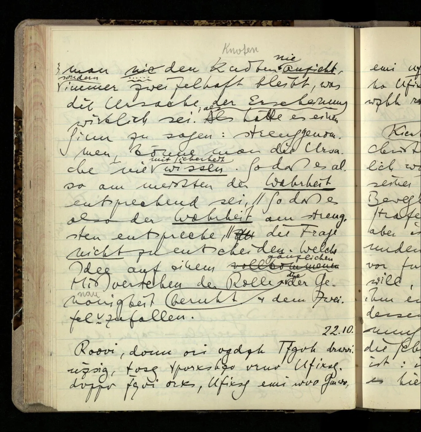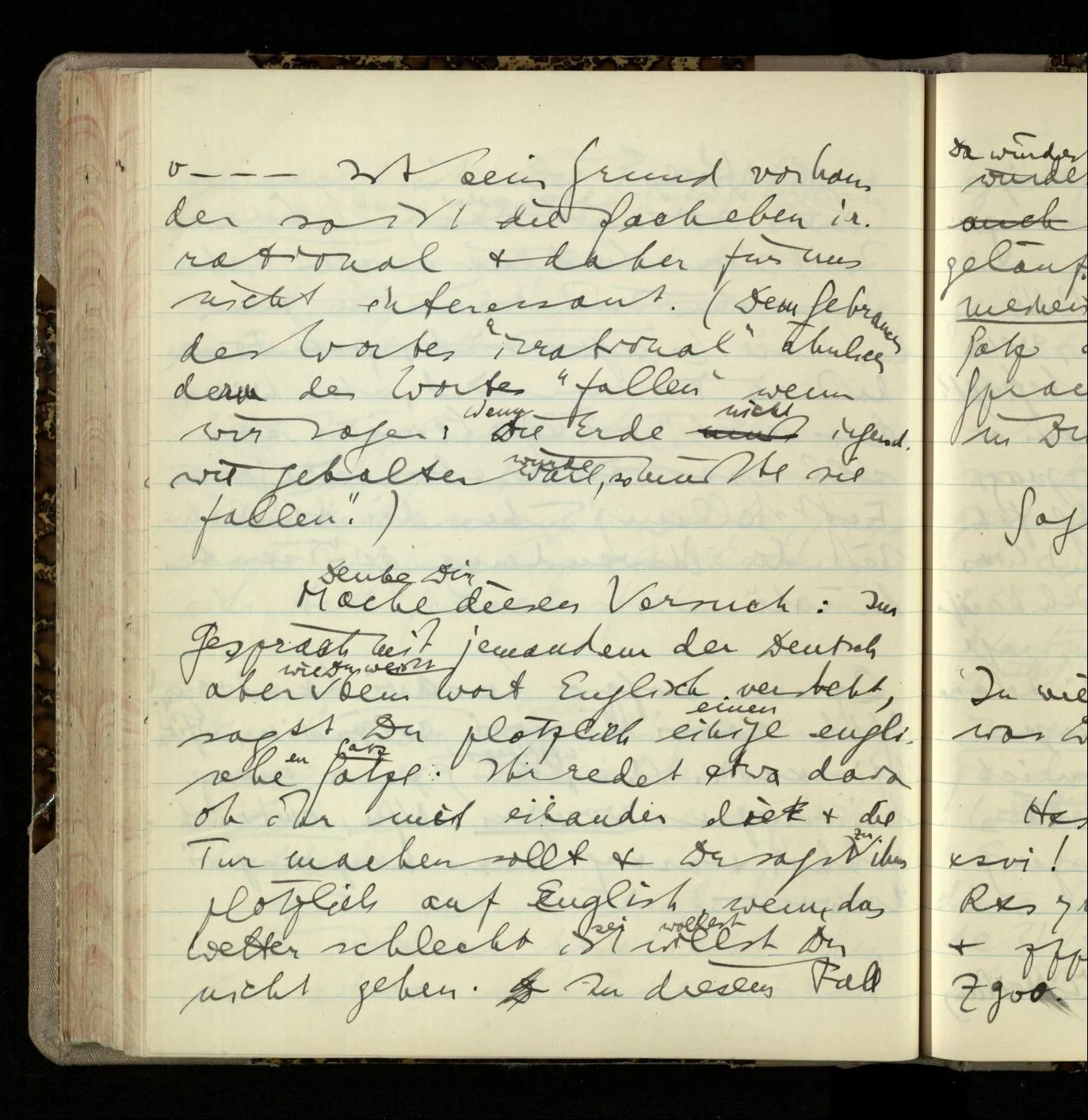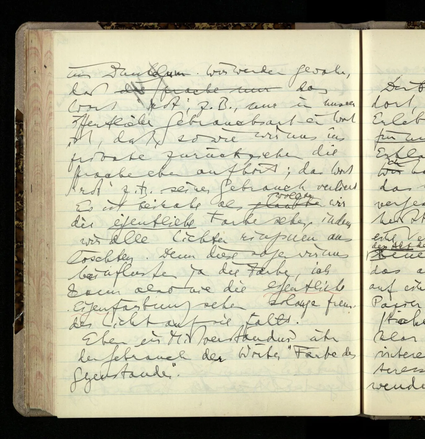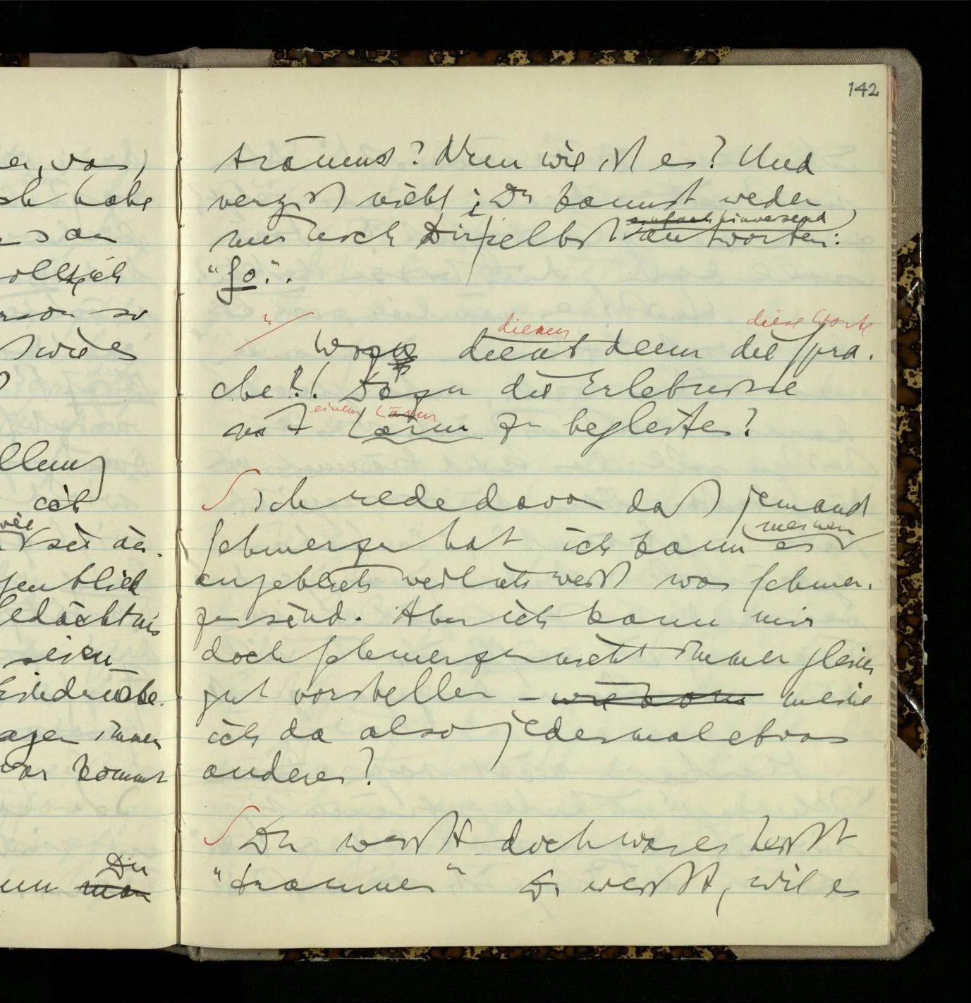 Man kann nicht sagen: “Ich sage: ‘ich habe geträumt’, weil ich ein gewisses Erlebnis hatte”. Denn die Frage ist, wie weiß ich daß dies Erlebnis “Träumen” heißt? Gibt es da nun einen Irrtum oder gibt es keinen. Gibt es keinen so ist eben, was ich “Traum” nenne ein Traum & es kommt dann darauf an daß ich das Wort gebrauche & auf nichts anderes. Gibt es aber einen Irrtum, so kann man auf den ja nie kommen, oder nur durch äußere Kriterien. Ebenso: Wie weiß ich daß das Erlebnis was ich jetzt habe “die Farbe Blau sehen” heißt? Sofern es keinen Irrtum gibt so fängt das Sprachspiel eben mit meinen Worten an. Einen inneren Irrtum anzunehmen der sich nie zeigen kann, hat keinen Sinn. Das ist nicht was wir Irrtum nennen. Daß mich mein Gedächtnis täuscht & ich die falsche Farbe “blau” nenne, kann sich nur in der äußeren Verwendung zeigen.