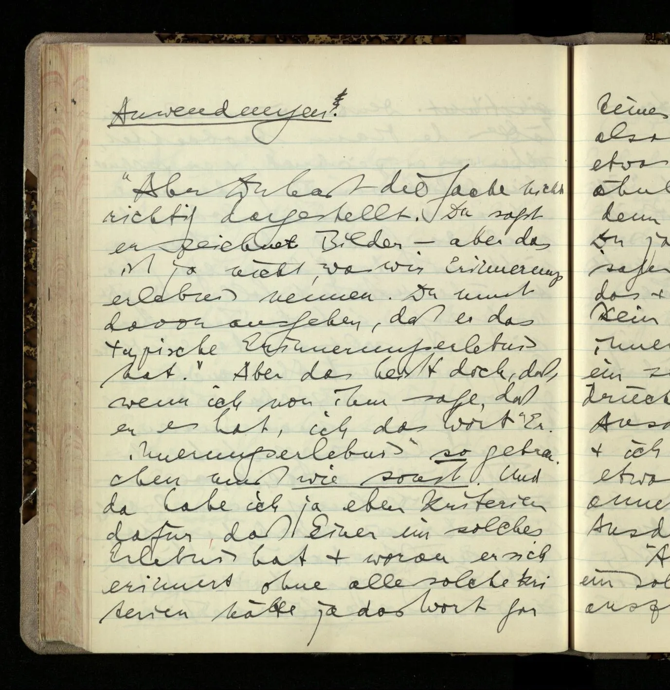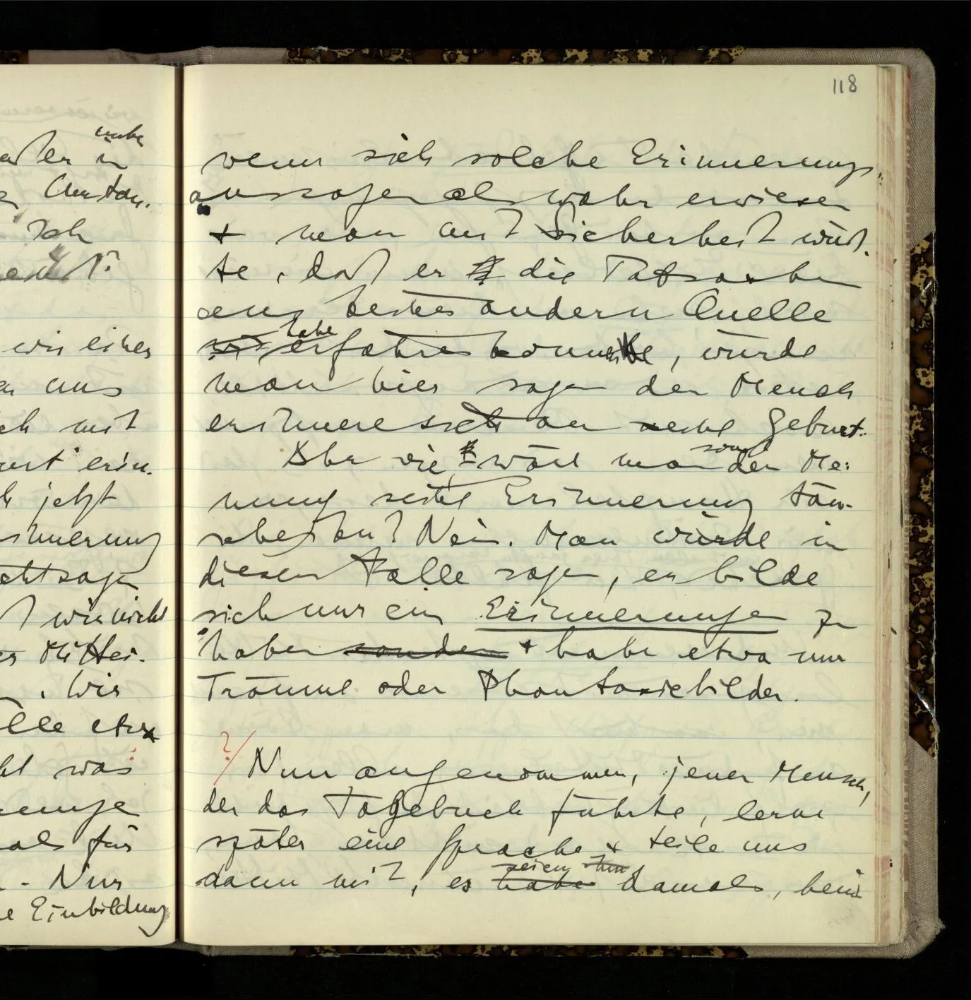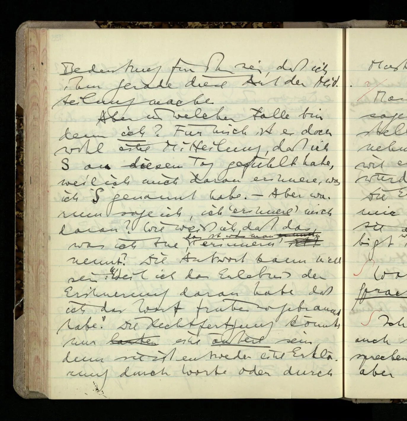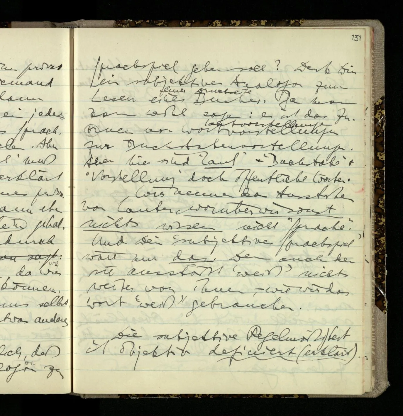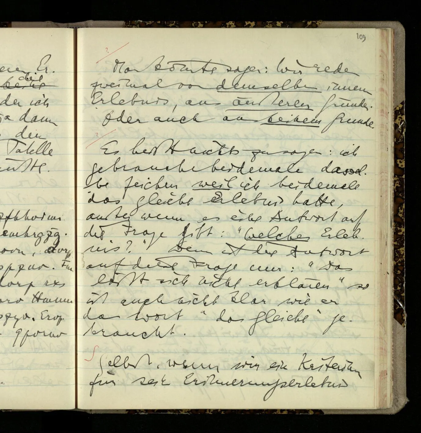 Ich könnte ja sagen: Wenn jener Mann der das Tagebuch führt beim Lesen desselben Erinnerungen hat, dann teilt ihm das Tagebuch etwas mit. – – Aber nun fragt es sich noch: Wann sagen wir, daß er ‘Erinnerungen hat’. Wenn darauf zur Antwort kommt: “Wenn er ein gewisses inneres Erlebnis hat”, so