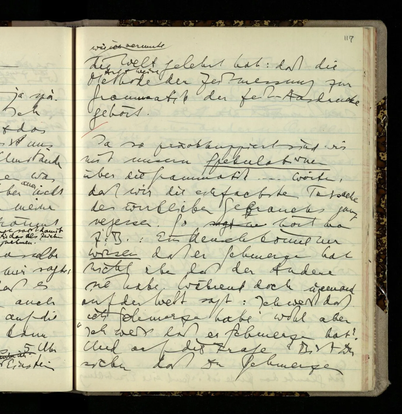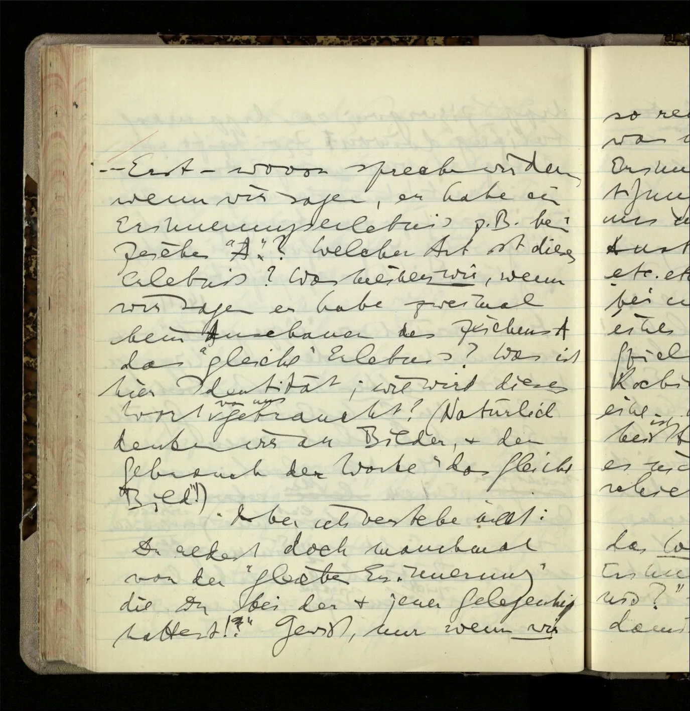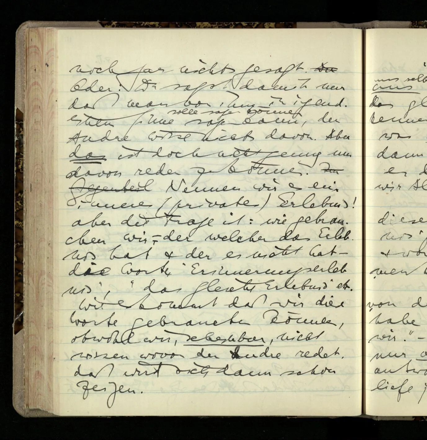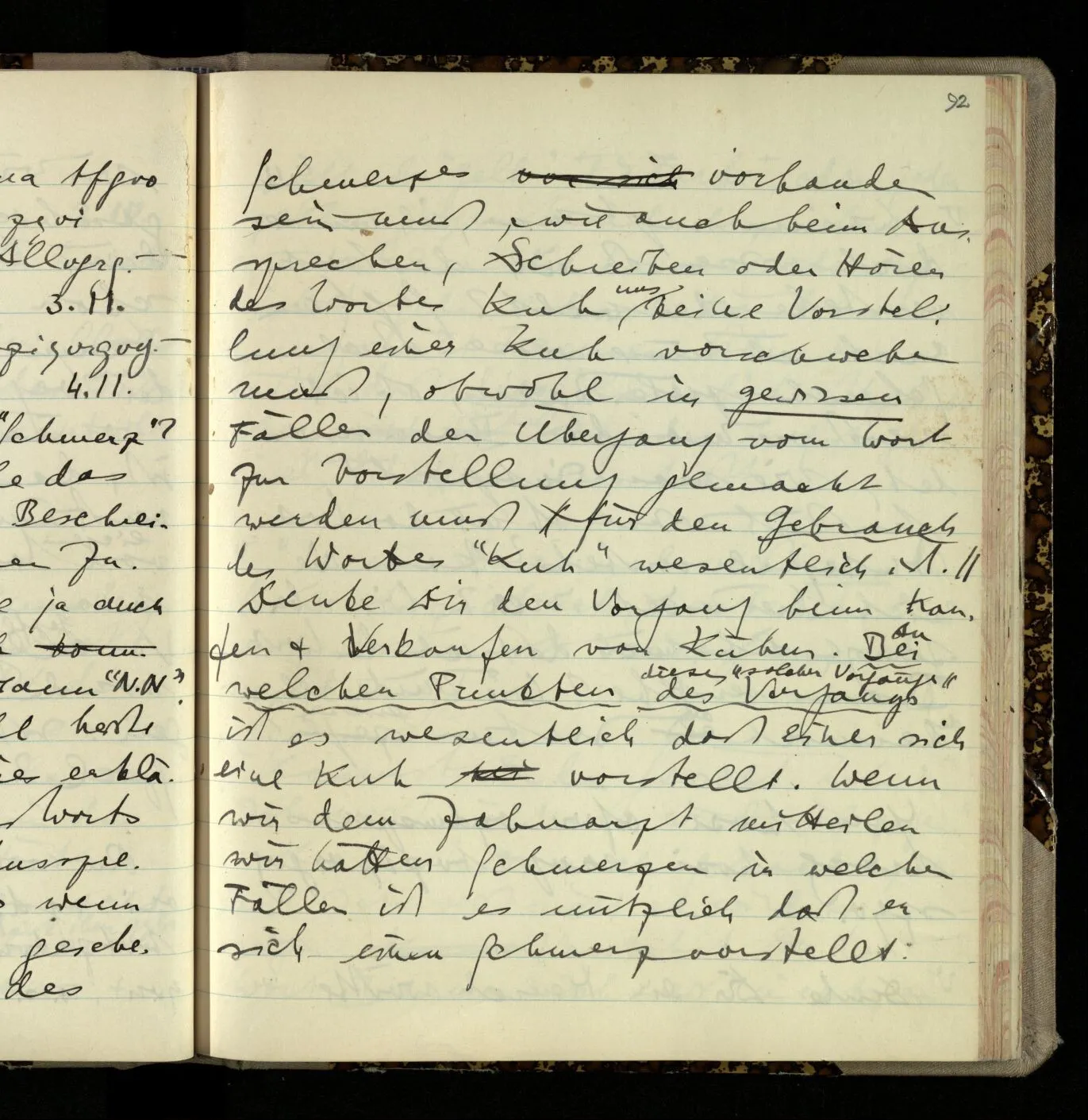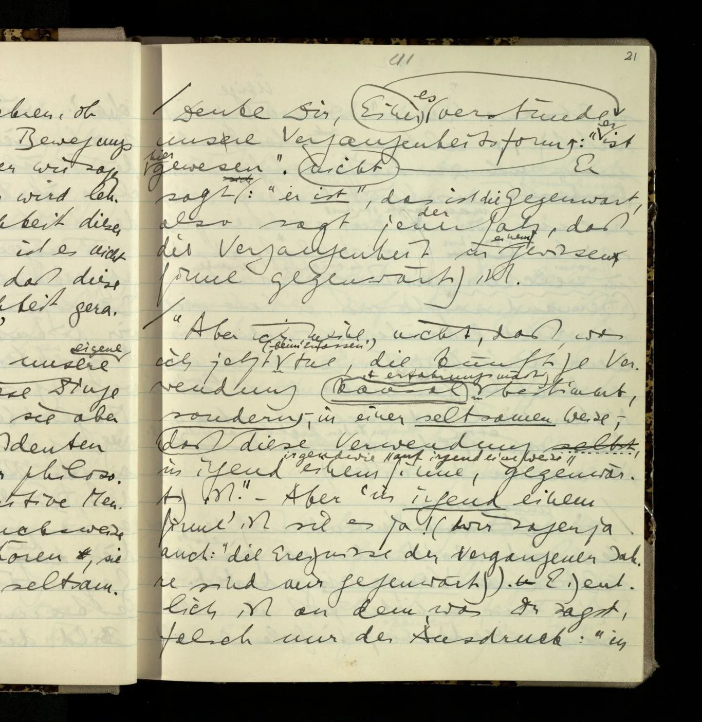 Ich könnte ja sagen: Wenn jener Mann der das Tagebuch führt beim Lesen desselben Erinnerungen hat, dann teilt ihm das Tagebuch etwas mit. – – Aber nun fragt es sich noch: Wann sagen wir, daß er ‘Erinnerungen hat’. Wenn darauf zur Antwort kommt: “Wenn er ein gewisses inneres Erlebnis hat”, so
