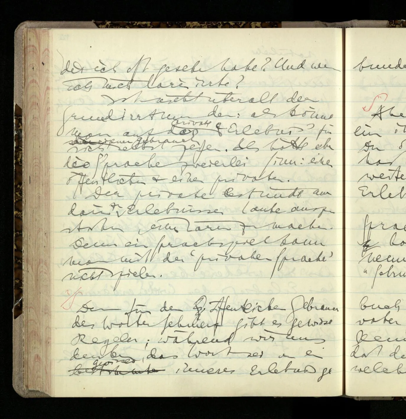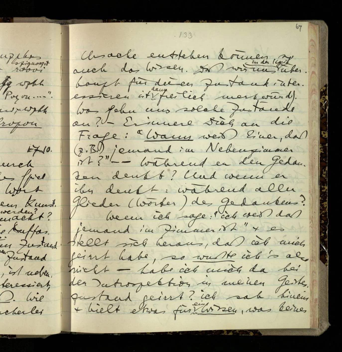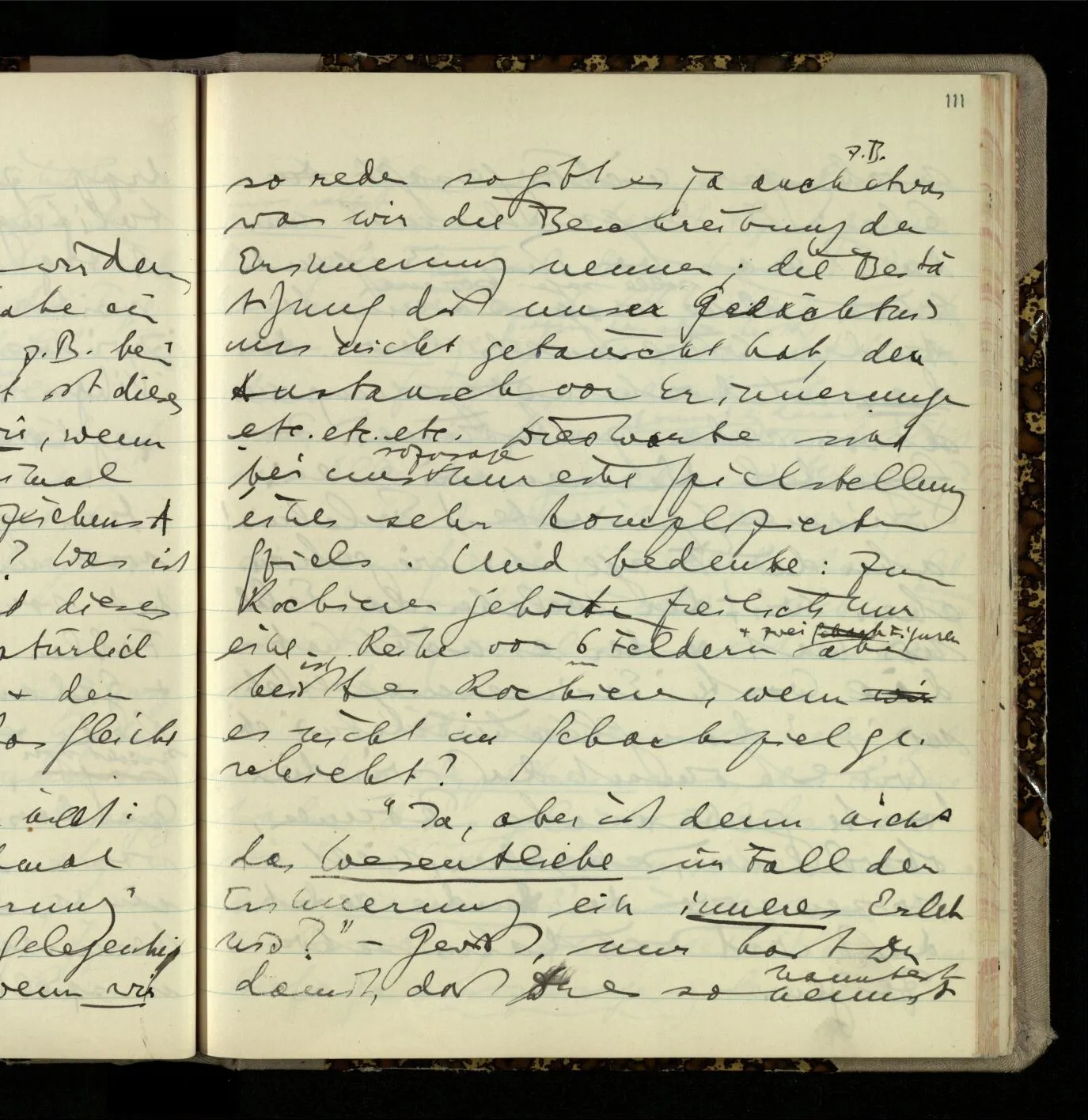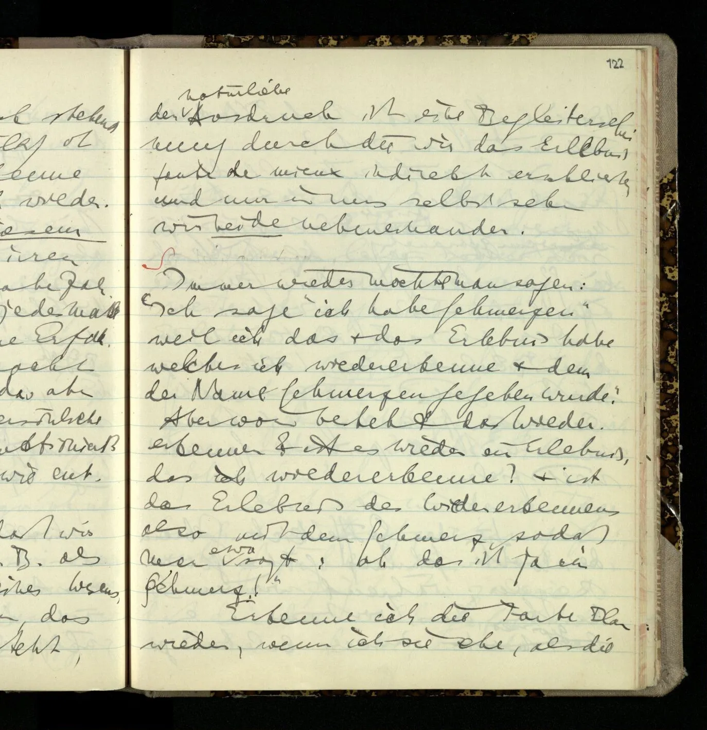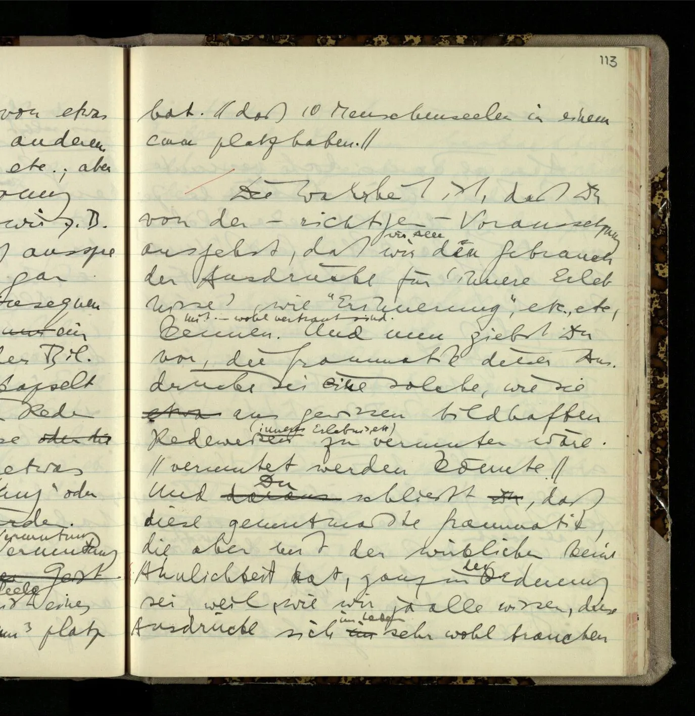 Ich könnte ja sagen: Wenn jener Mann der das Tagebuch führt beim Lesen desselben Erinnerungen hat, dann teilt ihm das Tagebuch etwas mit. – – Aber nun fragt es sich noch: Wann sagen wir, daß er ‘Erinnerungen hat’. Wenn darauf zur Antwort kommt: “Wenn er ein gewisses inneres Erlebnis hat”, so