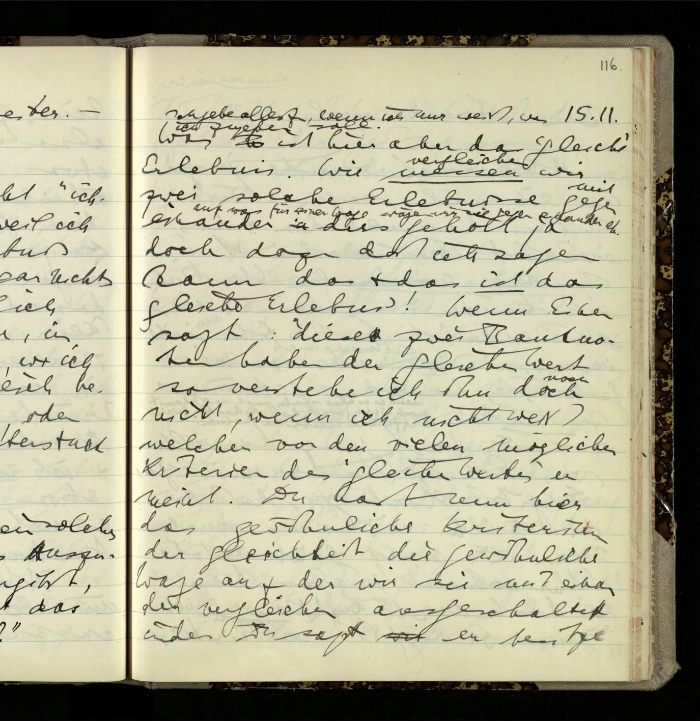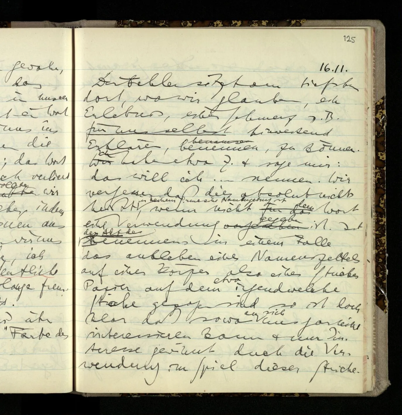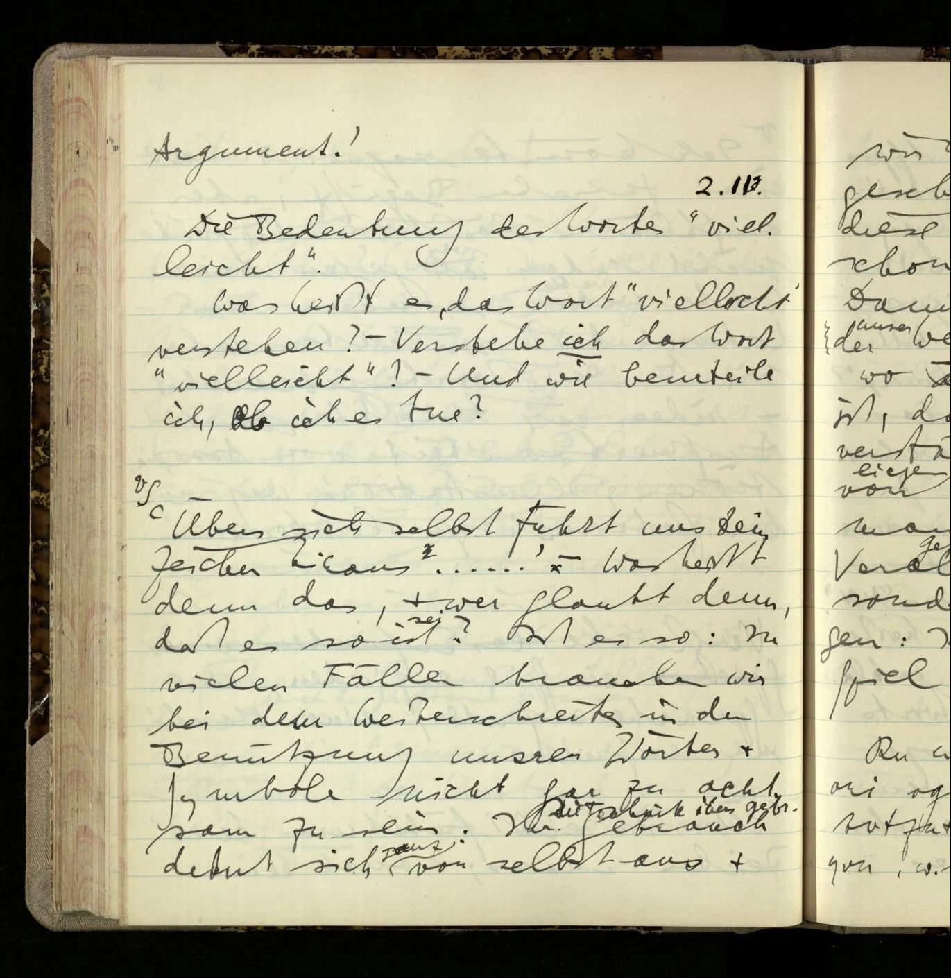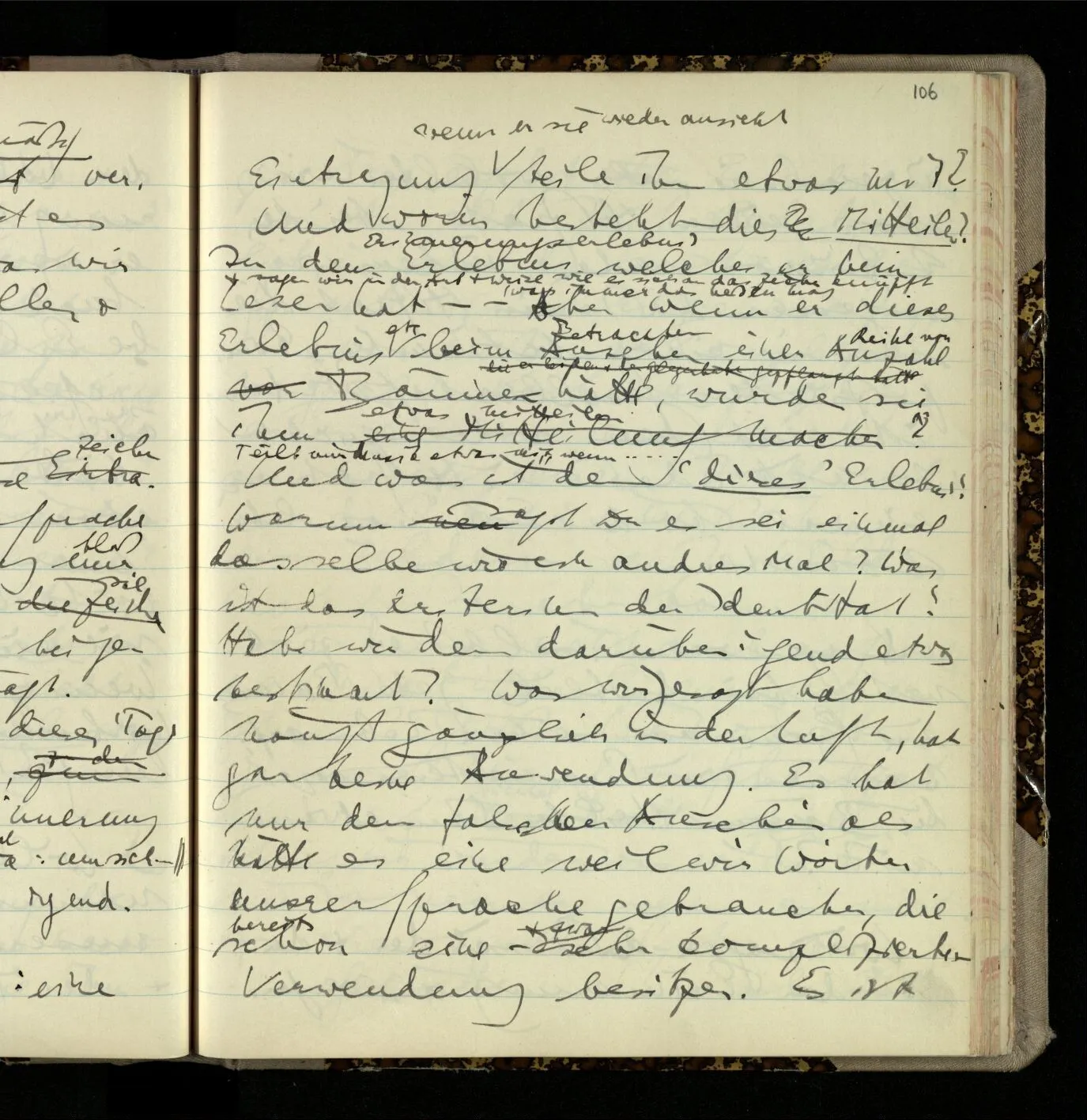 Ich könnte ja sagen: Wenn jener Mann der das Tagebuch führt beim Lesen desselben Erinnerungen hat, dann teilt ihm das Tagebuch etwas mit. – – Aber nun fragt es sich noch: Wann sagen wir, daß er ‘Erinnerungen hat’. Wenn darauf zur Antwort kommt: “Wenn er ein gewisses inneres Erlebnis hat”, so