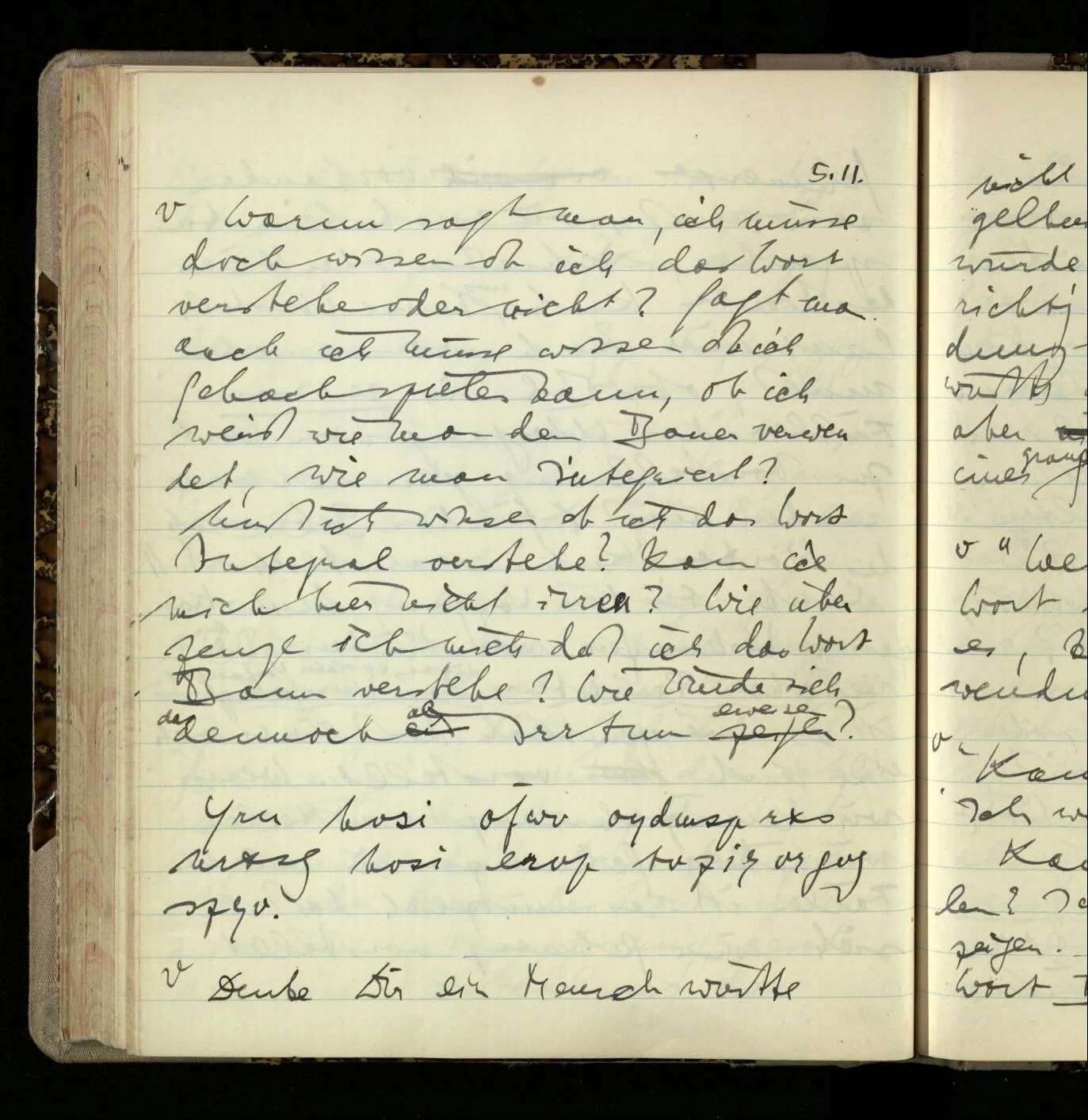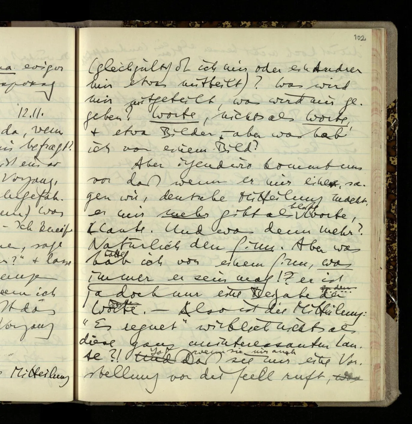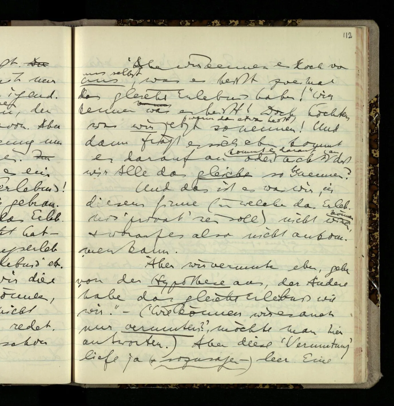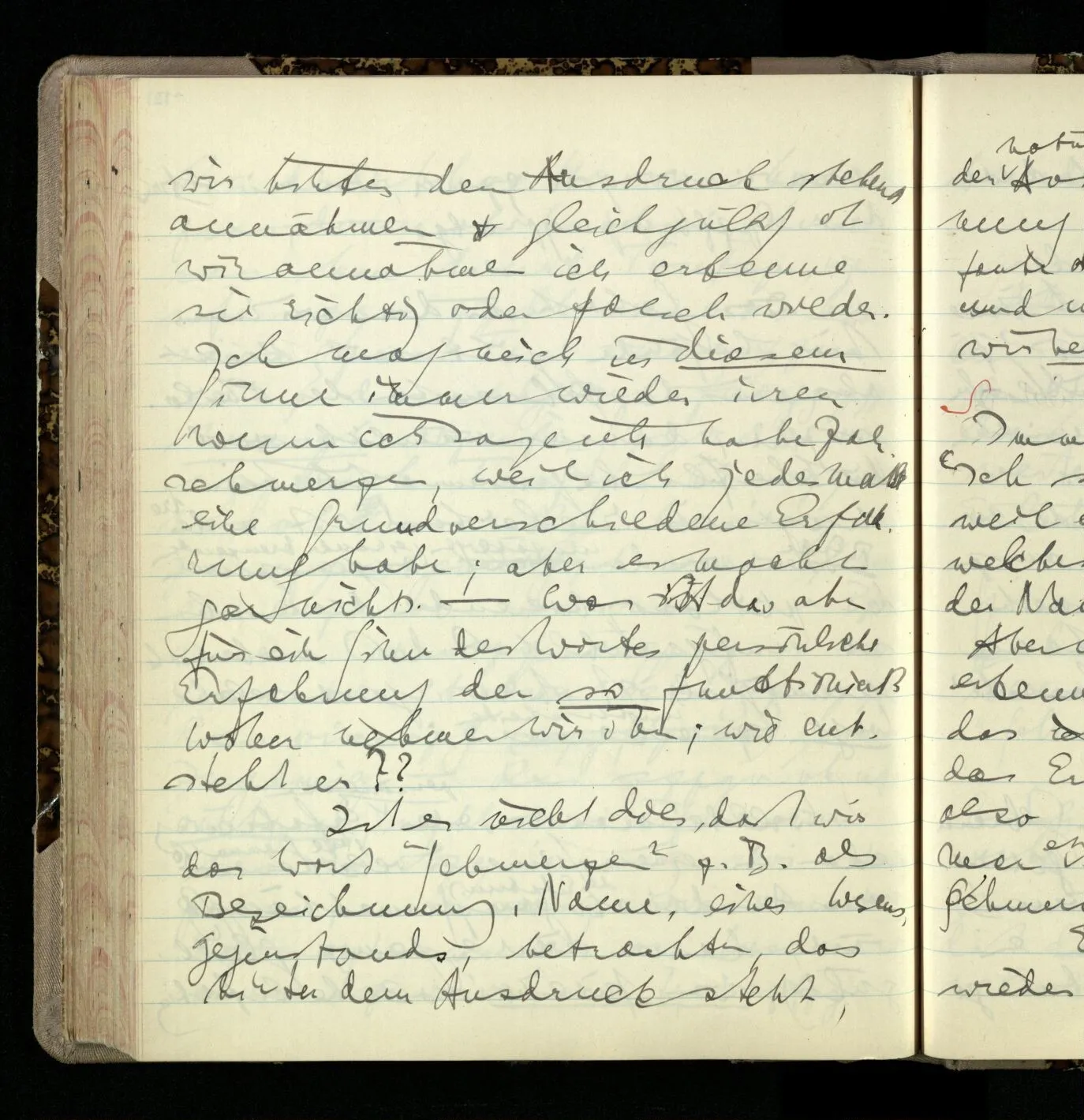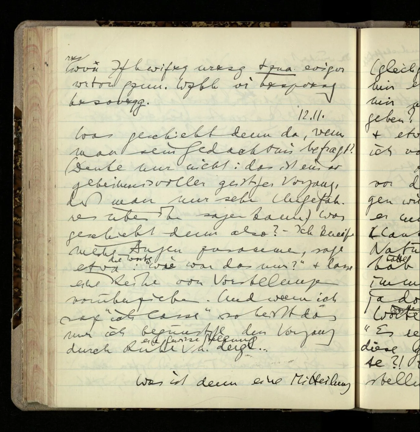 Ich könnte ja sagen: Wenn jener Mann der das Tagebuch führt beim Lesen desselben Erinnerungen hat, dann teilt ihm das Tagebuch etwas mit. – – Aber nun fragt es sich noch: Wann sagen wir, daß er ‘Erinnerungen hat’. Wenn darauf zur Antwort kommt: “Wenn er ein gewisses inneres Erlebnis hat”, so