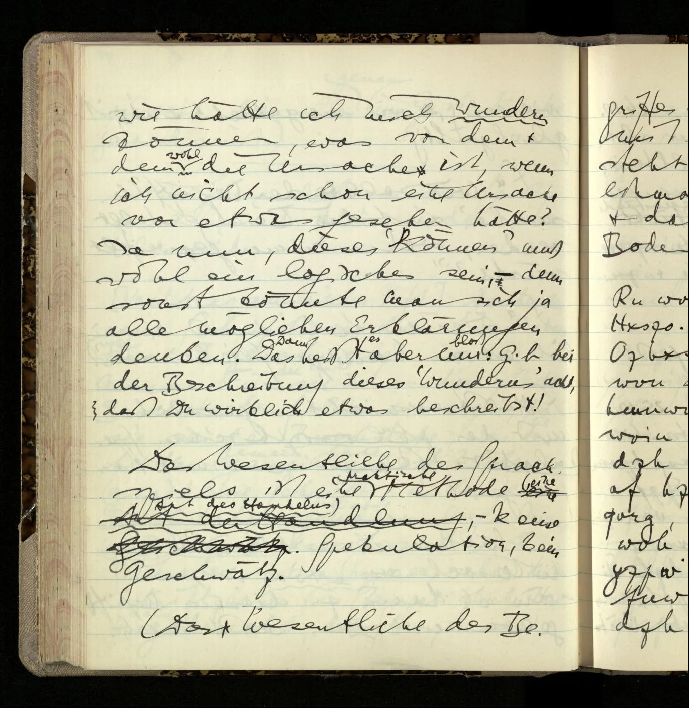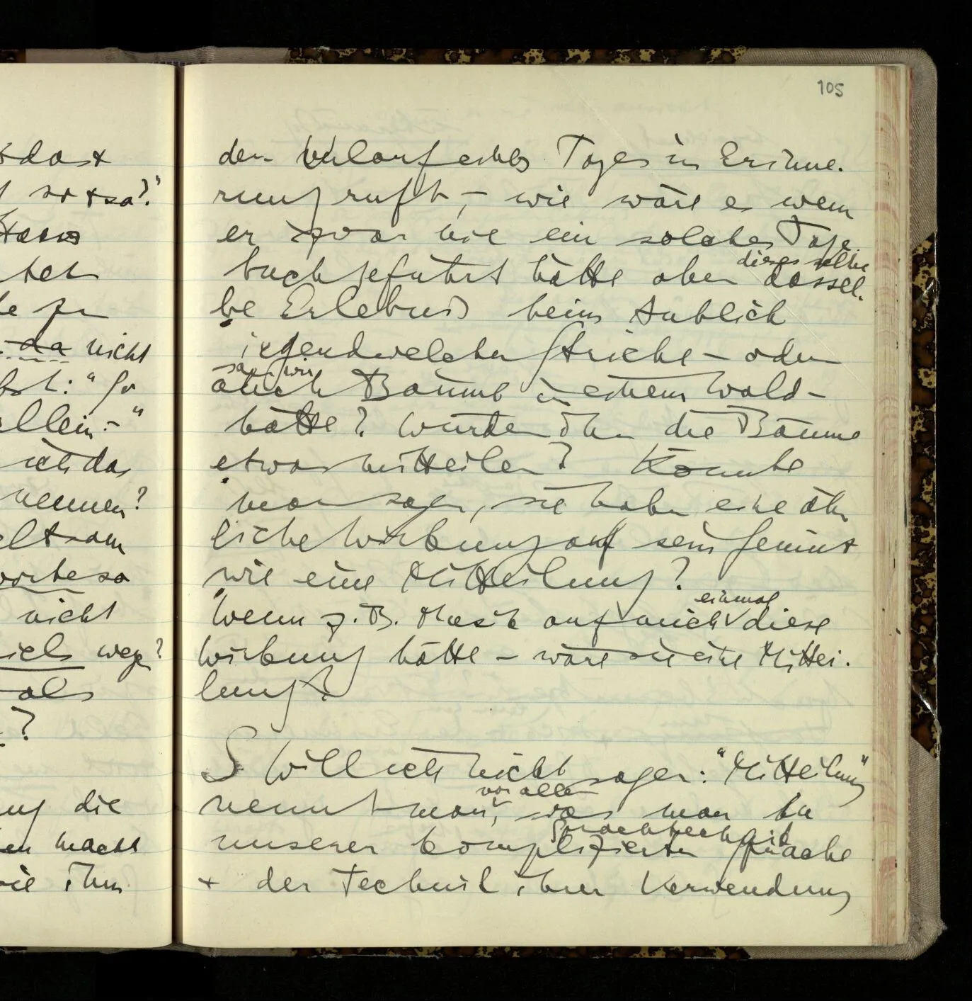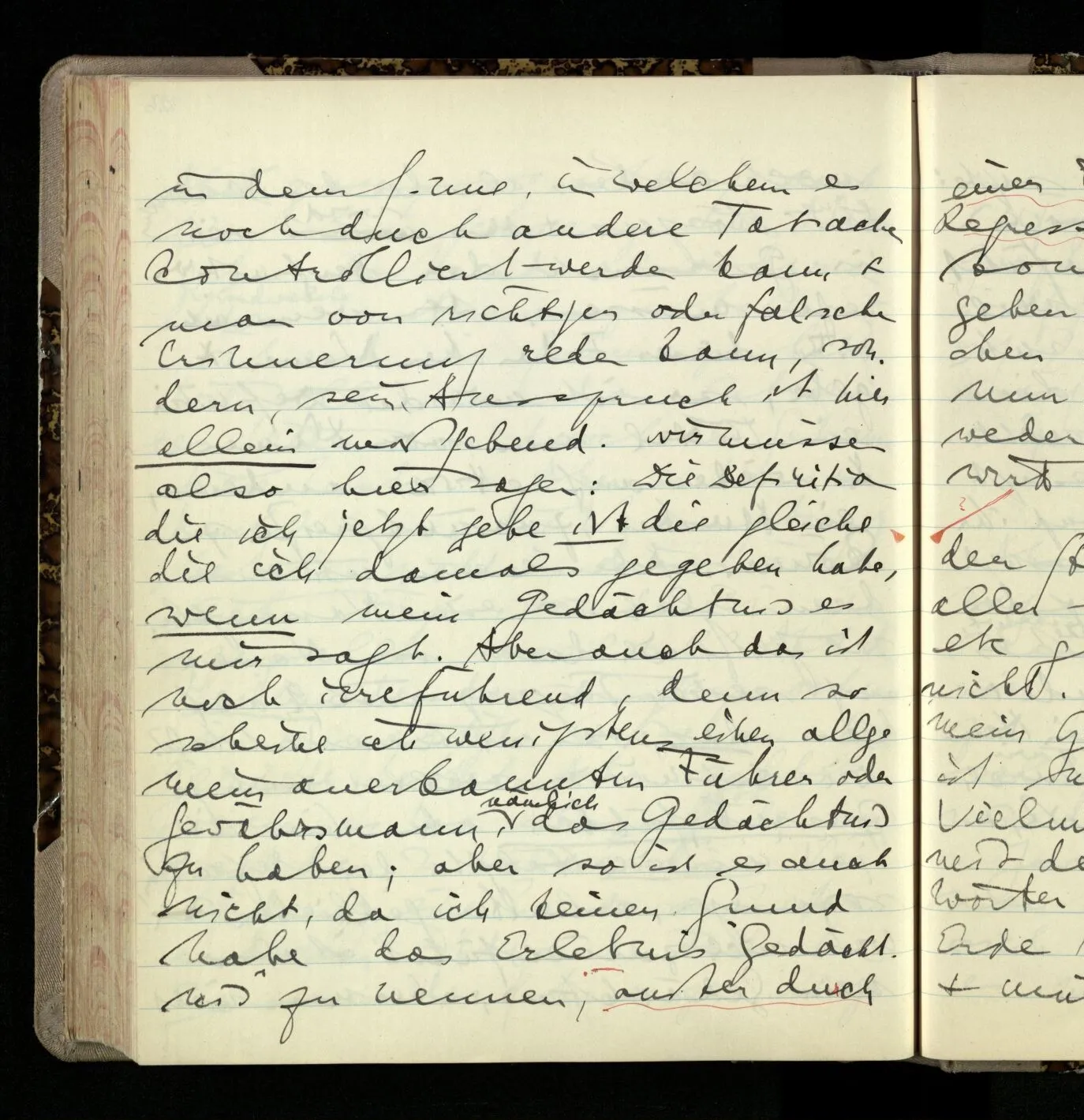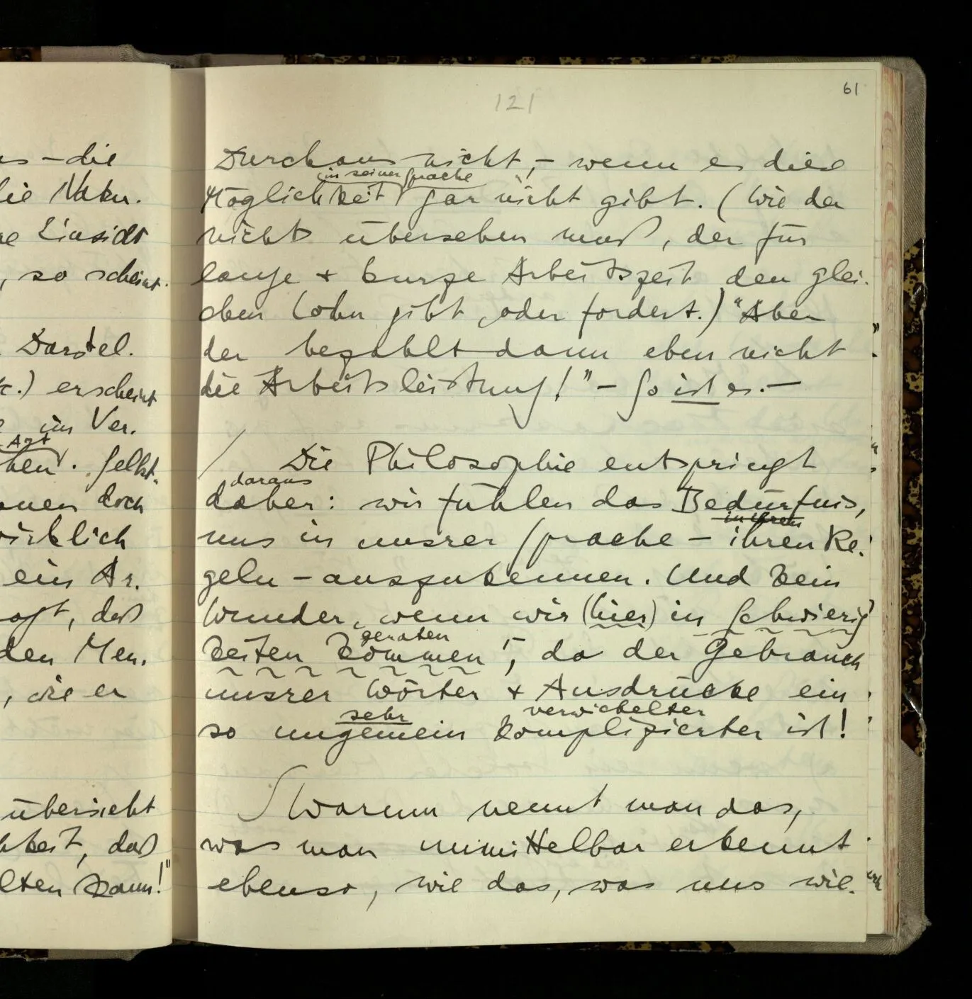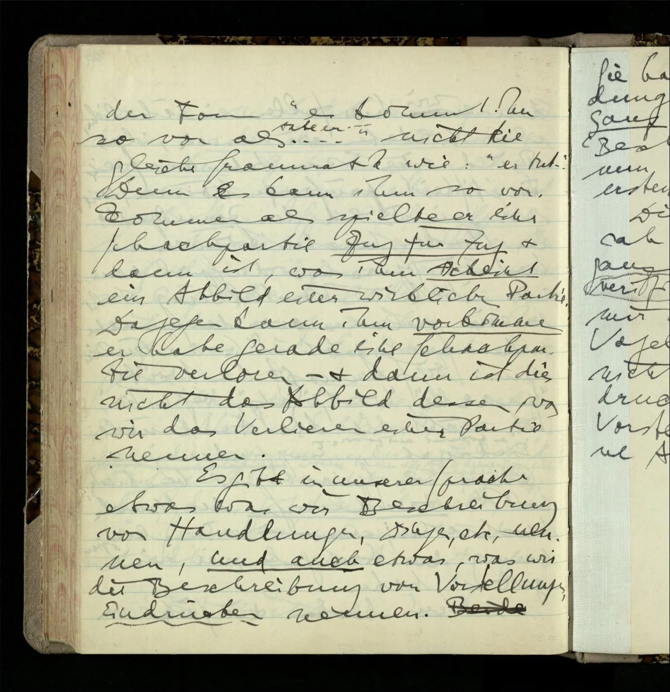 Ich könnte ja sagen: Wenn jener Mann der das Tagebuch führt beim Lesen desselben Erinnerungen hat, dann teilt ihm das Tagebuch etwas mit. – – Aber nun fragt es sich noch: Wann sagen wir, daß er ‘Erinnerungen hat’. Wenn darauf zur Antwort kommt: “Wenn er ein gewisses inneres Erlebnis hat”, so