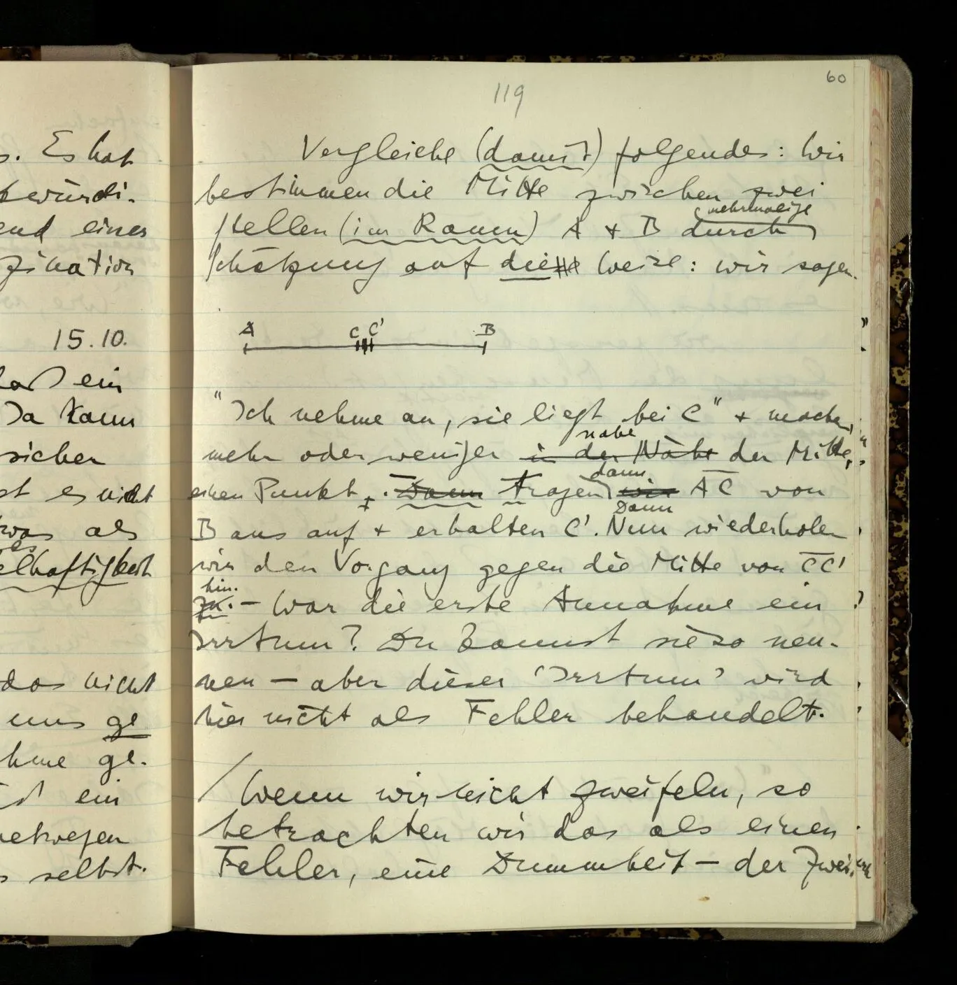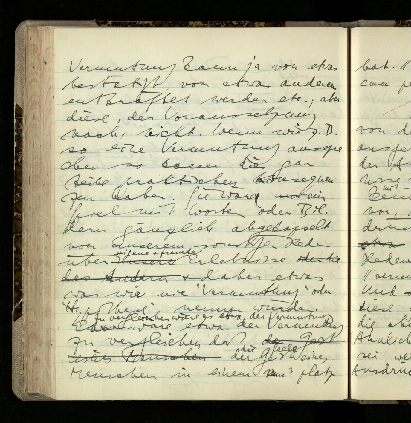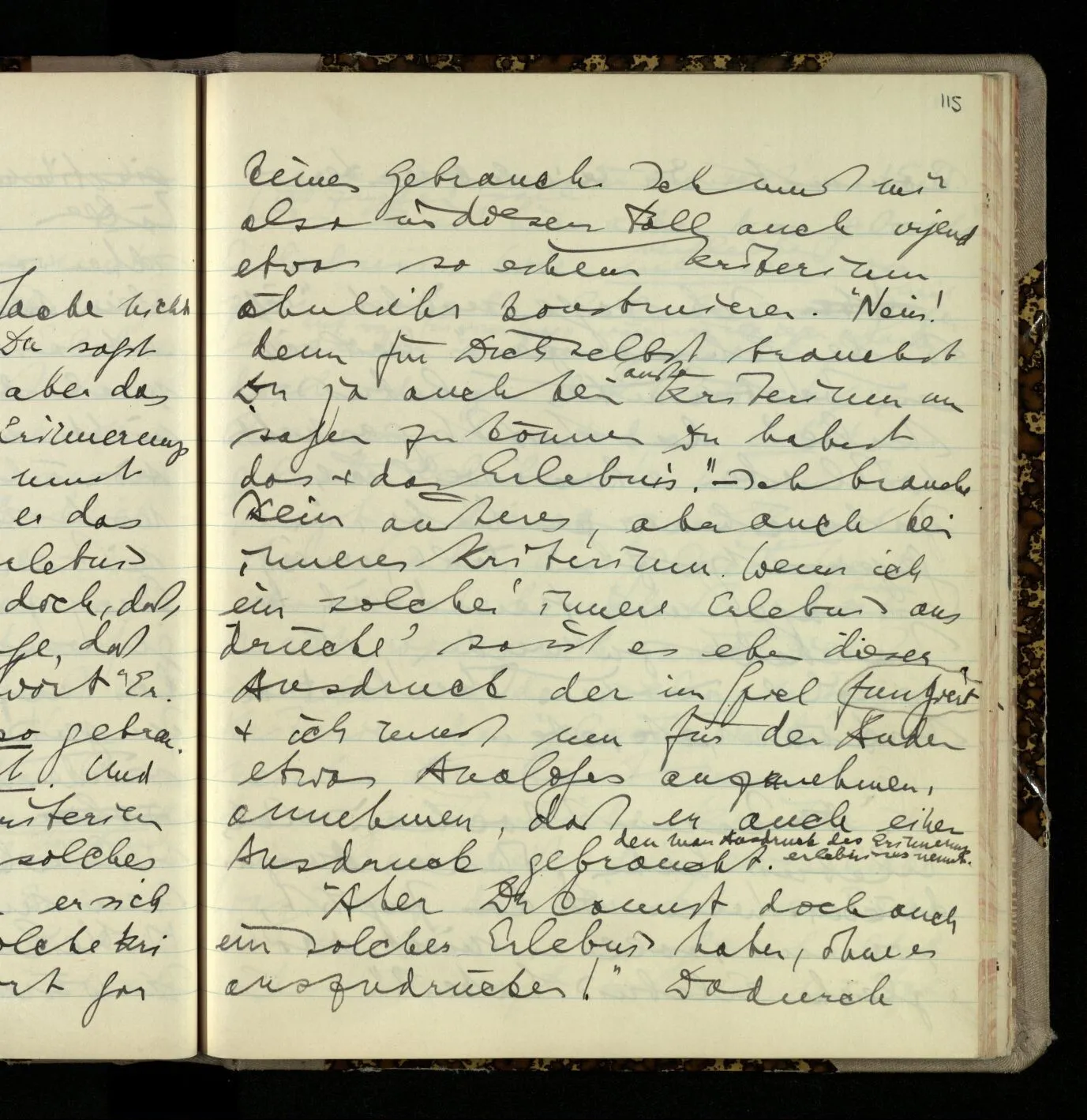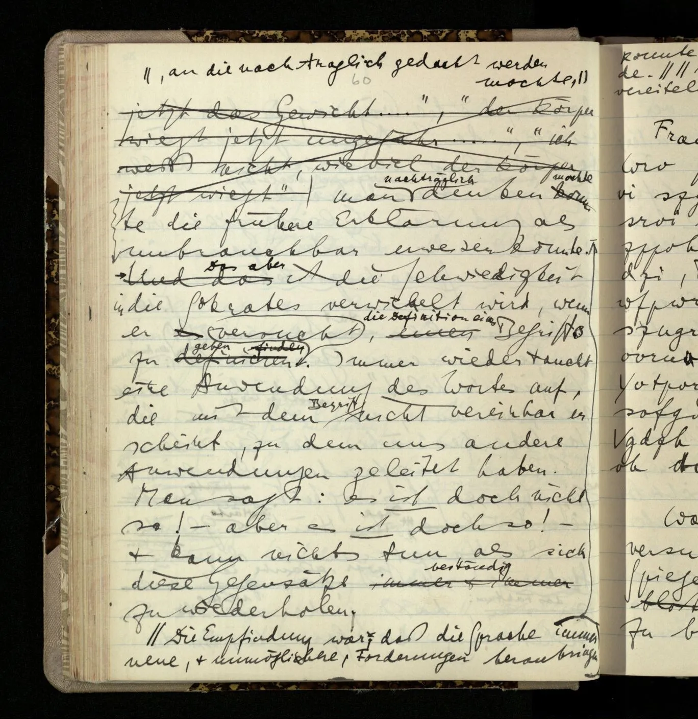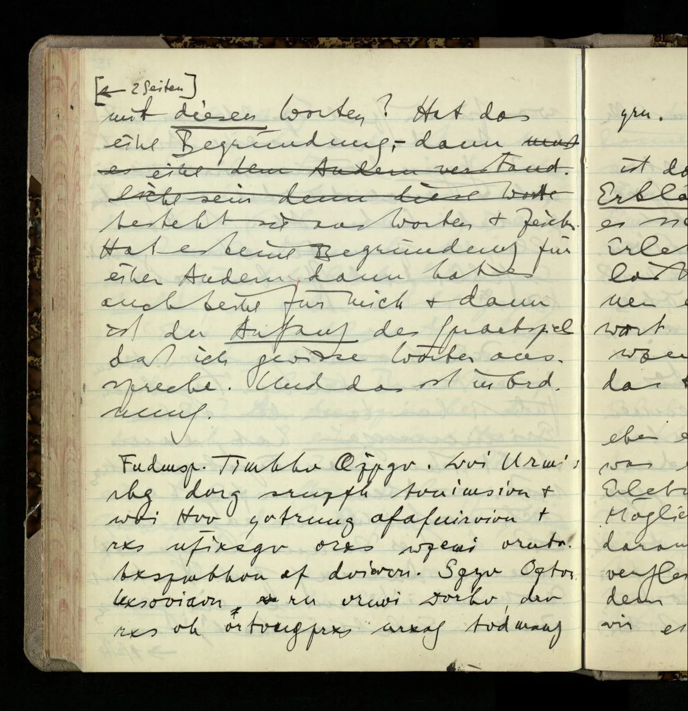 Ich könnte ja sagen: Wenn jener Mann der das Tagebuch führt beim Lesen desselben Erinnerungen hat, dann teilt ihm das Tagebuch etwas mit. – – Aber nun fragt es sich noch: Wann sagen wir, daß er ‘Erinnerungen hat’. Wenn darauf zur Antwort kommt: “Wenn er ein gewisses inneres Erlebnis hat”, so