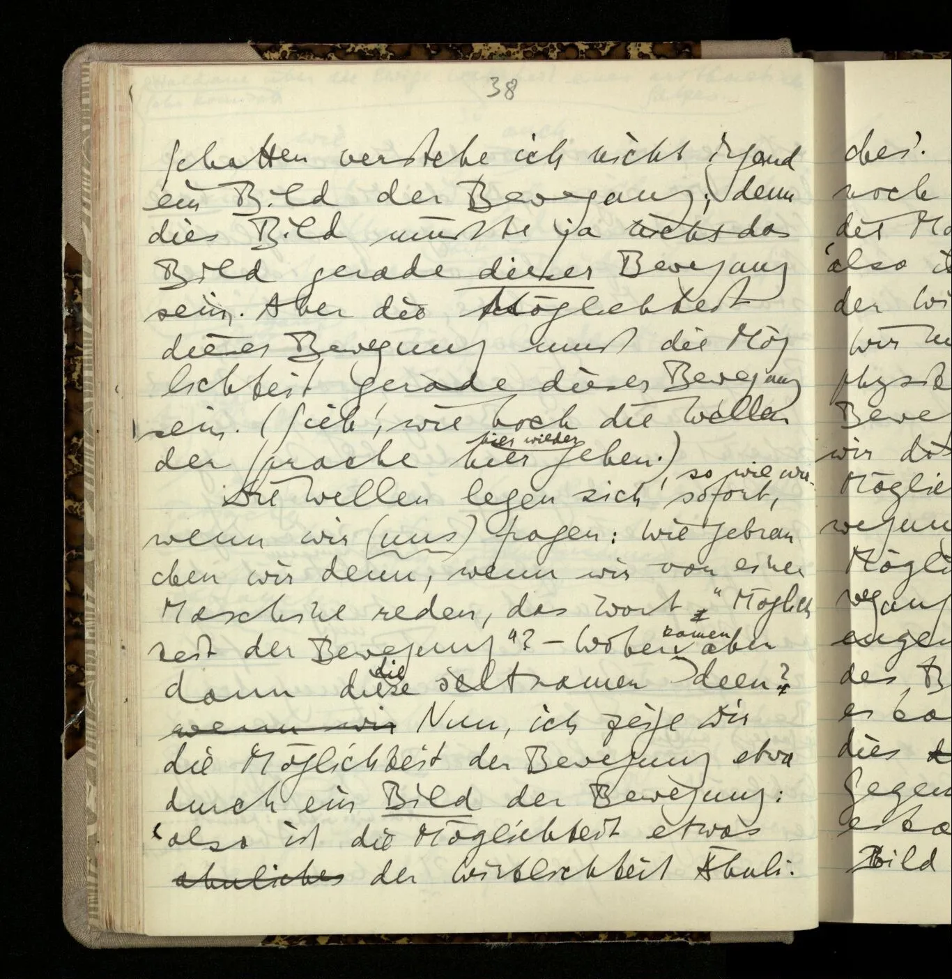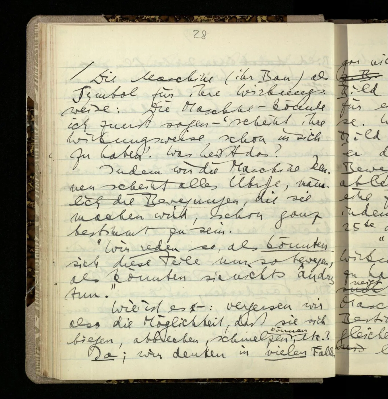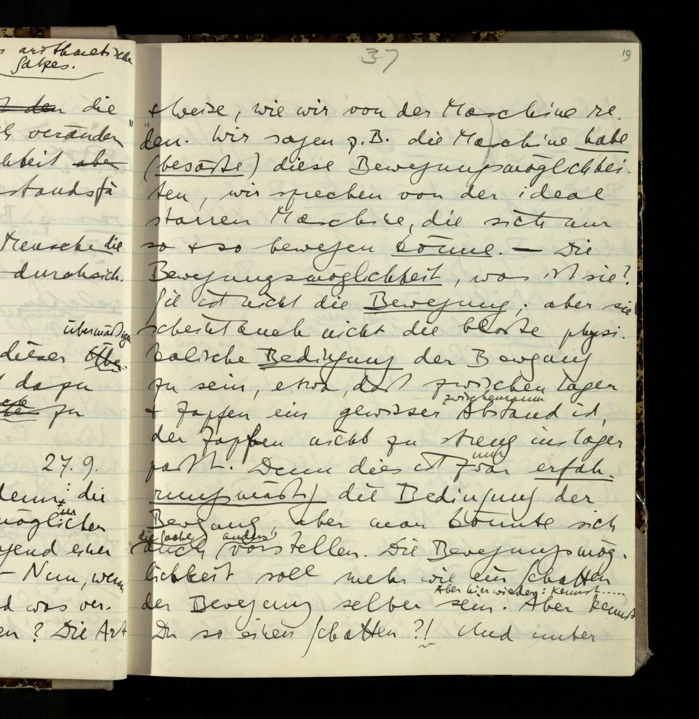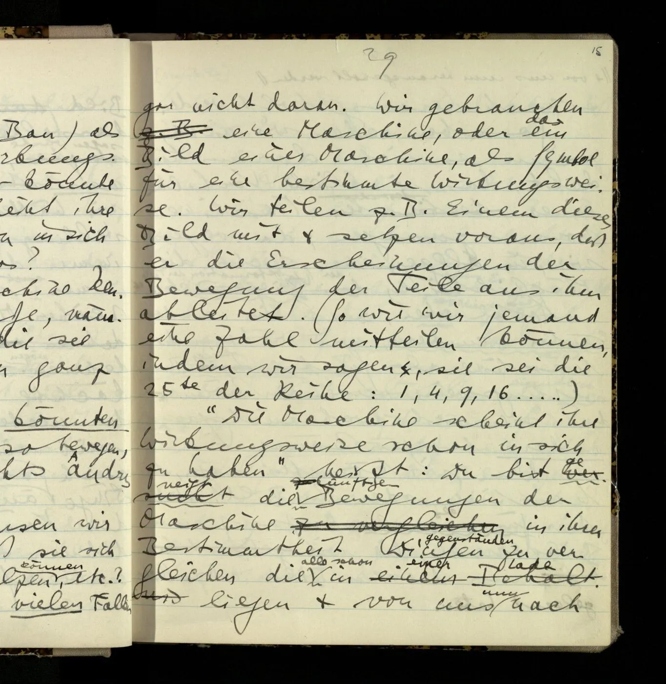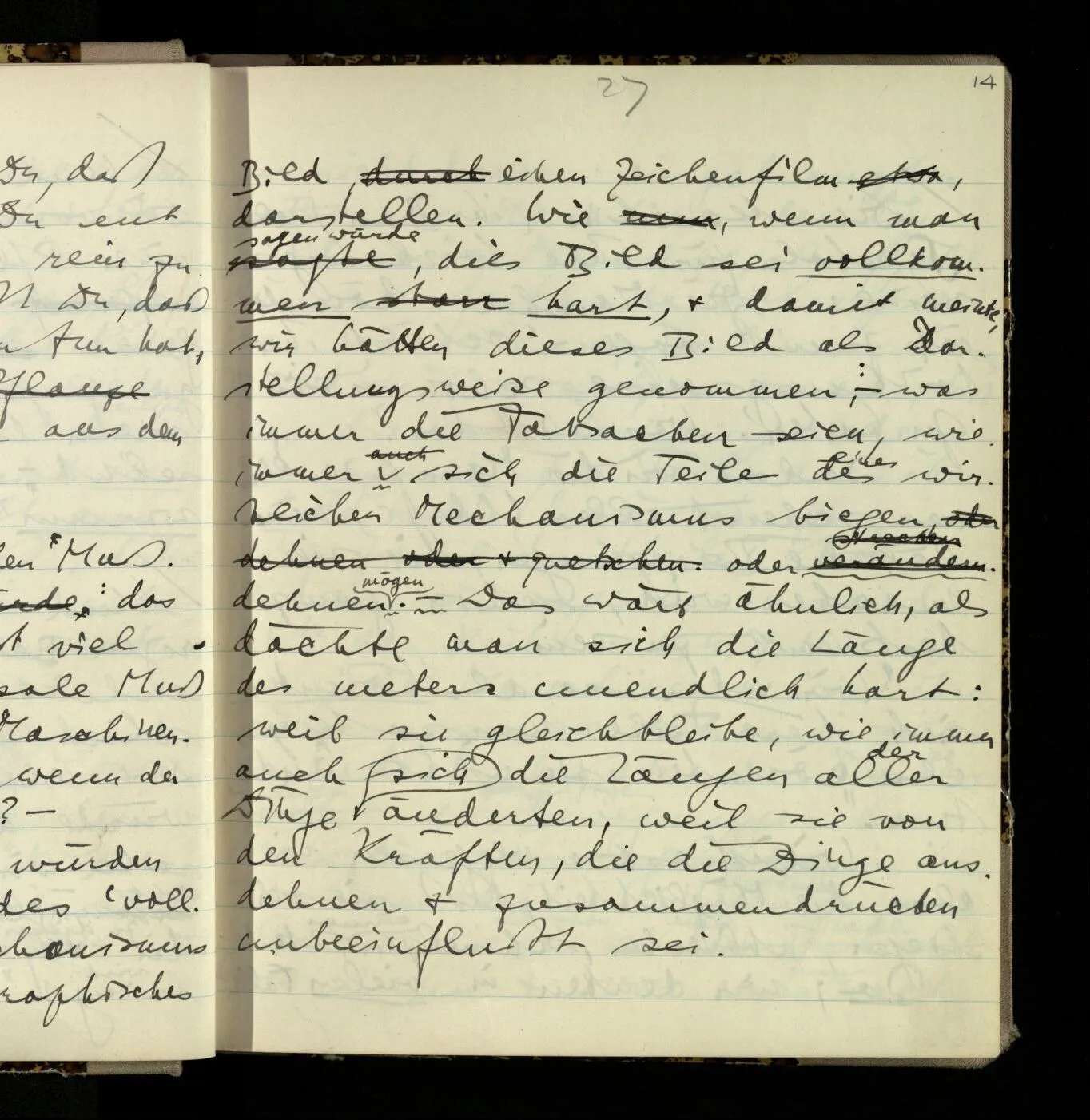 Die Härte des logischen Muß. Wie, wenn man sagte: das Muß der Kinematik ist viel härter, als das kausale Muß das einen Maschinenteil zwingt sich so zu bewegen, wenn der andre sich so bewegt? – Denk’ Dir, wir würden die Bewegungsweise des ‘vollkommen starren’ Mechanismus durch ein kinematographisches Bild, einen Zeichenfilm, darstellen. Wie, wenn man sagen würde, dies Bild sei vollkommen hart, & damit meinte, wir hätten dieses Bild als Darstellungsweise genommen, – was immer die Tatsachen seien, wie immer sich die Teile des wirklichen Mechanismus biegen, oder dehnen mögen. – Das wäre ähnlich, als dächte man sich die Länge des Meters unendlich hart: weil sie gleichbleibe, wie immer auch sich die Längen aller Dinge änderten, weil sie von den Kräften, die die Dinge ausdehnen & zusammendrücken unbeeinflußt sei.