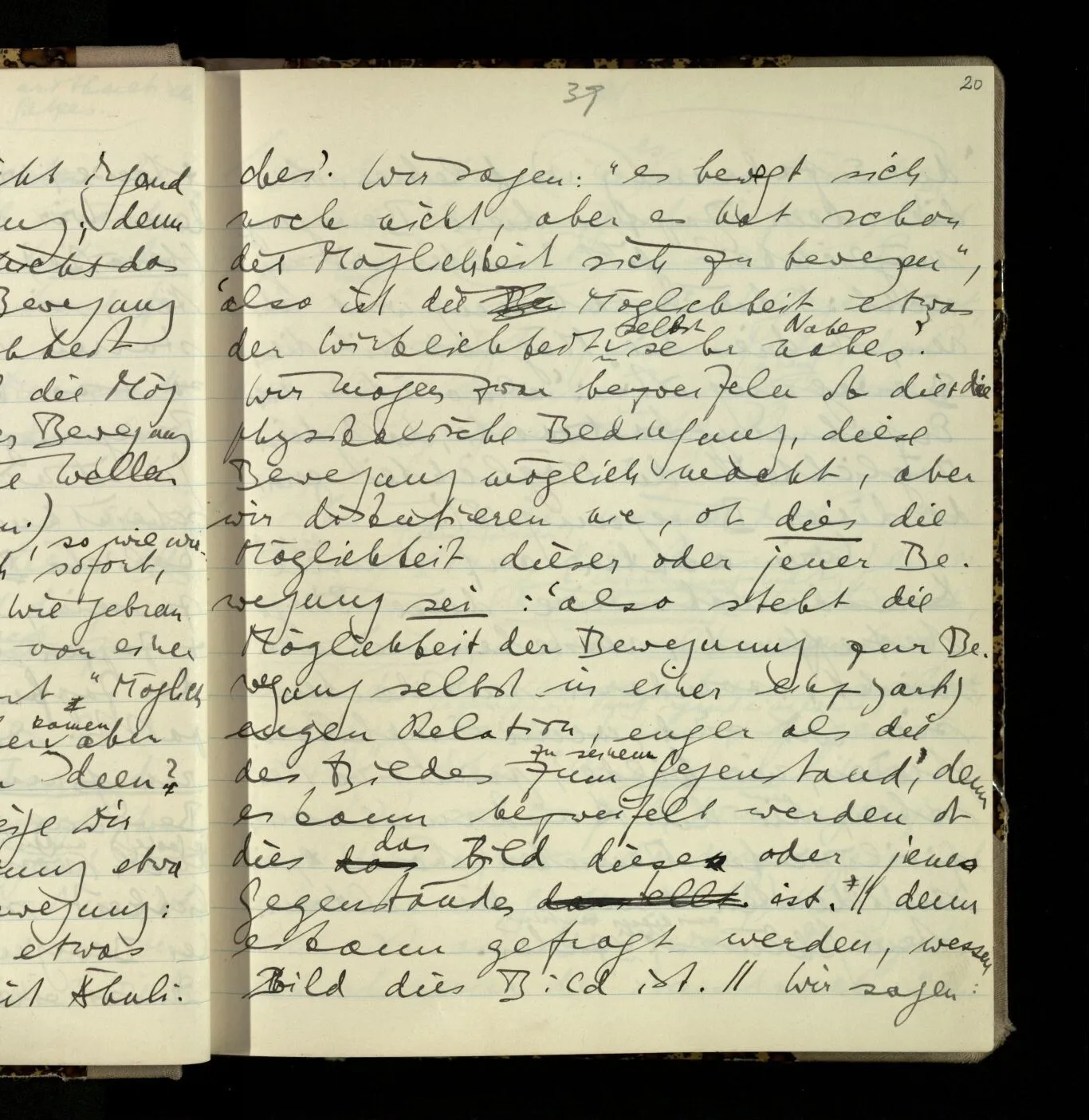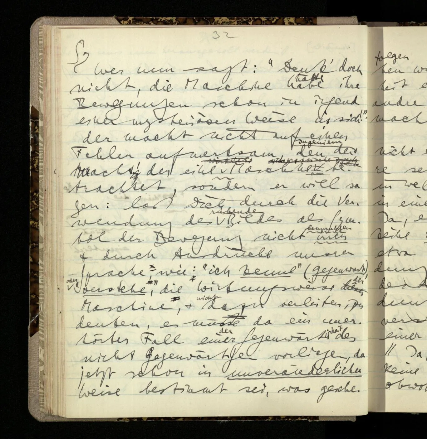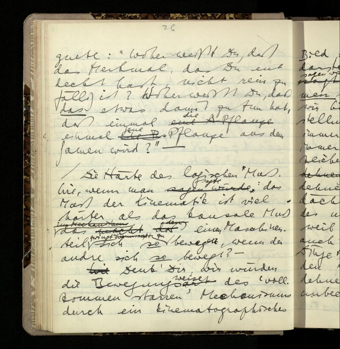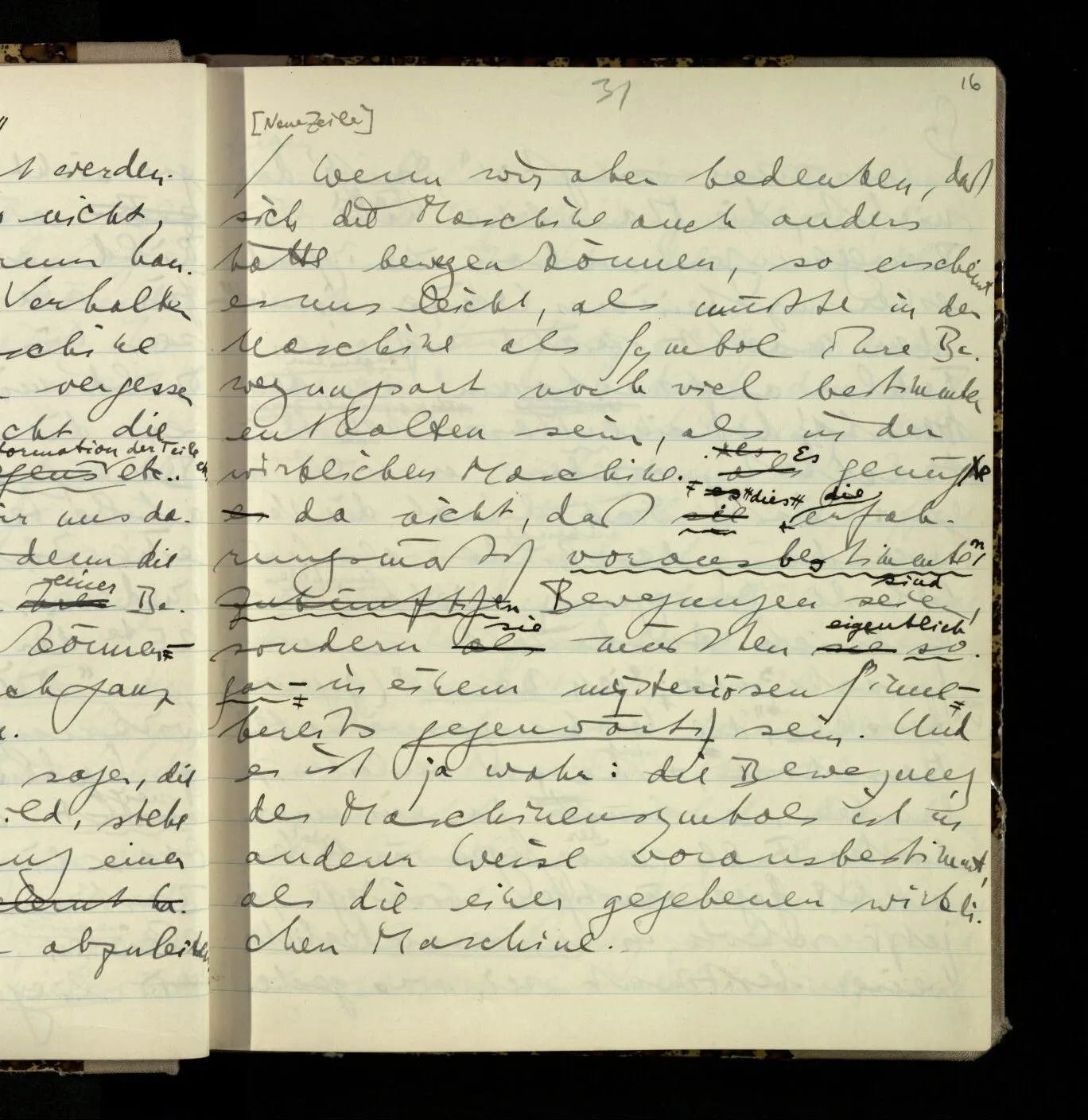 Die Härte des logischen Muß. Wie, wenn man sagte: das Muß der Kinematik ist viel härter, als das kausale Muß das einen Maschinenteil zwingt sich so zu bewegen, wenn der andre sich so bewegt? – Denk’ Dir, wir würden die Bewegungsweise des ‘vollkommen starren’ Mechanismus durch ein kinematographisches Bild, einen Zeichenfilm, darstellen. Wie, wenn man sagen würde, dies Bild sei vollkommen hart, & damit meinte, wir hätten dieses Bild als Darstellungsweise genommen, – was immer die Tatsachen seien, wie immer sich die Teile des wirklichen Mechanismus biegen, oder dehnen mögen. – Das wäre ähnlich, als dächte man sich die Länge des Meters unendlich hart: weil sie gleichbleibe, wie immer auch sich die Längen aller Dinge änderten, weil sie von den Kräften, die die Dinge ausdehnen & zusammendrücken unbeeinflußt sei.