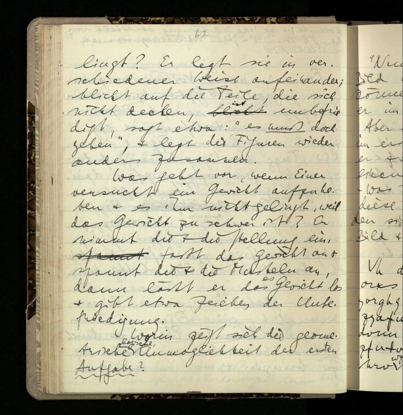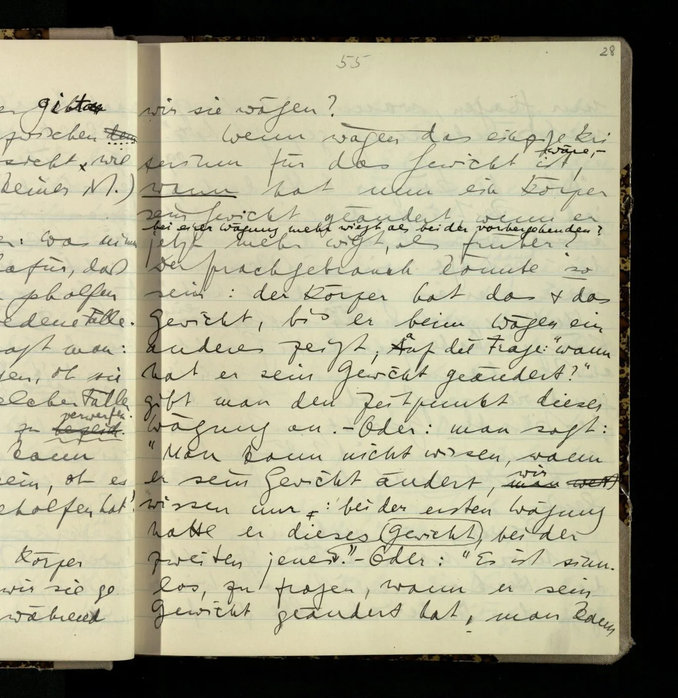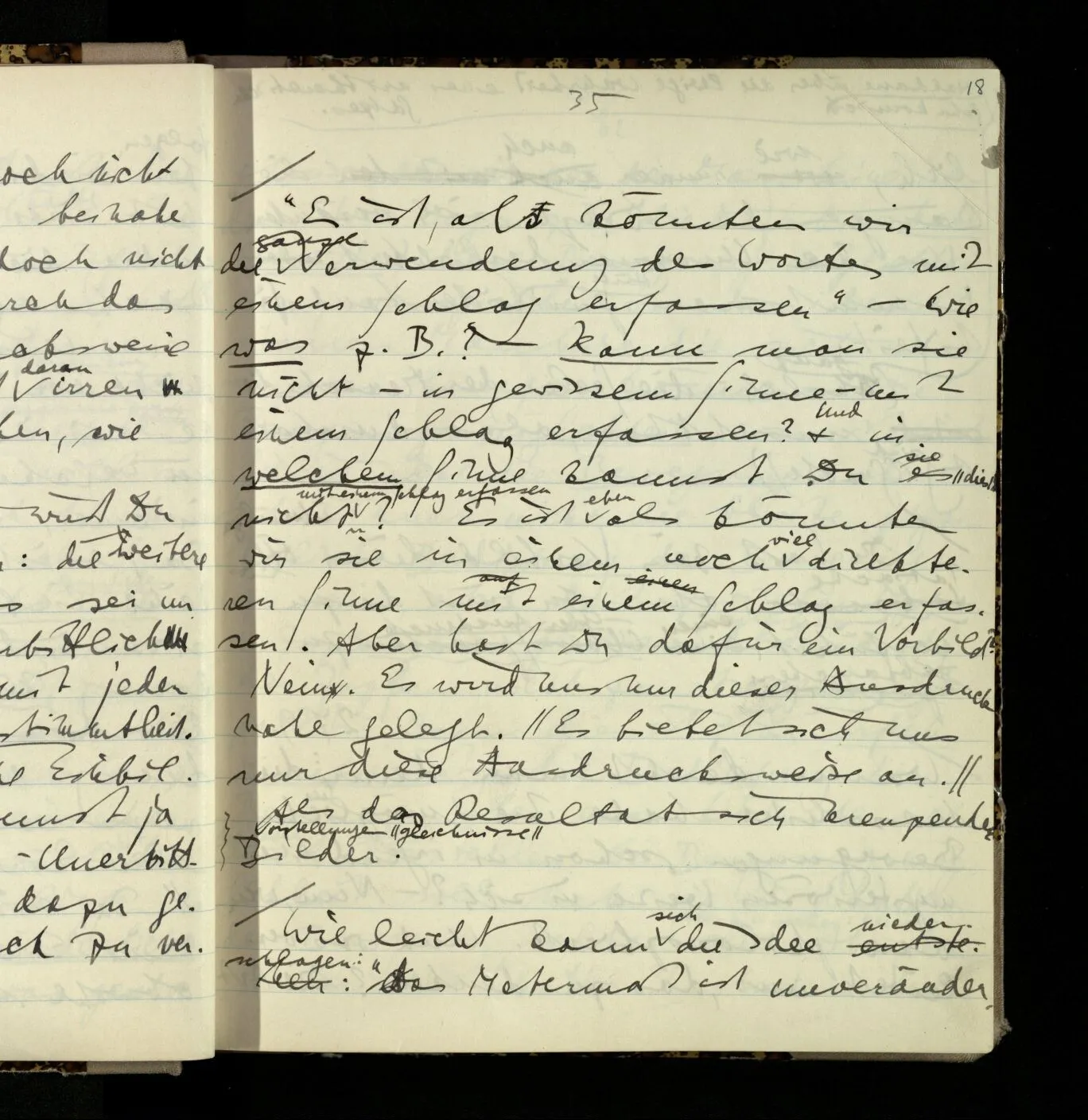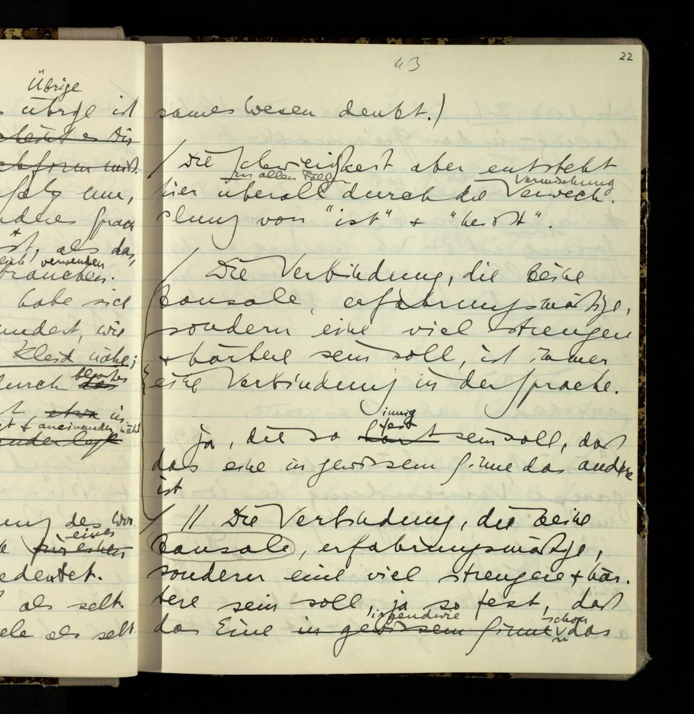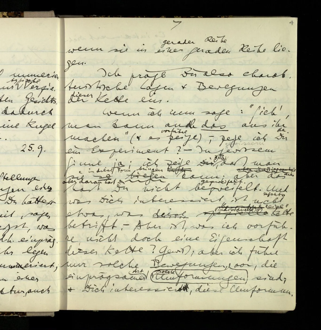 Die Härte des logischen Muß. Wie, wenn man sagte: das Muß der Kinematik ist viel härter, als das kausale Muß das einen Maschinenteil zwingt sich so zu bewegen, wenn der andre sich so bewegt? – Denk’ Dir, wir würden die Bewegungsweise des ‘vollkommen starren’ Mechanismus durch ein kinematographisches Bild, einen Zeichenfilm, darstellen. Wie, wenn man sagen würde, dies Bild sei vollkommen hart, & damit meinte, wir hätten dieses Bild als Darstellungsweise genommen, – was immer die Tatsachen seien, wie immer sich die Teile des wirklichen Mechanismus biegen, oder dehnen mögen. – Das wäre ähnlich, als dächte man sich die Länge des Meters unendlich hart: weil sie gleichbleibe, wie immer auch sich die Längen aller Dinge änderten, weil sie von den Kräften, die die Dinge ausdehnen & zusammendrücken unbeeinflußt sei.