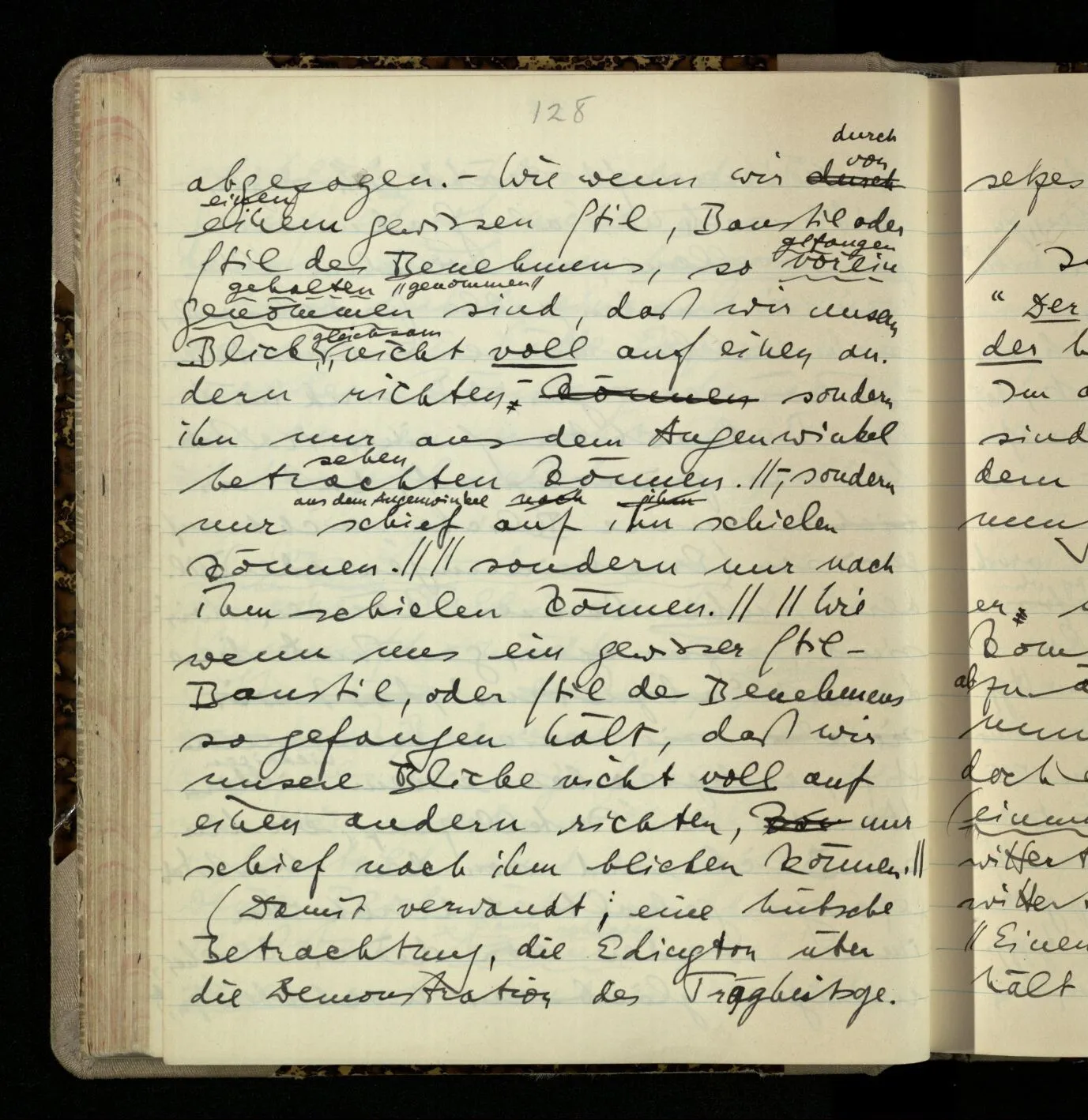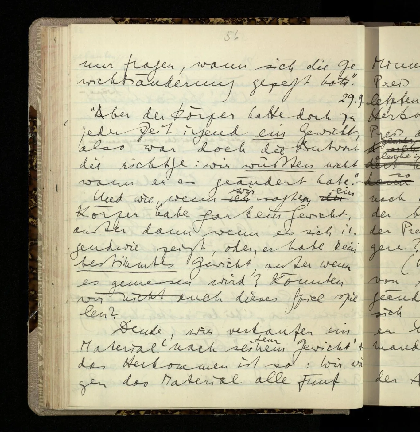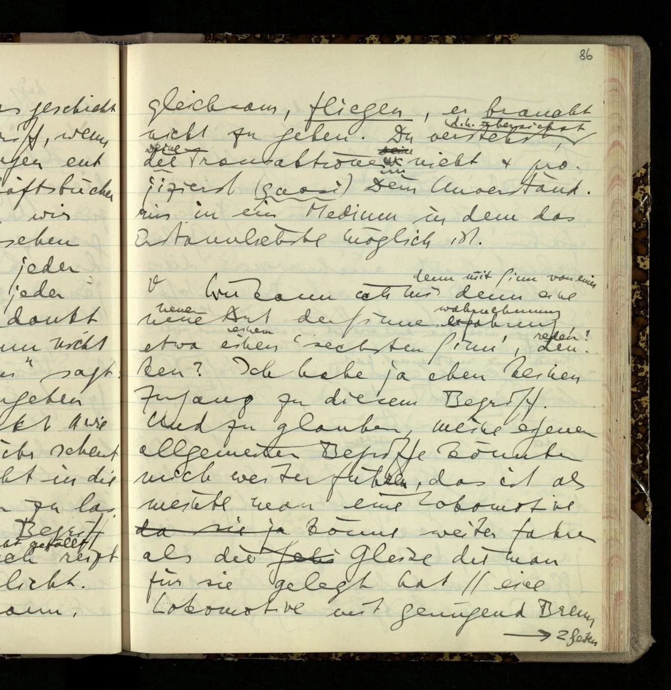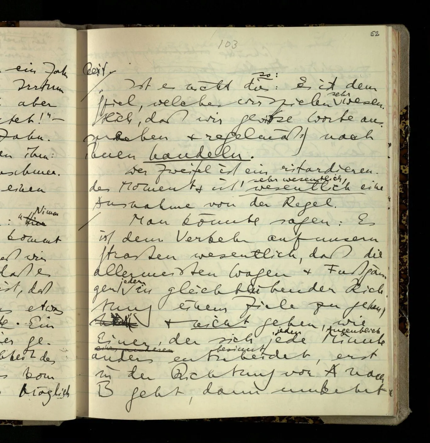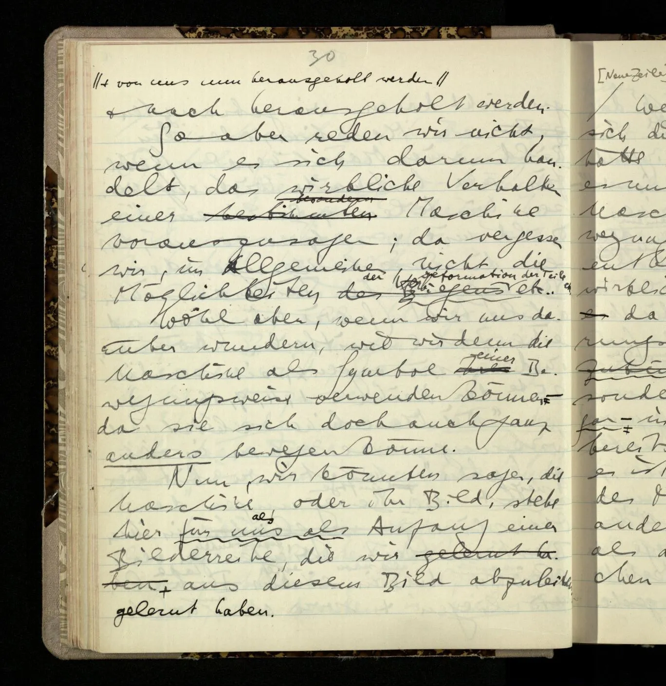 Die Härte des logischen Muß. Wie, wenn man sagte: das Muß der Kinematik ist viel härter, als das kausale Muß das einen Maschinenteil zwingt sich so zu bewegen, wenn der andre sich so bewegt? – Denk’ Dir, wir würden die Bewegungsweise des ‘vollkommen starren’ Mechanismus durch ein kinematographisches Bild, einen Zeichenfilm, darstellen. Wie, wenn man sagen würde, dies Bild sei vollkommen hart, & damit meinte, wir hätten dieses Bild als Darstellungsweise genommen, – was immer die Tatsachen seien, wie immer sich die Teile des wirklichen Mechanismus biegen, oder dehnen mögen. – Das wäre ähnlich, als dächte man sich die Länge des Meters unendlich hart: weil sie gleichbleibe, wie immer auch sich die Längen aller Dinge änderten, weil sie von den Kräften, die die Dinge ausdehnen & zusammendrücken unbeeinflußt sei.