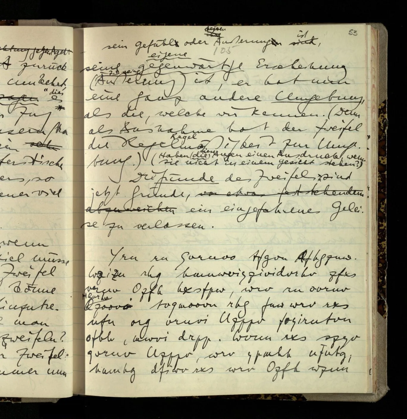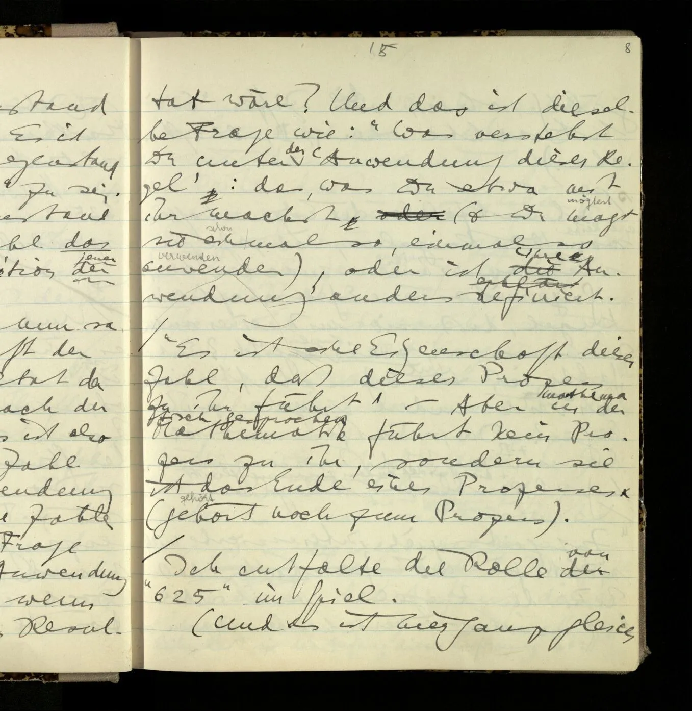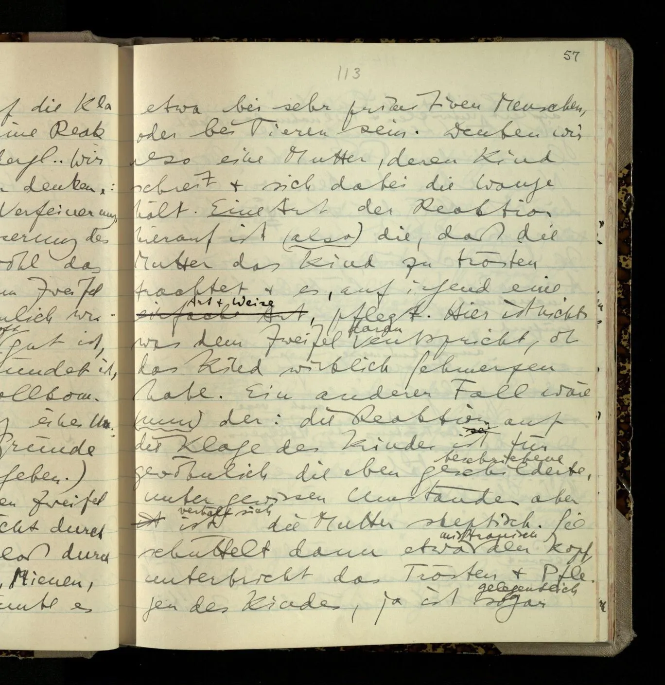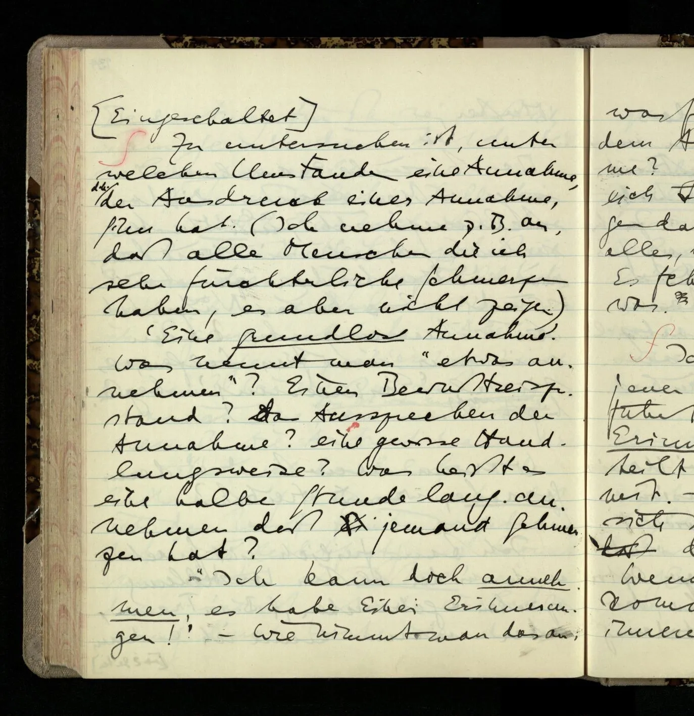 Zu untersuchen ist, unter welchen Umständen eine Annahme, d.h. der Ausdruck einer Annahme, Sinn hat. (Ich nehme z.B. an, daß alle Menschen die ich sehe fürchterliche Schmerzen haben, es aber nicht zeigen.) ‘Eine grundlose Annahme’. Was nennt man “etwas annehmen”? Einen Bewußtseinszustand? das Aussprechen der Annahme? eine gewisse Handlungsweise? Was heißt es eine halbe Stunde lang annehmen daß jemand Schmerzen hat? “Ich kann doch annehmen, es habe Einer Erinnerungen!” – Wie nimmt man das an; was für ein Spiel spielt man mit dem Ausdruck so einer Annahme? Sagen können wir es natürlich & auch die & die Empfindungen dabei haben. Aber ist das alles, was zum Annehmen gehört? Es fehlt doch offenbar noch etwas.