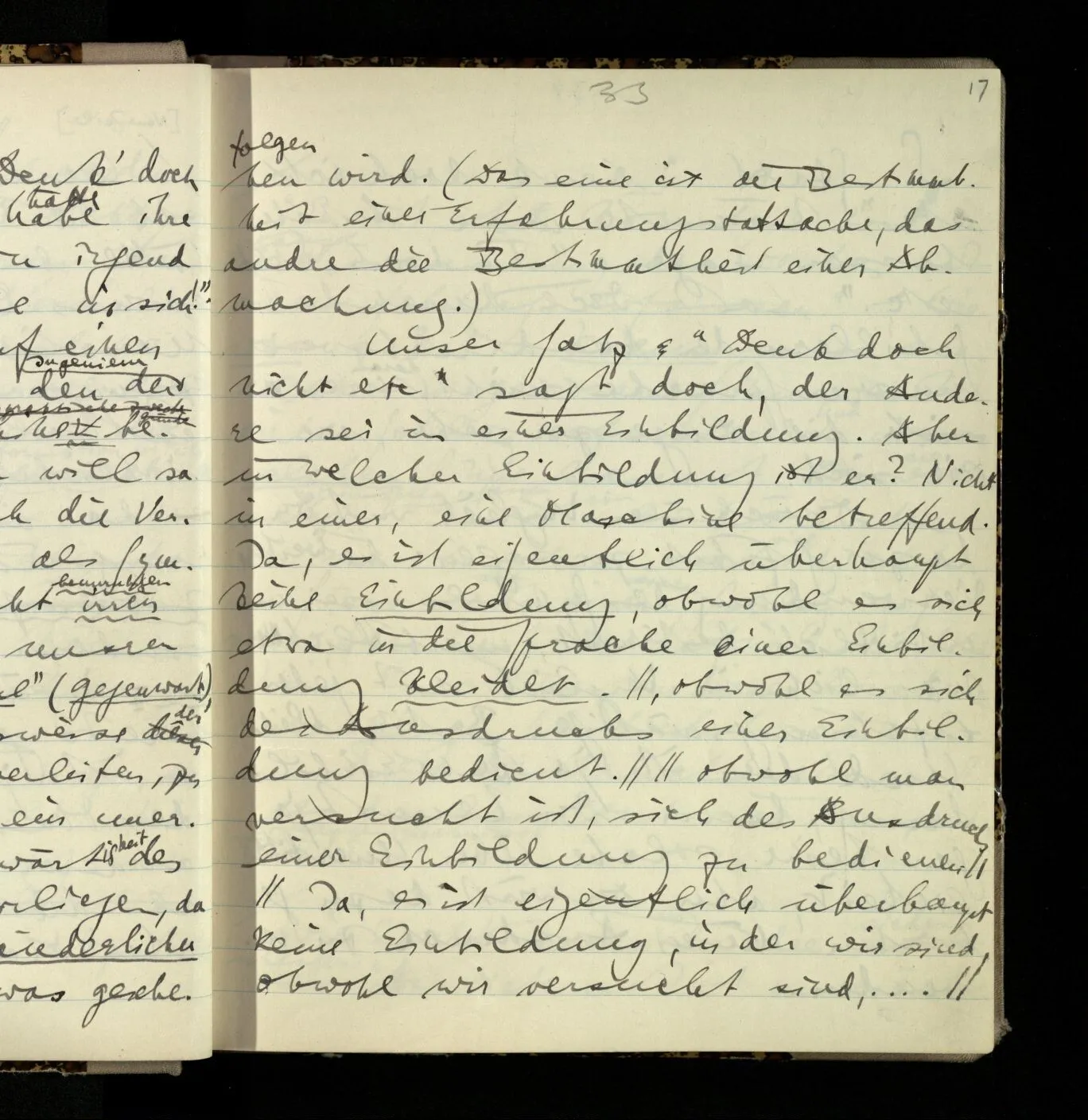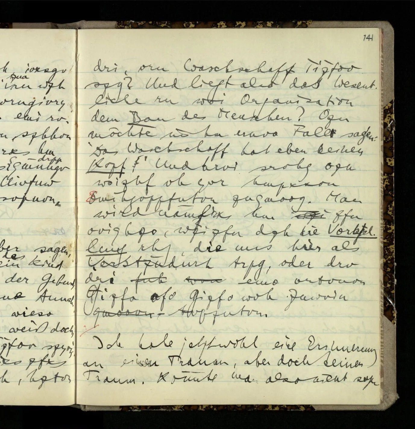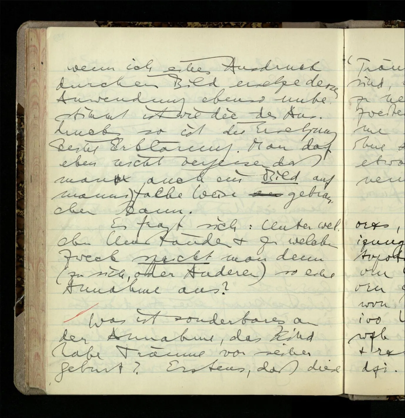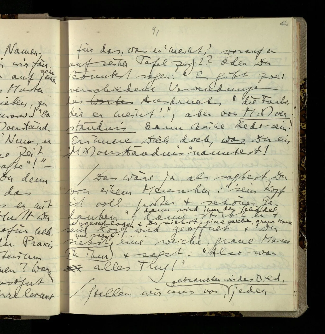 Nun will ich aber sagen, daß, wer annimmt, ein Kind habe Träume vor der Geburt, in gewissem Sinne seine Annahme nicht versteht. “Aber wieso versteht er sie nicht? Er weiß doch, was es heißt selbst Träume haben! Aber versteht er dadurch auch was es heißt, daß, sagen wir, ein Waschschaff Träume hat? Und liegt also das Wesentliche in der Organisation dem Bau des Menschen? Man möchte in so einem Fall sagen: “Das Waschschaff hat eben keinen Kopf.” Und hier sieht man worauf es bei solchen Vorstellungen ankommt. Man wird nämlich so aufmerksam, darauf was die Vorstellung ist, die uns hier als Verständnis gilt; oder wie wir vom eigenen Traum zum Traum des Andern gelangen.