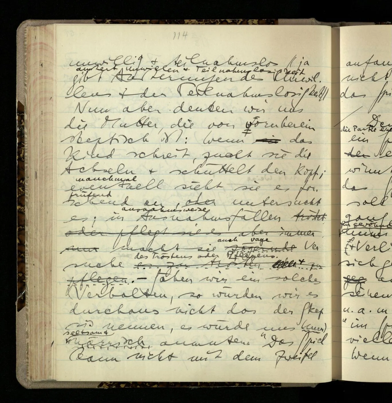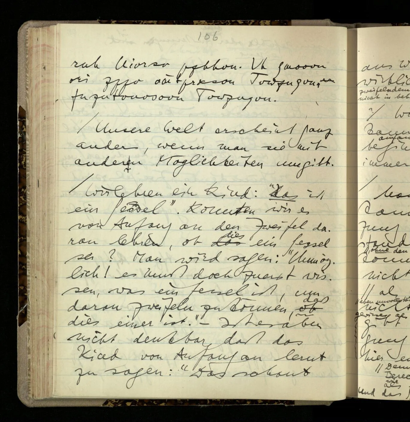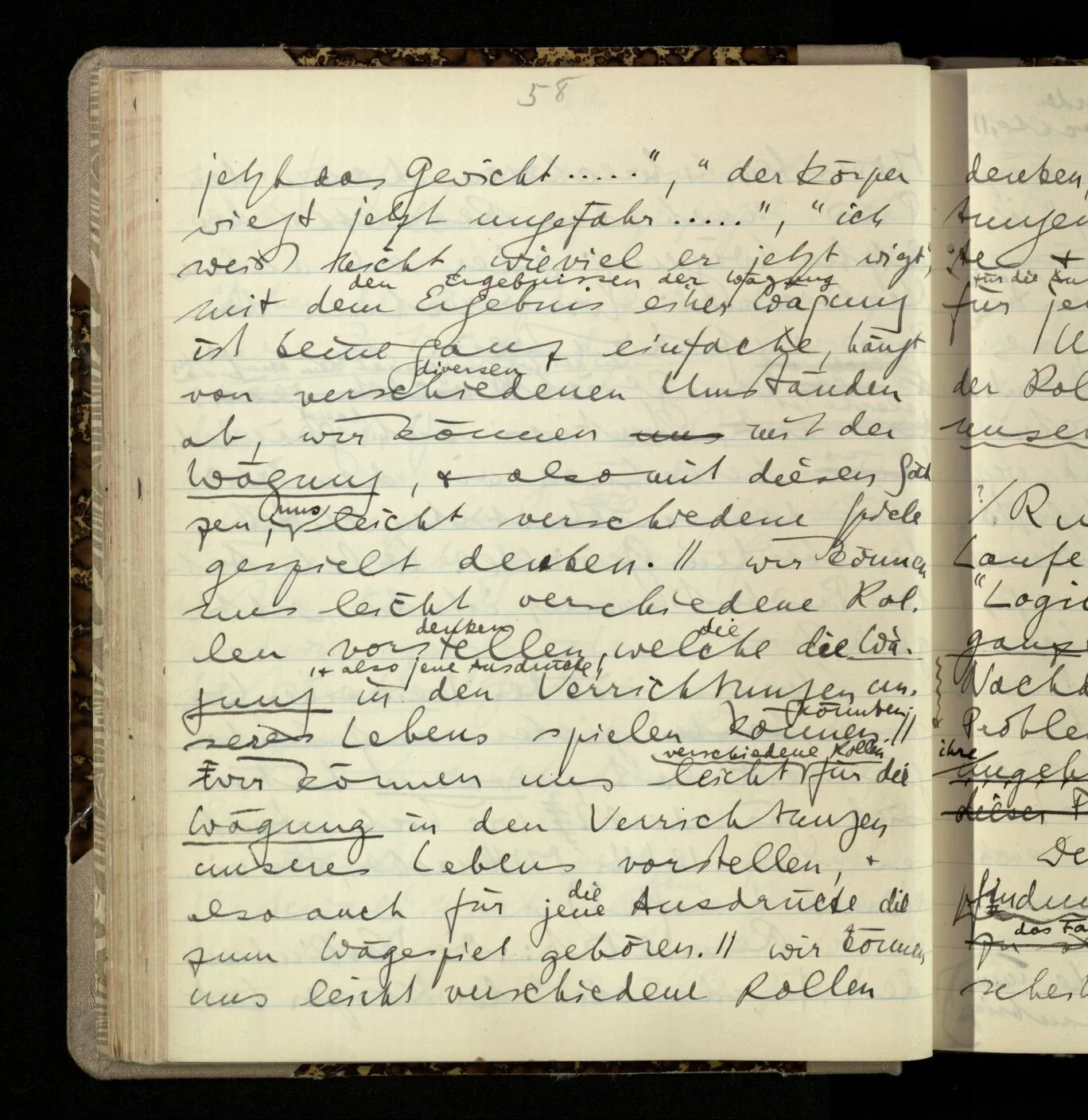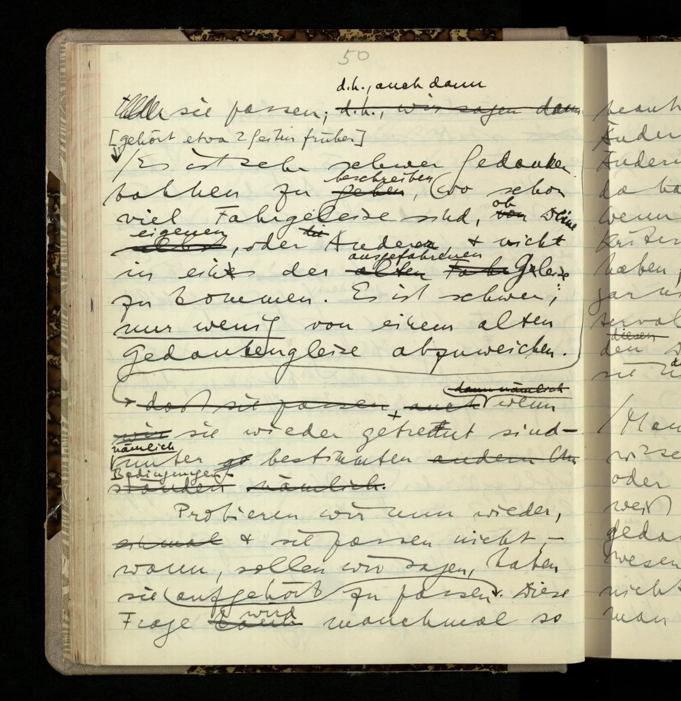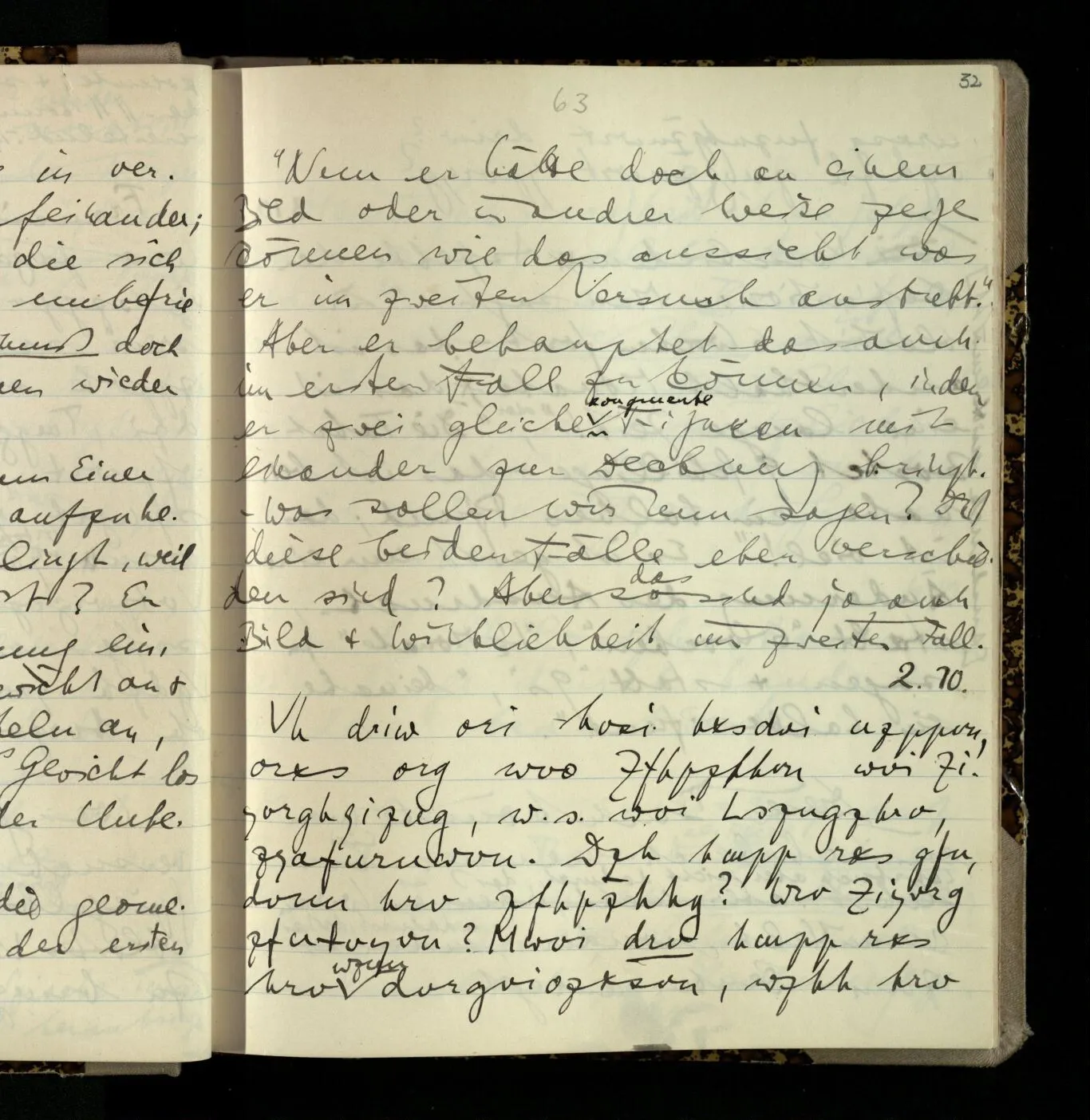 Nun will ich aber sagen, daß, wer annimmt, ein Kind habe Träume vor der Geburt, in gewissem Sinne seine Annahme nicht versteht. “Aber wieso versteht er sie nicht? Er weiß doch, was es heißt selbst Träume haben! Aber versteht er dadurch auch was es heißt, daß, sagen wir, ein Waschschaff Träume hat? Und liegt also das Wesentliche in der Organisation dem Bau des Menschen? Man möchte in so einem Fall sagen: “Das Waschschaff hat eben keinen Kopf.” Und hier sieht man worauf es bei solchen Vorstellungen ankommt. Man wird nämlich so aufmerksam, darauf was die Vorstellung ist, die uns hier als Verständnis gilt; oder wie wir vom eigenen Traum zum Traum des Andern gelangen.