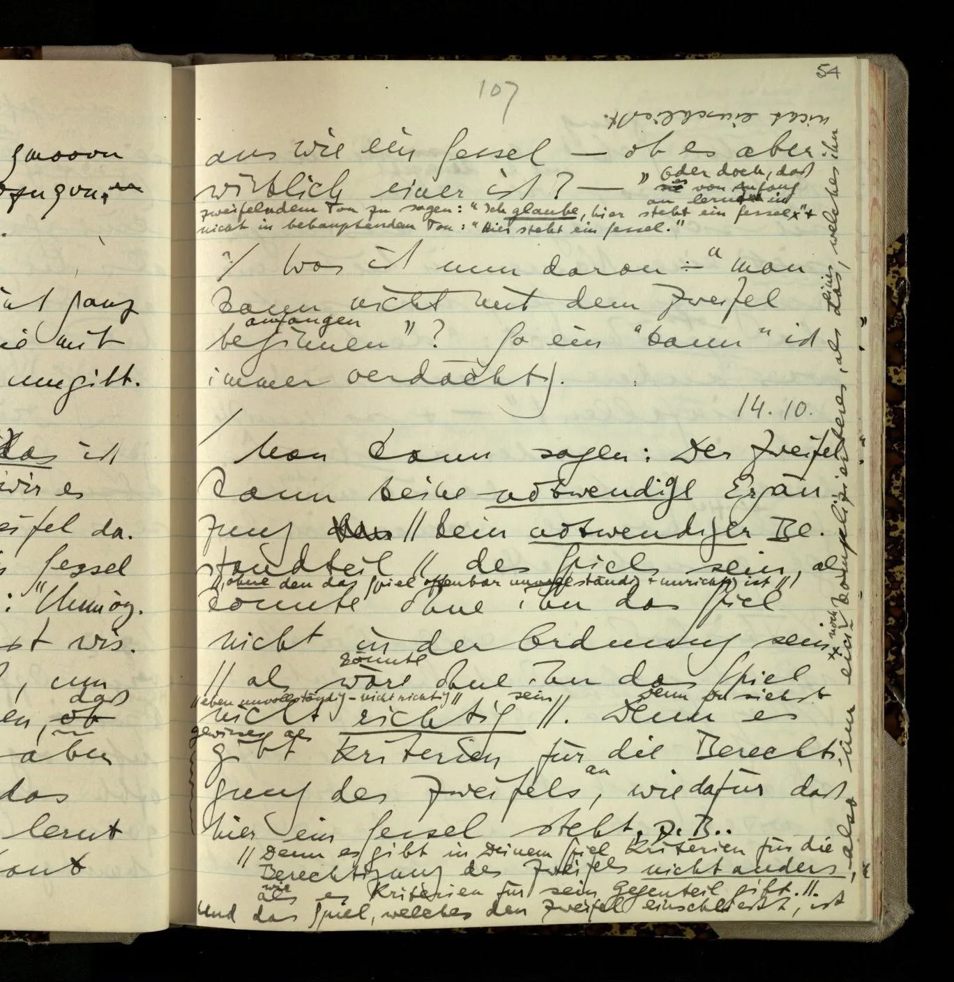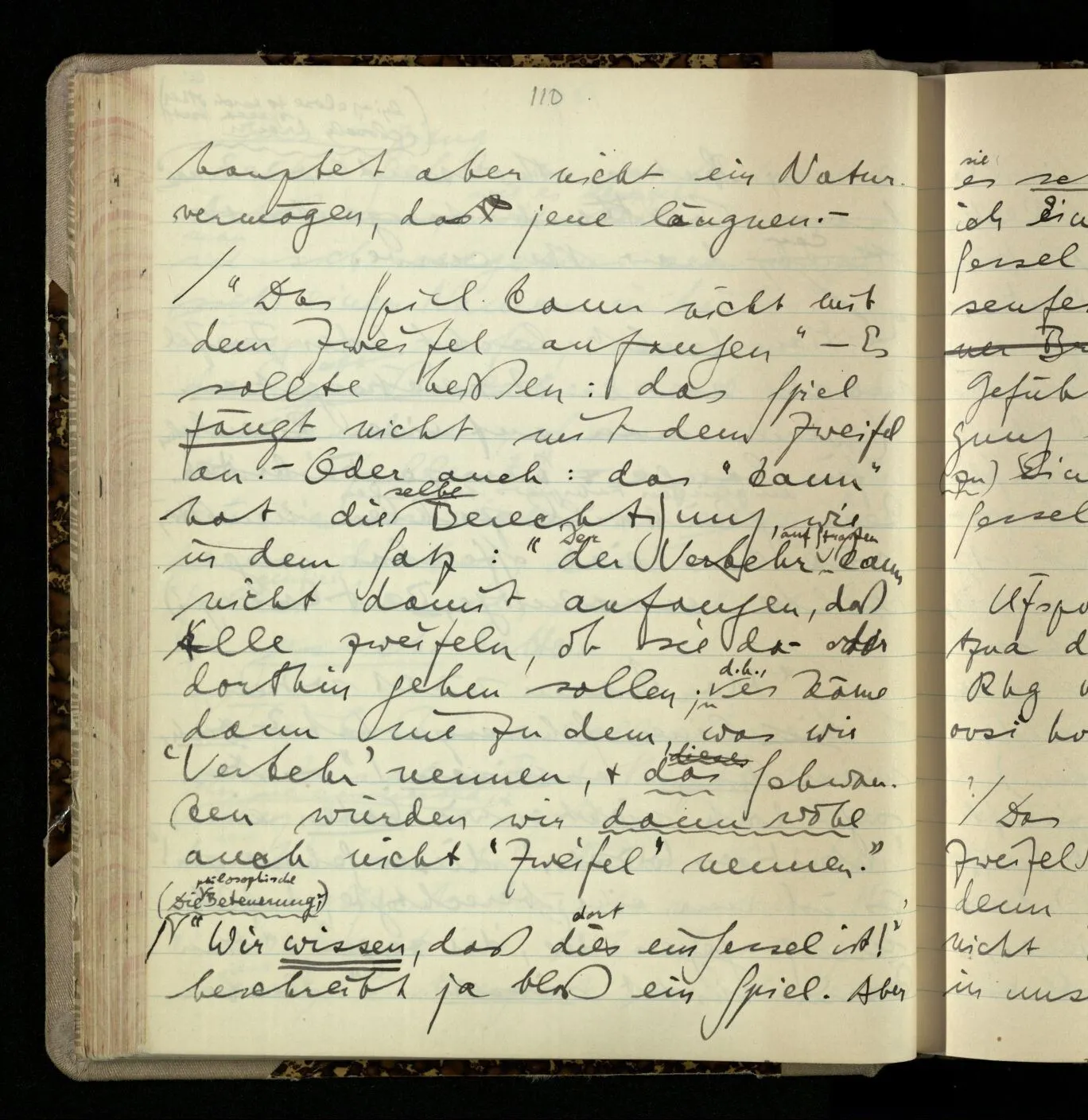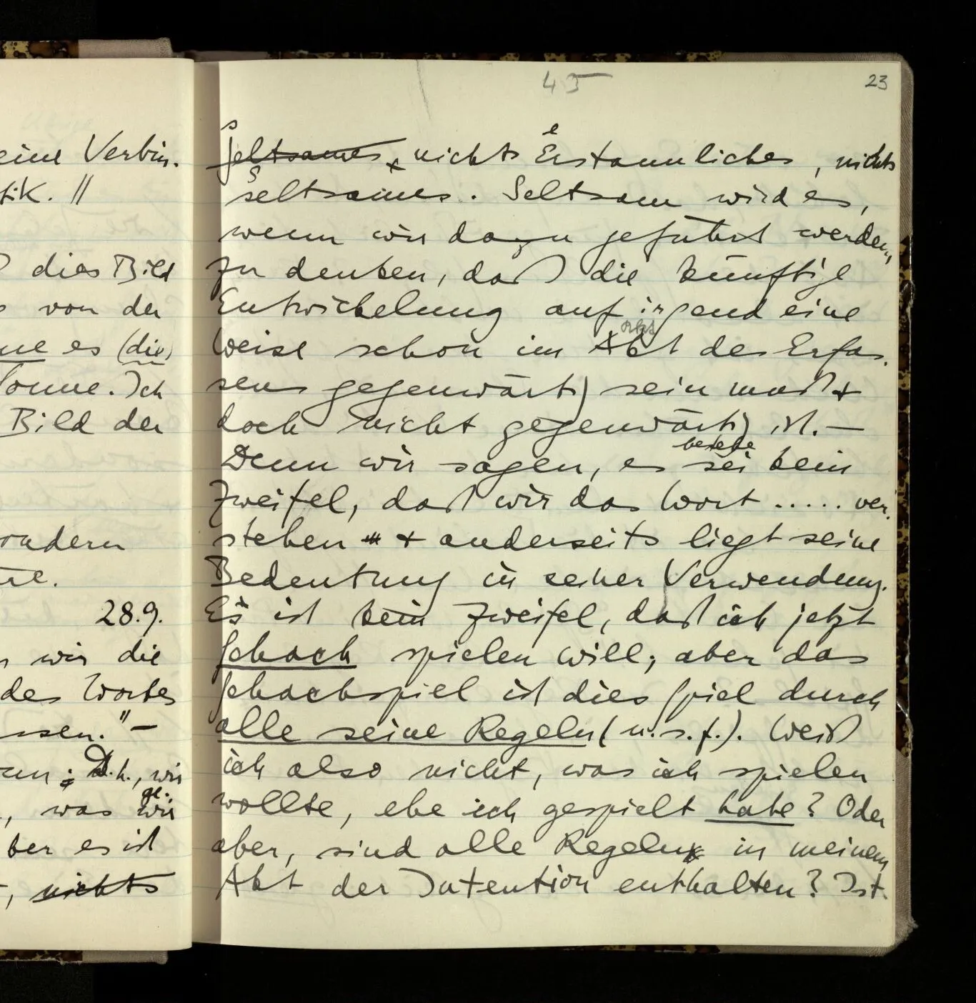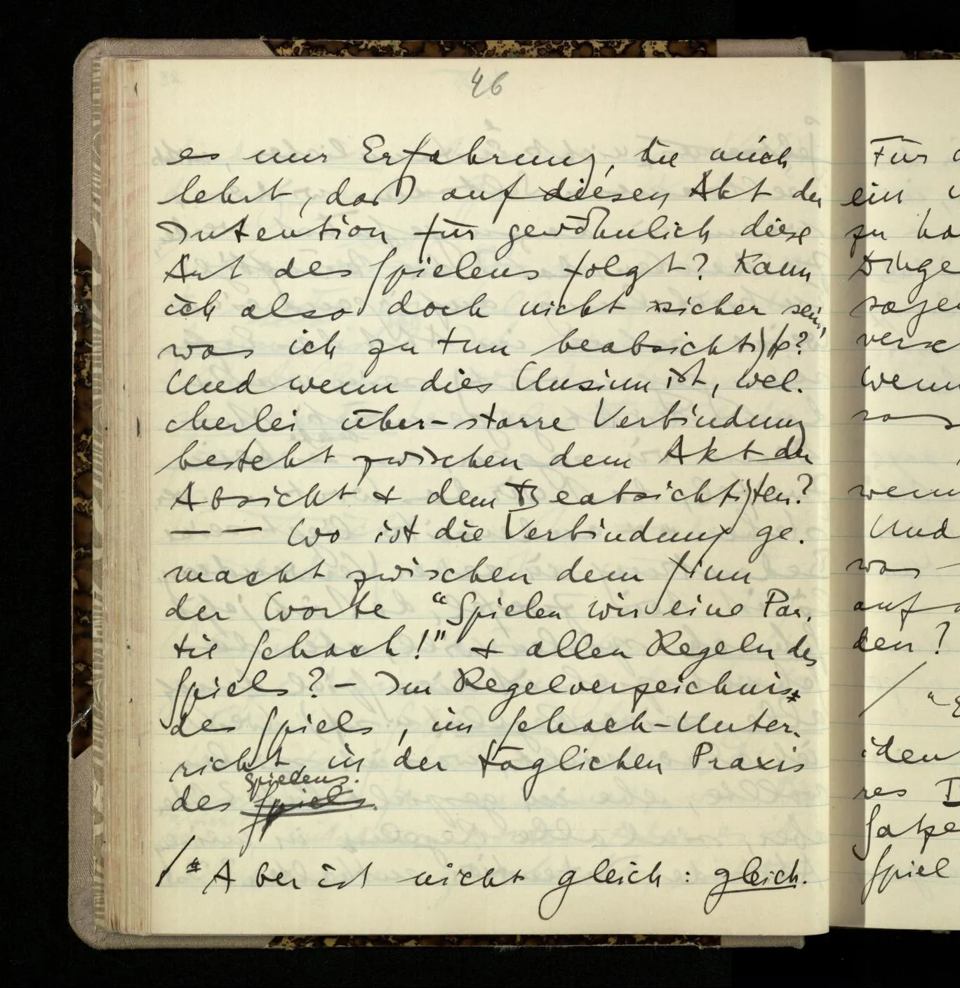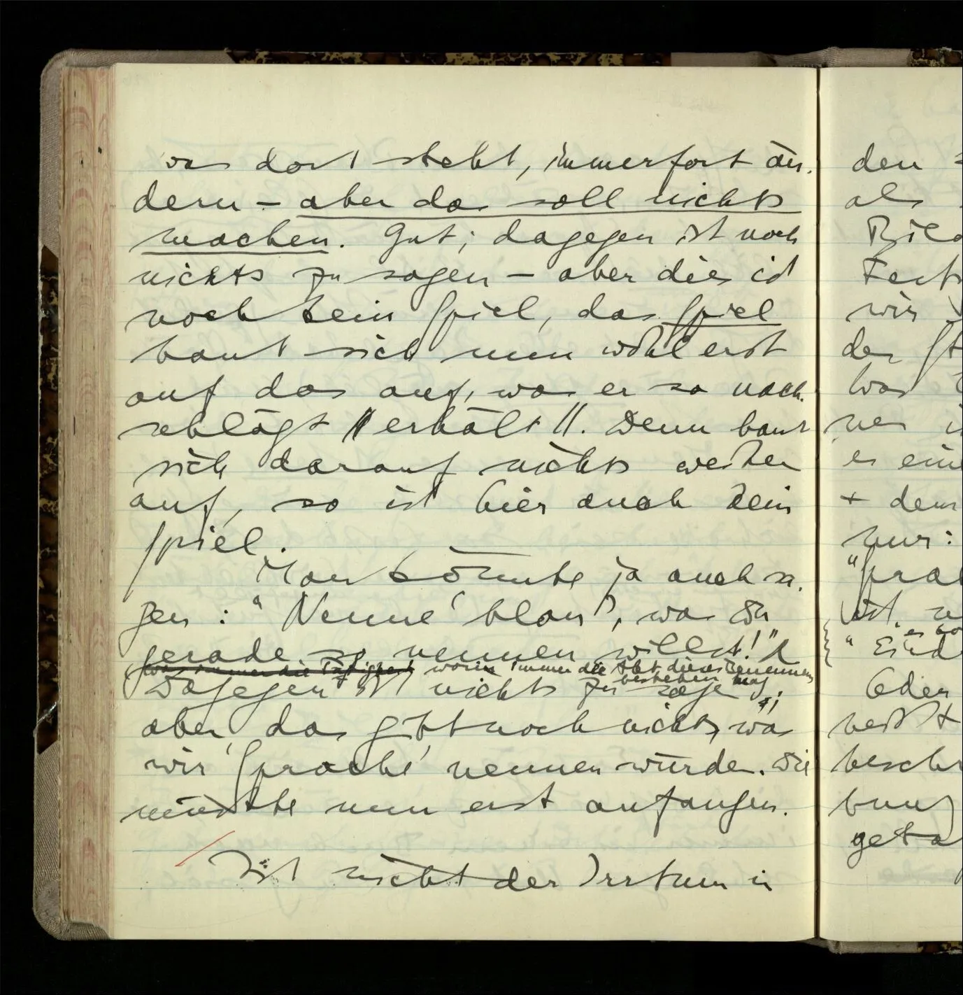 Er möge, statt sich an die Definition zu erinnern, sie immer in einem Buch nachschlagen. Und zwar mag sich, was dort steht, immerfort ändern – aber das soll nichts machen. Gut; dagegen ist noch nichts zu sagen– aber dies ist noch kein Spiel, das Spiel baut sich nun wohl erst auf das auf, was er so nachschlägt. Denn baut sich darauf nichts weiter auf, so ist hier auch kein Spiel. Man könnte ja auch sagen: “Nenne ‘blau’, was Du gerade so nennen willst! worin immer der Akt dieses Benennens bestehen mag.” Dagegen ist nichts zu sagen; aber das gibt noch nichts, was wir ‘Sprache’ nennen würden. Die müßte nun erst anfangen.