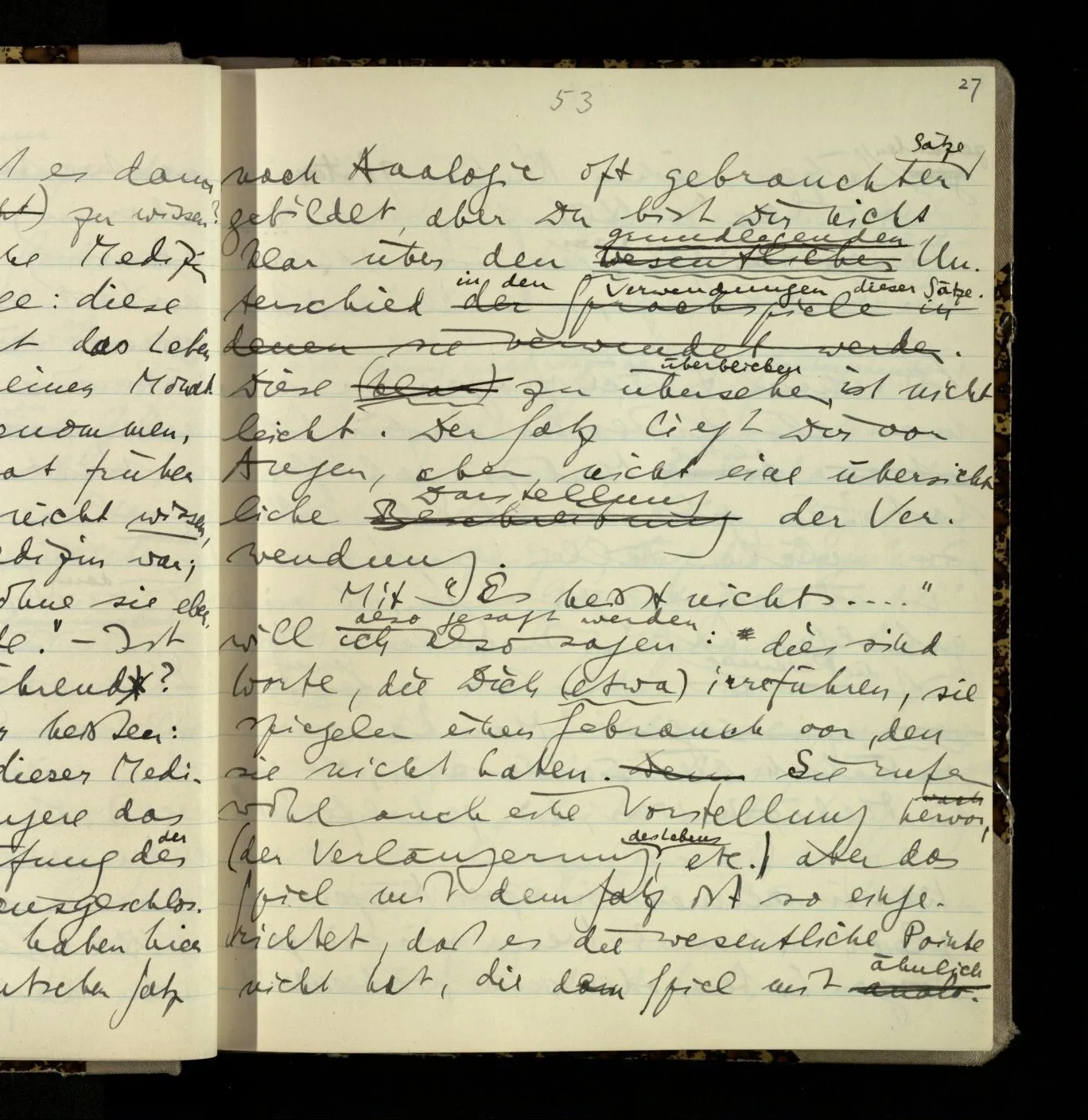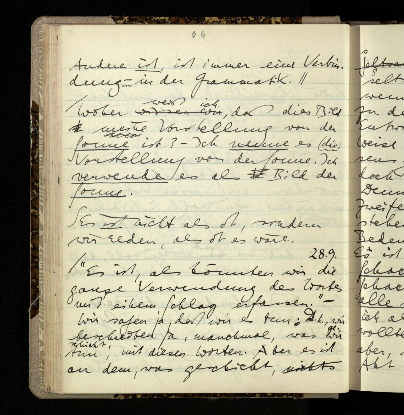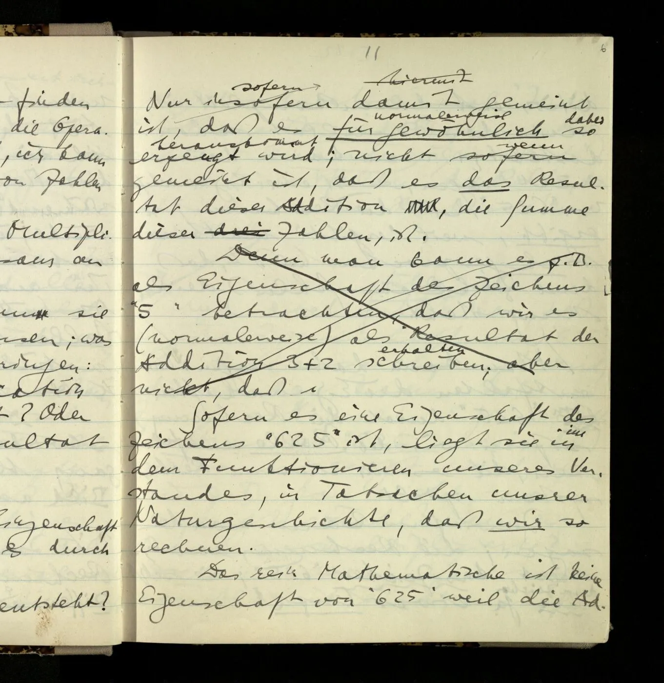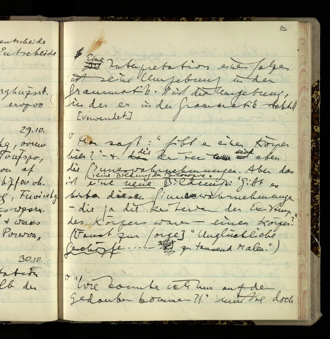 17.11.1937 Wir haben, in Betreff der Grammatik eines Wortes ein Vorurteil. Dieses, gestützt auf mancherlei Erscheinungen der Oberflächengrammatik, ist so mächtig, daß es der raffiniertesten Methoden bedarf davon los zu kommen. (In der Mathematik speziell wird die Oberflächengrammatik eigens daraufhin eingerichtet Mißverständnisse zu erzeugen.)