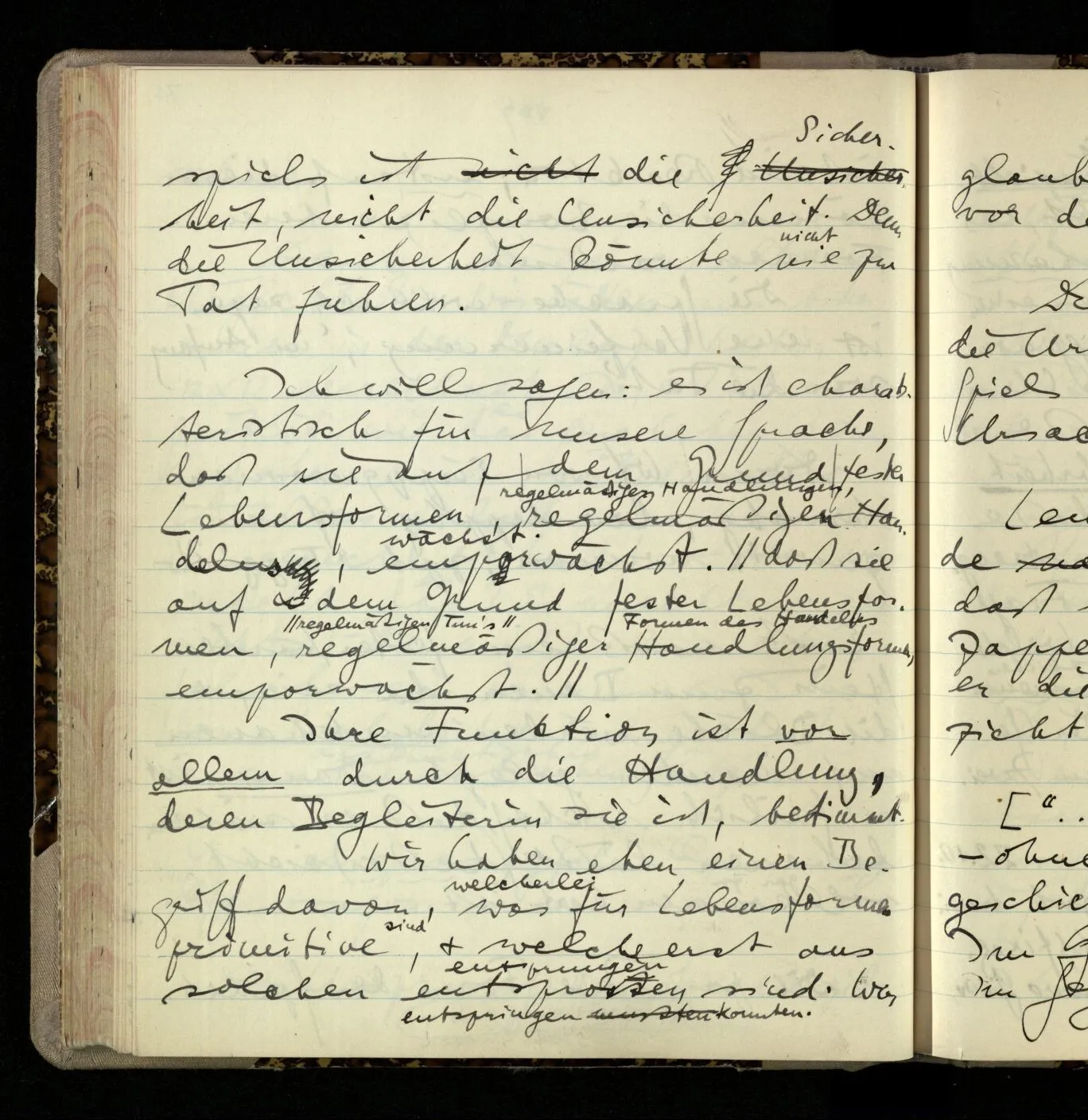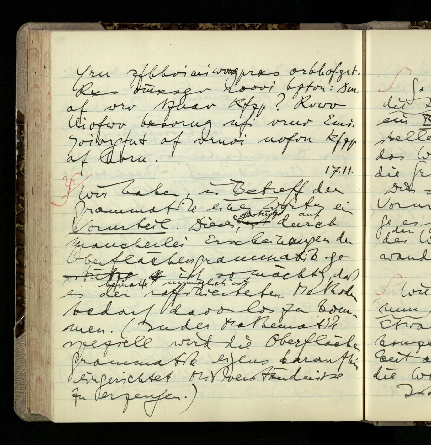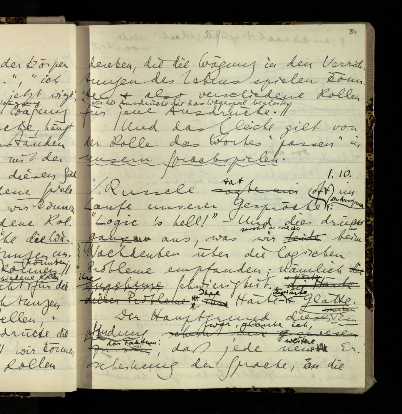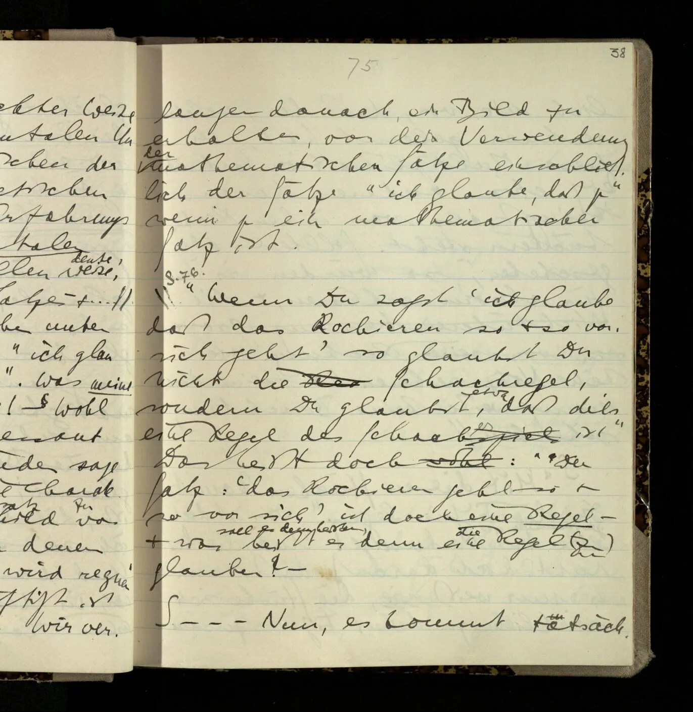 17.11.1937 Wir haben, in Betreff der Grammatik eines Wortes ein Vorurteil. Dieses, gestützt auf mancherlei Erscheinungen der Oberflächengrammatik, ist so mächtig, daß es der raffiniertesten Methoden bedarf davon los zu kommen. (In der Mathematik speziell wird die Oberflächengrammatik eigens daraufhin eingerichtet Mißverständnisse zu erzeugen.)