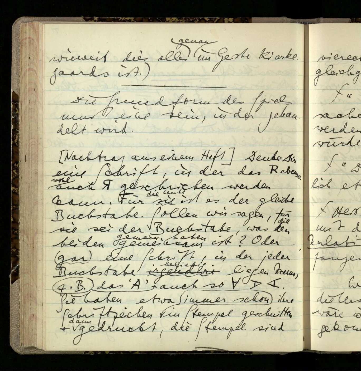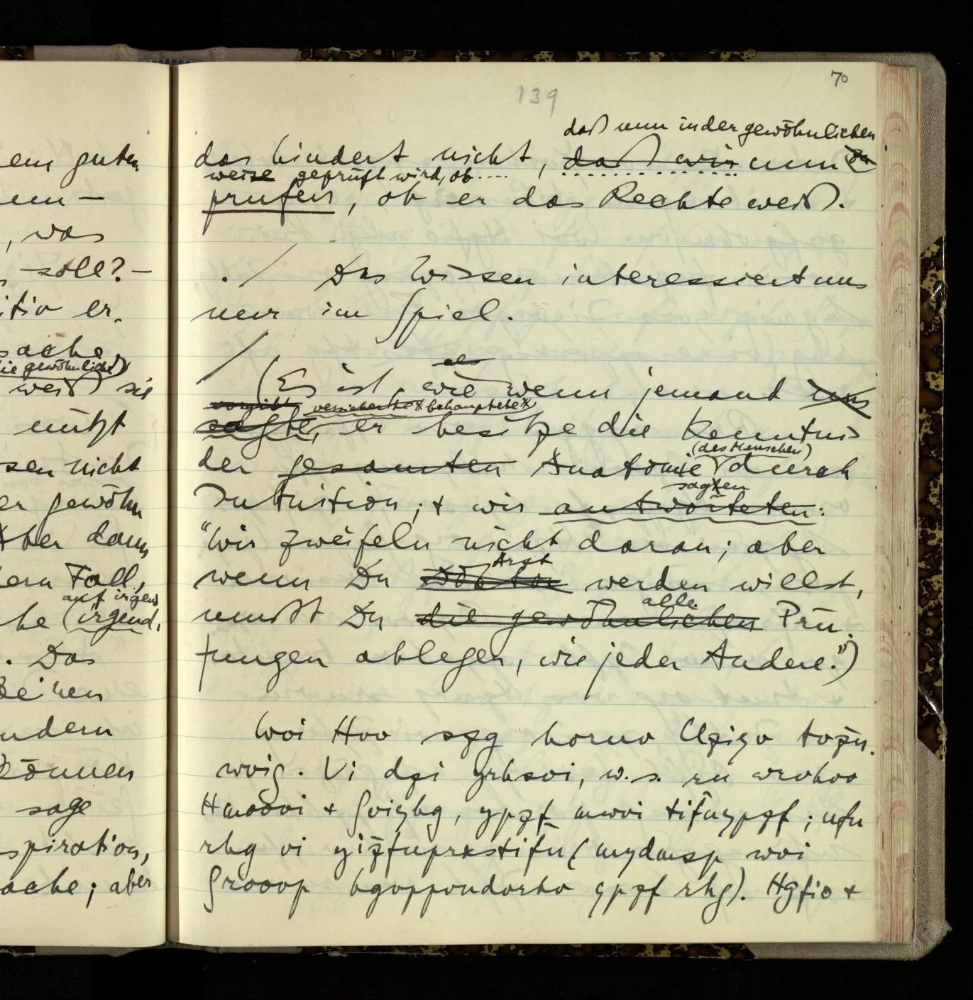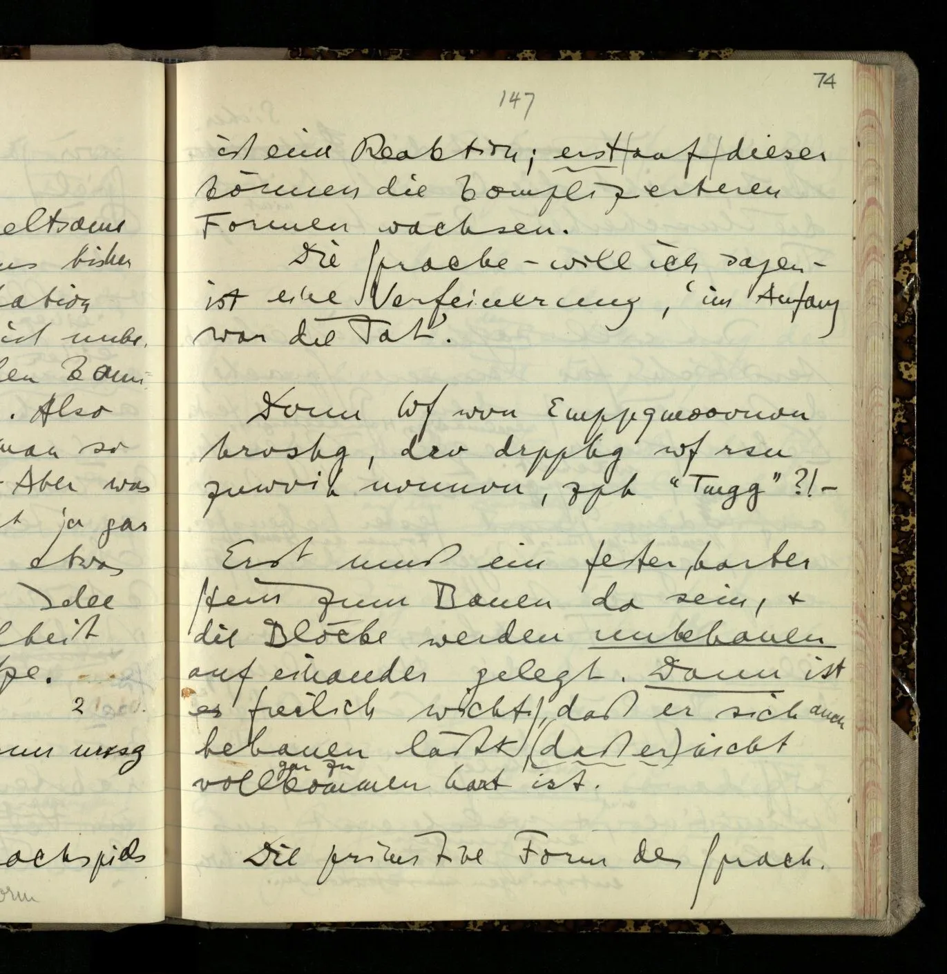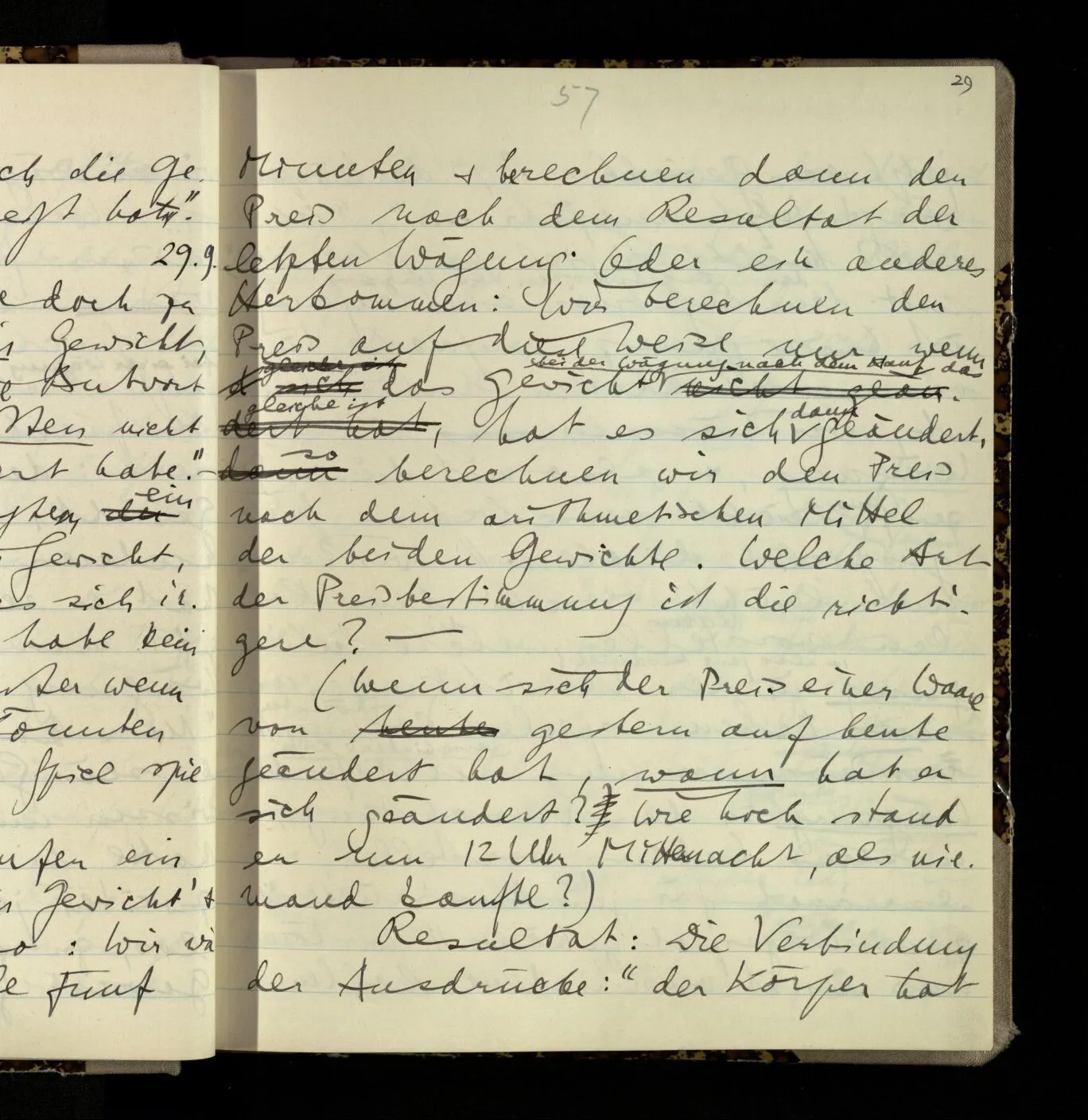 17.11.1937 Wir haben, in Betreff der Grammatik eines Wortes ein Vorurteil. Dieses, gestützt auf mancherlei Erscheinungen der Oberflächengrammatik, ist so mächtig, daß es der raffiniertesten Methoden bedarf davon los zu kommen. (In der Mathematik speziell wird die Oberflächengrammatik eigens daraufhin eingerichtet Mißverständnisse zu erzeugen.)