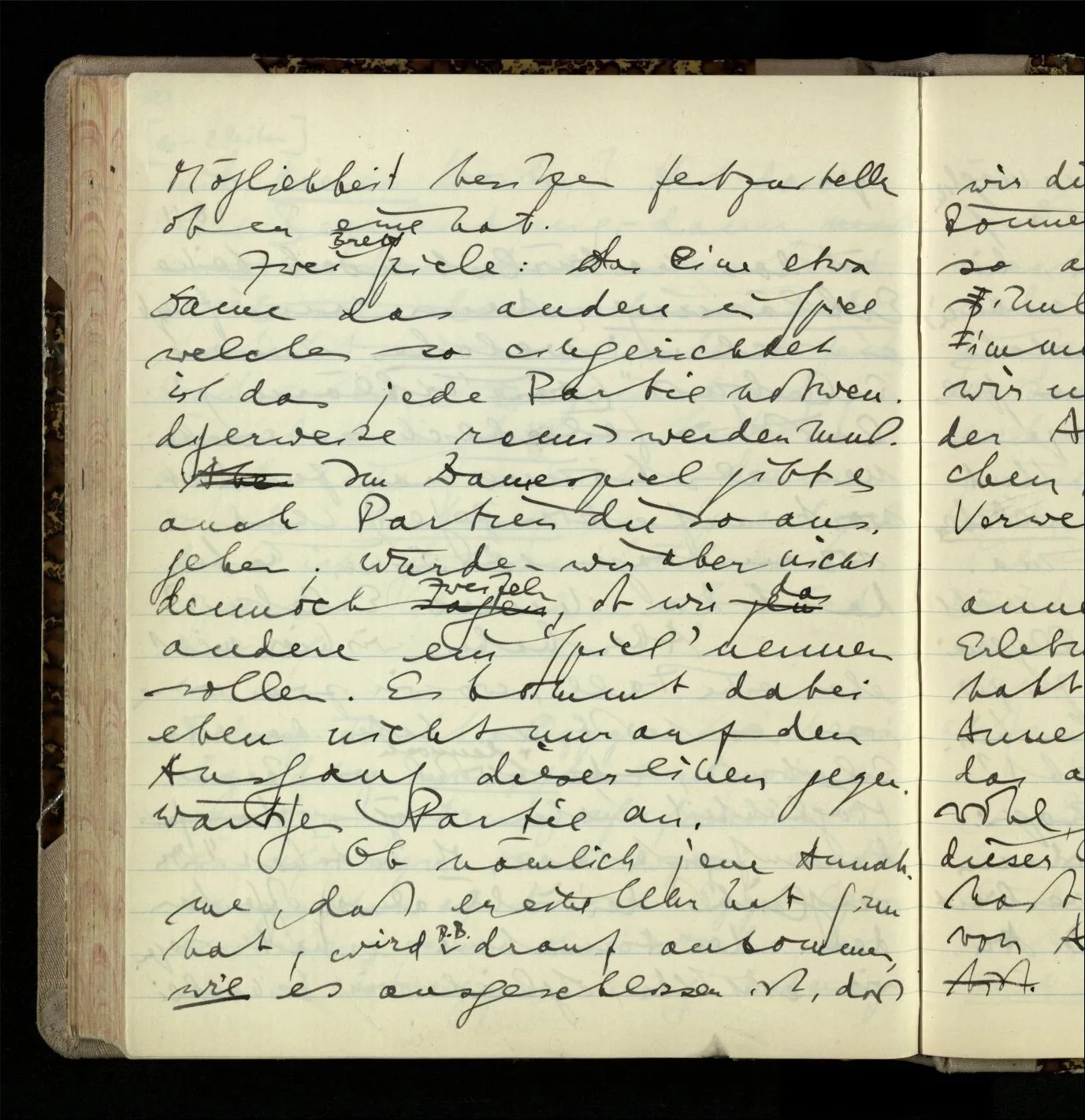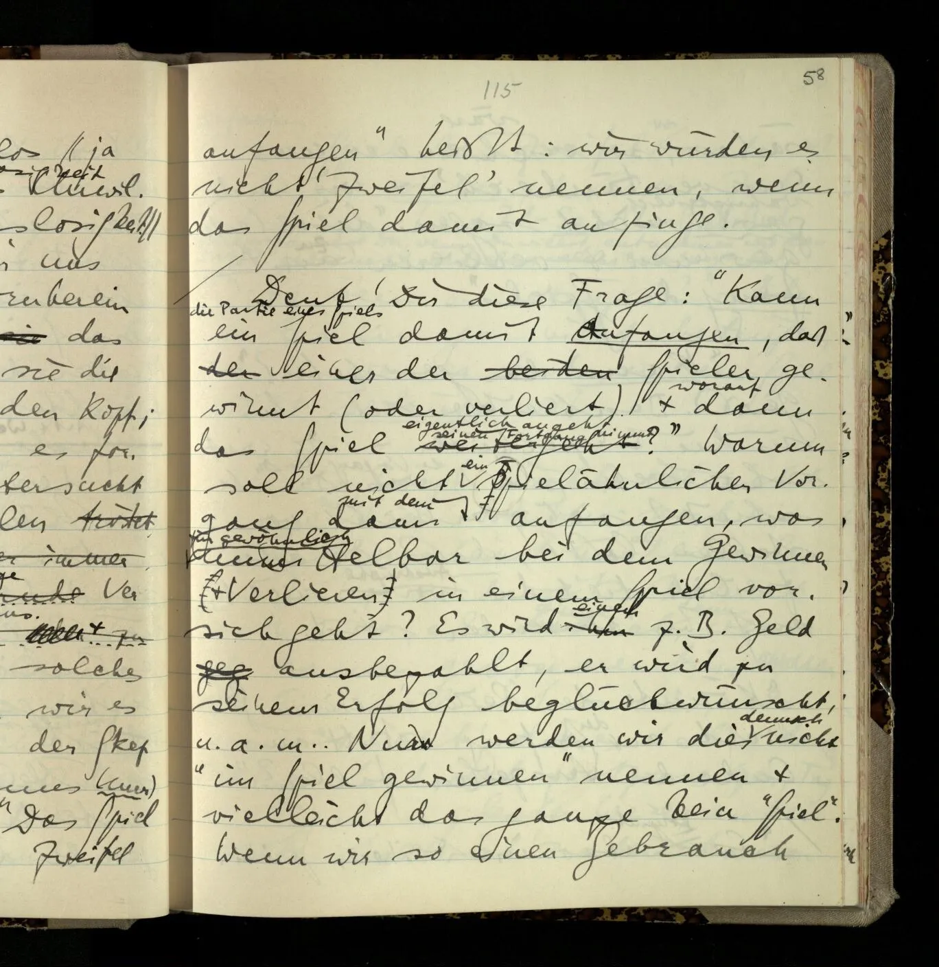 18.11.1937 ist das natürlich noch keine Erklärung, denn nun fragte es sich: “welches innere Erlebnis”. (Diese ‘Erklärung’ läßt es fälschlich so erscheinen als könne man zur Antwort auf etwas zeigen.) Und wann sagen wir: Einer habe das & das innere Erlebnis? “Aber haben wir hier nicht eher einen Fall, wo wir zwar wissen was es heißt, er habe das & das Erlebnis, obwohl wir keine Möglichkeit haben mögen, darauf zu kommen, ob er es hat.” Du vergleichst den Fall also offenbar dem der Annahme er habe, sagen wir eine Uhr, obgleich wir keinerlei Möglichkeit besitzen festzustellen ob er eine hat. Zwei Spiele: das eine etwa Dame das andere ein Spiel welches so eingerichtet ist daß jede Partie notwendigerweise remis werden muß. Im Damespiel gibt es auch Partien die so ausgehen; würden wir aber nicht dennoch zweifeln, ob wir das andere ein ‘Spiel’ nennen sollen. Es kommt dabei eben nicht nur auf den Ausgang dieser einen gegenwärtigen Partie an. Ob nämlich jene Annahme, daß er eine Uhr hat Sinn hat, wird z.B. drauf ankommen, wie es ausgeschlossen ist, daß wir die Tatsache erfahren. Wir können auch diese Annahme so abkapseln, daß sie sinnlos wird, obwohl dabei immer bestehen bleibt, daß wir uns beim Aussprechen der Annahme ein ‘Bild’ von dem Sachverhalt machen, nur haben wir auch keine Verwendung für dieses Bild. “Aber ich kann doch annehmen, daß er das gleiche Erlebnis hat wie ich es oft gehabt habe.” – Was einen ‘Akt des Annehmens’ betrifft, mußt Du das am besten wissen. Es heißt wohl, daß Du beim Aussprechen dieser Worte eines der Erlebnisse hast, die Du beim Aussprechen von Annahmen zu haben pflegst. Warum sollte es unmöglich sein zwei beliebige Figuren auf ein Spielbrett zu stellen, die eine mit der andern ‘nehmen’, & das Erlebnis haben welches man beim Gewinnen eines Spiels hat? Aber würden wir sagen wir hätten ein Spiel gewonnen. Und wenn Einer es sagte, welche Einwendungen würden wir machen? Würden wir ihn nicht nach dem Spiel im allgemeinen fragen, um ihm zu zeigen daß hier kein solches hinter jenem Erlebnis steht? Würden wir ihn nicht fragen: “Ja wie gewinnt man denn in diesem Spiel, & wie verliert man? Und was ist die Anfangsstellung?” etc.