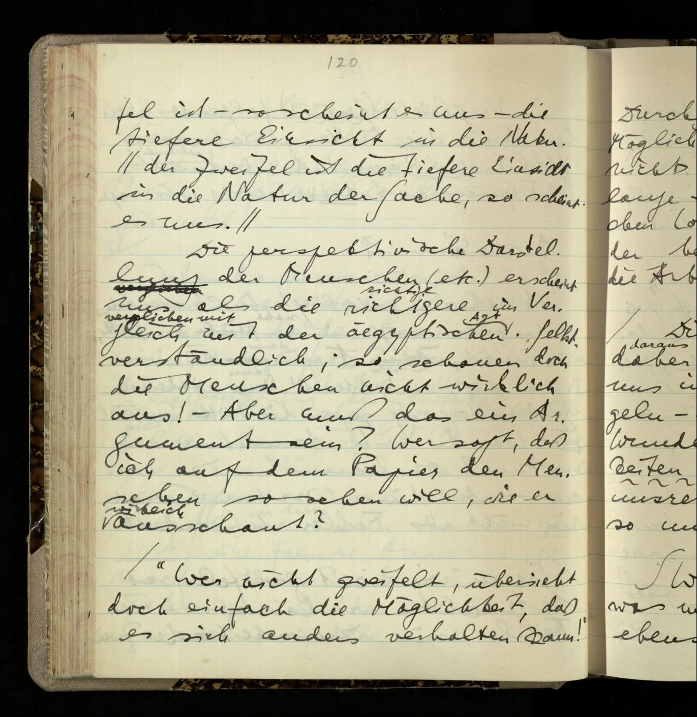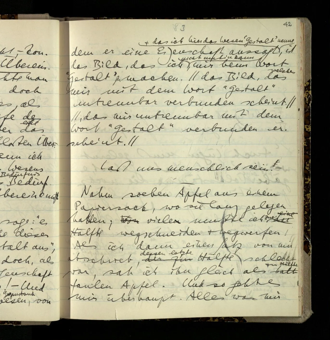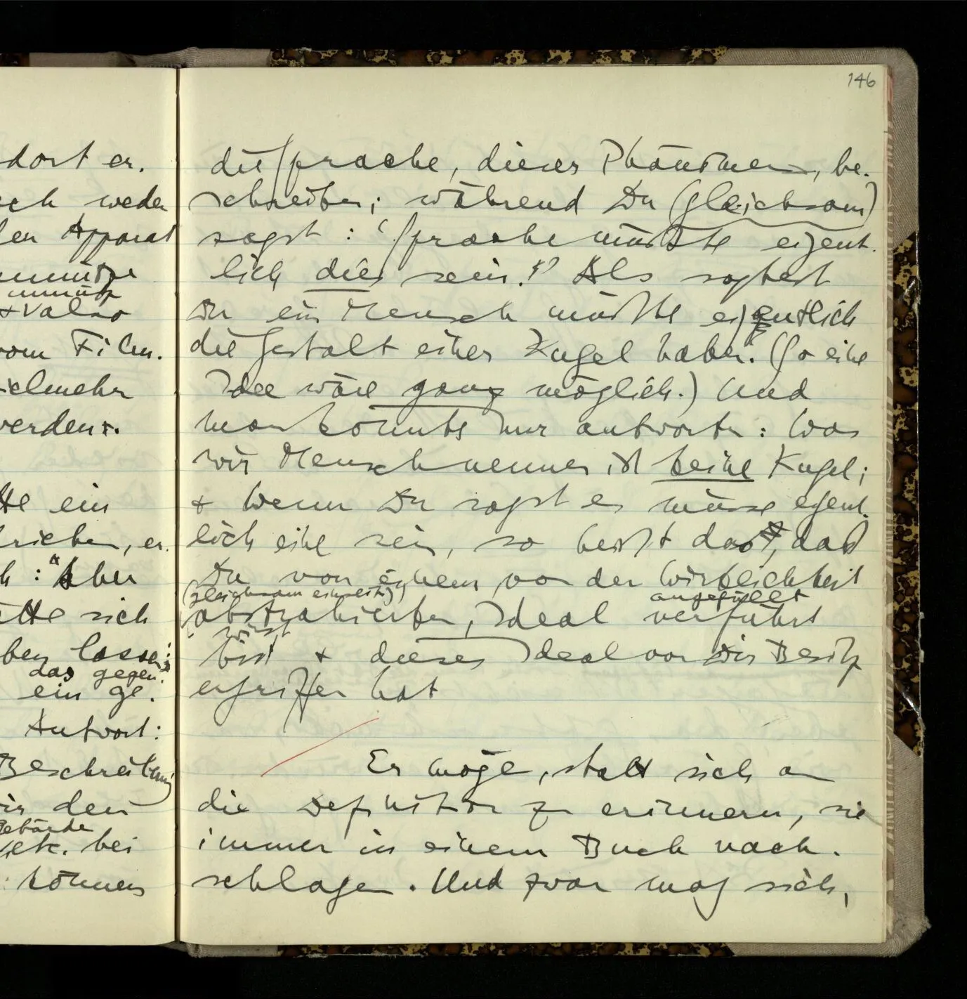 Denke jemand hätte ein Filmschauspiel beschrieben, erzählt. Nun sage ich: “Aber diese Erzählung hätte sich ja viel einfacher geben lassen: Du hast immerfort ein gewisses Bild gesehen.” Antwort: Das ist überhaupt keine Beschreibung. ‘Beschreibung’ nennen wir den Gebrauch gewisser Worte, Gebärden, etc. bei gewissen Gelegenheiten. Wir können die Sprache, dieses Phänomen, beschreiben; während Du (gleichsam) sagst: ‘Sprache müßte eigentlich dies sein.’ Als sagtest Du ein Mensch müßte eigentlich die Gestalt einer Kugel haben. (So eine Idee wäre ganz möglich.) Und man könnte nur antworten: Was wir Mensch nennen ist keine Kugel; & wenn Du sagst es müsse eigentlich eine sein, so heißt das, daß Du von einem, von der Wirklichkeit (gleichsam einseitig) abstrahierten, Ideal verführt bist & dieses Ideal von Dir Besitz ergriffen hat.
