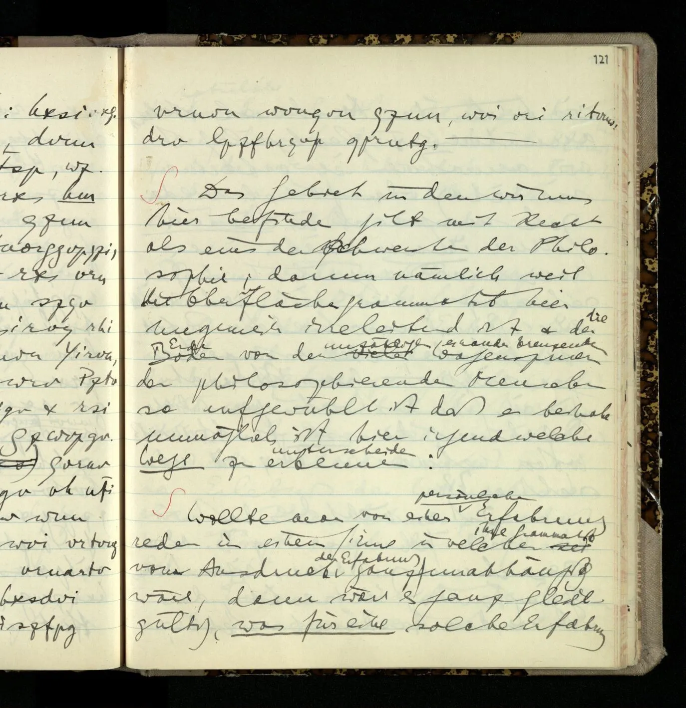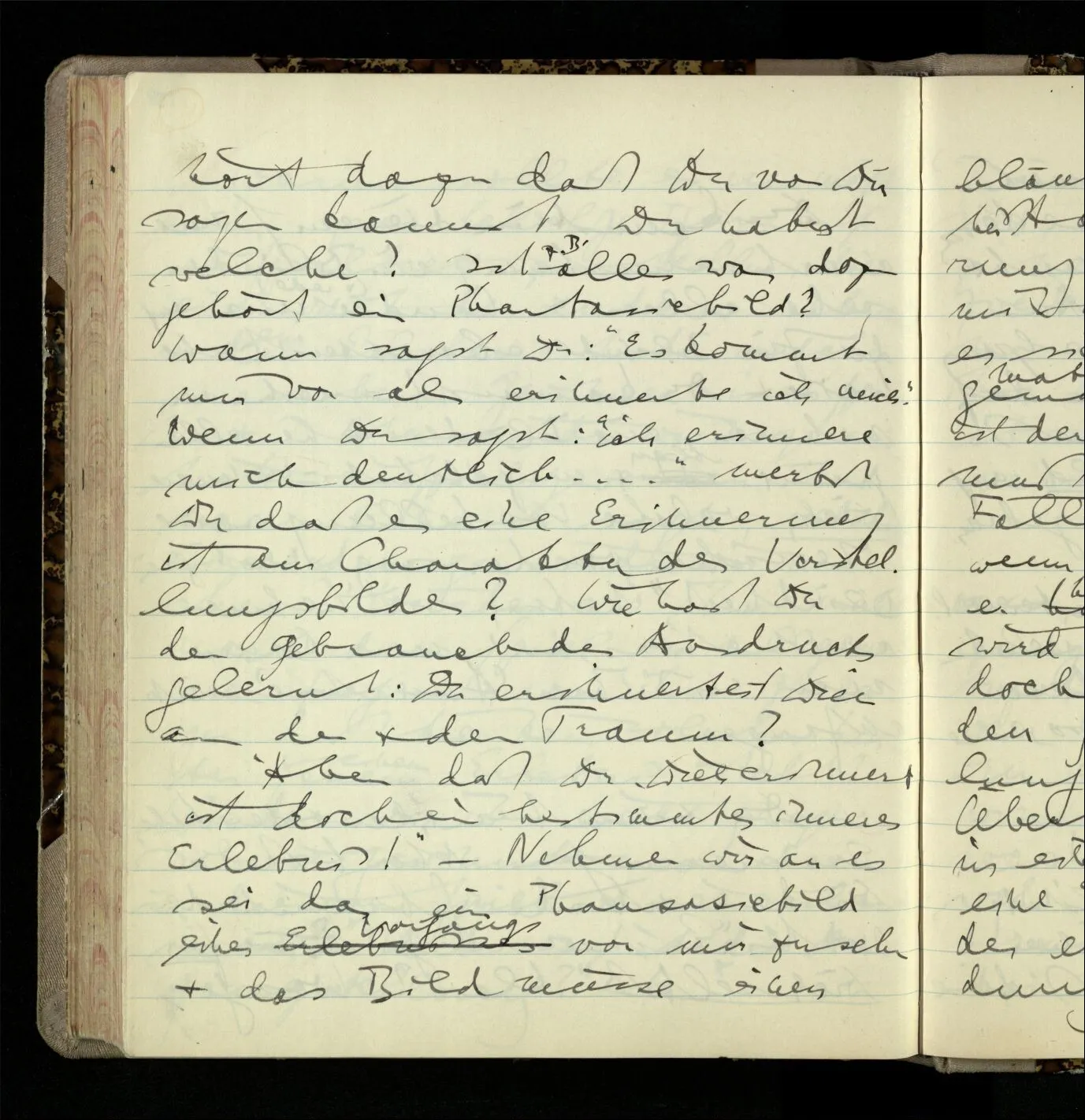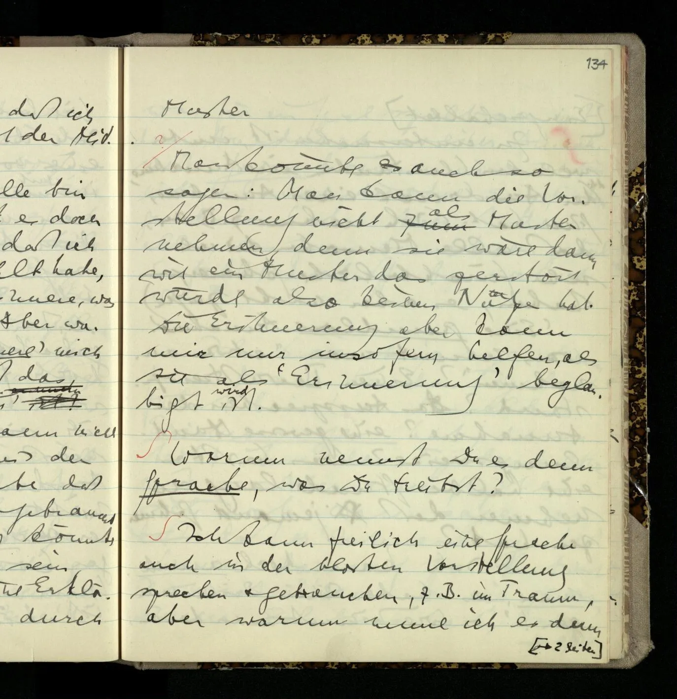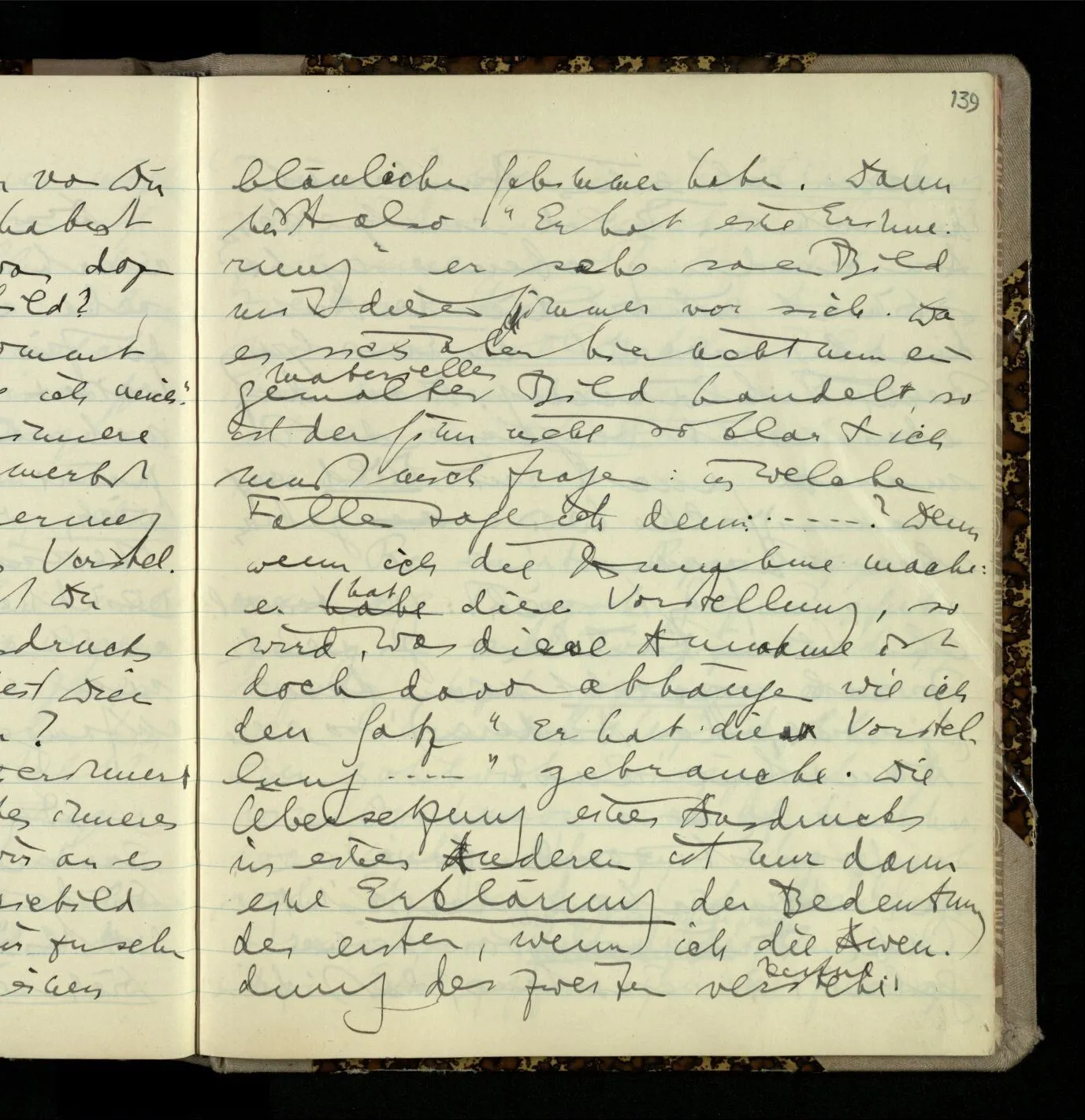 Du nimmst an, der & der habe Erinnerungen. Aber bist Du Dir denn über den Gebrauch des Wortes “Erinnerungen” für Dich selbst klar? Was gehört dazu daß Du von Dir sagen kannst Du habest welche? Ist z.B. alles was dazu gehört ein Phantasiebild? Wann sagst Du: “Es kommt mir vor als erinnerte ich mich.” Wenn Du sagst: “ich erinnere mich deutlich…” merkst Du daß es eine Erinnerung ist am Charakter des Vorstellungsbildes? Wie hast Du den Gebrauch des Ausdrucks gelernt: Du erinnertest Dich an den & den Traum? “Aber daß Du Dich erinnerst ist doch ein bestimmtes inneres Erlebnis!” – Nehmen wir an es sei das ein Phantasiebild eines Vorgangs vor mir zu sehen & das Bild müsse einen bläulichen Schimmer haben. Dann heißt also “Er hat eine Erinnerung” er sehe so ein Bild mit diesem Schimmer vor sich. Da es sich aber hier nicht um ein gemaltes Bild handelt, so ist der Sinn nicht so klar & ich muß mich fragen: in welchen Fällen sage ich denn: …? Denn wenn ich die Annahme mache: er hat diese Vorstellung, so wird, was diese Annahme ist doch davon abhängen wie ich den Satz “Er hat die Vorstellung …” gebrauche. Die Übersetzung eines Ausdrucks in einen Anderen ist nur dann eine Erklärung der Bedeutung des ersten, wenn ich die Anwendung des zweiten verstehe. Wenn ich einen Ausdruck durch ein Bild ersetze dessen Anwendung ebenso unbestimmt ist wie die des Ausdrucks so ist die Ersetzung keine Erklärung. Man darf eben nicht vergessen, daß man auch ein Bild auf mannigfache Weise gebrauchen kann. Es fragt sich: Unter welchen Umständen & zu welchem Zweck spricht man denn (zu sich, oder Anderen) so eine Annahme aus?