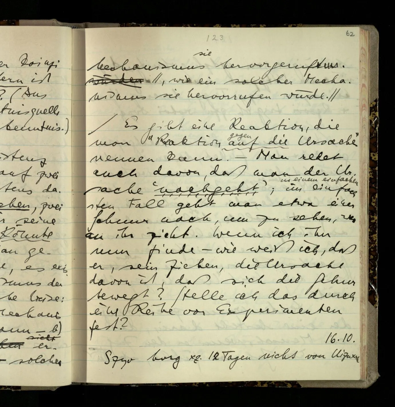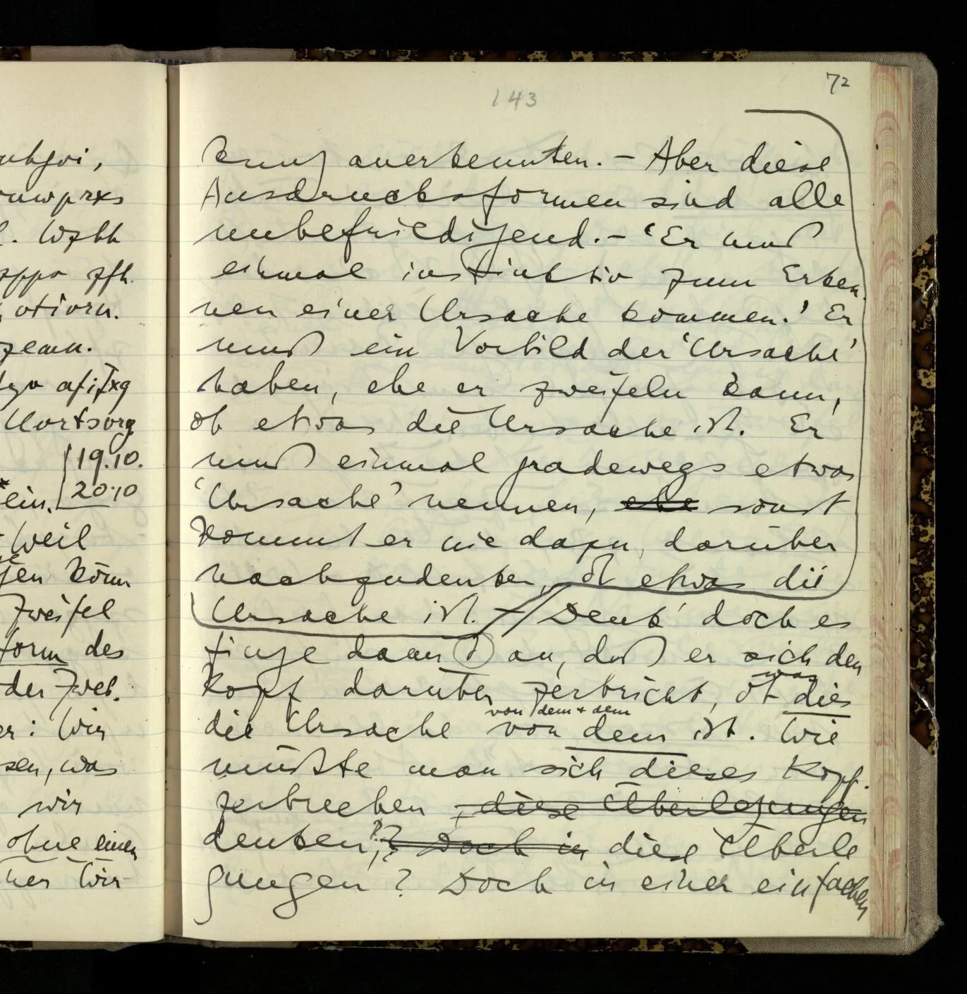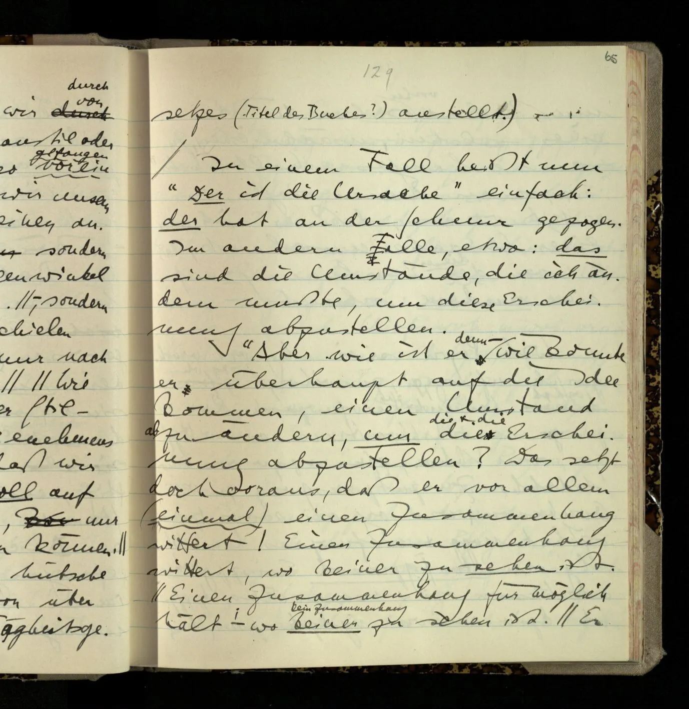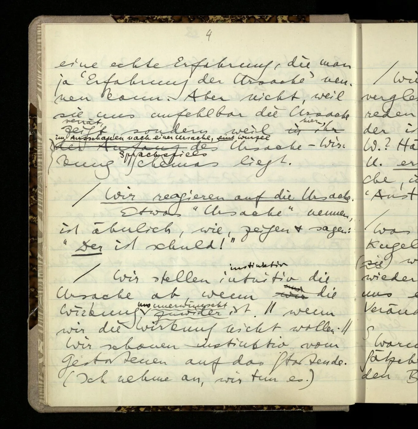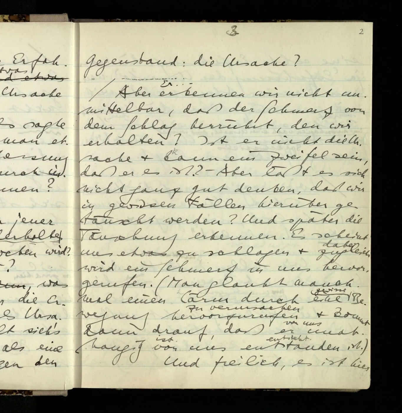 Aber erkennen wir nicht unmittelbar, daß der Schmerz von dem Schlag herrührt, den wir erhalten? Ist er nicht die Ursache & kann ein Zweifel sein, daß er es ist? – Aber läßt es sich nicht ganz gut denken, daß wir in gewissen Fällen hierüber getäuscht werden? Und später die Täuschung erkennen. Es scheint uns etwas zu schlagen & zugleich wird ein Schmerz in uns hervorgerufen. (Man glaubt manchmal einen Lärm durch eine gewisse Bewegung hervorzurufen & kommt dann drauf, daß er unabhängig von uns entstanden ist.) Und freilich, es ist hier eine echte Erfahrung, die man ja ‘Erfahrung der Ursache’ nennen kann. Aber nicht, weil sie uns unfehlbar die Ursache zeigt, sondern weil hier, im Ausschauen nach einer Ursache, eine Wurzel des Ursache-Wirkung Schemas liegt.