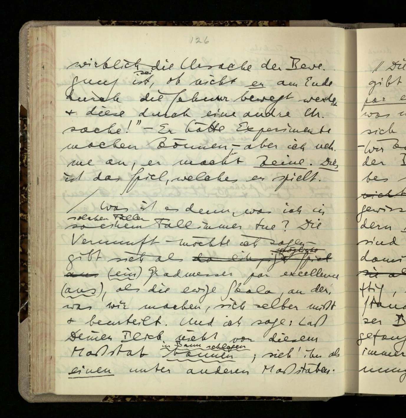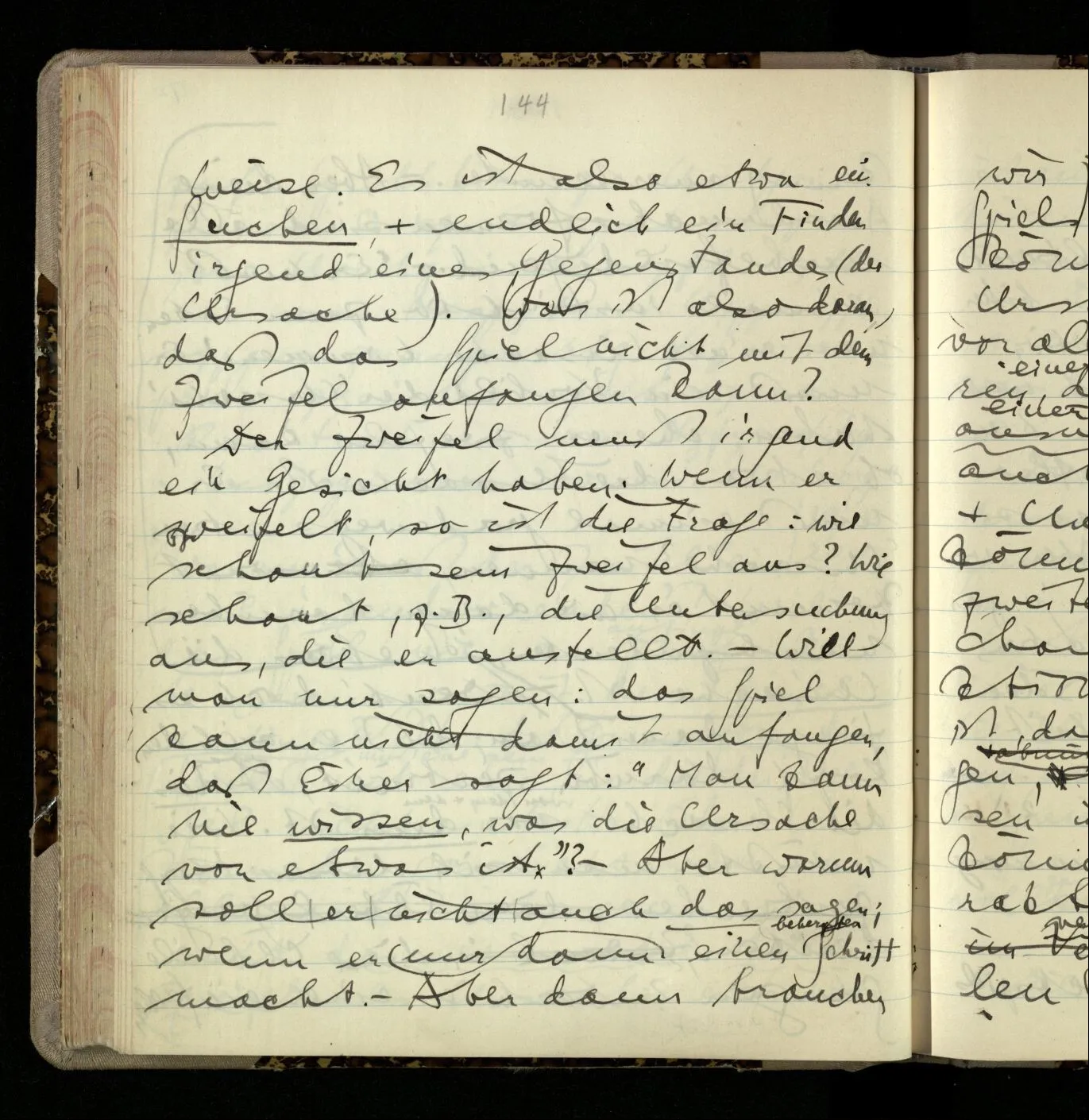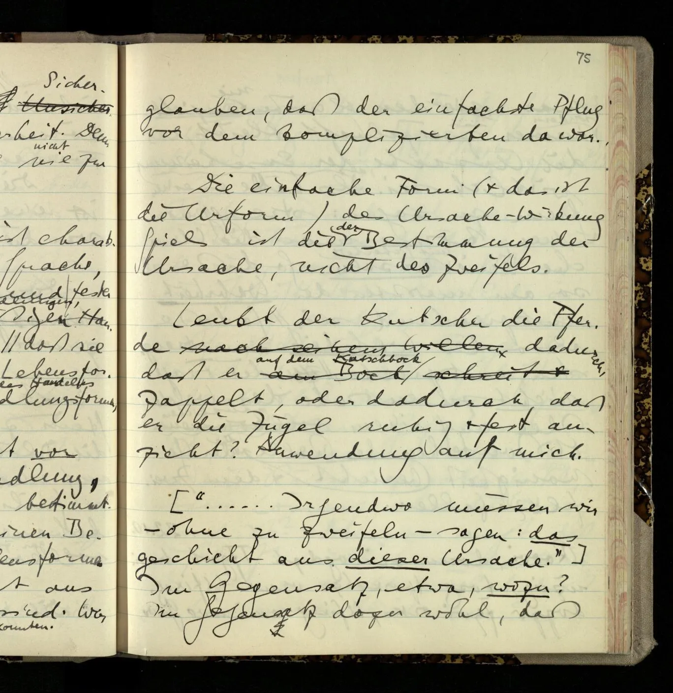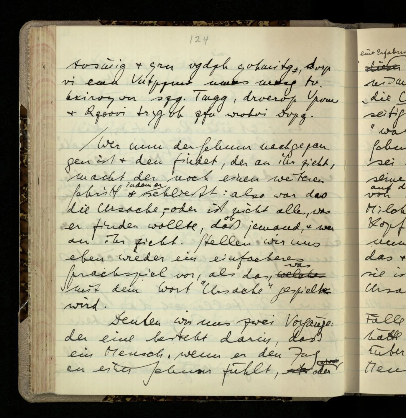 Aber erkennen wir nicht unmittelbar, daß der Schmerz von dem Schlag herrührt, den wir erhalten? Ist er nicht die Ursache & kann ein Zweifel sein, daß er es ist? – Aber läßt es sich nicht ganz gut denken, daß wir in gewissen Fällen hierüber getäuscht werden? Und später die Täuschung erkennen. Es scheint uns etwas zu schlagen & zugleich wird ein Schmerz in uns hervorgerufen. (Man glaubt manchmal einen Lärm durch eine gewisse Bewegung hervorzurufen & kommt dann drauf, daß er unabhängig von uns entstanden ist.) Und freilich, es ist hier eine echte Erfahrung, die man ja ‘Erfahrung der Ursache’ nennen kann. Aber nicht, weil sie uns unfehlbar die Ursache zeigt, sondern weil hier, im Ausschauen nach einer Ursache, eine Wurzel des Ursache-Wirkung Schemas liegt.