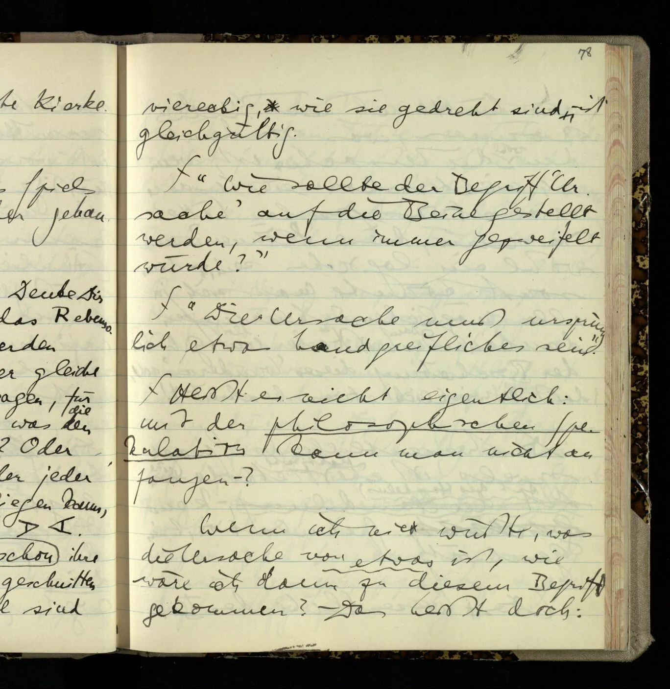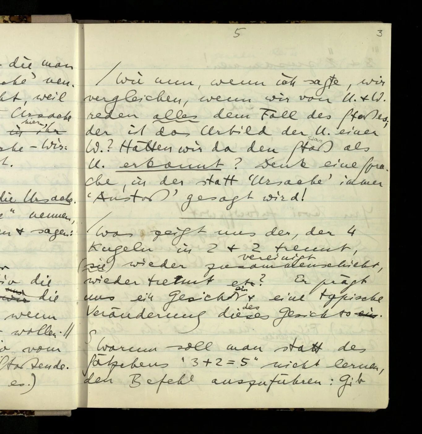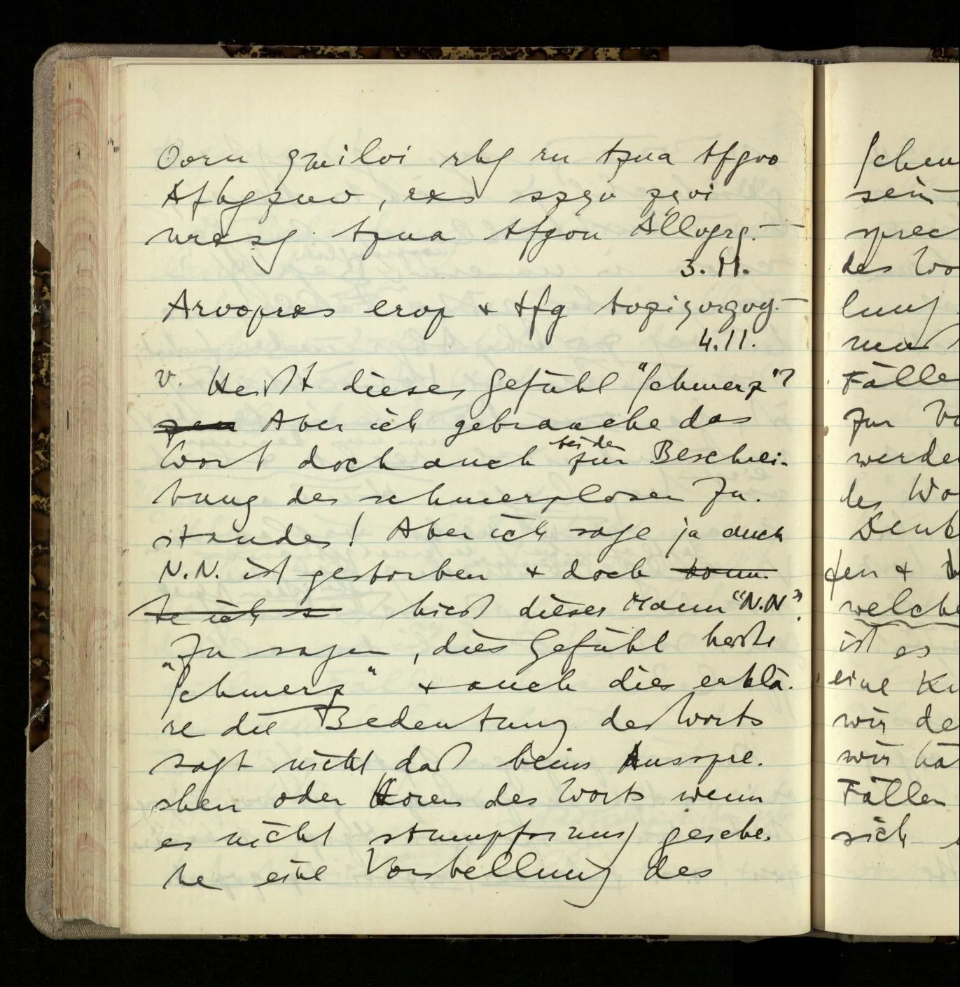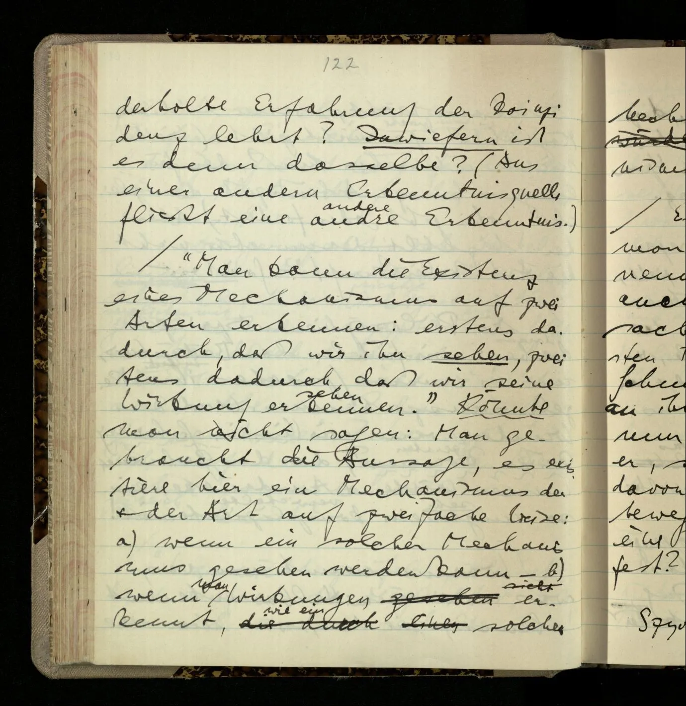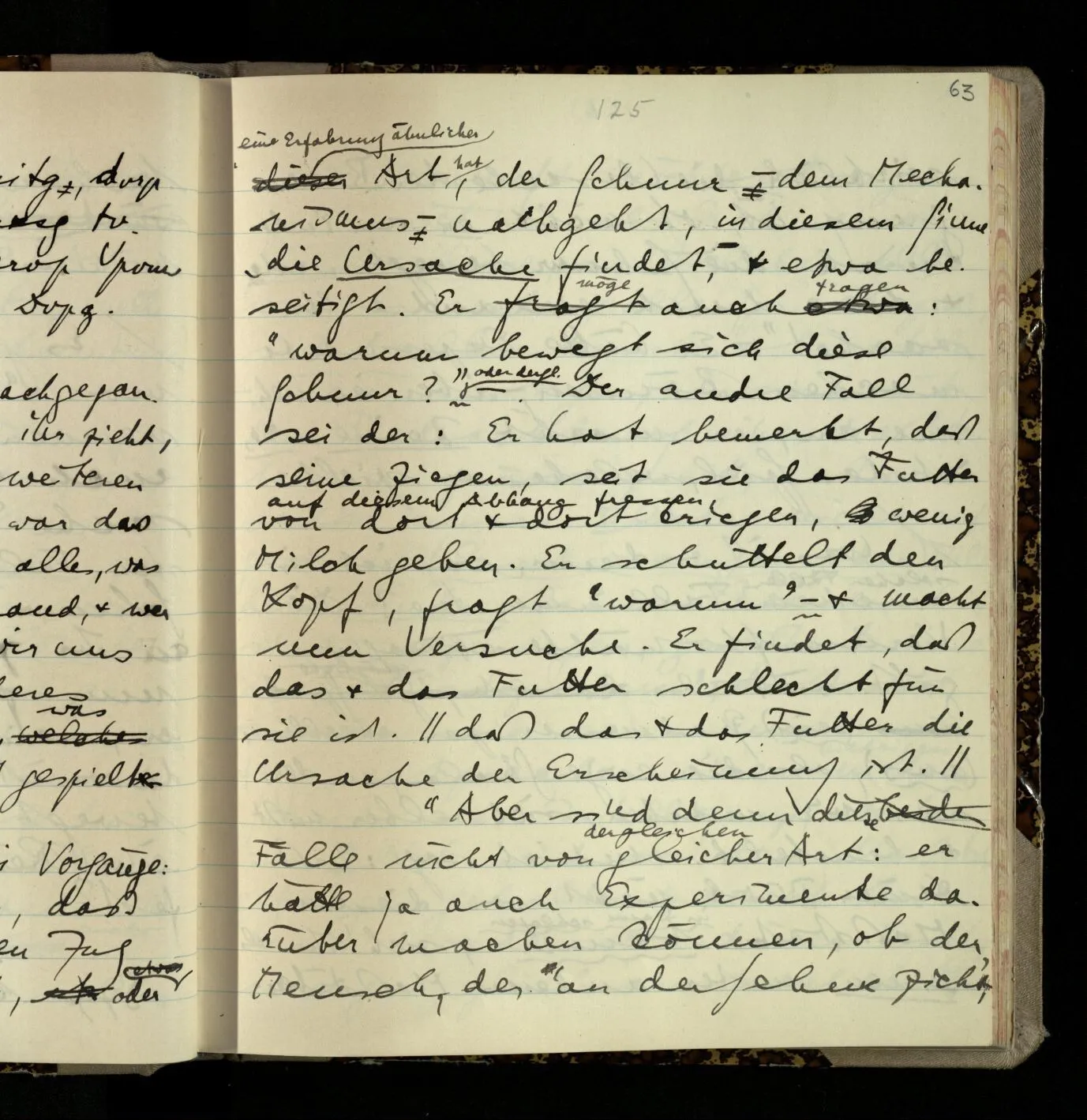 Aber erkennen wir nicht unmittelbar, daß der Schmerz von dem Schlag herrührt, den wir erhalten? Ist er nicht die Ursache & kann ein Zweifel sein, daß er es ist? – Aber läßt es sich nicht ganz gut denken, daß wir in gewissen Fällen hierüber getäuscht werden? Und später die Täuschung erkennen. Es scheint uns etwas zu schlagen & zugleich wird ein Schmerz in uns hervorgerufen. (Man glaubt manchmal einen Lärm durch eine gewisse Bewegung hervorzurufen & kommt dann drauf, daß er unabhängig von uns entstanden ist.) Und freilich, es ist hier eine echte Erfahrung, die man ja ‘Erfahrung der Ursache’ nennen kann. Aber nicht, weil sie uns unfehlbar die Ursache zeigt, sondern weil hier, im Ausschauen nach einer Ursache, eine Wurzel des Ursache-Wirkung Schemas liegt.