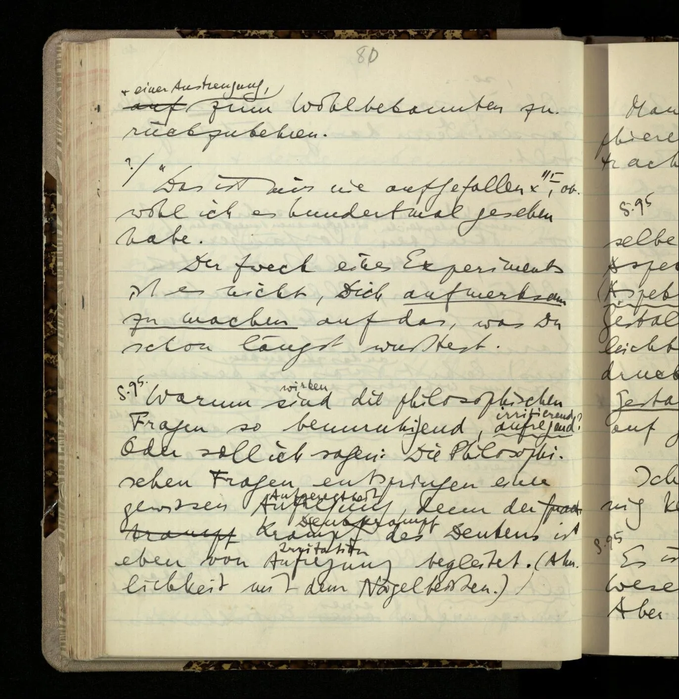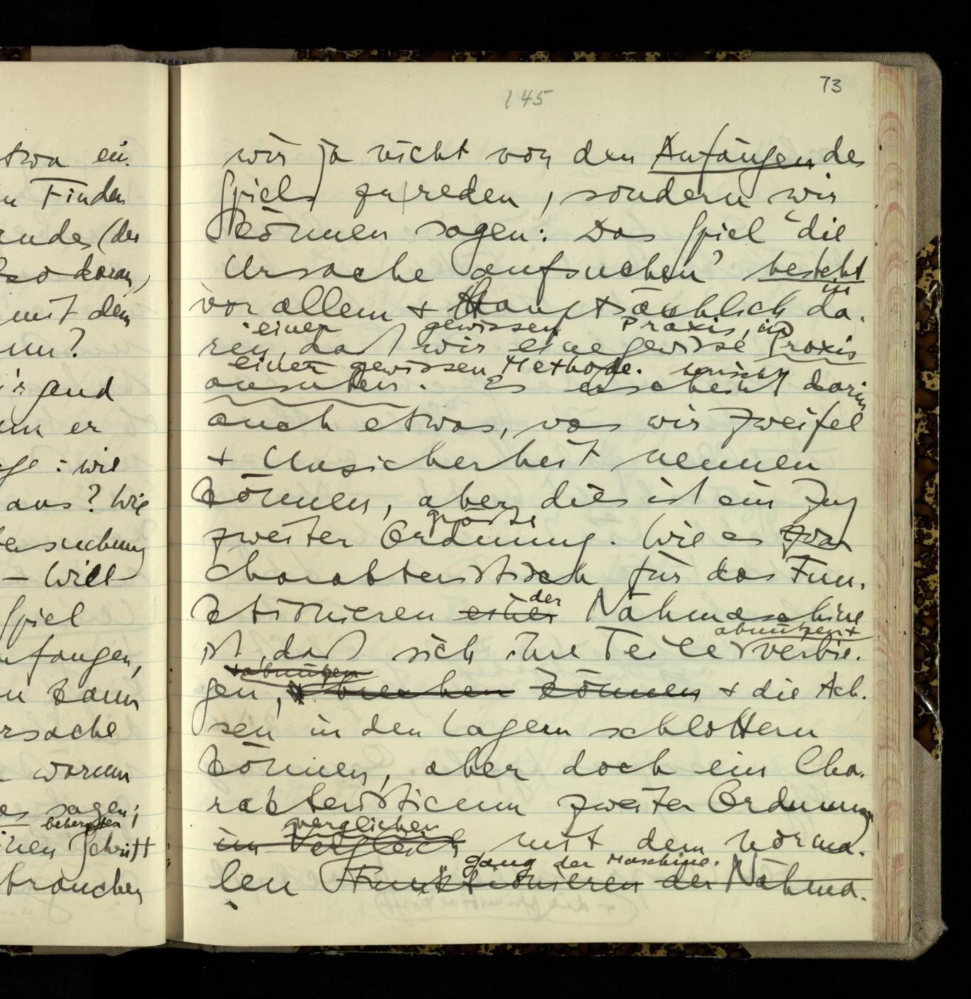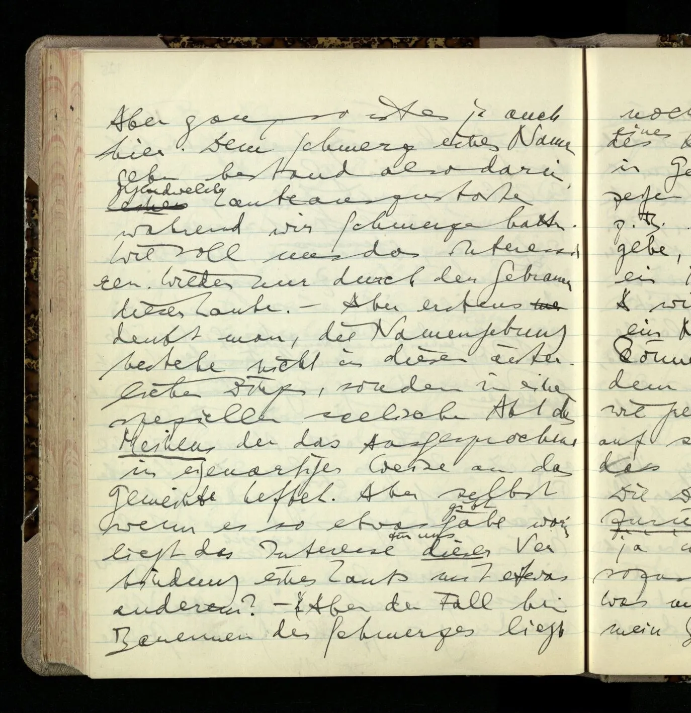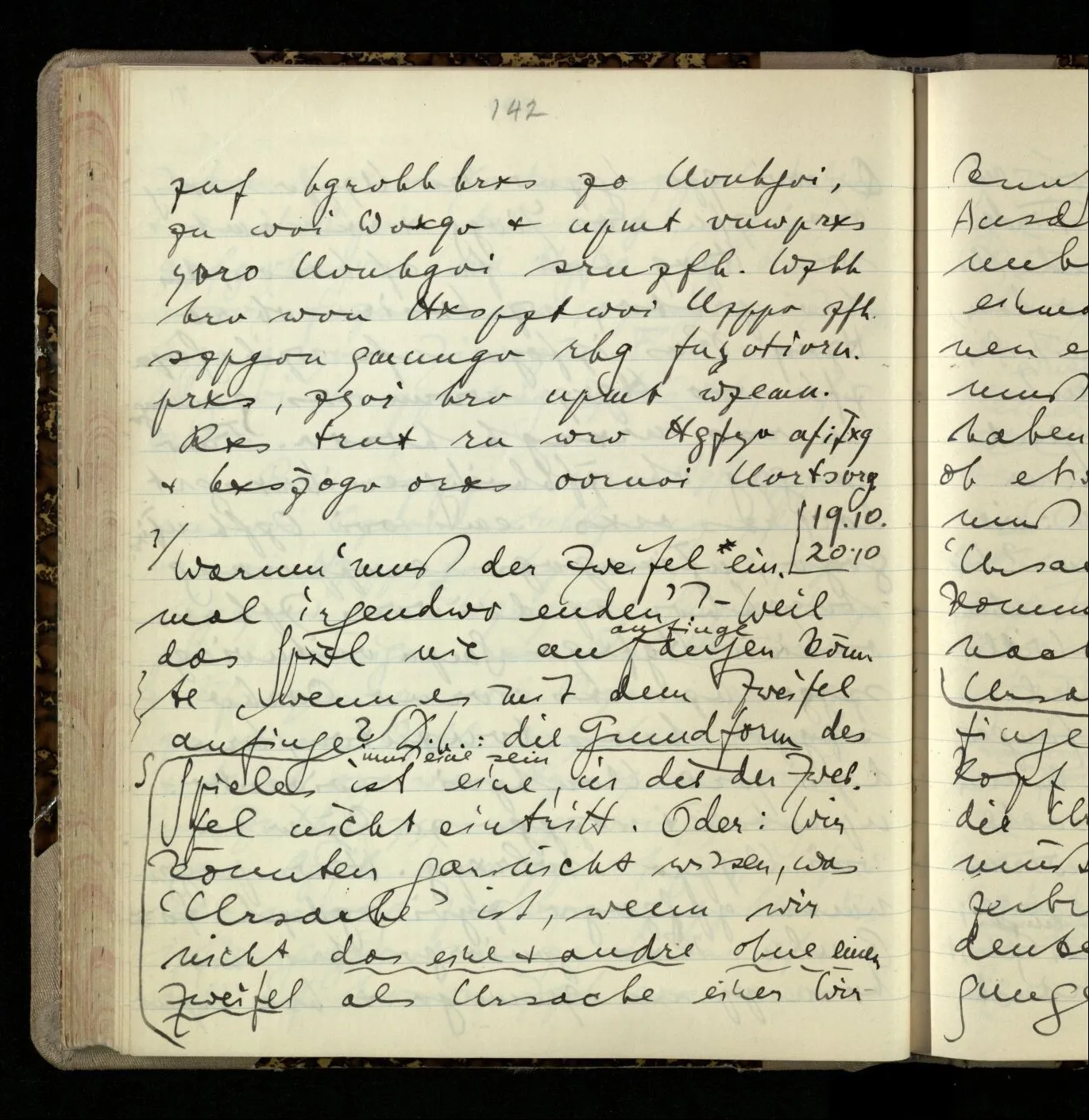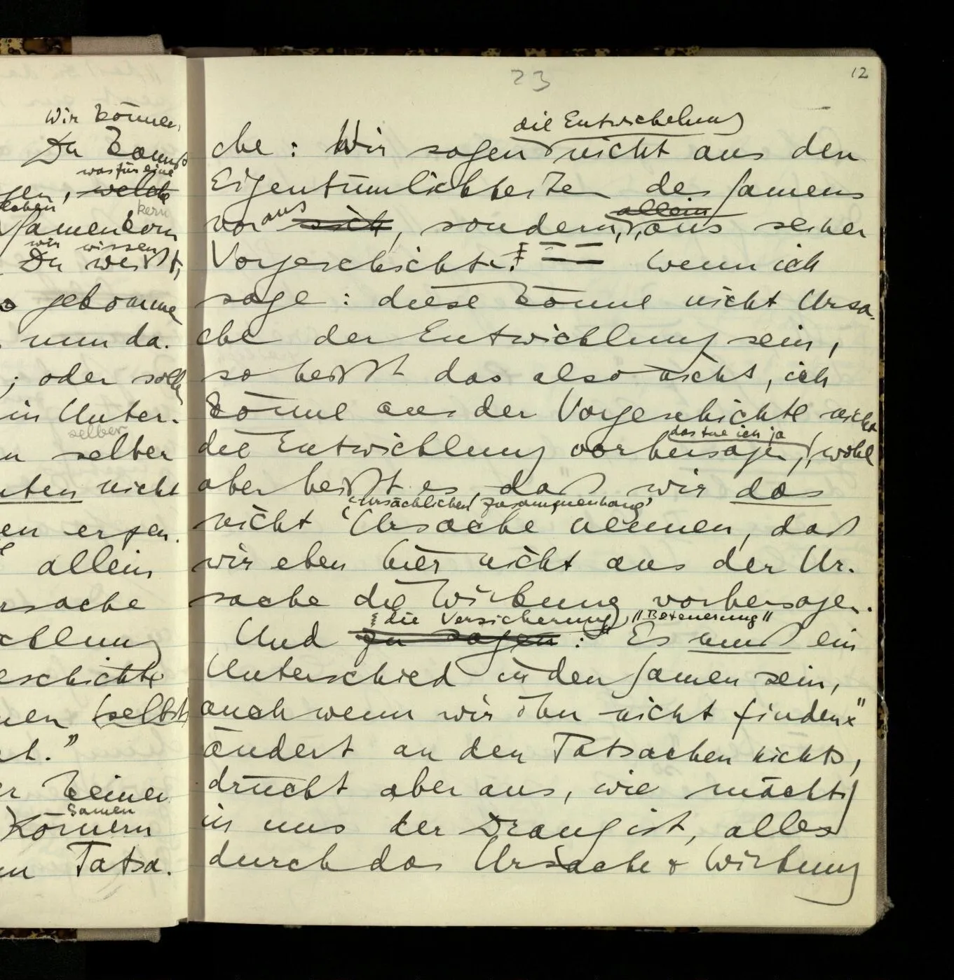 Aber erkennen wir nicht unmittelbar, daß der Schmerz von dem Schlag herrührt, den wir erhalten? Ist er nicht die Ursache & kann ein Zweifel sein, daß er es ist? – Aber läßt es sich nicht ganz gut denken, daß wir in gewissen Fällen hierüber getäuscht werden? Und später die Täuschung erkennen. Es scheint uns etwas zu schlagen & zugleich wird ein Schmerz in uns hervorgerufen. (Man glaubt manchmal einen Lärm durch eine gewisse Bewegung hervorzurufen & kommt dann drauf, daß er unabhängig von uns entstanden ist.) Und freilich, es ist hier eine echte Erfahrung, die man ja ‘Erfahrung der Ursache’ nennen kann. Aber nicht, weil sie uns unfehlbar die Ursache zeigt, sondern weil hier, im Ausschauen nach einer Ursache, eine Wurzel des Ursache-Wirkung Schemas liegt.