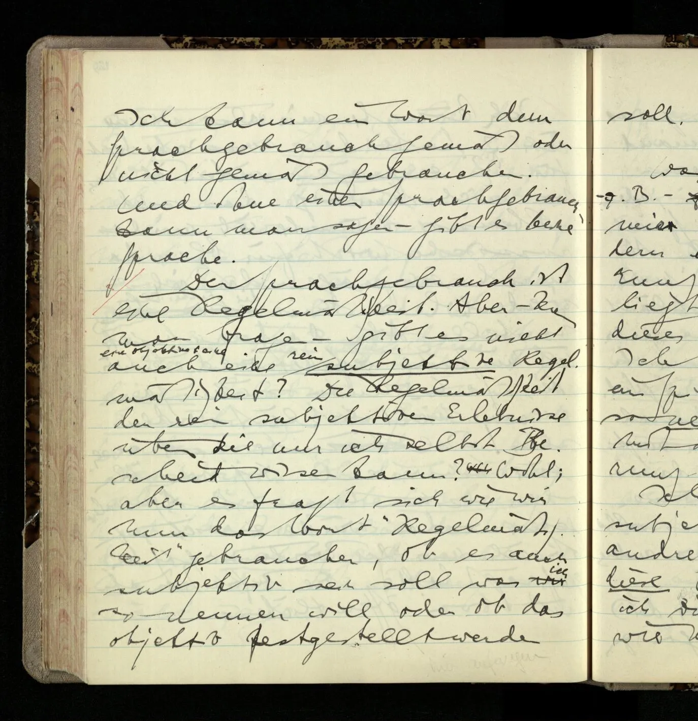 Ich kann ein Wort dem Sprachgebrauch gemäß oder nicht gemäß gebrauchen. Und ohne einen Sprachgebrauch kann man sagen – gibt es keine Sprache. Der Sprachgebrauch ist eine Regelmäßigkeit. Aber – kann man fragen – gibt es nicht auch eine rein subjektive Regelmäßigkeit? Die Regelmäßigkeit der rein subjektiven Erlebnisse über die nur ich selbst Bescheid wissen kann? Wohl; aber es fragt sich wie wir nun das Wort “Regelmäßigkeit” gebrauchen, ob es auch subjektiv sein soll was ich so nennen will oder ob das objektiv festgestellt werden soll.