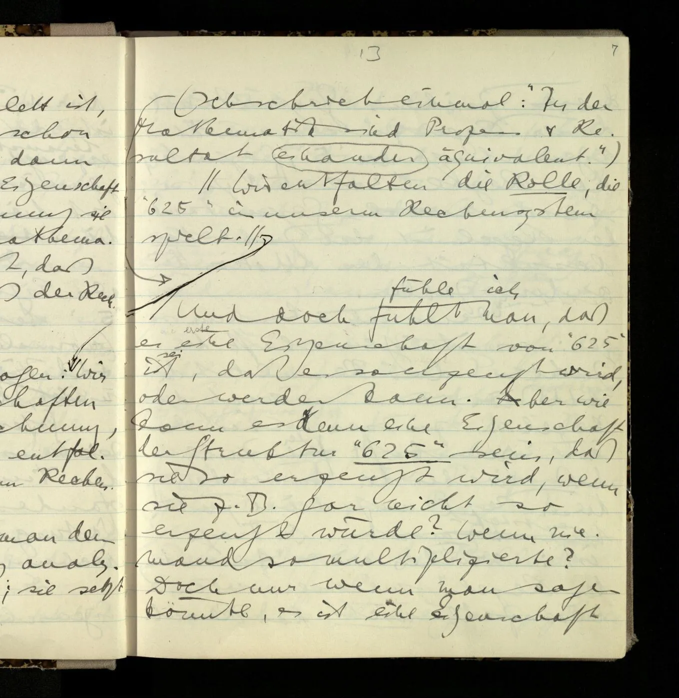 entsteht? Nur sofern damit gemeint ist, daß es für gewöhnlich so erzeugt wird; nicht wenn gemeint ist, daß es das Resultat dieser Addition, die Summe dieser Zahlen, ist. Denn man kann es z.B. als Eigenschaft des Zeichens “5” betrachten, daß wir es (normalerweise) als Resultat der Addition 3 + 2 schreiben; aber nicht, daß … Sofern es eine Eigenschaft des Zeichens “625” ist, liegt sie in dem Funktionieren unseres Verstandes, in Tatsachen unsrer Naturgeschichte, daß wir so rechnen. Das rein Mathematische ist keine Eigenschaft von “625” weil die Addition erst dann komplett ist, wenn das Resultat schon dasteht; & man kann dann nicht sagen, es ist eine Eigenschaft von “625”, daß die Rechnung sie ergibt, weil “ergibt” mathematisch gesprochen heißt, daß diese Zahl am Schluß der Rechnung steht.