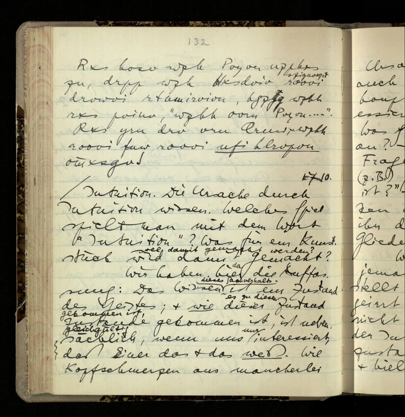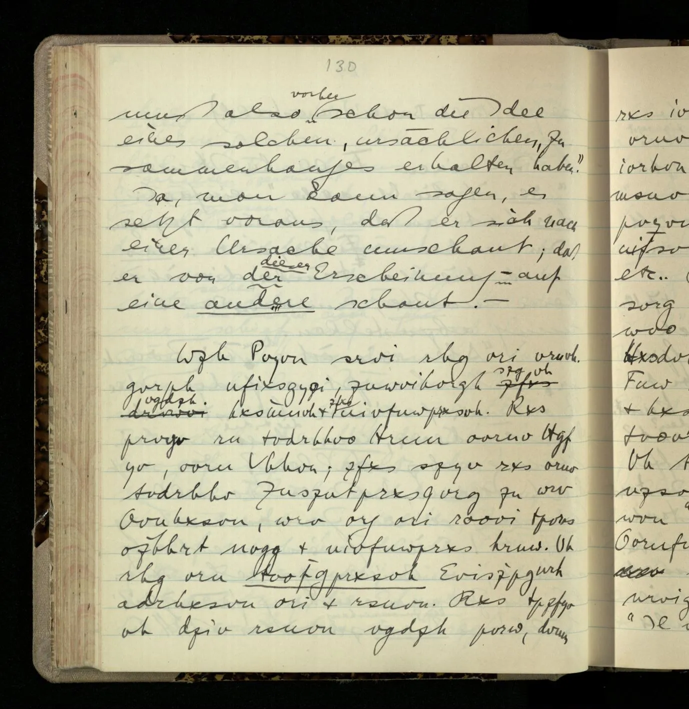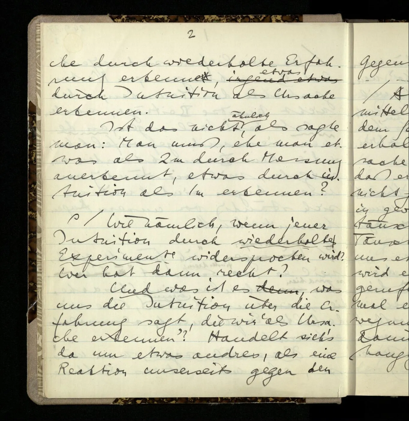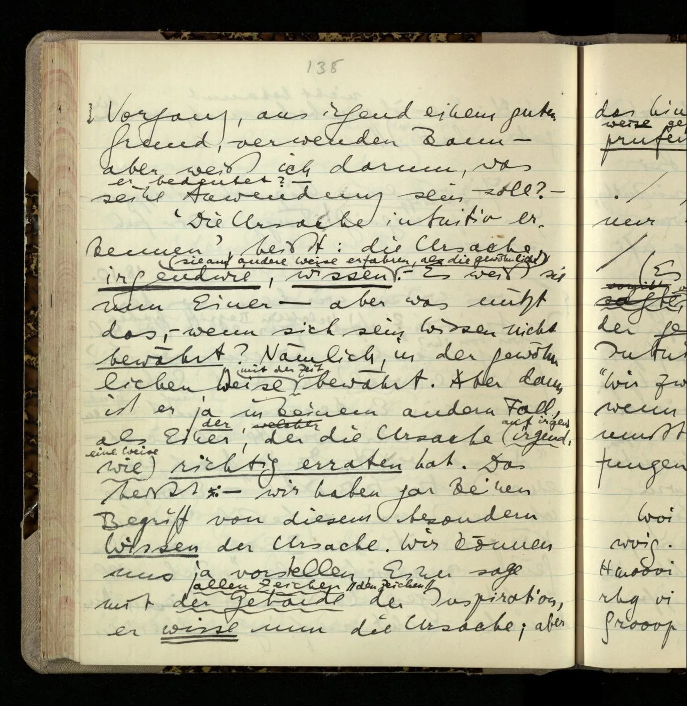 Wie nämlich, wenn jener Intuition durch wiederholte Experimente widersprochen wird? Wer hat dann recht? Und was ist es, was uns die Intuition über die Erfahrung sagt, die wir ‘als Ursache erkennen’? Handelt sich’s da um etwas andres, als eine Reaktion unserseits gegen den Gegenstand: die Ursache?