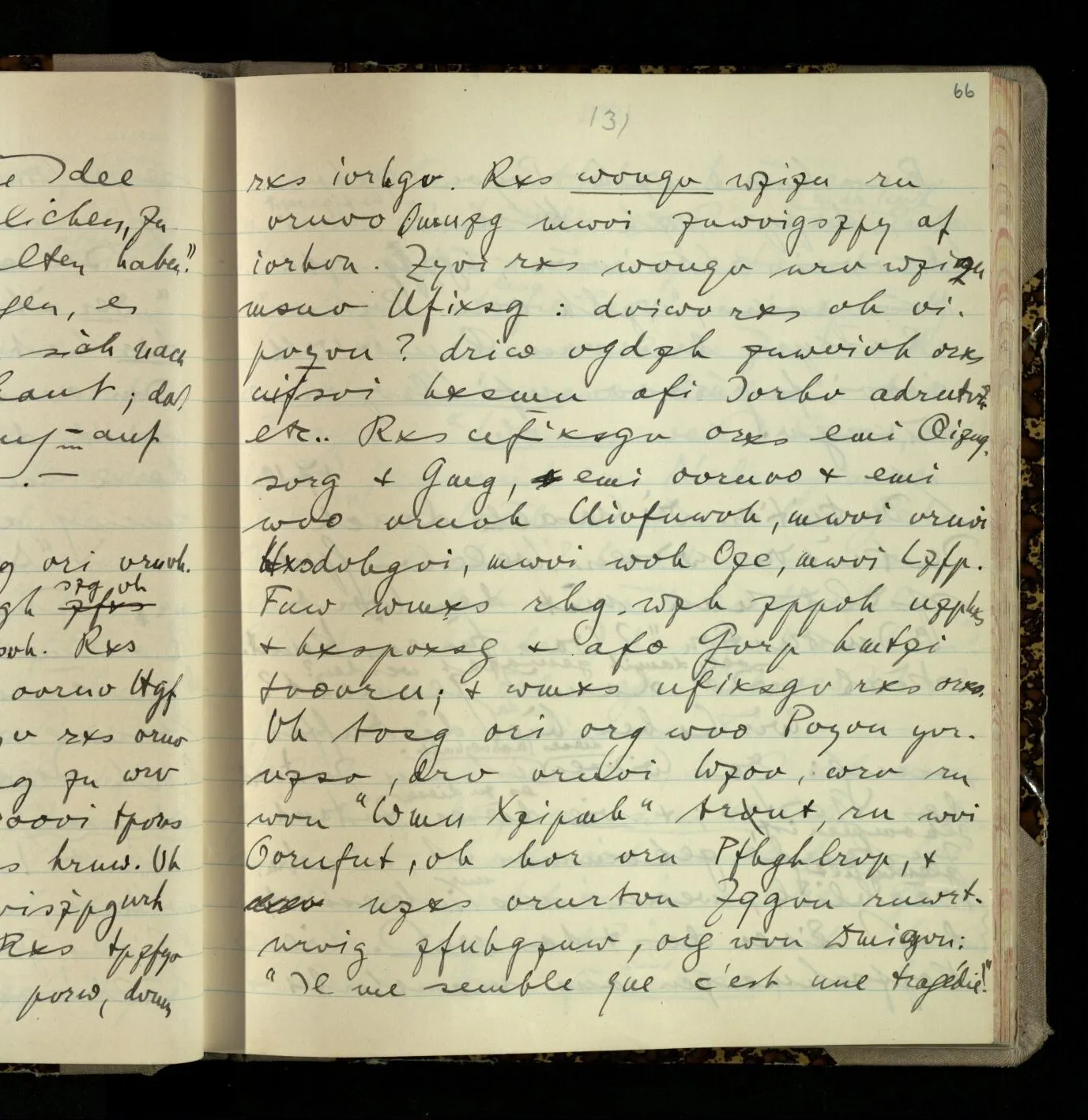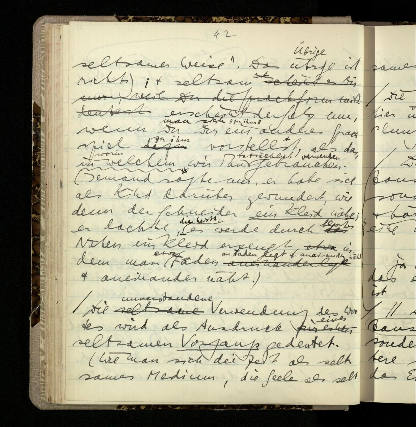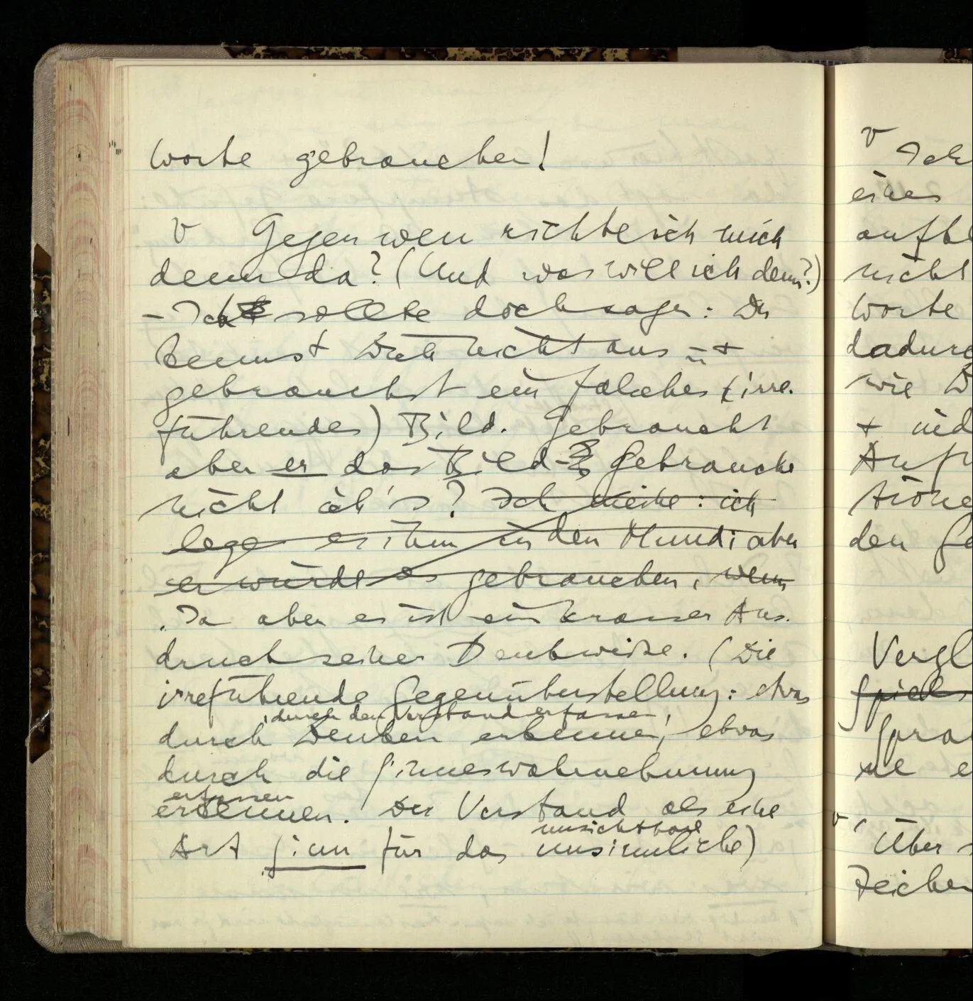 Ich kann freilich eine Sprache auch in der bloßen Vorstellung sprechen & gebrauchen, z.B. im Traum, aber warum nenne ich es denn mit diesen Worten? Hat das eine Begründung, – dann besteht sie aus Worten & Zeichen. Hat es keine Begründung für einen Andern dann hat es auch keine für mich & dann ist der Anfang des Sprachspiels daß ich gewisse Wörter ausspreche. Und das ist in Ordnung.